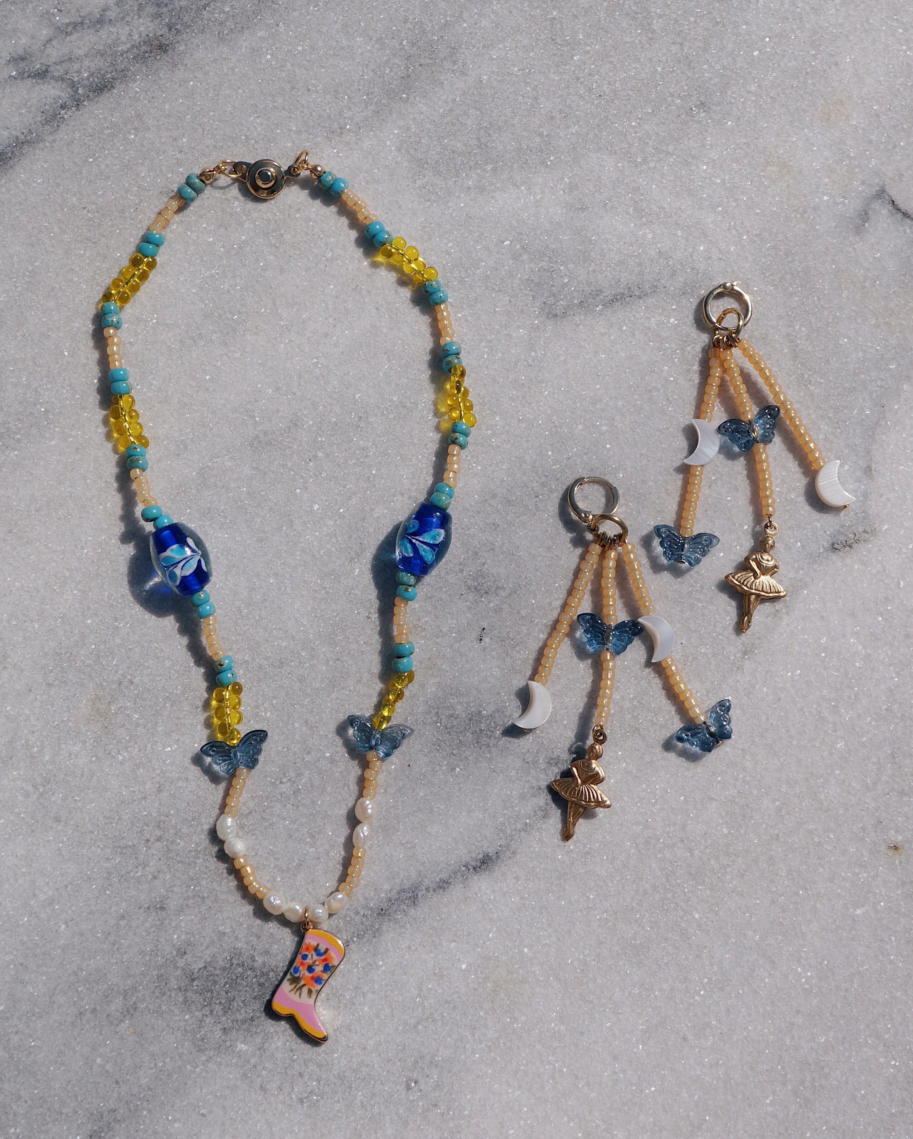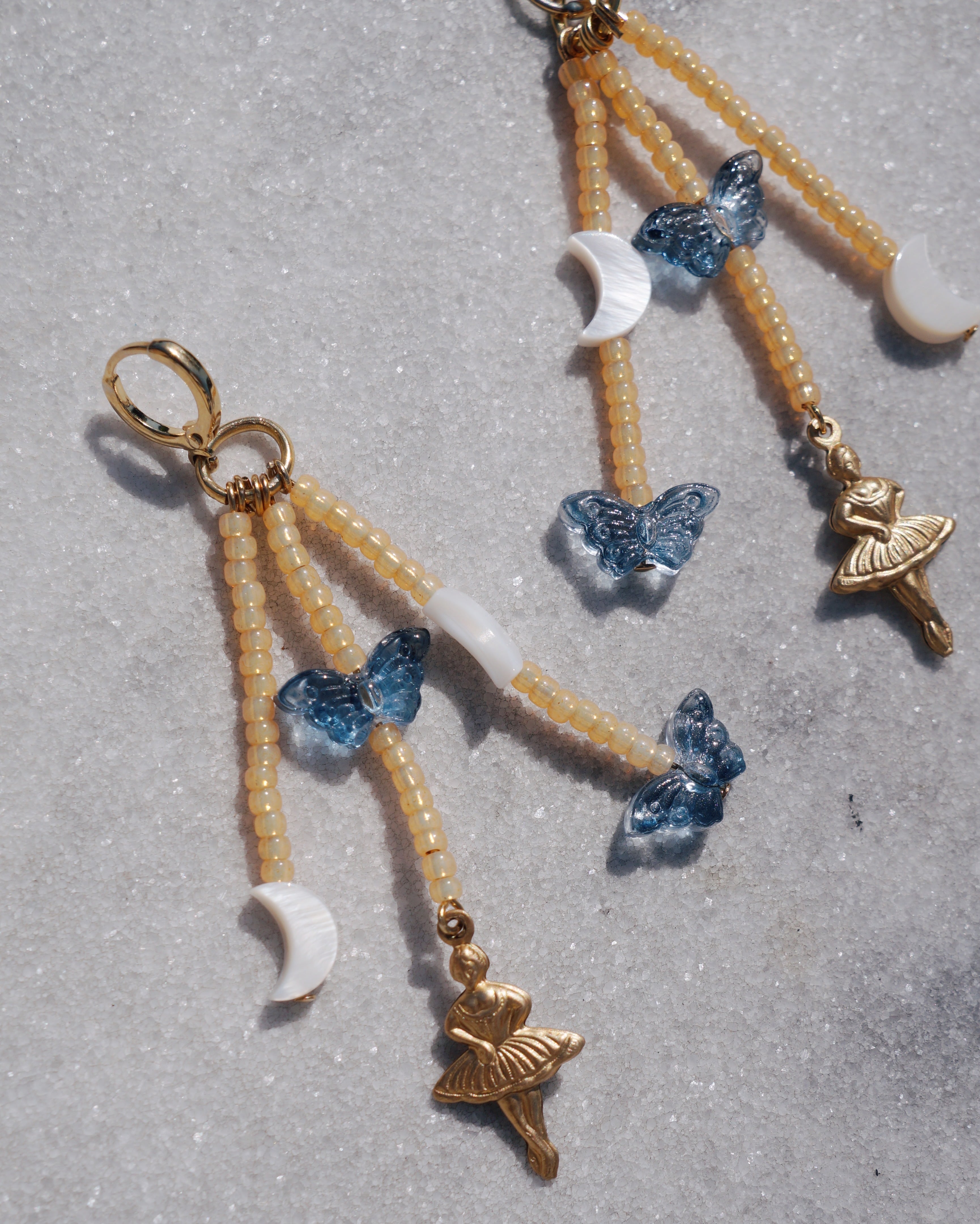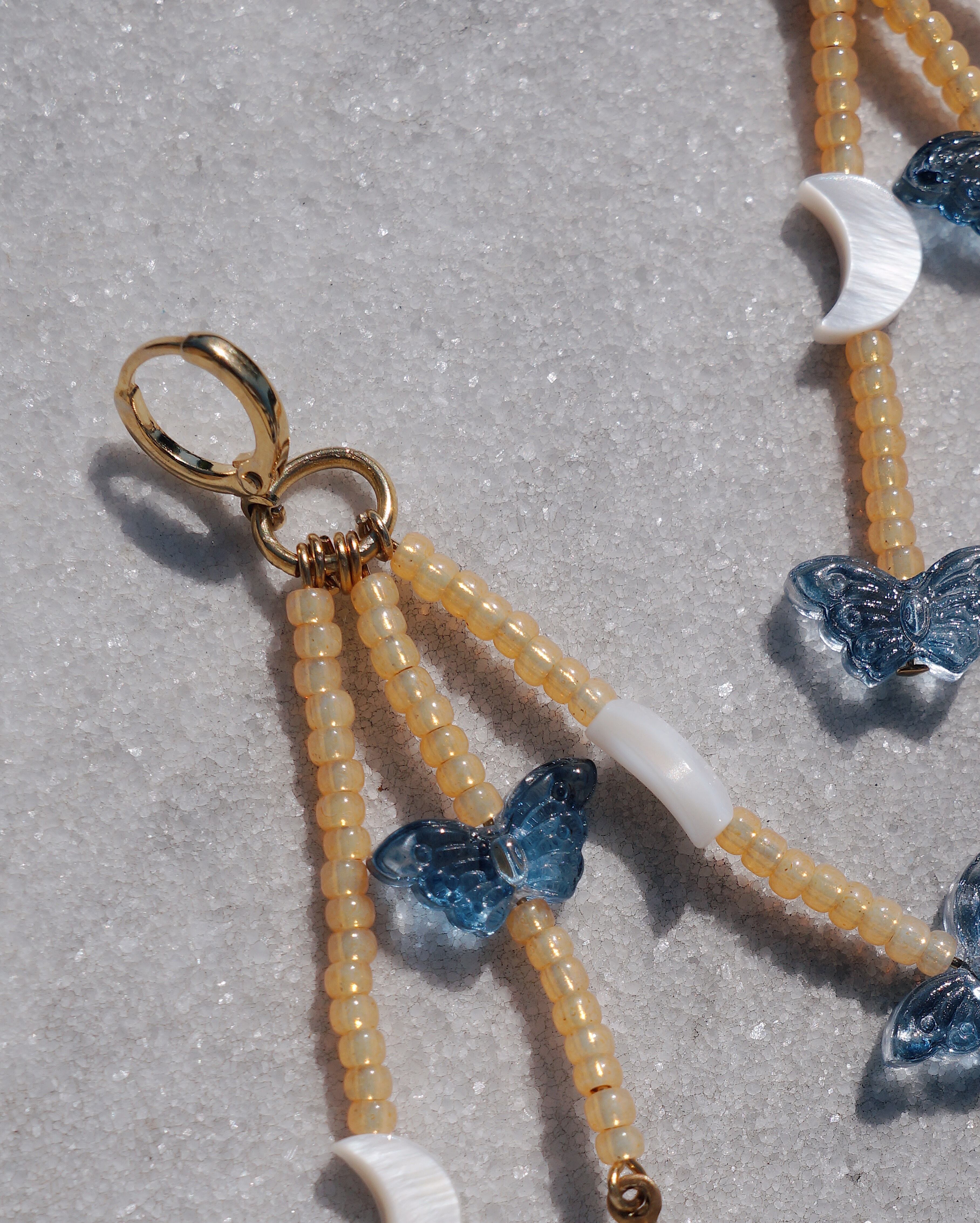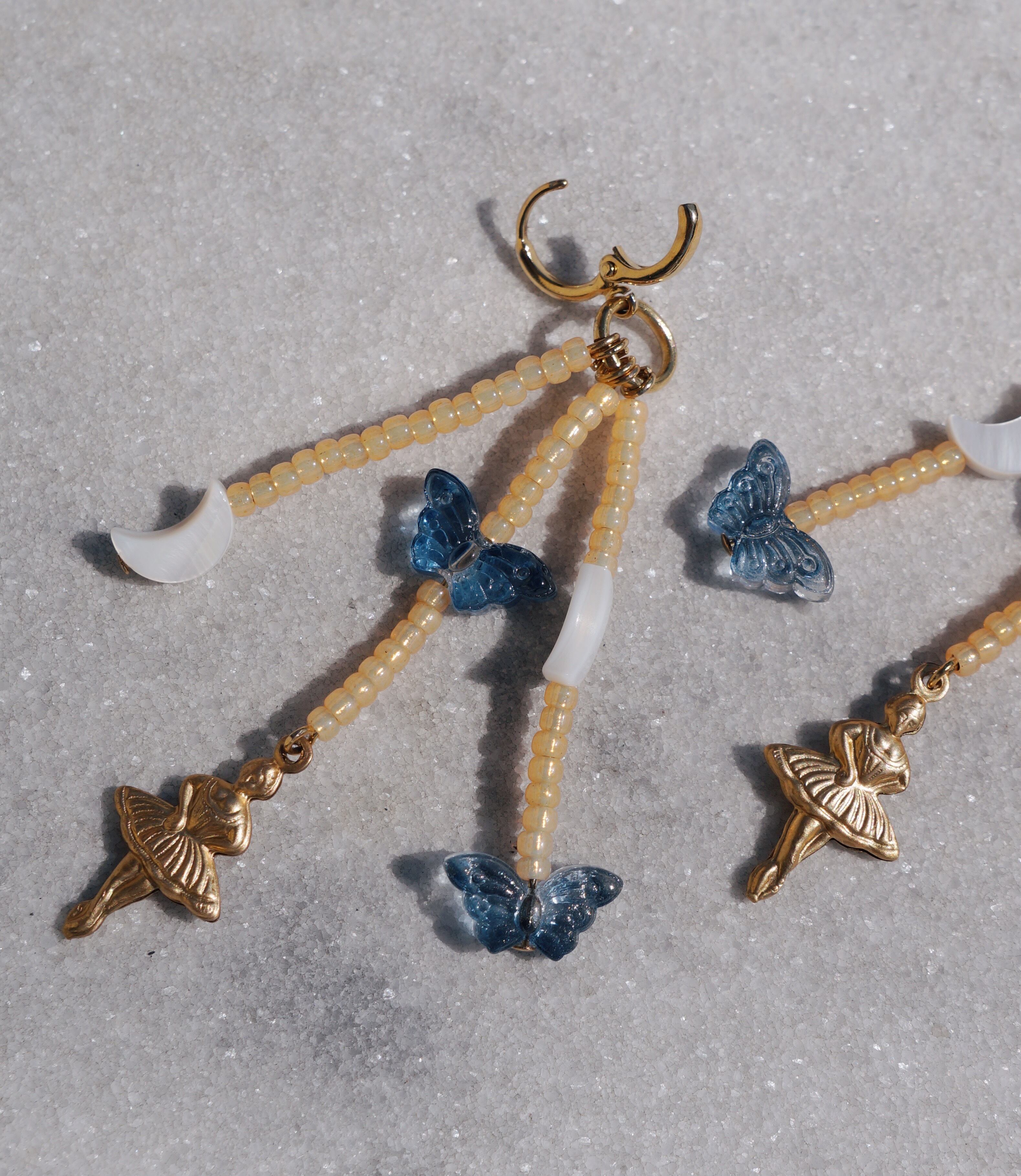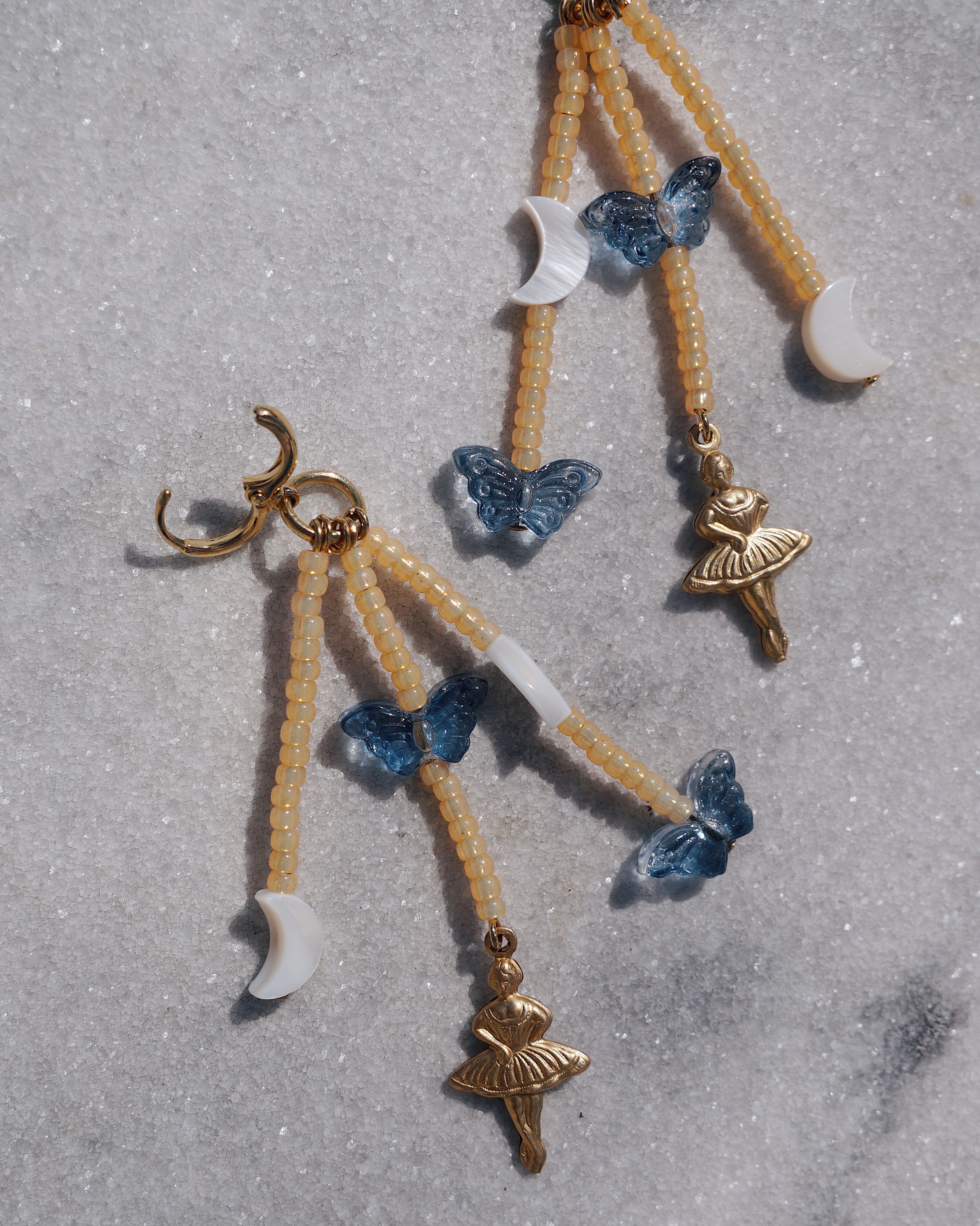垂れ下がっているビーズのチャームが身につけるとゆらゆらと揺れ美しいピアスです。存在感はありますが色味が落ち着いているため、どのようなスタイルにも合せやすい一点です。25232のネックレスとセットで一緒に使っていただくと相性が良く素敵だと思います。