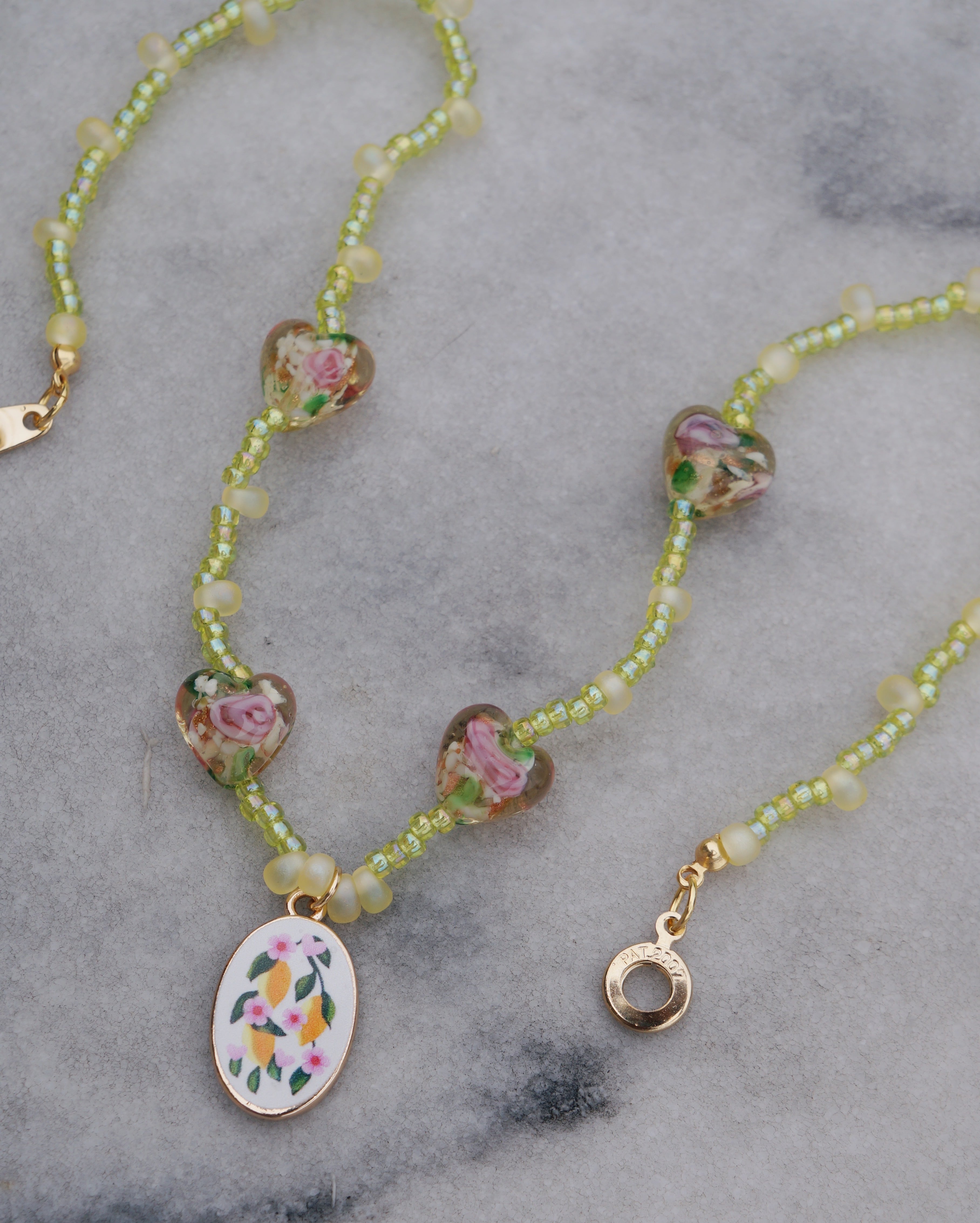 お花とレモンが描かれたチャームに合わせて、ハートのキュートなガラスビーズと全体のビーズも淡い色でまとめました。どのようなコーディネートにも合わせやすい一点です。