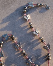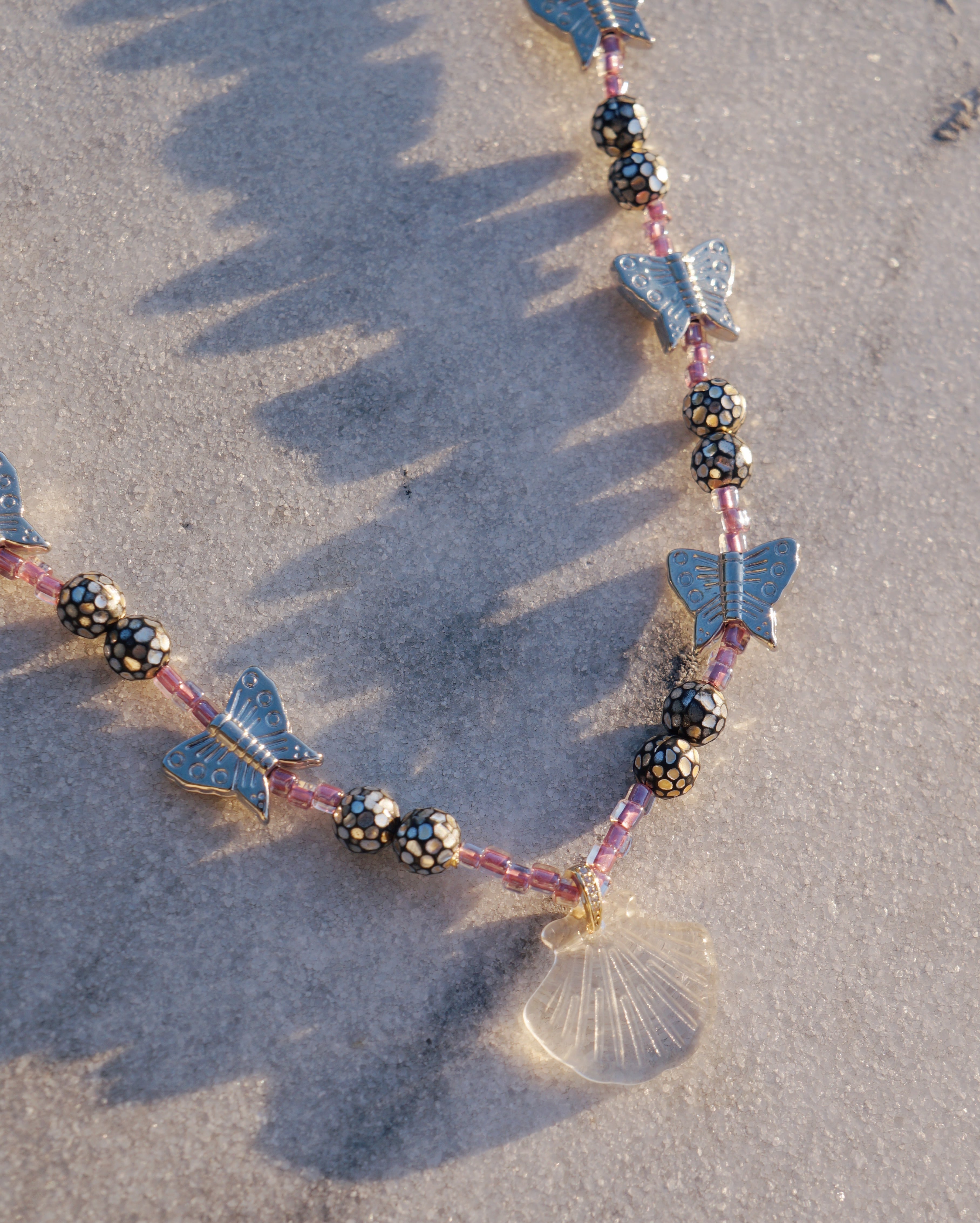 蝶やミラーボールのようなビーズを使ったキラキラ輝く華やかなネックレスです。身につけているだけで心がパッと明るくなりそうな、おすすめの一点です。