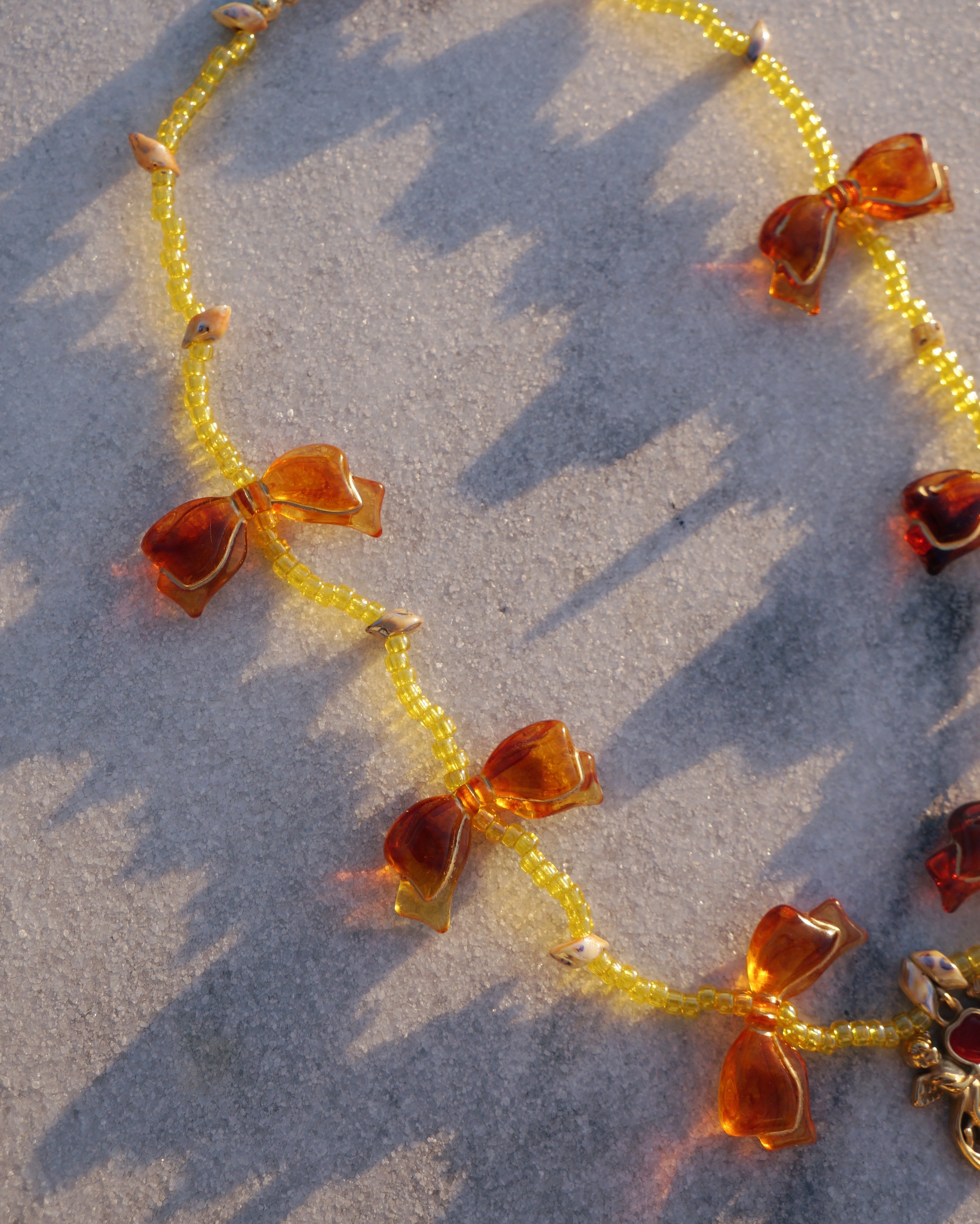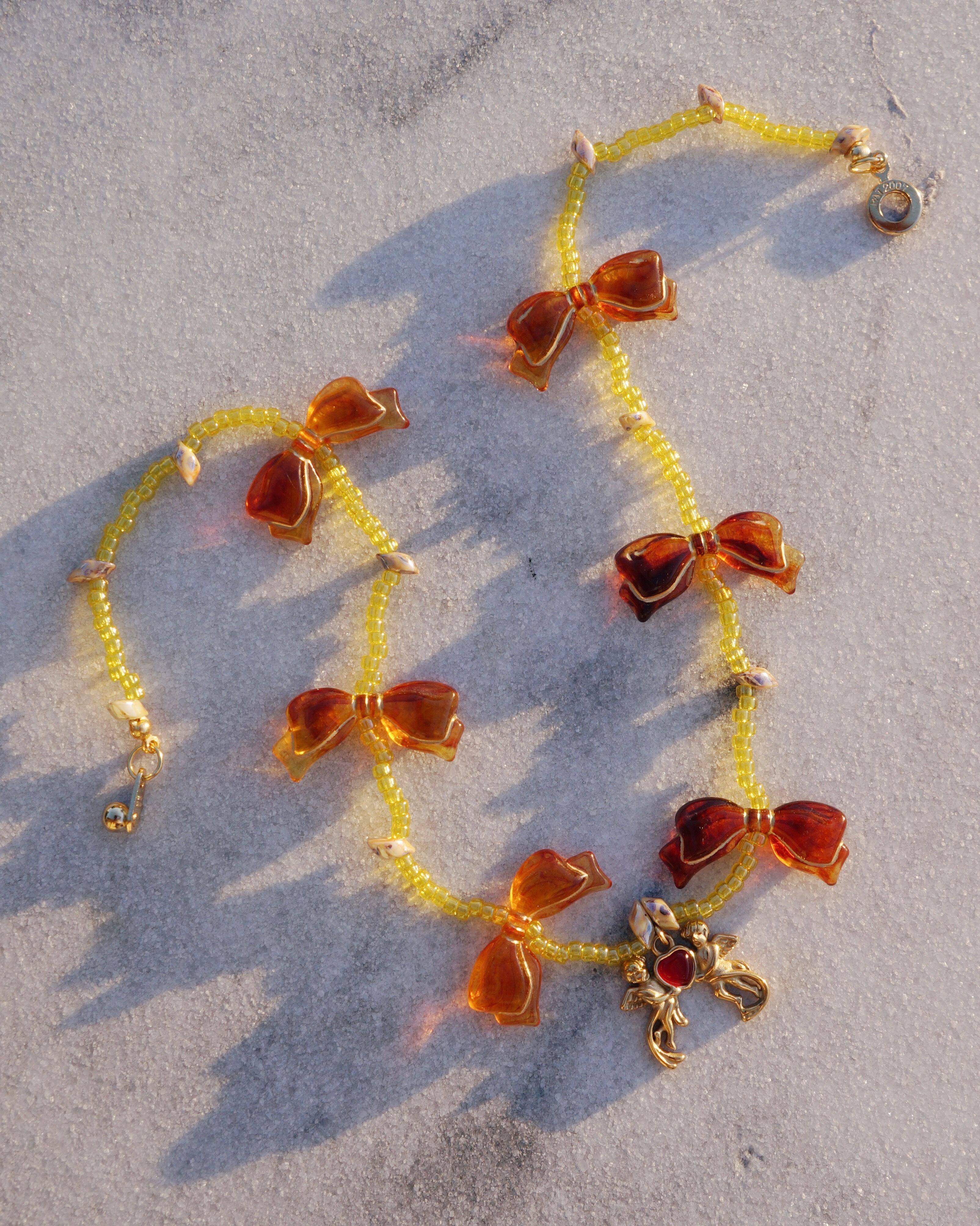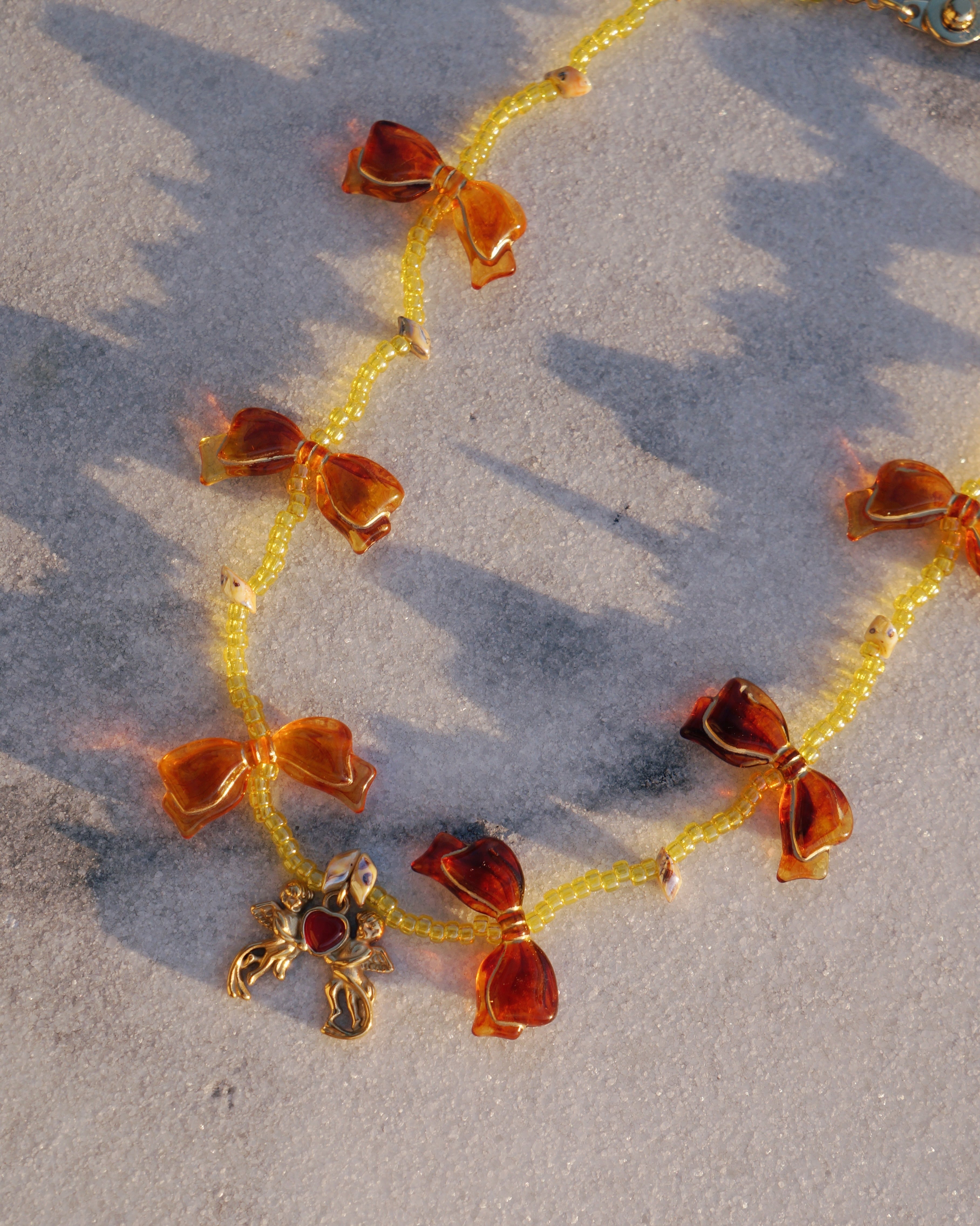 大ぶりなリボンのビーズと天使のチャームが見ているだけでキュンとしてしまう可愛さのネックレスです。カラーを黄色と茶色にすることで甘くなりすぎないデザインにしました。