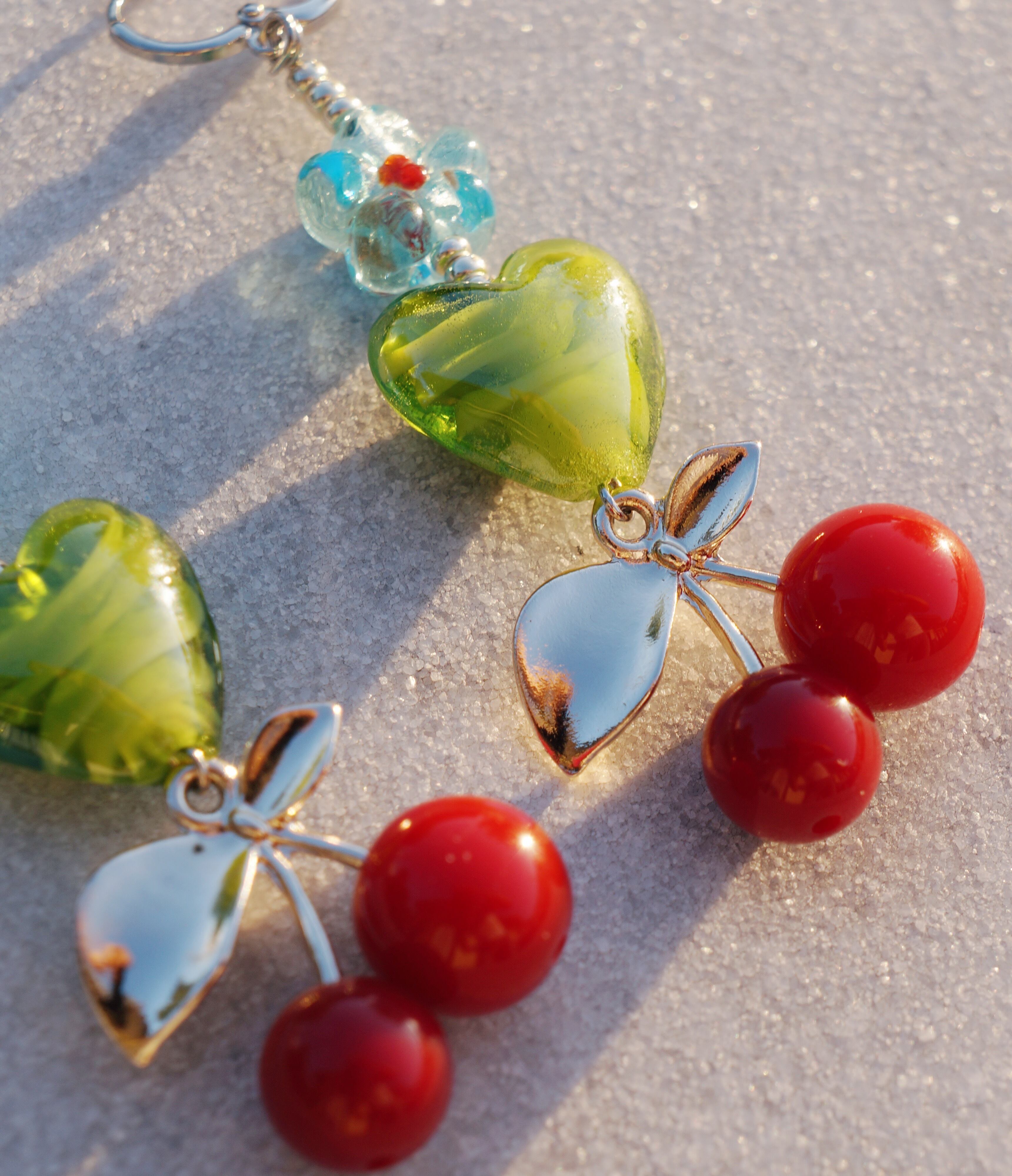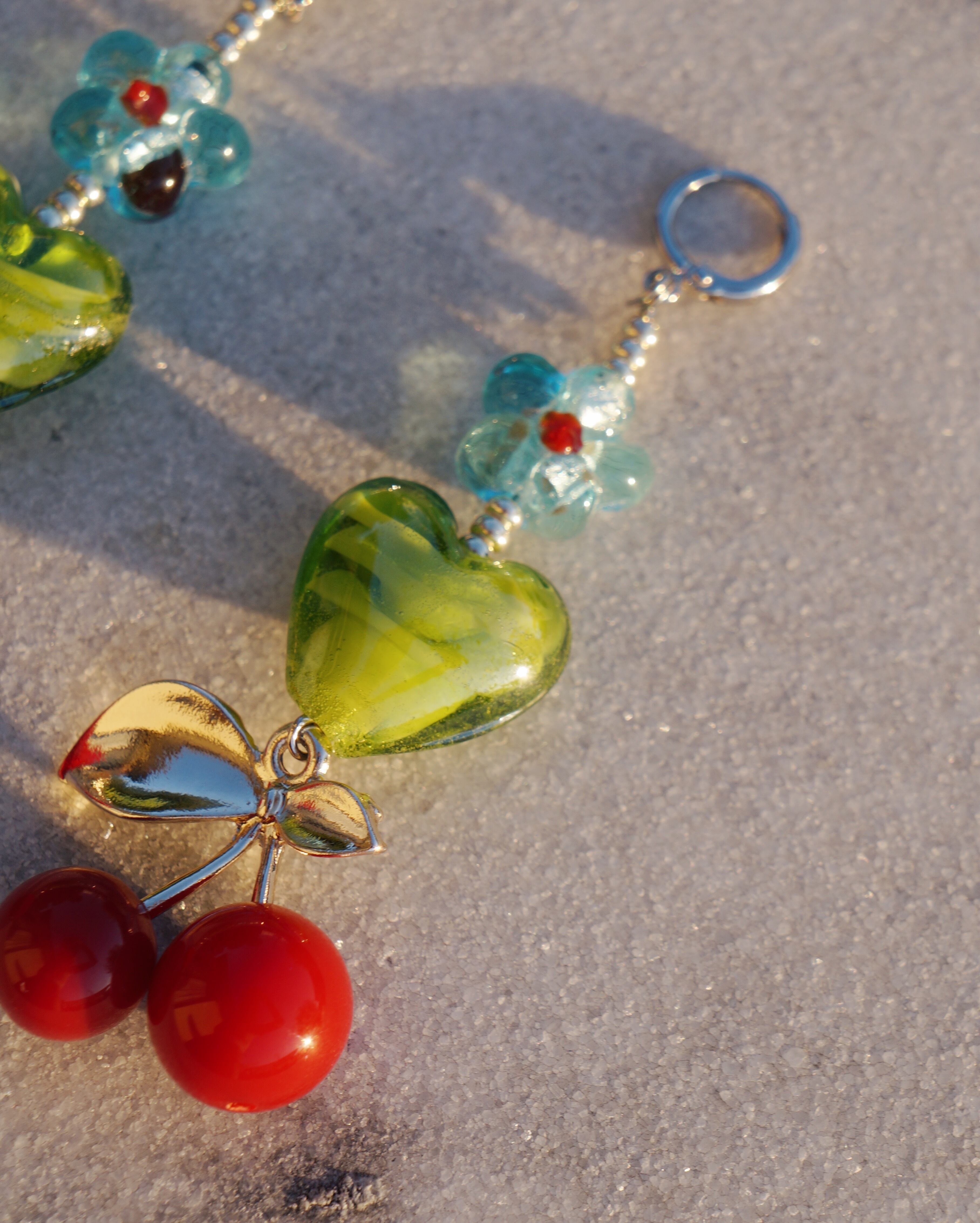 ハートとお花のガラスビーズ、そしてチェリーのチャームが目を惹く存在感抜群のピアスです。