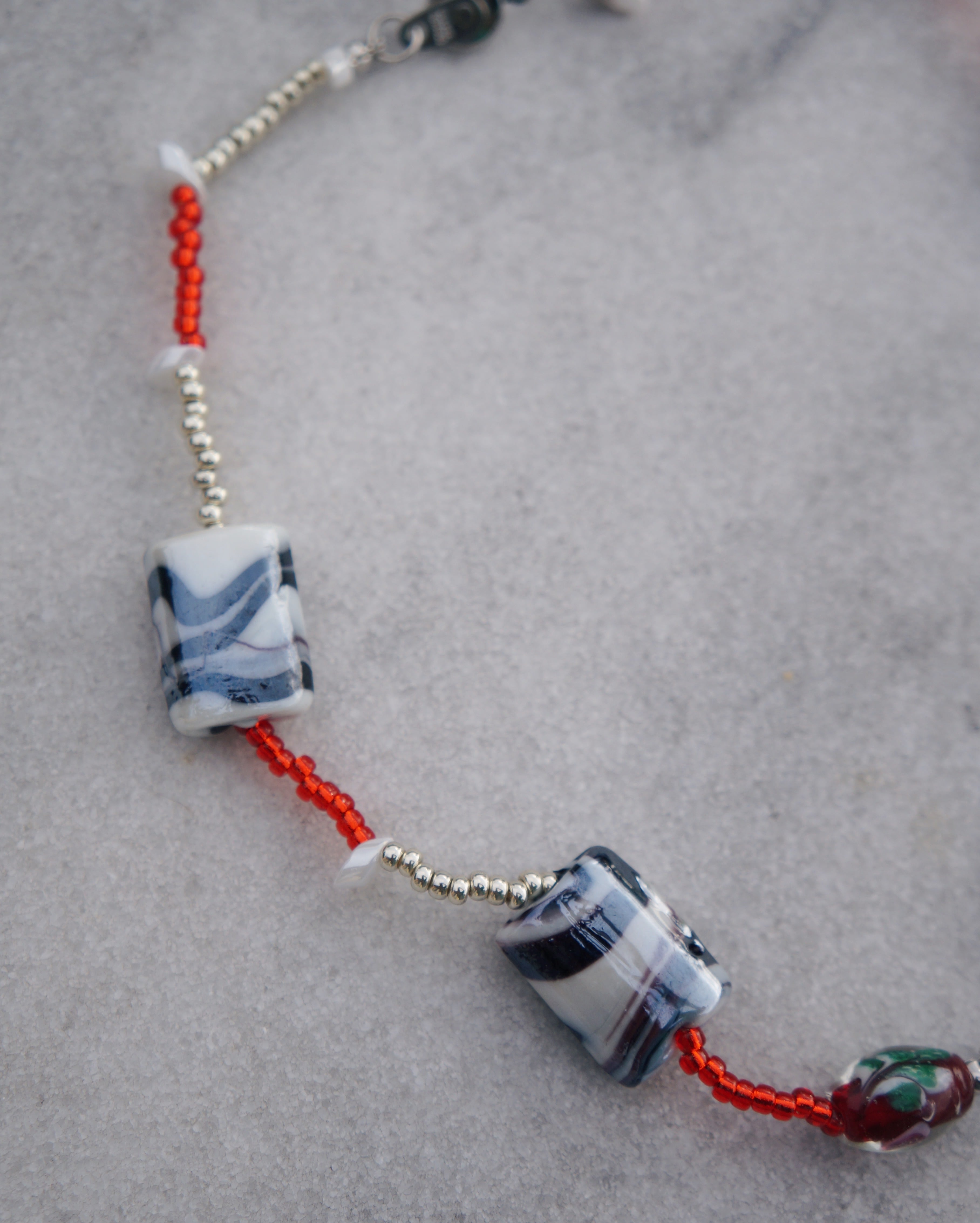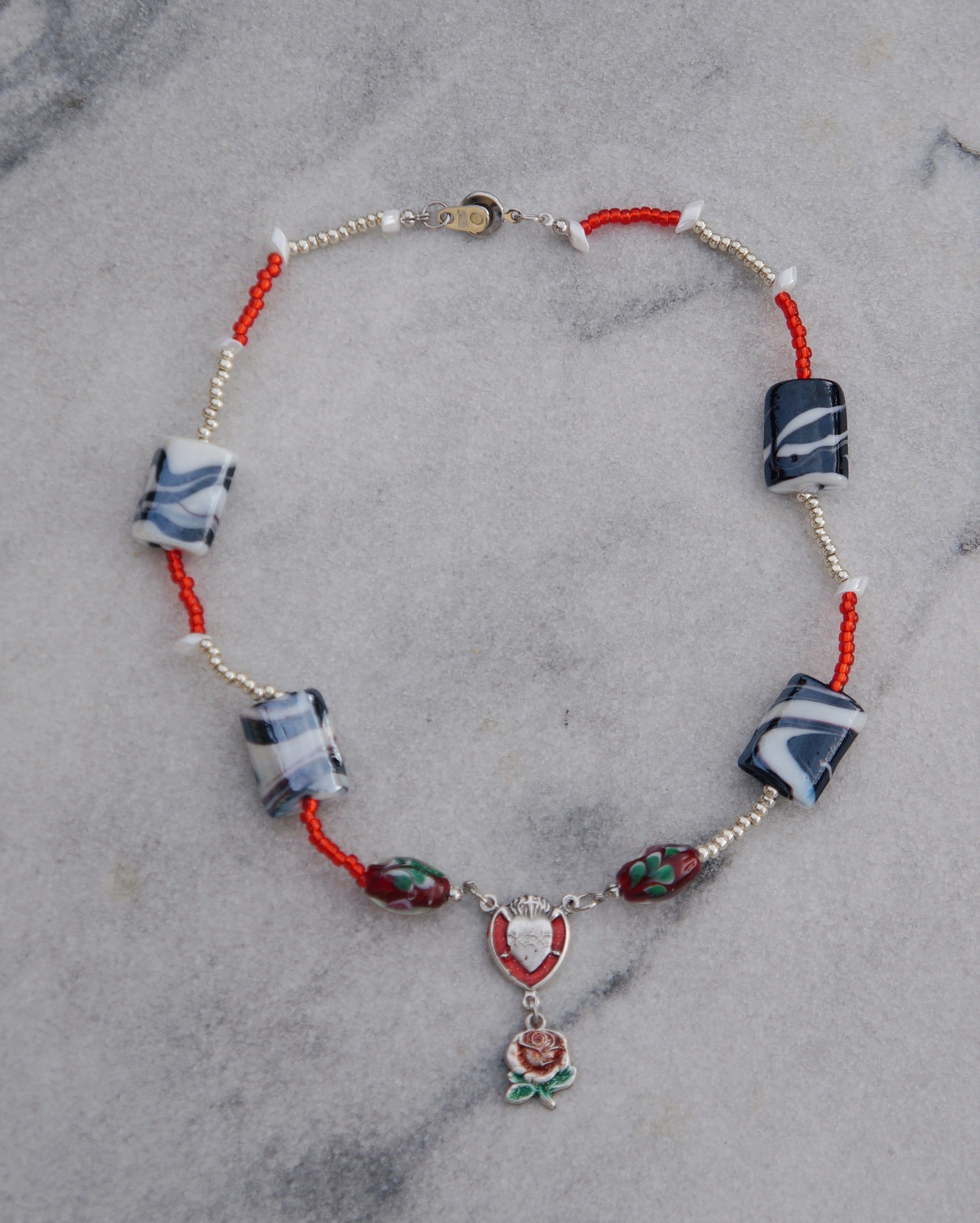 バラ園をイメージしたロザリオ風ネックレスです。メダイや薔薇のパーツはイタリア製のものを使っています。