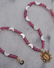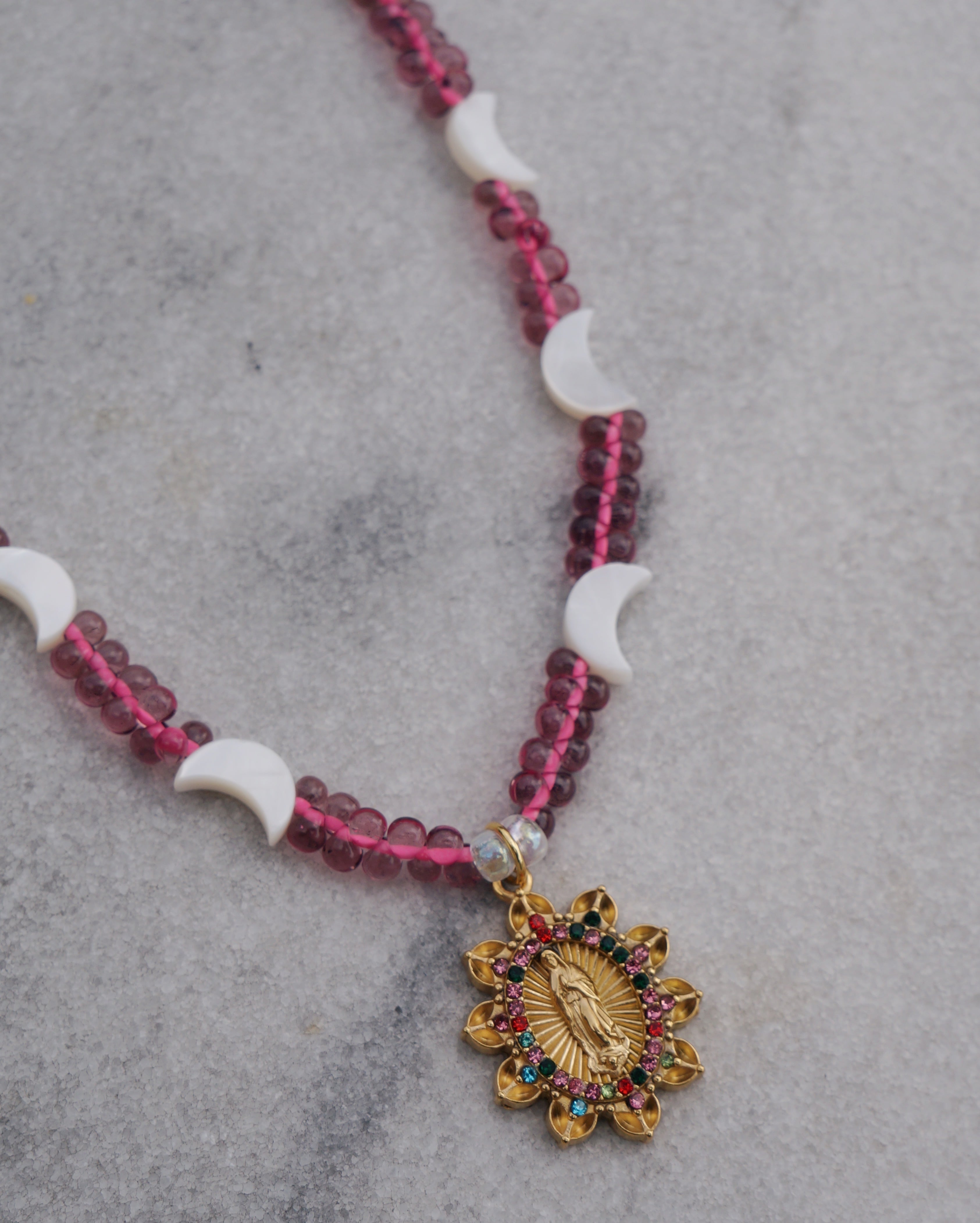 キラキラのメダイチャームとピンクのカラービーズ、シェルの月ビーズが素敵な一点です。ポップさとシックさを兼ね備えた美しく目を惹くデザインで、スタイリングを一気に華やかにしてくれます。