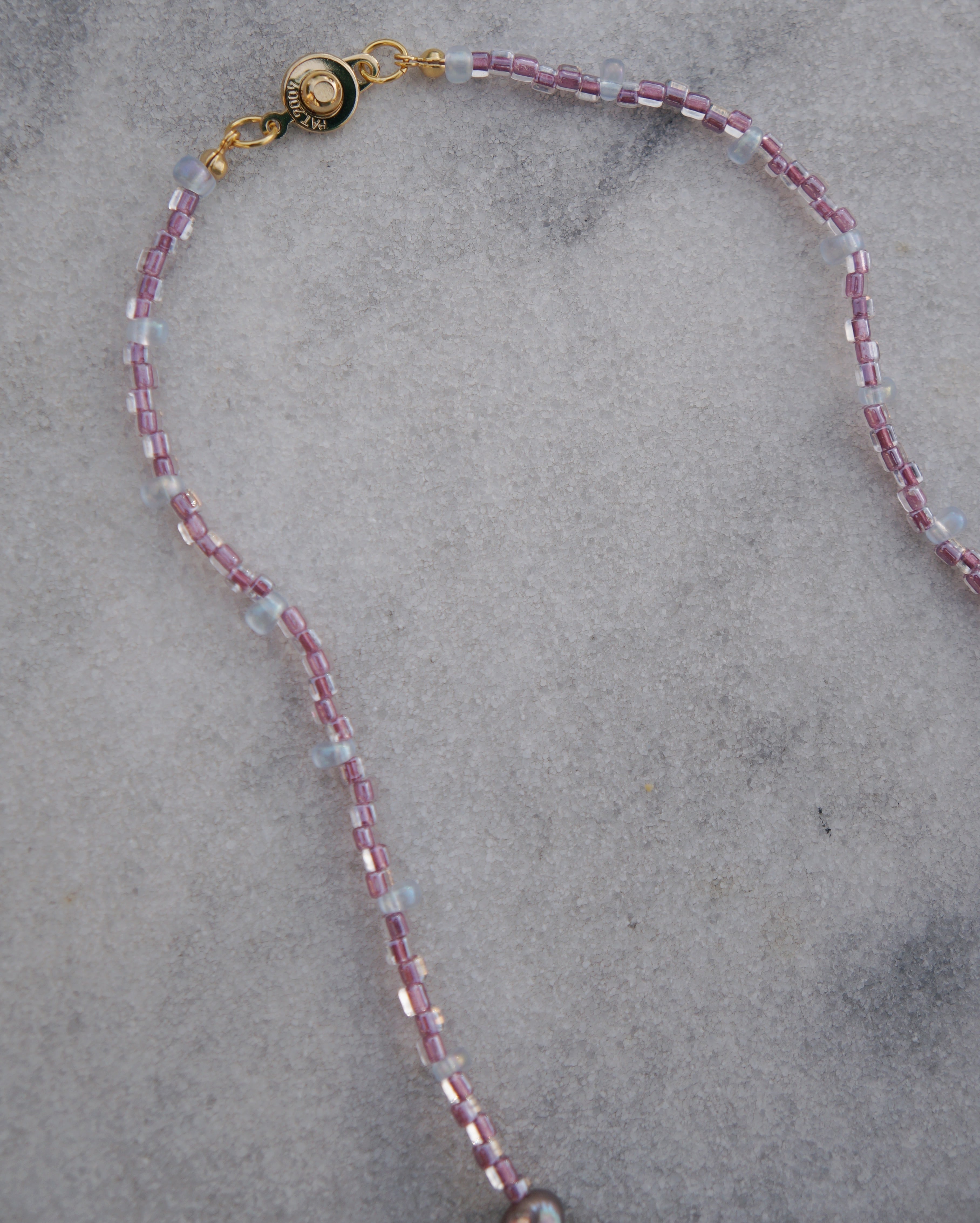 祈りの手のチャームがポイントの淡いカラーのビーズと淡水パールを使ったネックレスです。存在感はありますがどのようなスタイリングにも合わせやすい一点です。
