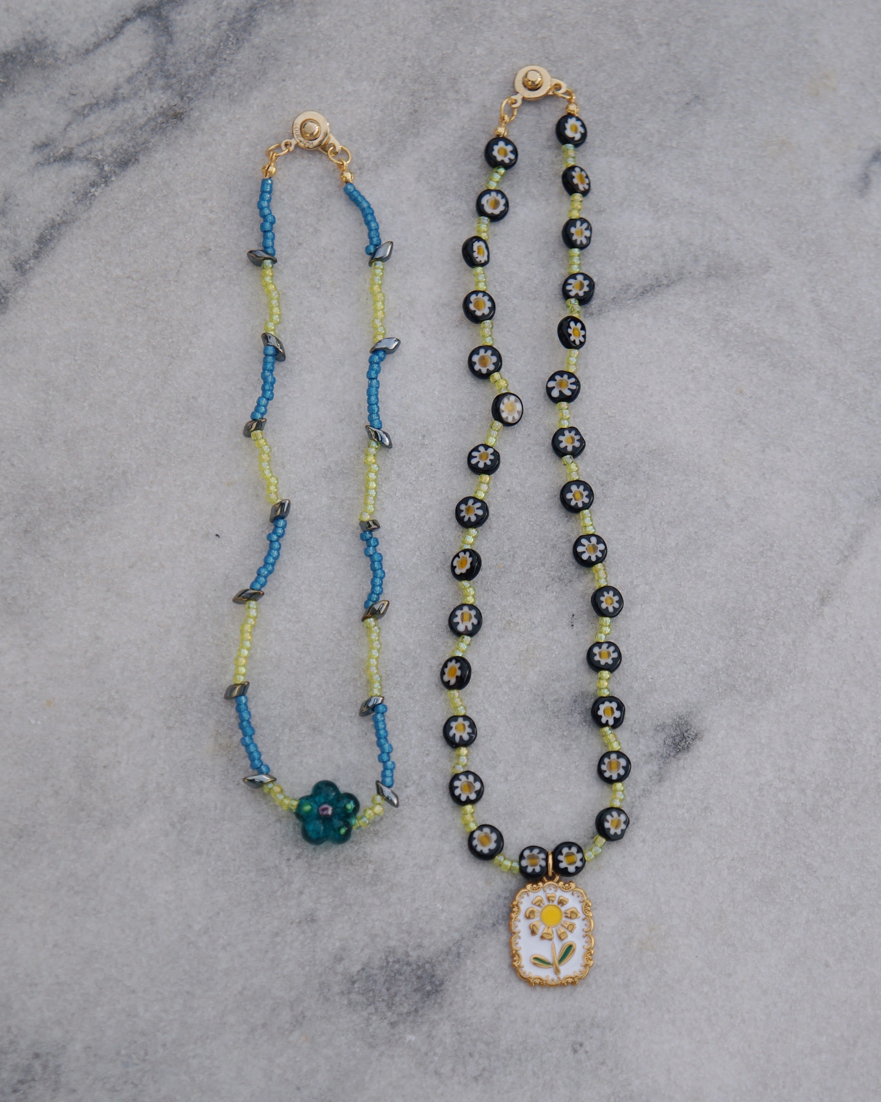 2連のセットネックレスです。お花柄のミルフィオリビーズをデザインの中心に、お花畑にいるような気分になれるキュートなネックレスをデザインしました。セットで使ったり、一個ずつ使ったりとお洋服や気分に合わせ自分らしく楽しんでもらえます。※短い方のネックレスは少しゆとりがあるチョーカーぐらいの長さです。