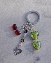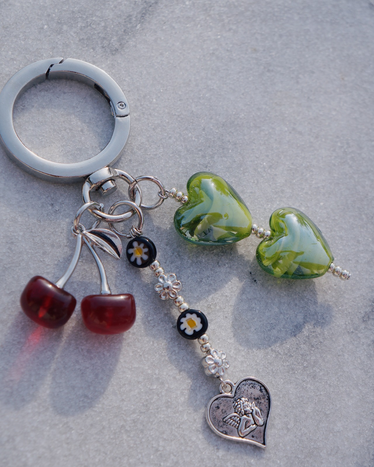 可愛らしさの中の少し毒々しい雰囲気も入れたJBCGらしいデザインのキーフォルダーです。チェリーやガラスビーズのハート、そして天使のモチーフのパーツなどじゃらじゃらと存在感があります。バッグやパンツのベルトループにつけたり、鍵などをつけるキーチェーンとして使ったりと様々なシーンで大活躍してくれるアイテムです。
