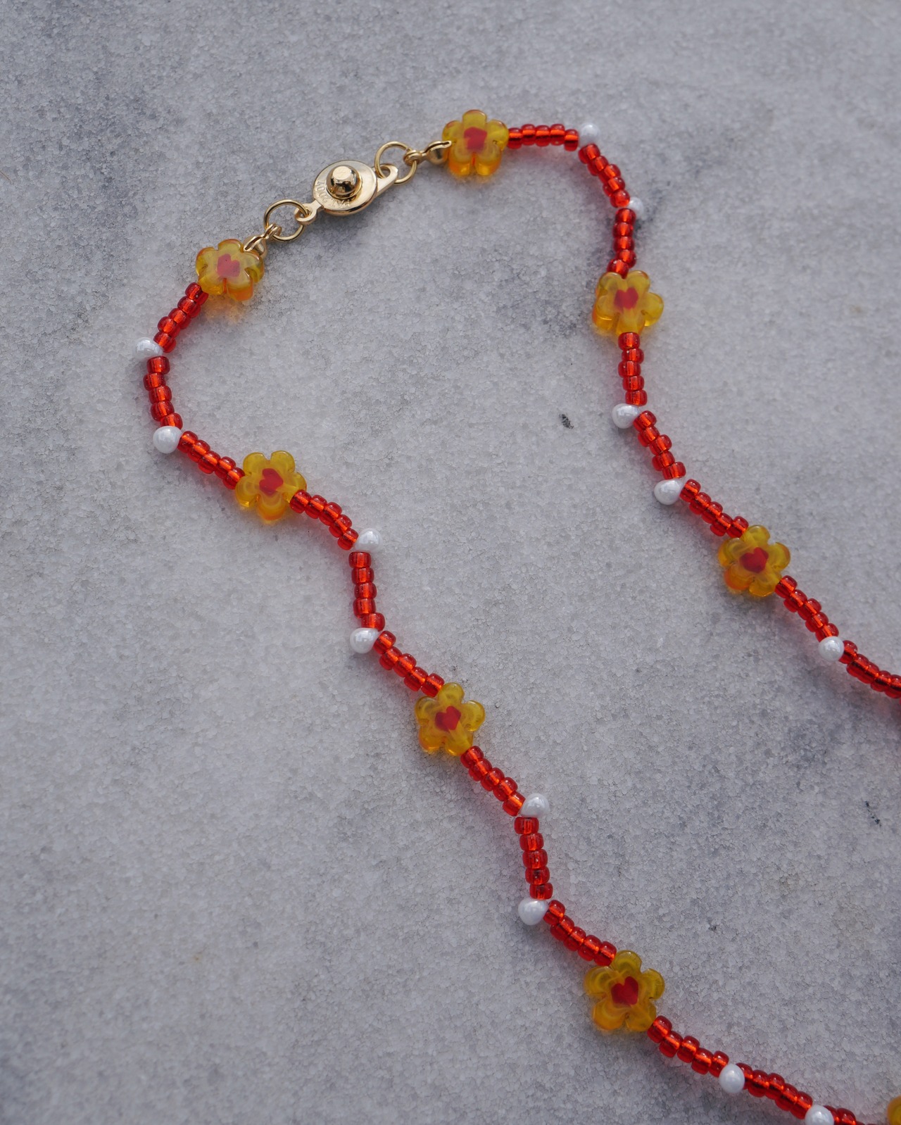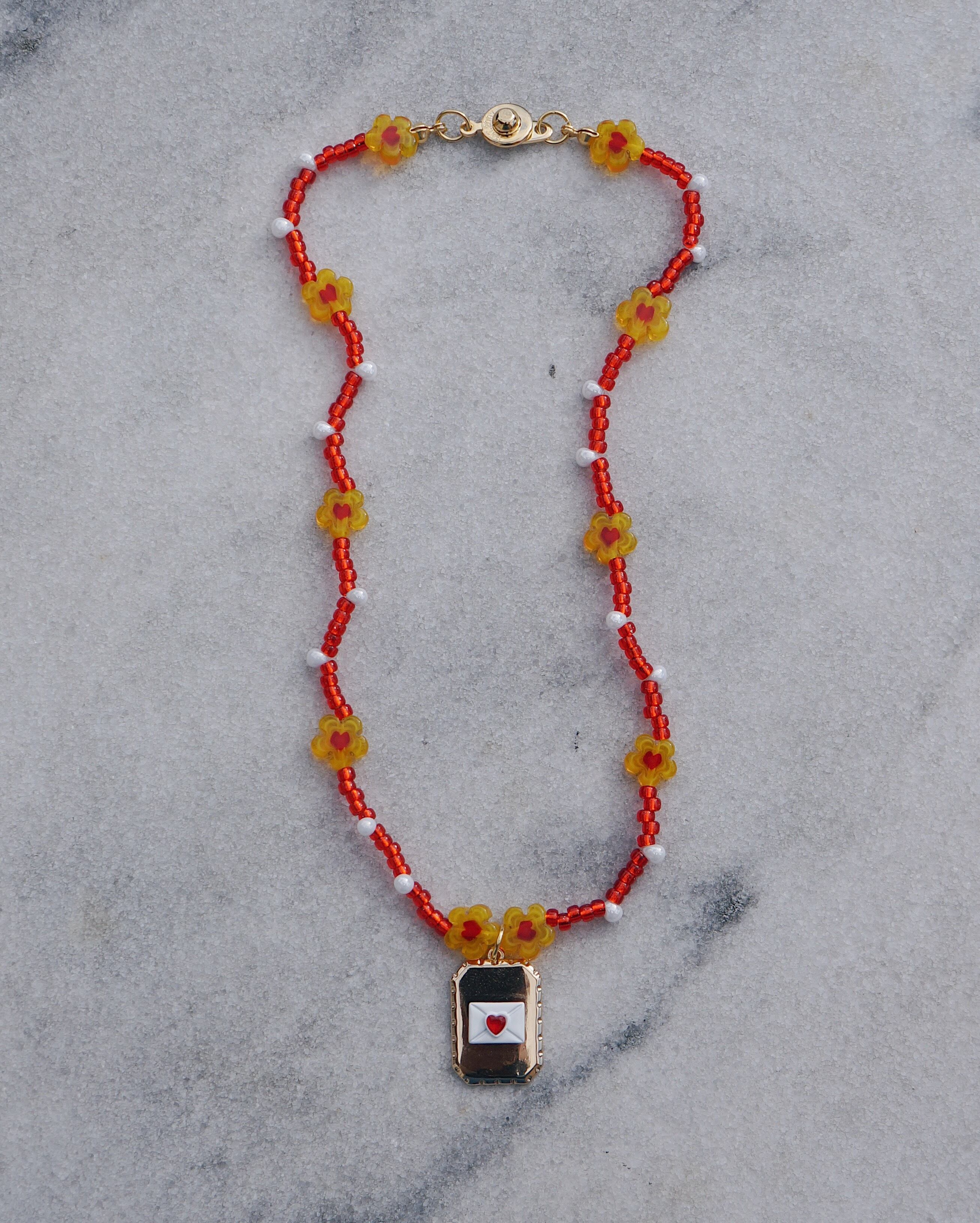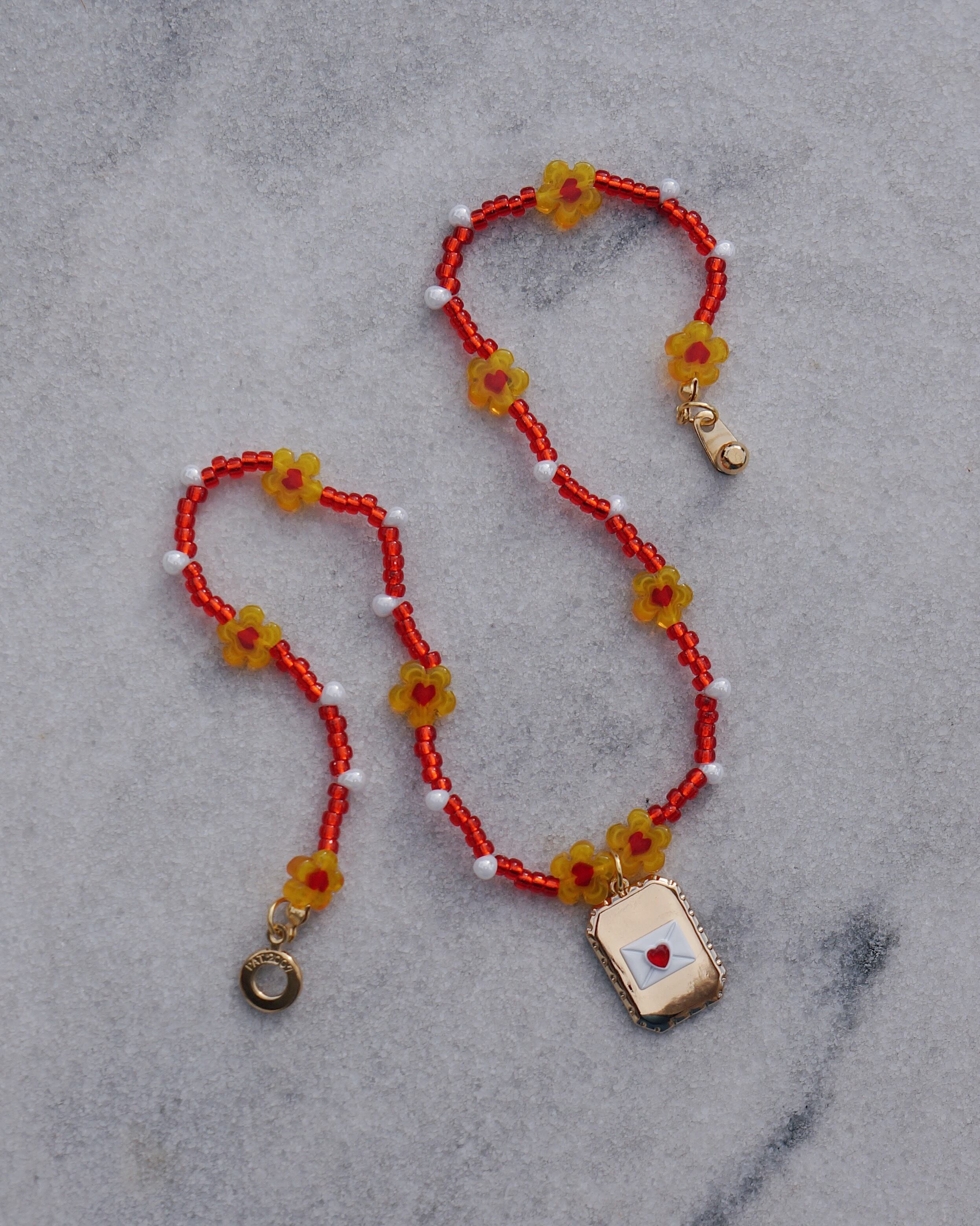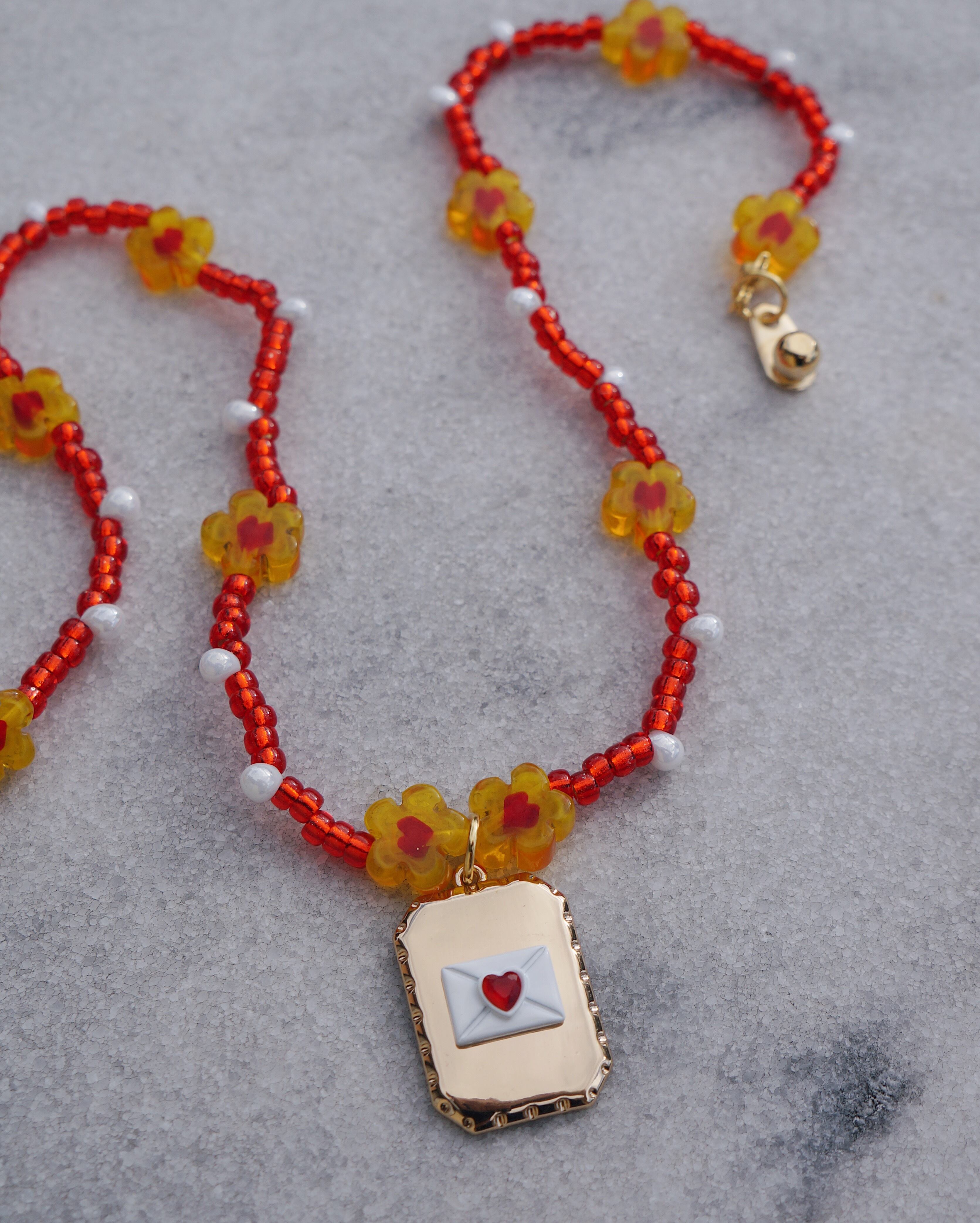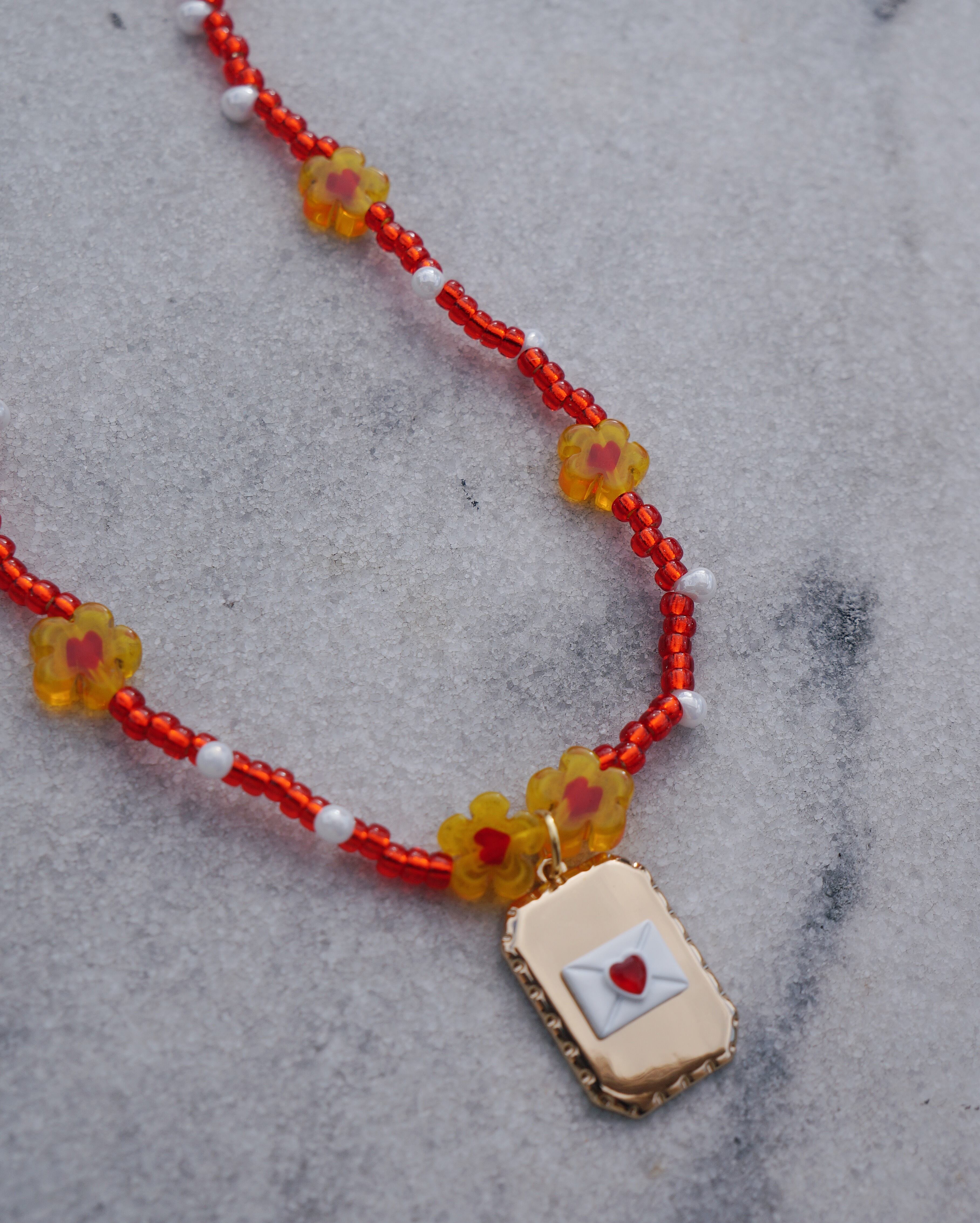 お手紙のモチーフのチャームがポイントのユニークなネックレスです。赤と白のビーズと黄色のお花のカラーコンビネーションがとってもキュートです。