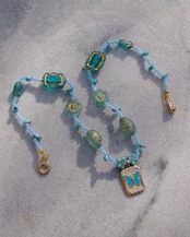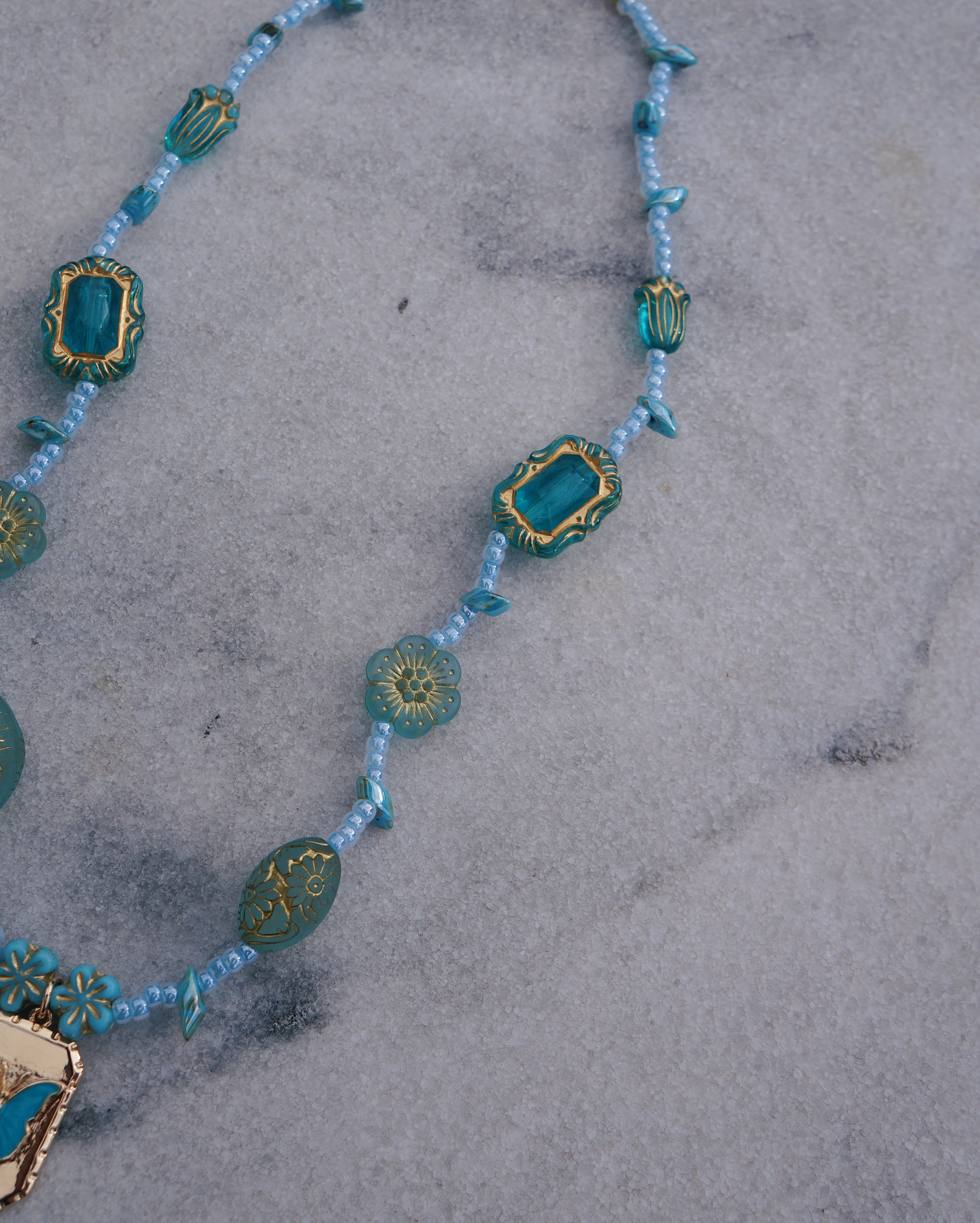 蝶のモチーフのチャームに合わせ全体的にブルーで統一した美しいネックレスです。様々なモチーフのチェコビーズを使い華やかさも出し、首元が一気に明るくなるような一点です。