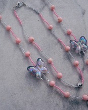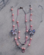 チョーカーぐらいの長さの短めのネックレスと少し長さがあるネックレスの2連のセットです。大ぶりの蝶のパーツがとっても可愛く、存在感があります。全体的にピンクとキラキラ光るビーズ、そしてピースマークのチャームをピンクにして可愛らしさを存分に出しました。別々でも勿論使っていただけるので、その日の気分に合わせて使い方を変えて楽しんでもらえたらいいです。