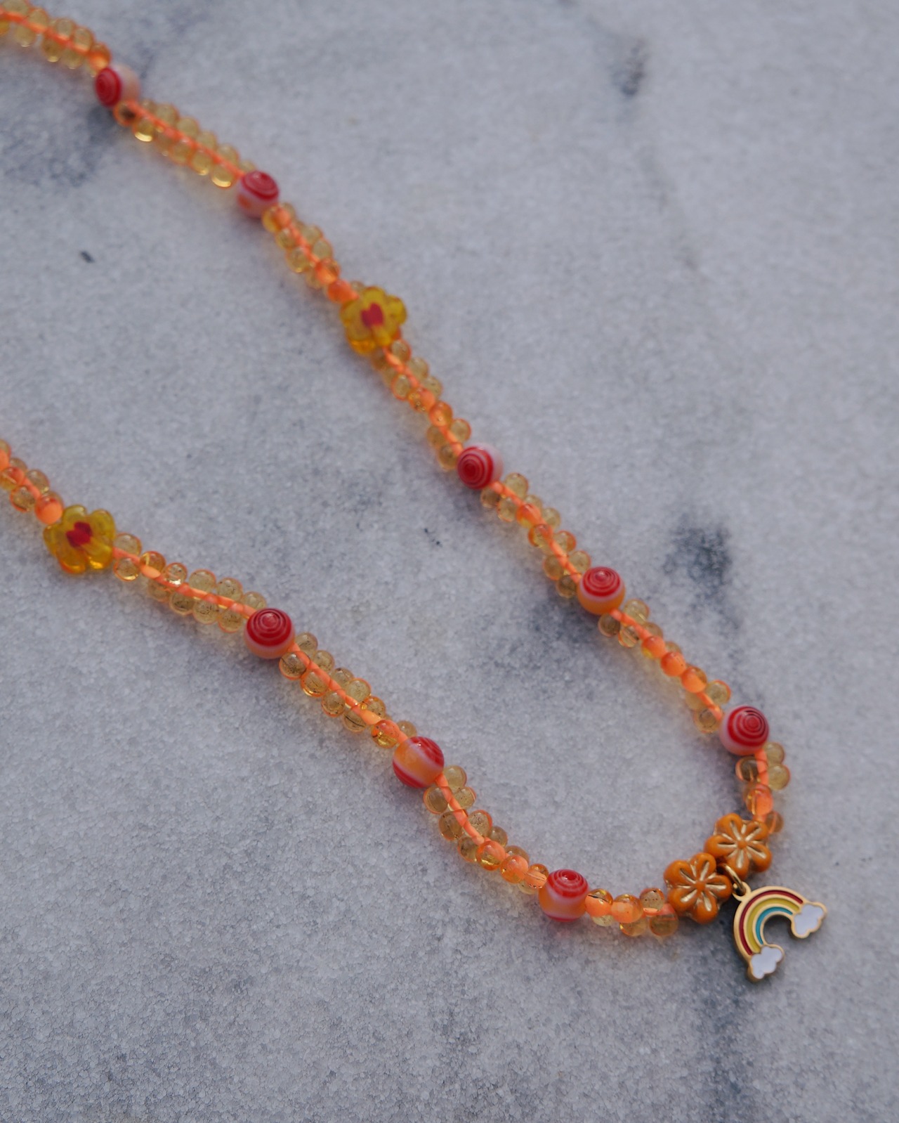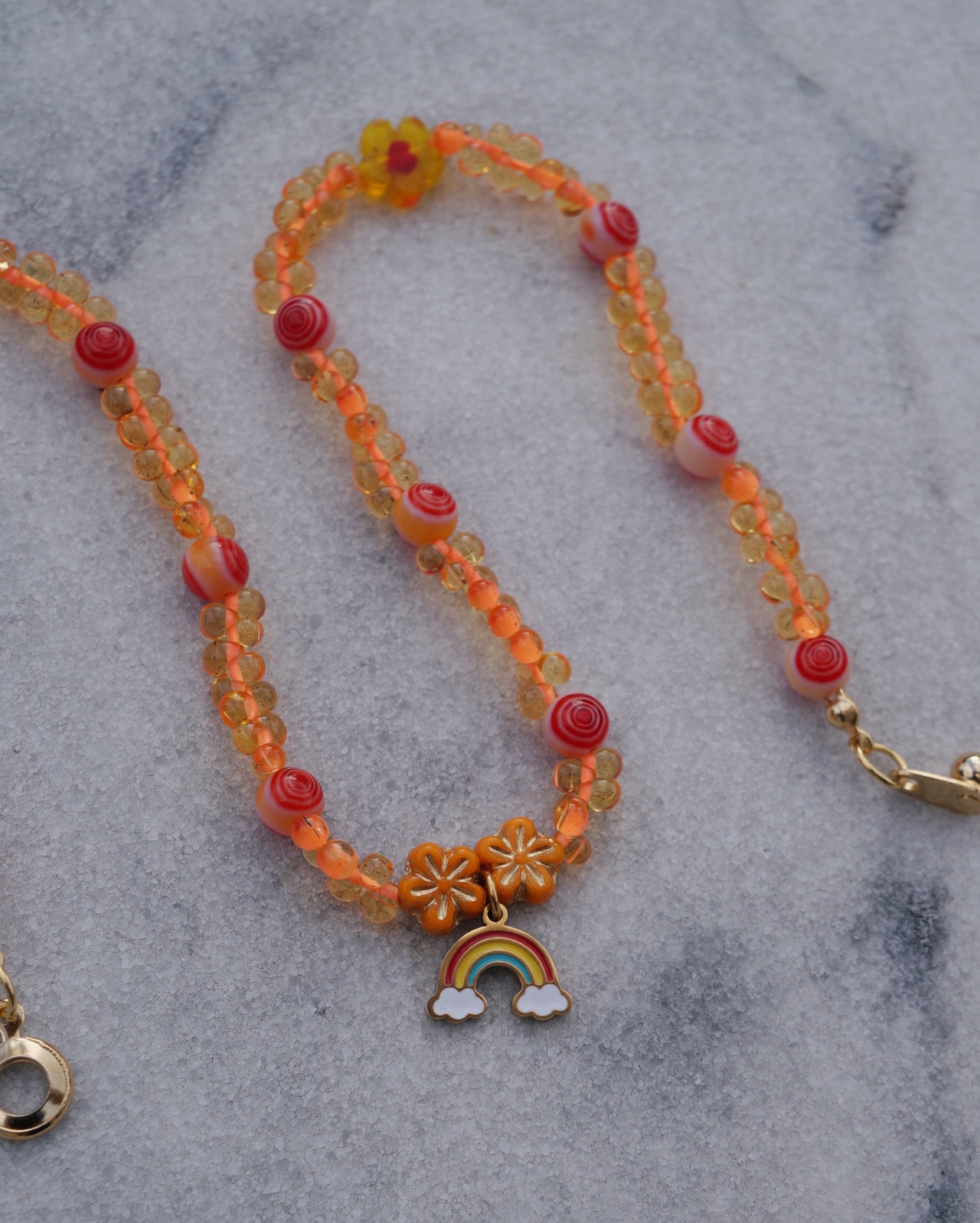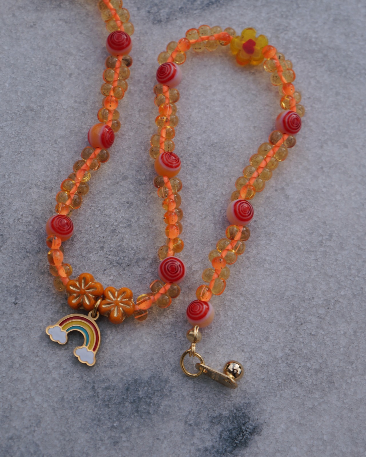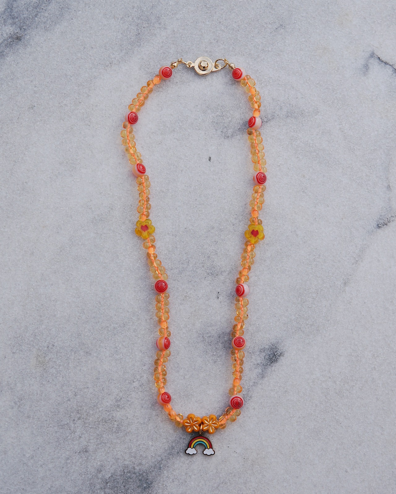 渦巻が描かれたユニークなガラスビーズを使ったビンテージぽさもあるキュートな一点です。虹のチャームが可愛く身につけているだけでHAPPYな気分になれそうなネックレスです。