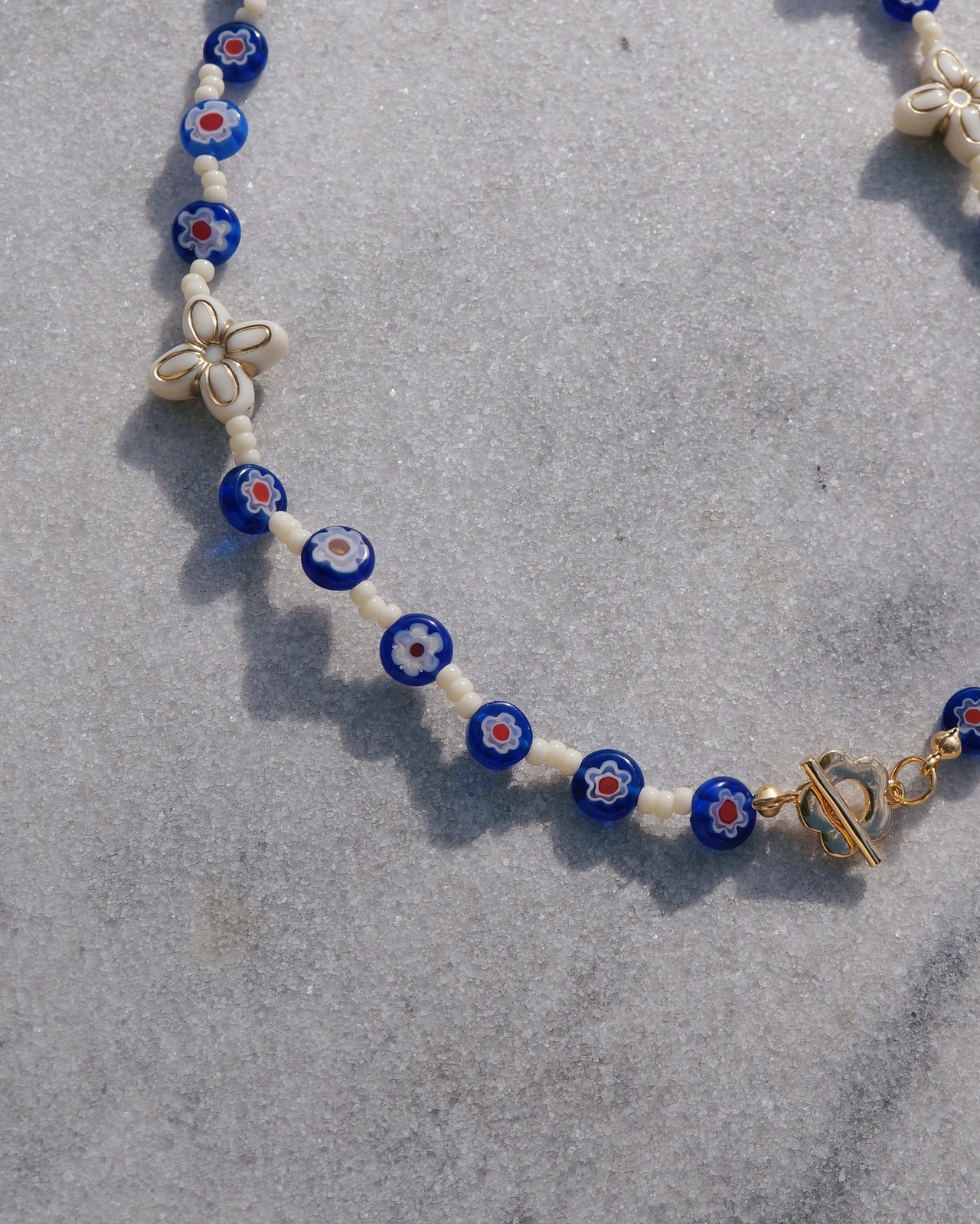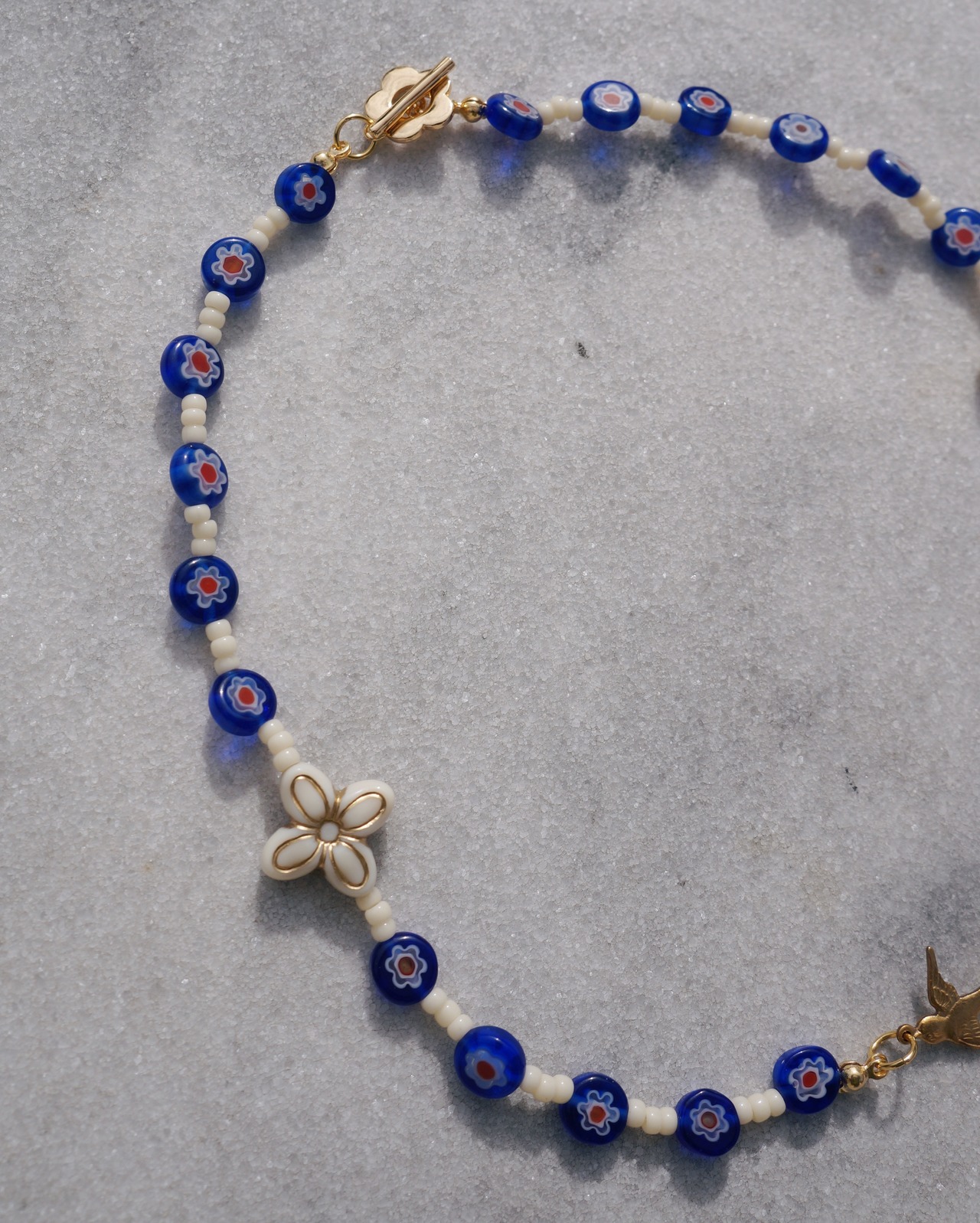 お花柄のミルフィオリビーズをデザインの中心に、ツバメのチャームが美しいネックレスです。お花のマンテルを前に持ってきてもいいので2WAYで使っていただ苦ことができます。