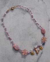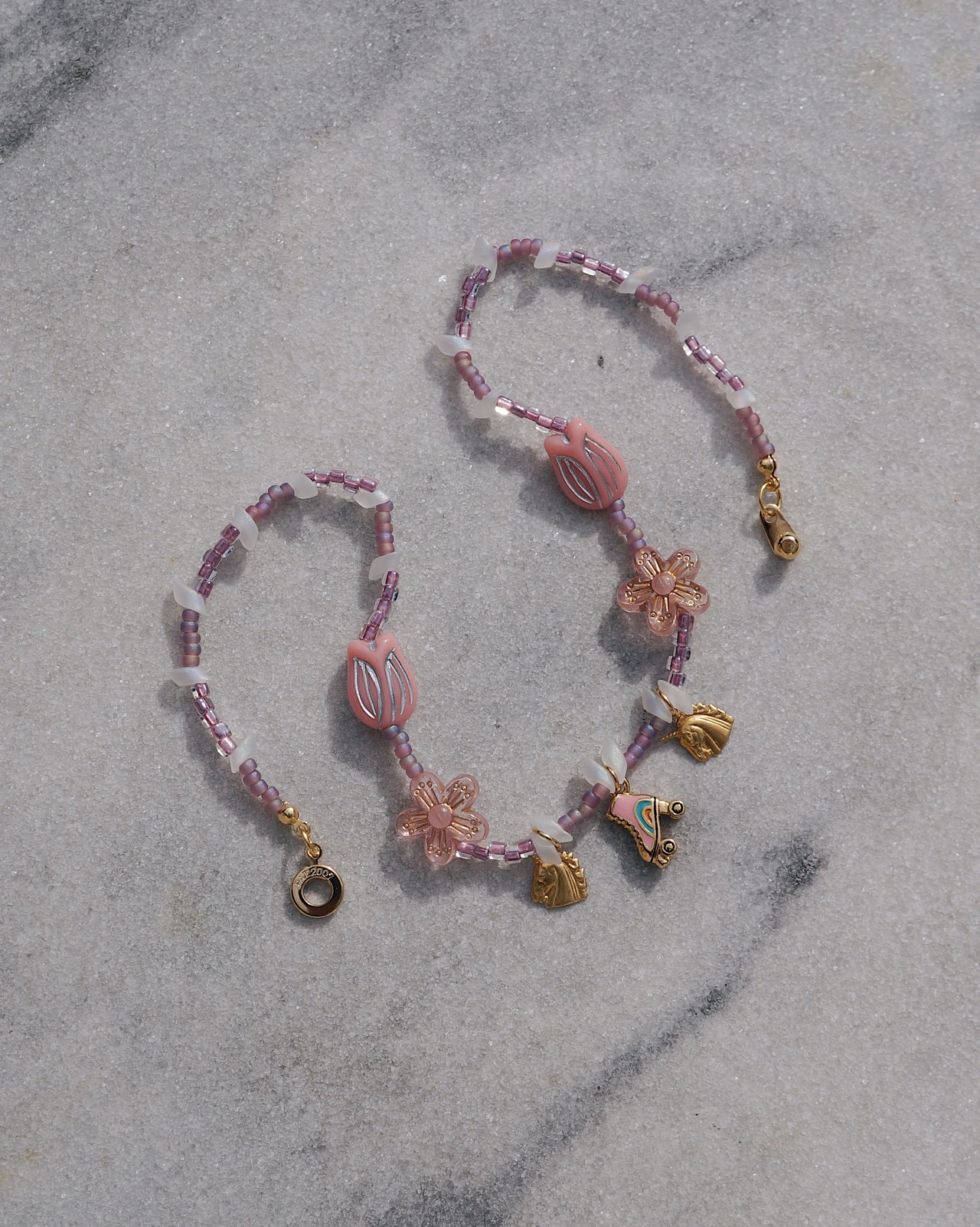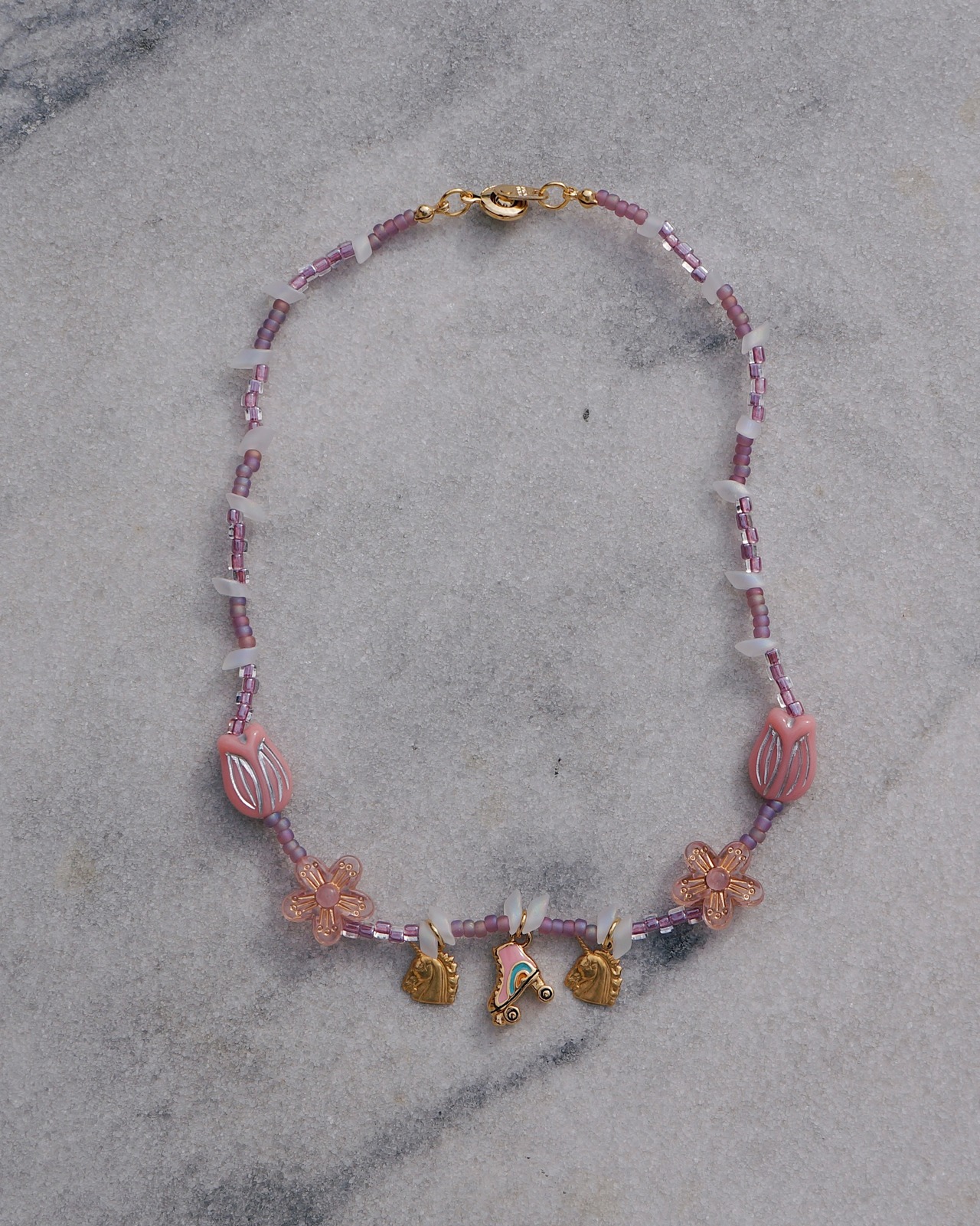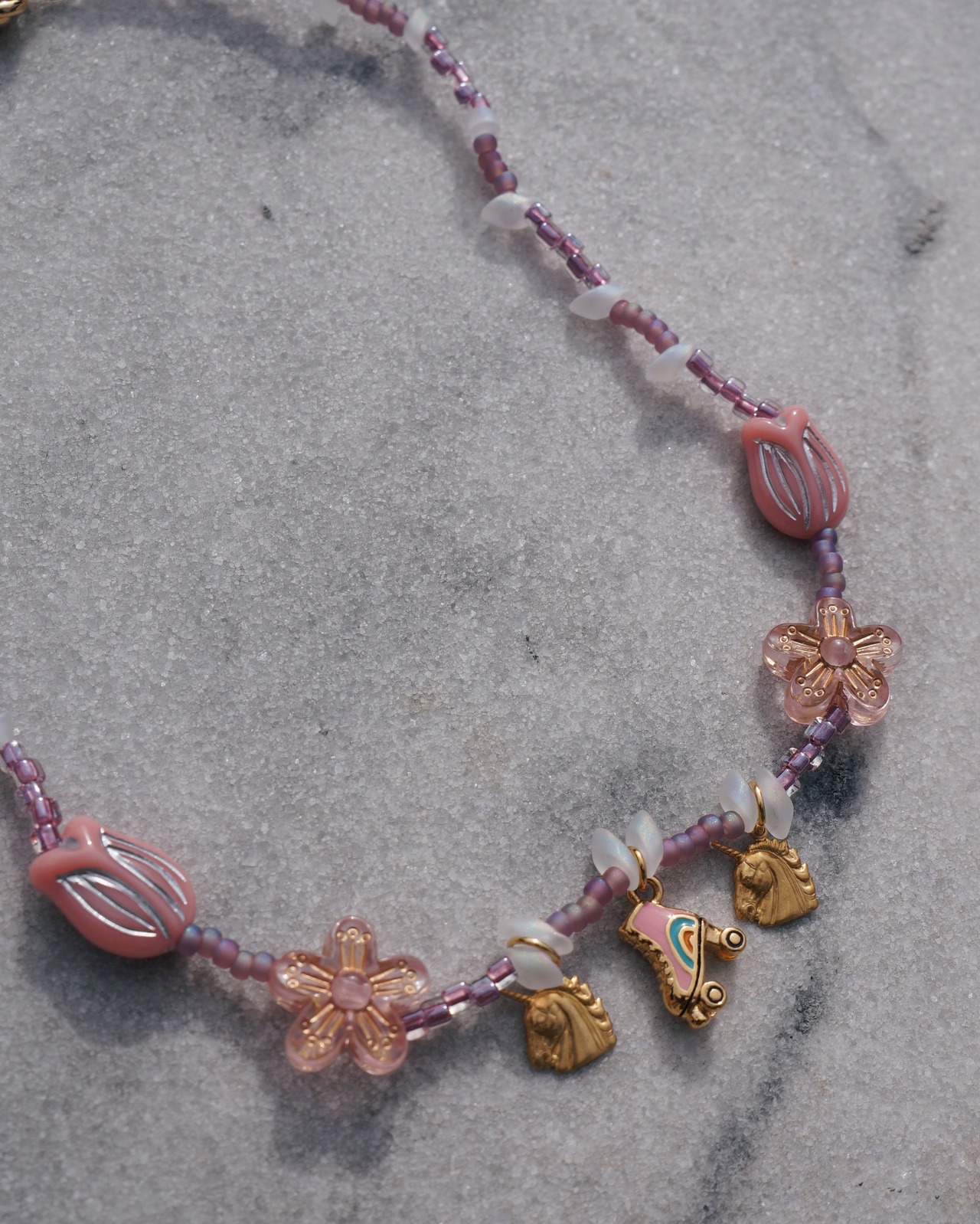 淡い紫のカラーとピンクのチェコビーズ、そしてユニコーンとローラースケートのチャーミングなチャームがとってもキュートなネックレスです。