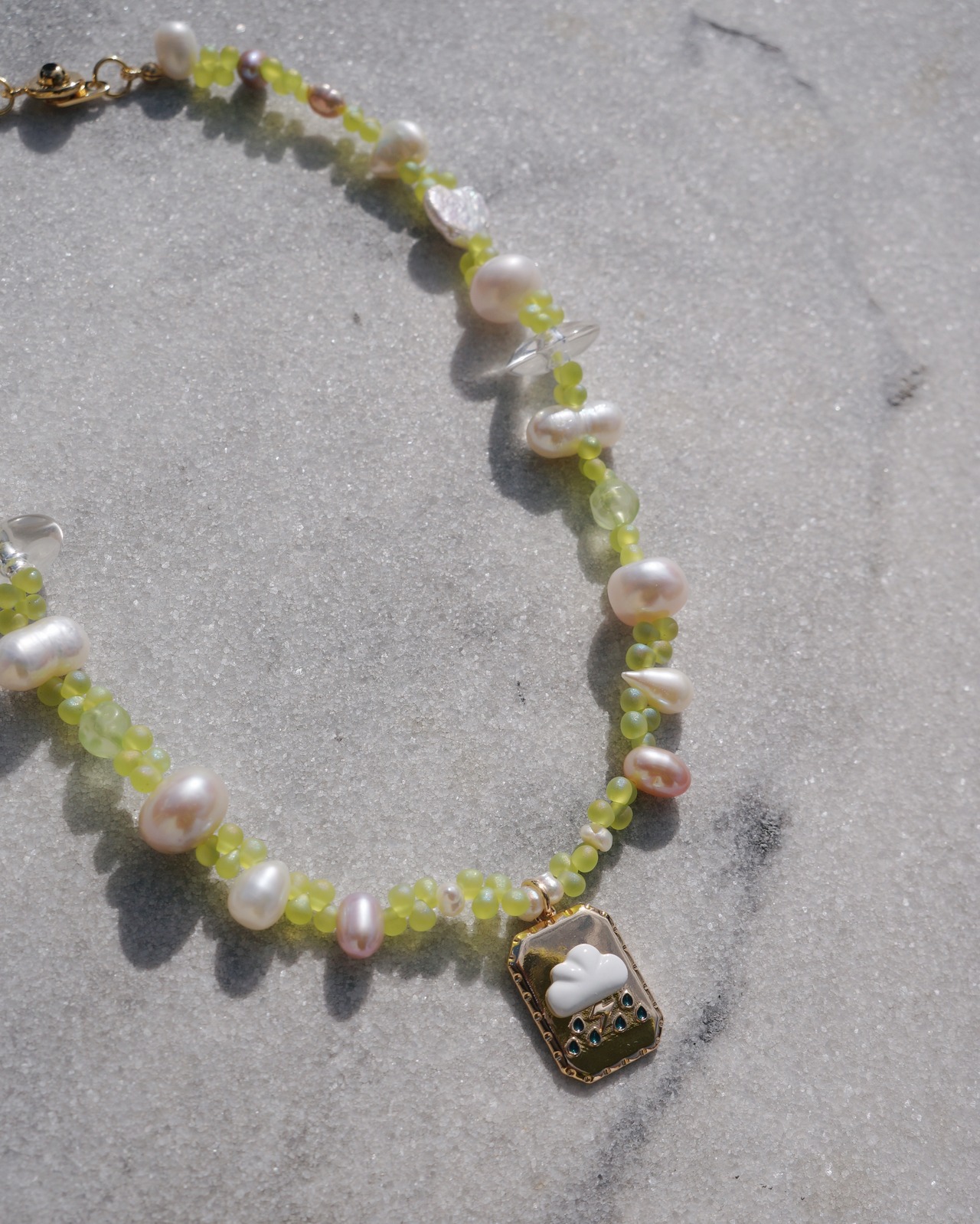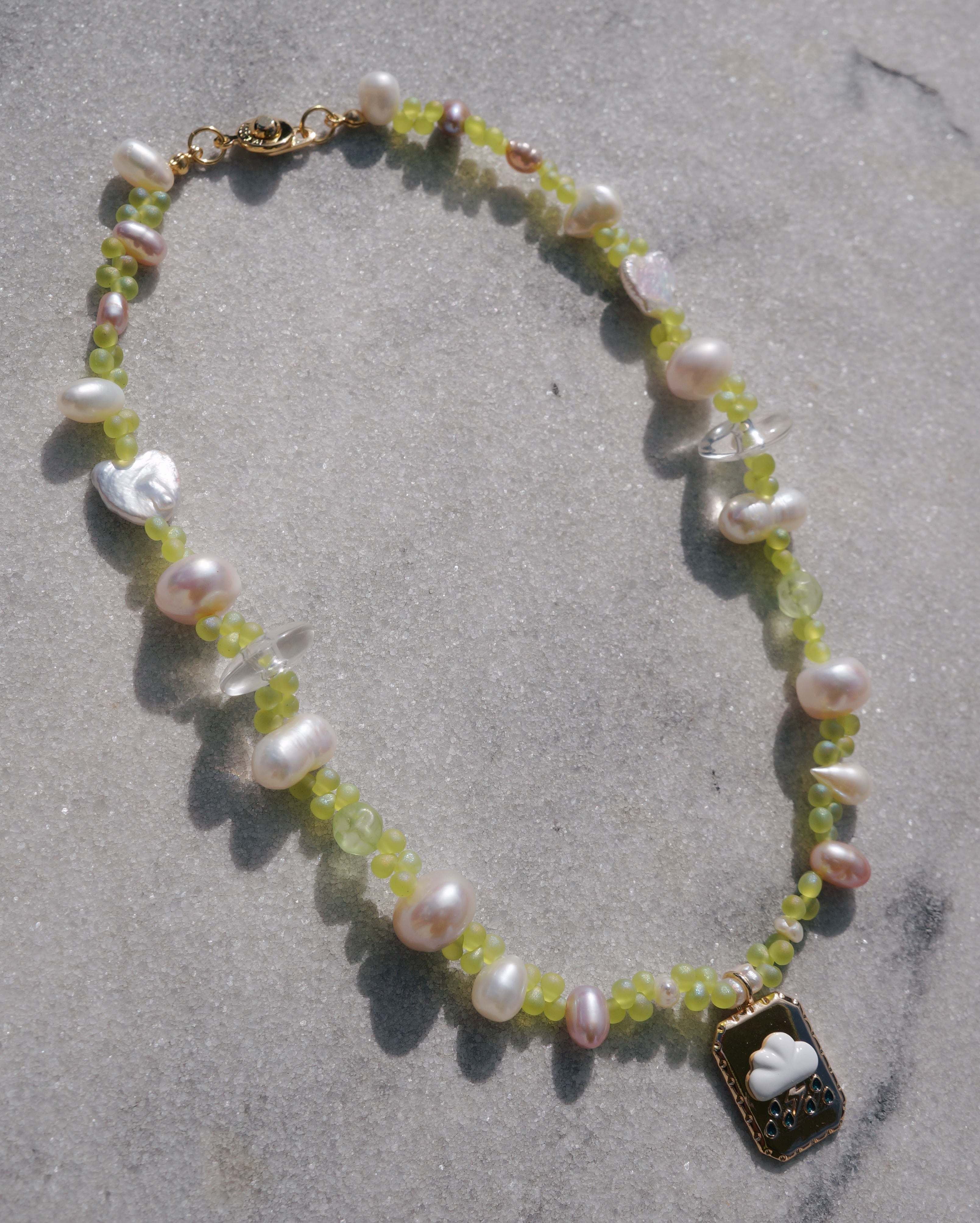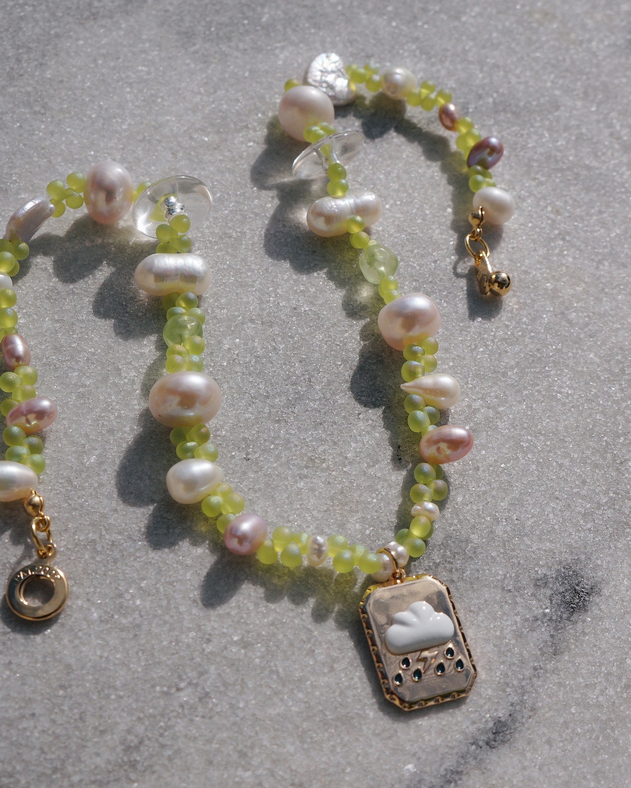 様々なシェープの希少なケシパールを使ったキュートなネックレスです。淡い緑のカラーと雲と雷のモチーフのチャームなどで可愛らしさだけでなくJBCGらしいユニークさもデザインに入れた唯一無二のネックレスです。