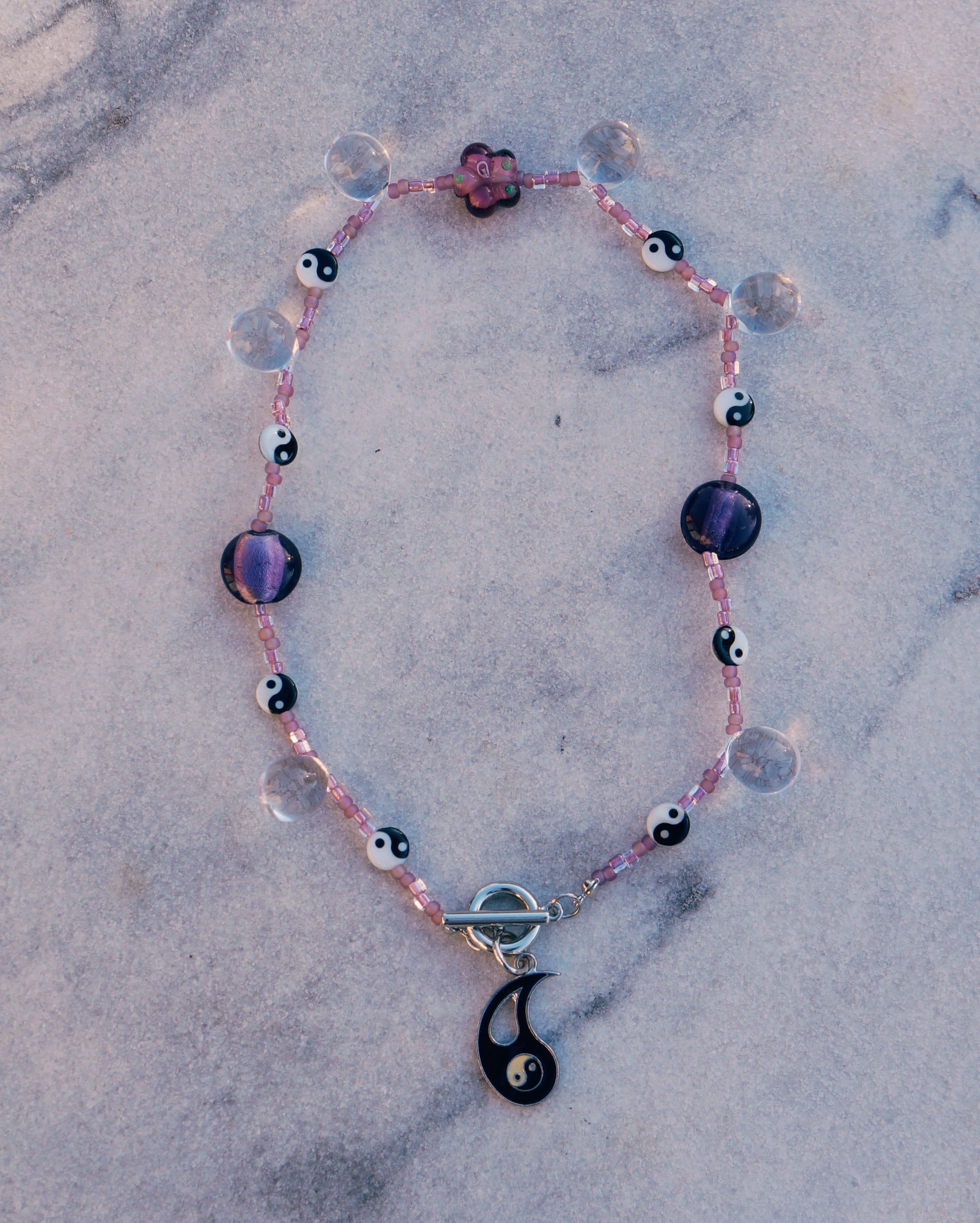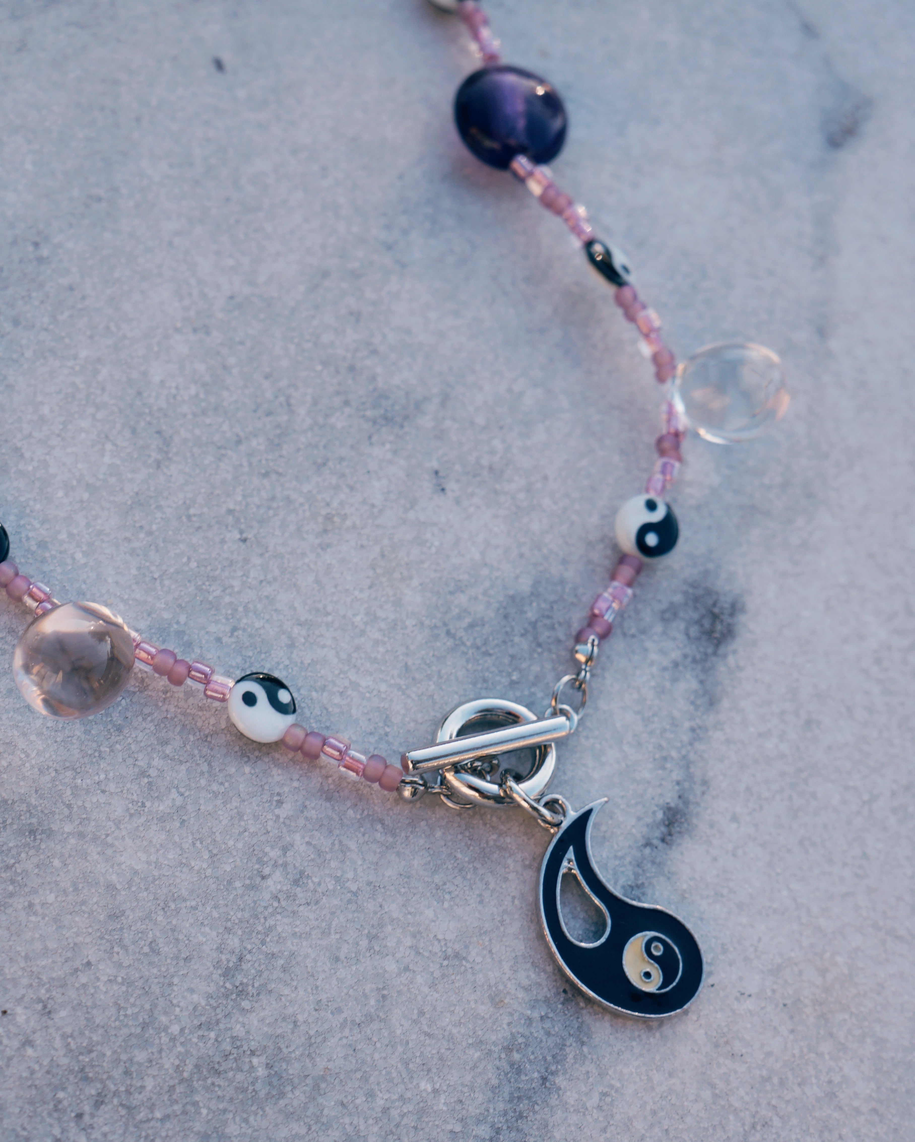 マンテルについているチャームを前に垂らしても後ろに持ってきてもいい、お洋服や気分に合わせて使い方を変えれる万能な一点です。淡水シェルに陰陽が描かれているビーズや、雫のような大ぶりのドロップビーズ、ガラスビーズを使い、全体的には淡い紫色でまとめました。不思議な夢の中に吸い込まれるようなユニークで、でもどこか儚い、美しいネックレスです。