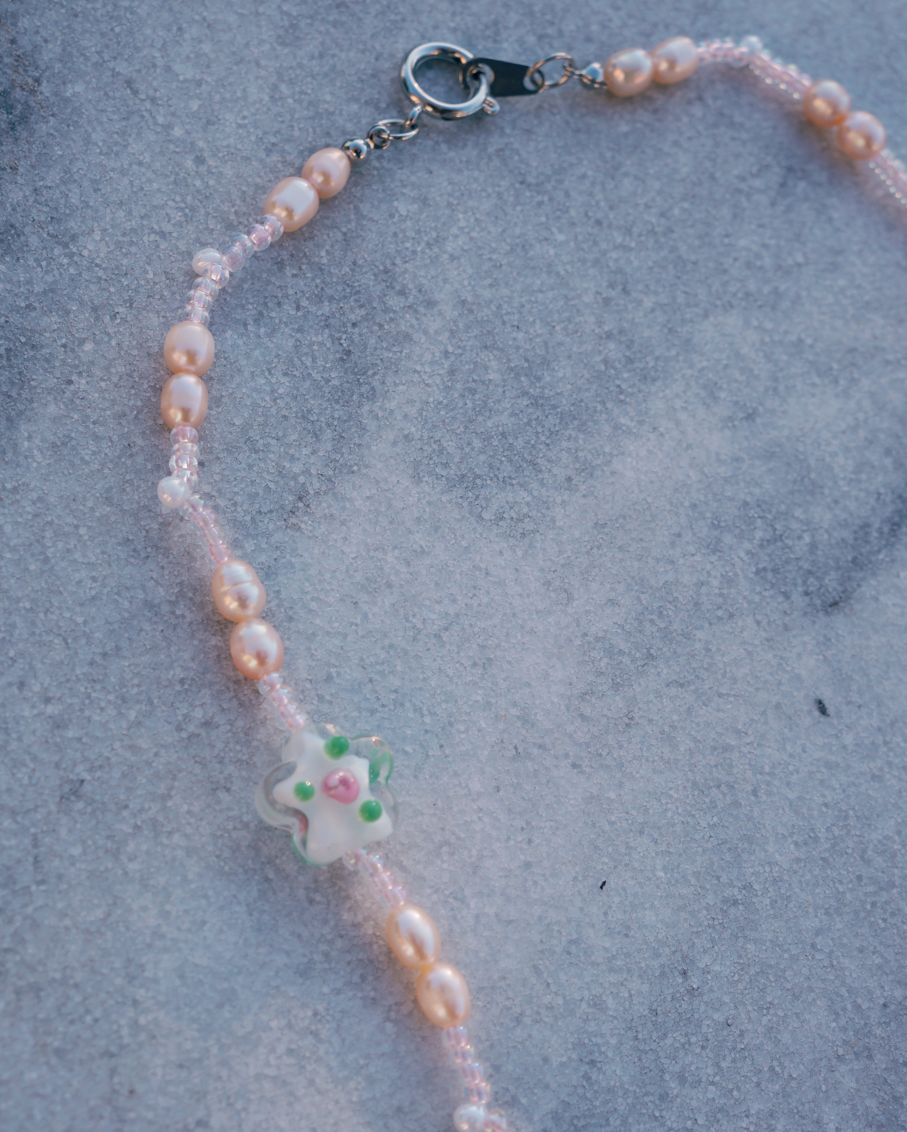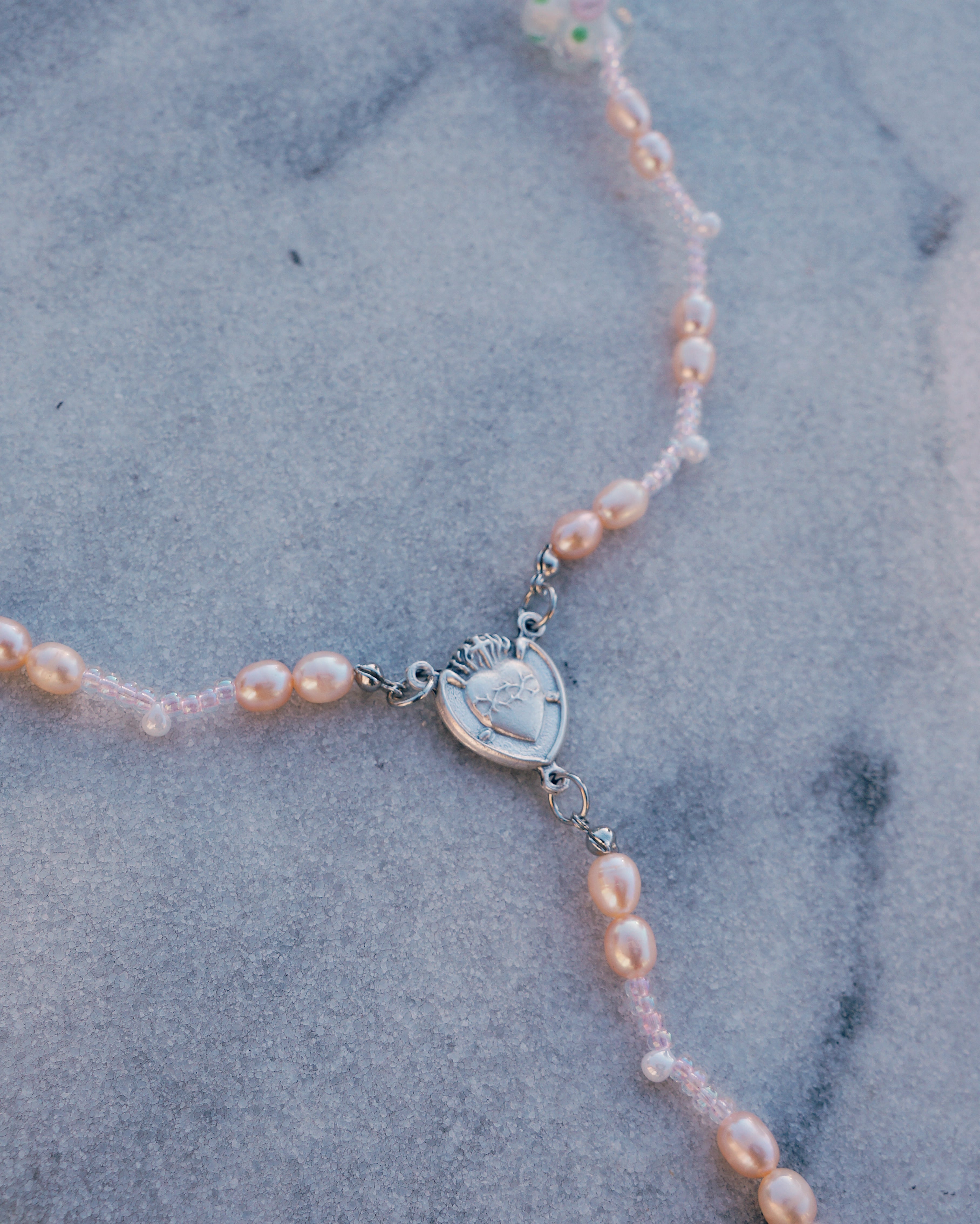 お祈りの用具としても使われるロザリオを現代風なファッションアイテムとしてデザインしました。淡い色でまとめ合わせやすいデザインですが、パールやお花のガラスビーズなどをアクセントにコーディネートの主役になるような華やかさもあるネックレスに仕上げました。ドレスアップした日にもおすすめの一点です。