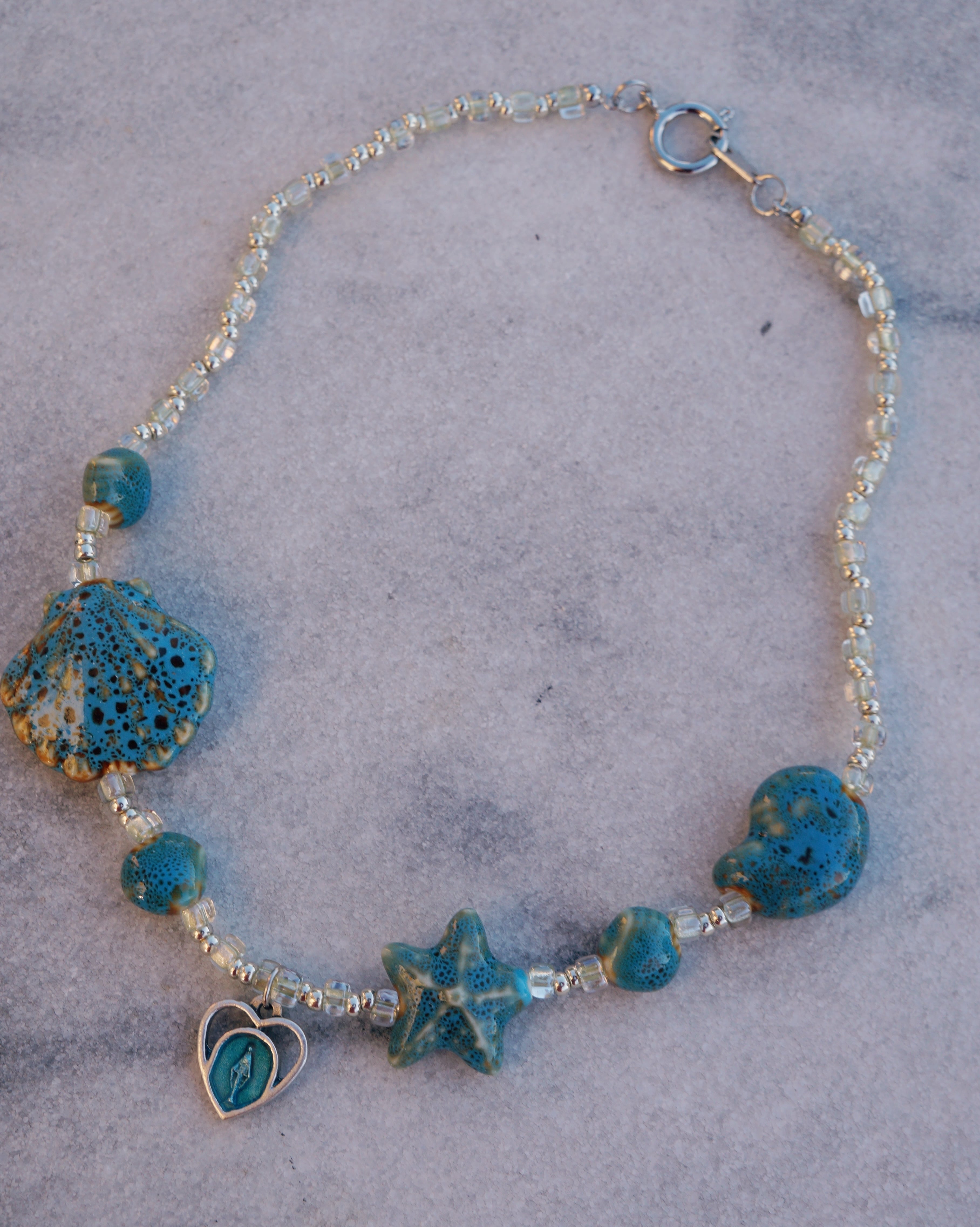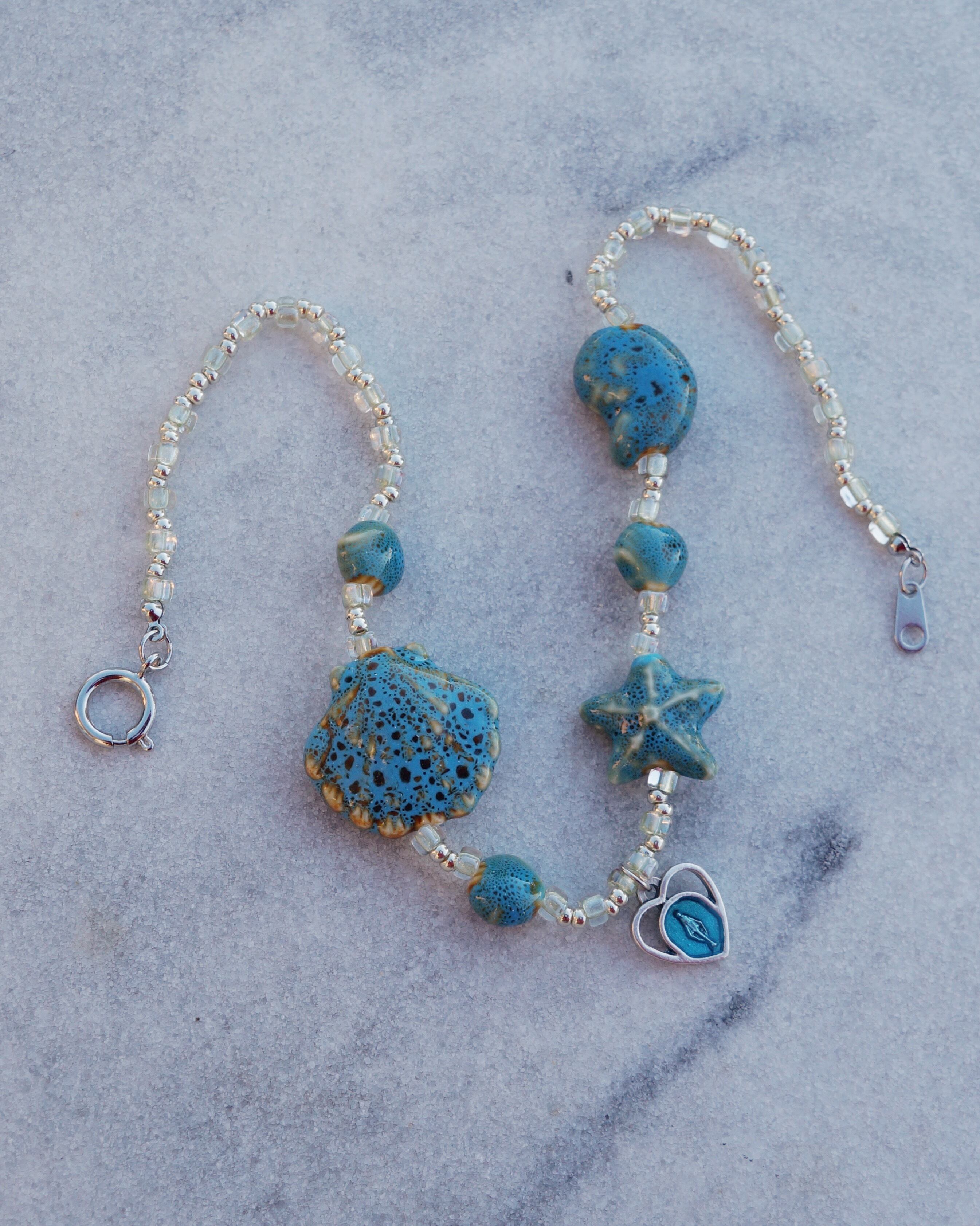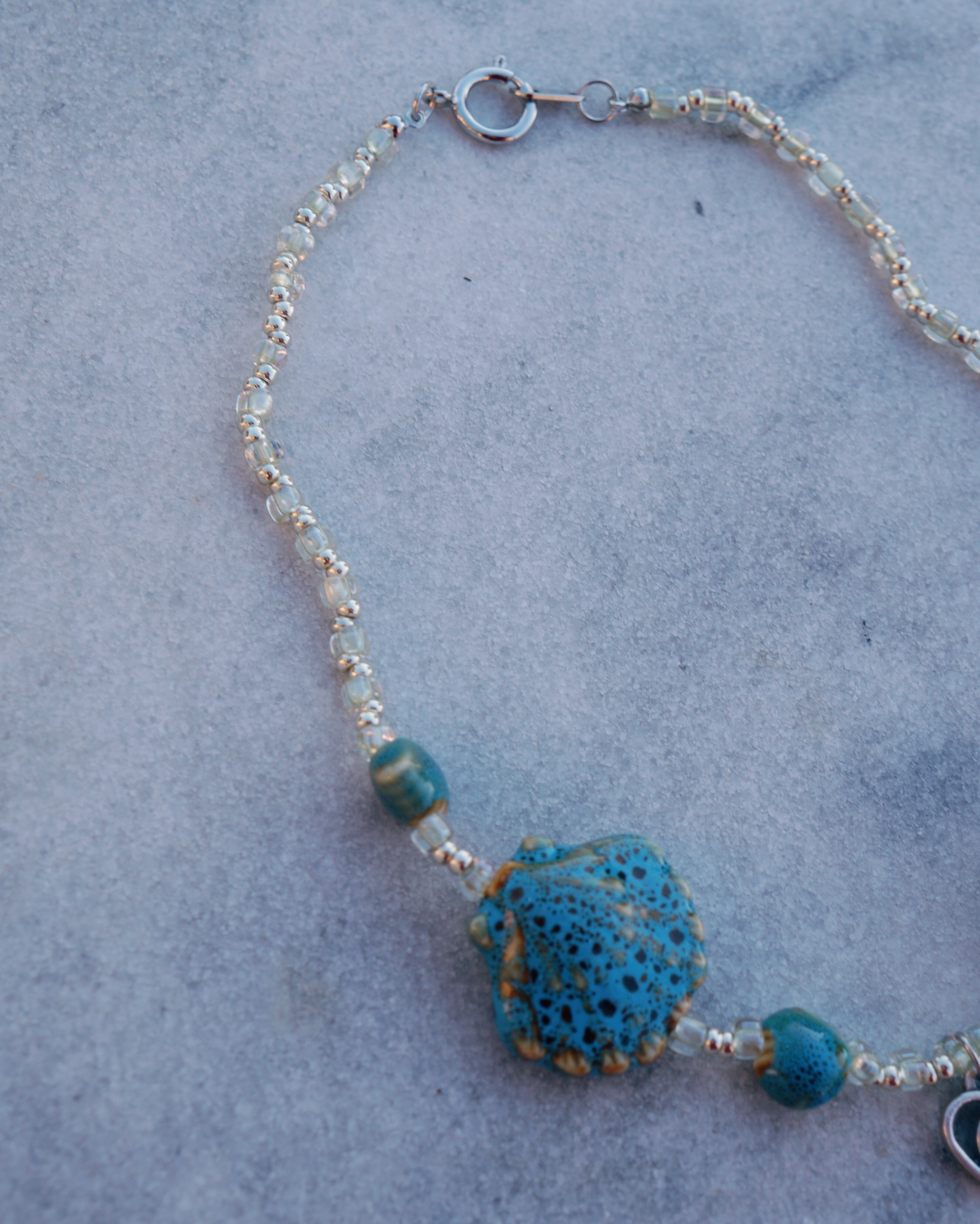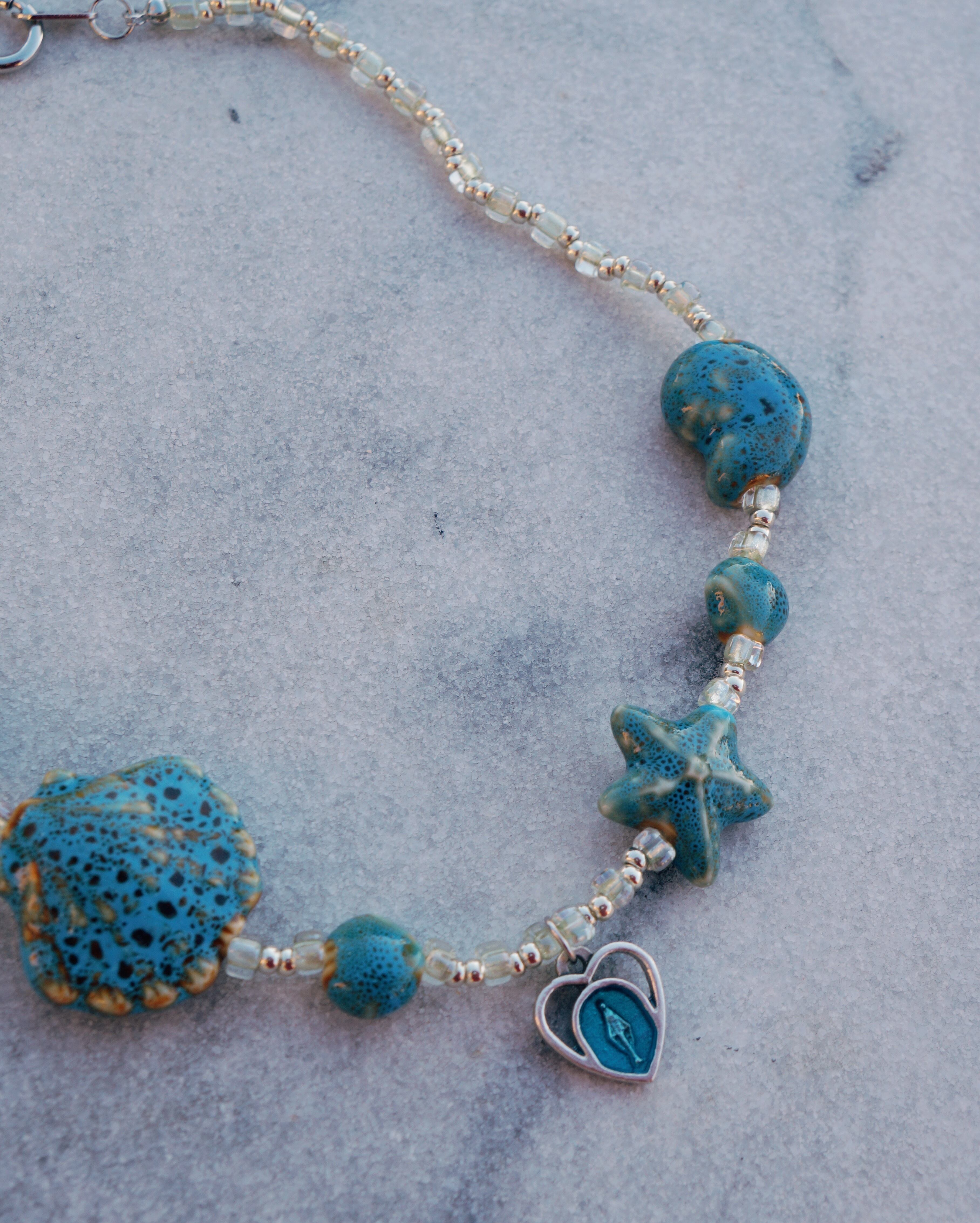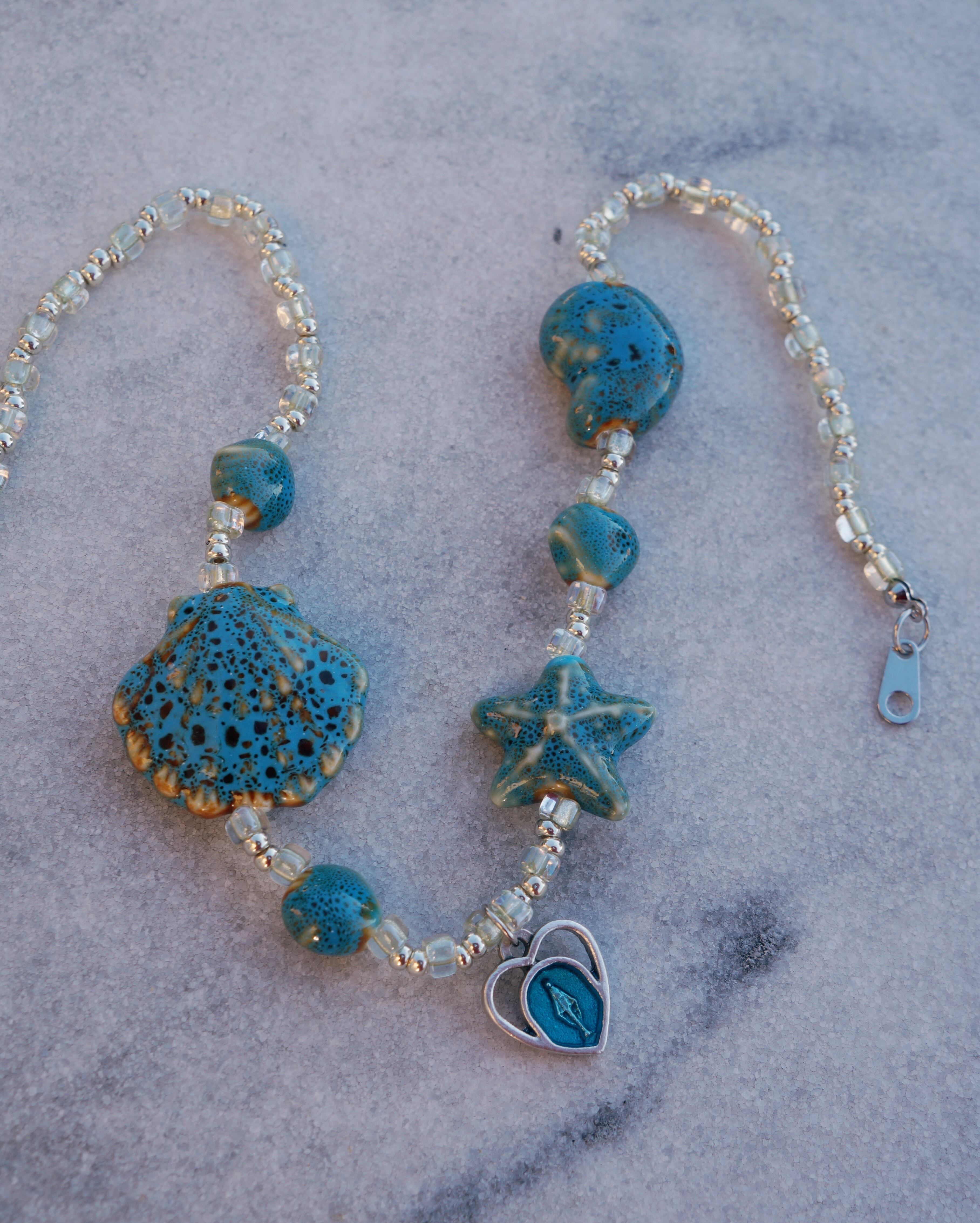 陶器でできた様々なシェープの貝殻のビーズが美しいネックレスです。美しい海岸にでも迷い込んでしまったかのようなイメージでデザインをしました。※メダイはイタリア製のものを使っています。