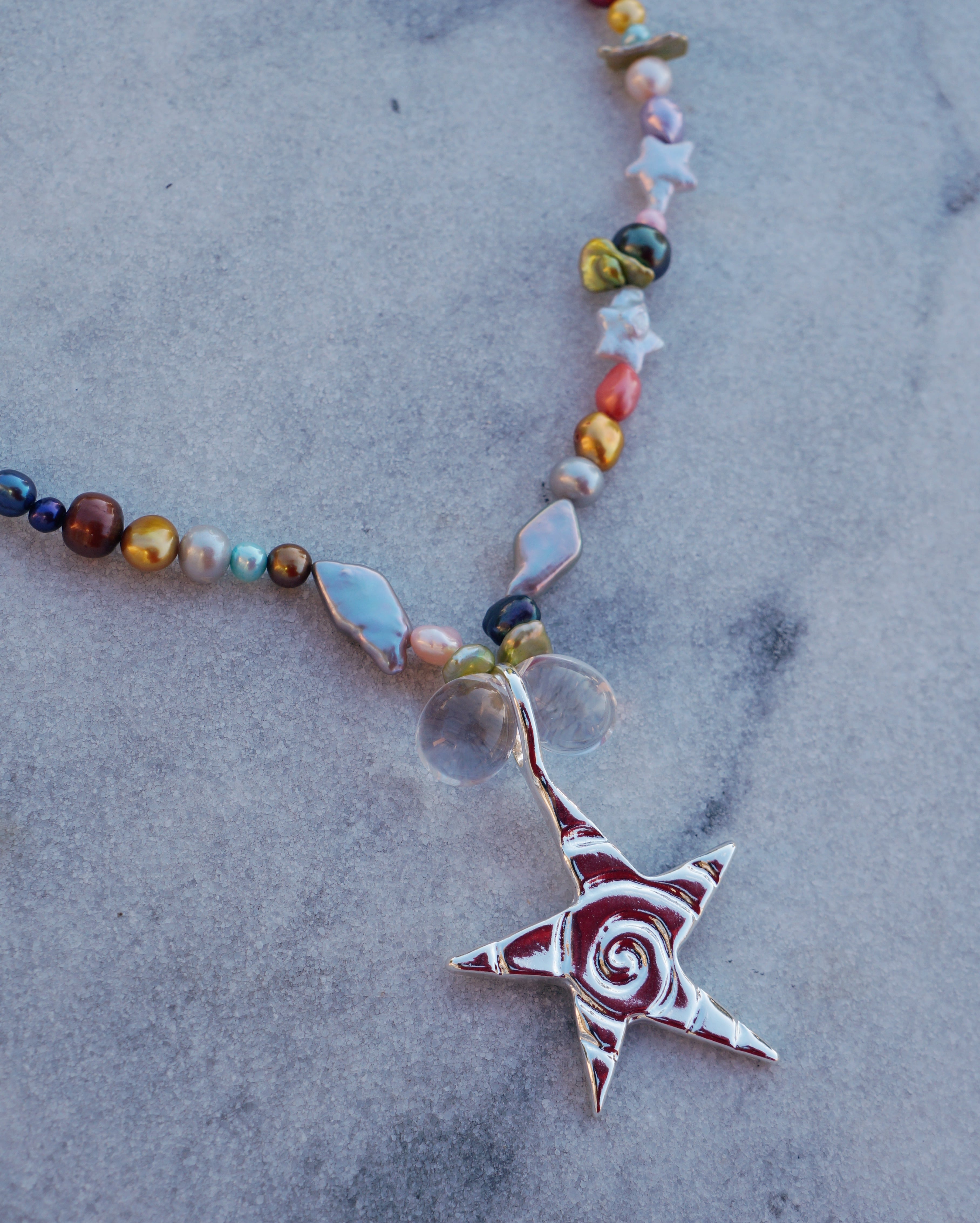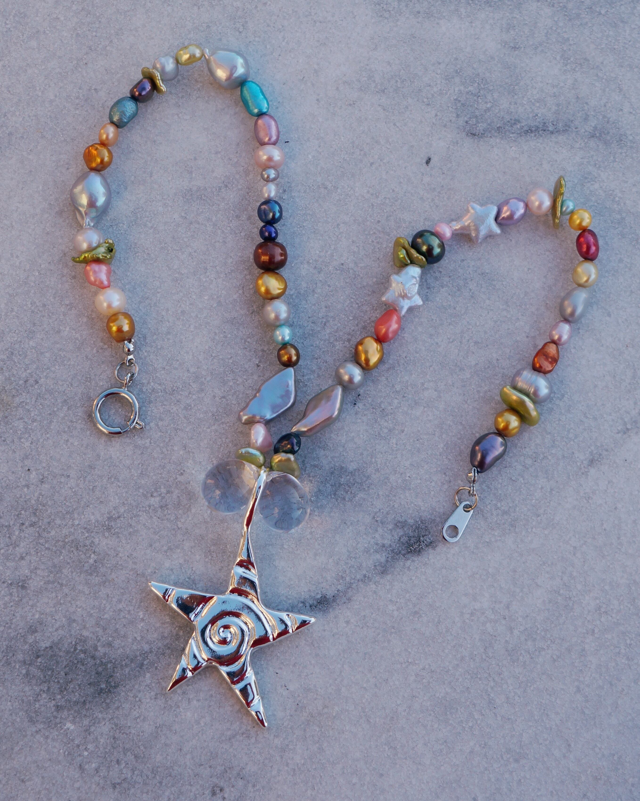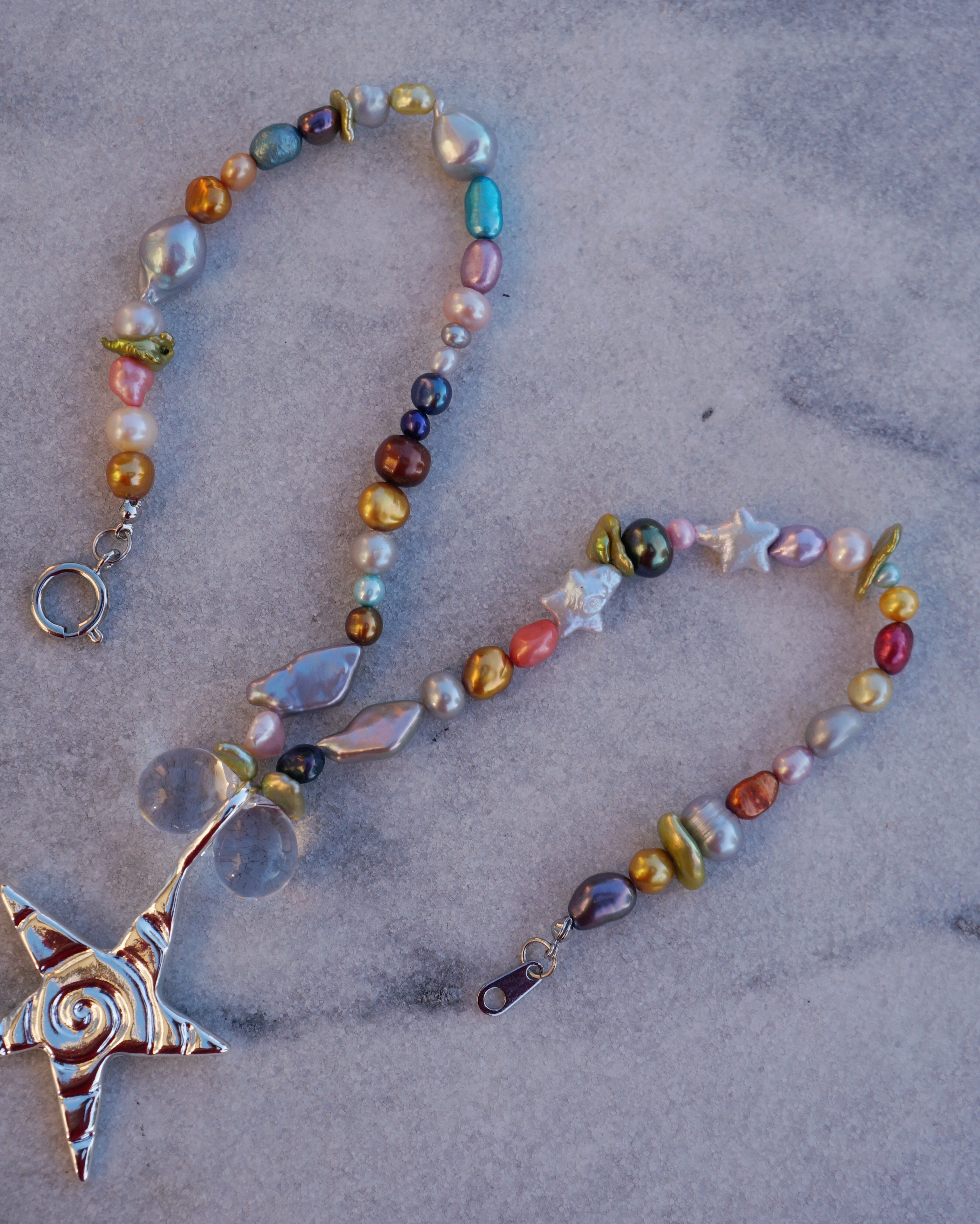 様々なシェープやカラーの希少な淡水パールと存在感のある大ぶりの星のチャームが可愛いネックレスです。ぐるぐるとカラフルで不思議な夢に飛び込んでしまいそうなイメージをデザインに落とし込みました。コーディネートのポイントになるような素敵な一点です。