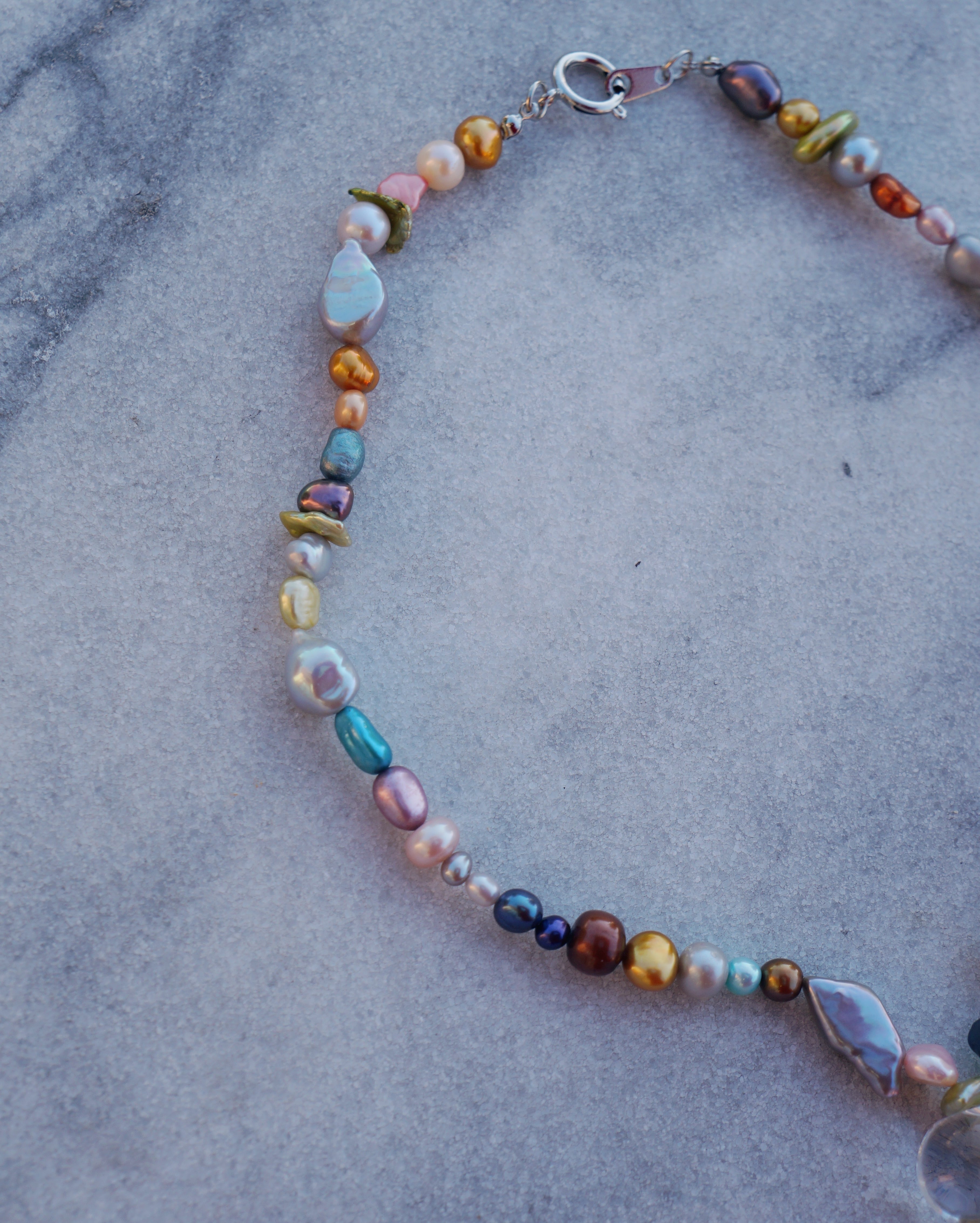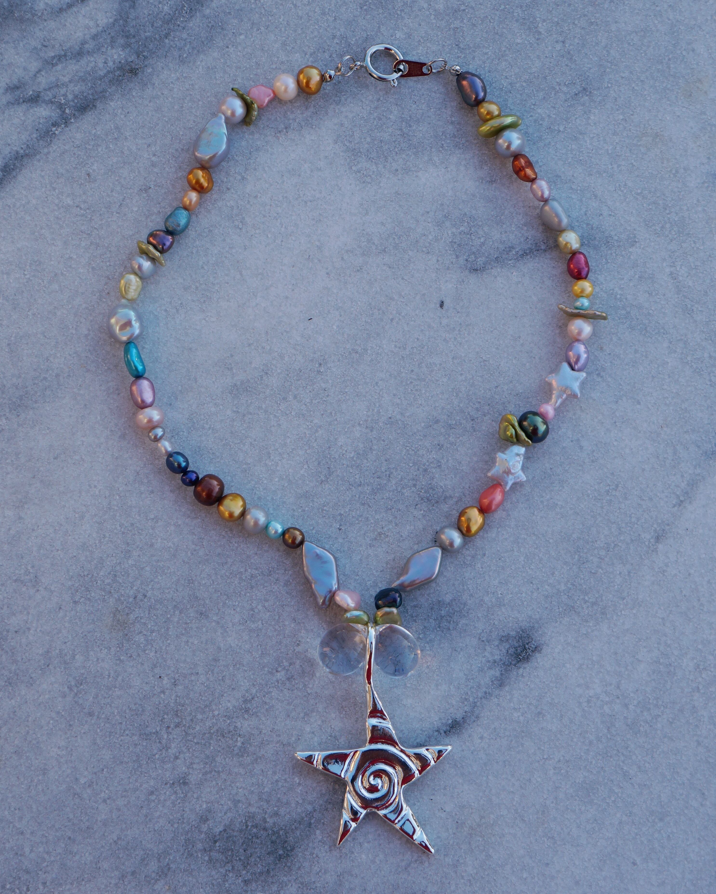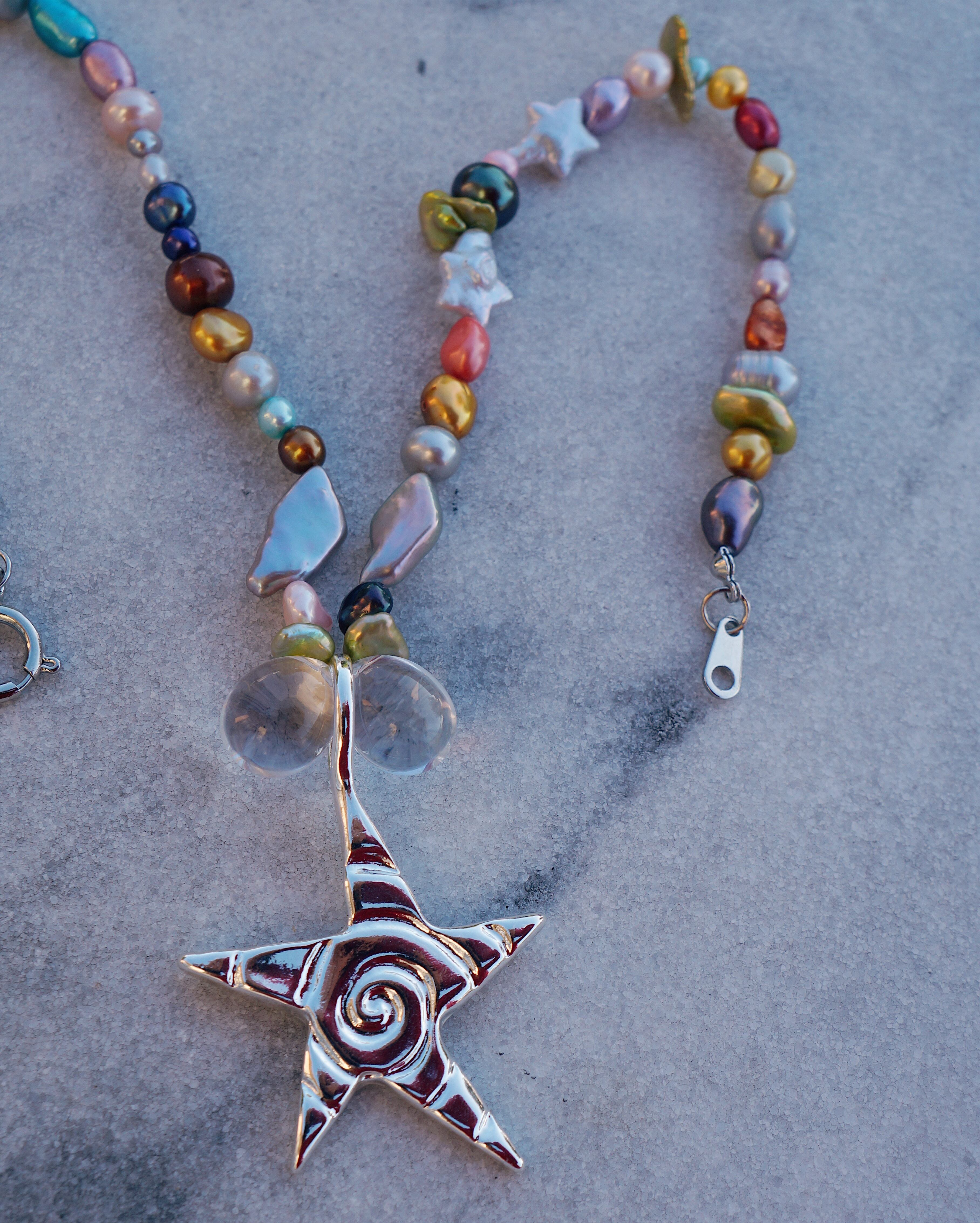様々なシェープやカラーの希少な淡水パールと存在感のある大ぶりの星のチャームが可愛いネックレスです。ぐるぐるとカラフルで不思議な夢に飛び込んでしまいそうなイメージをデザインに落とし込みました。コーディネートのポイントになるような素敵な一点です。