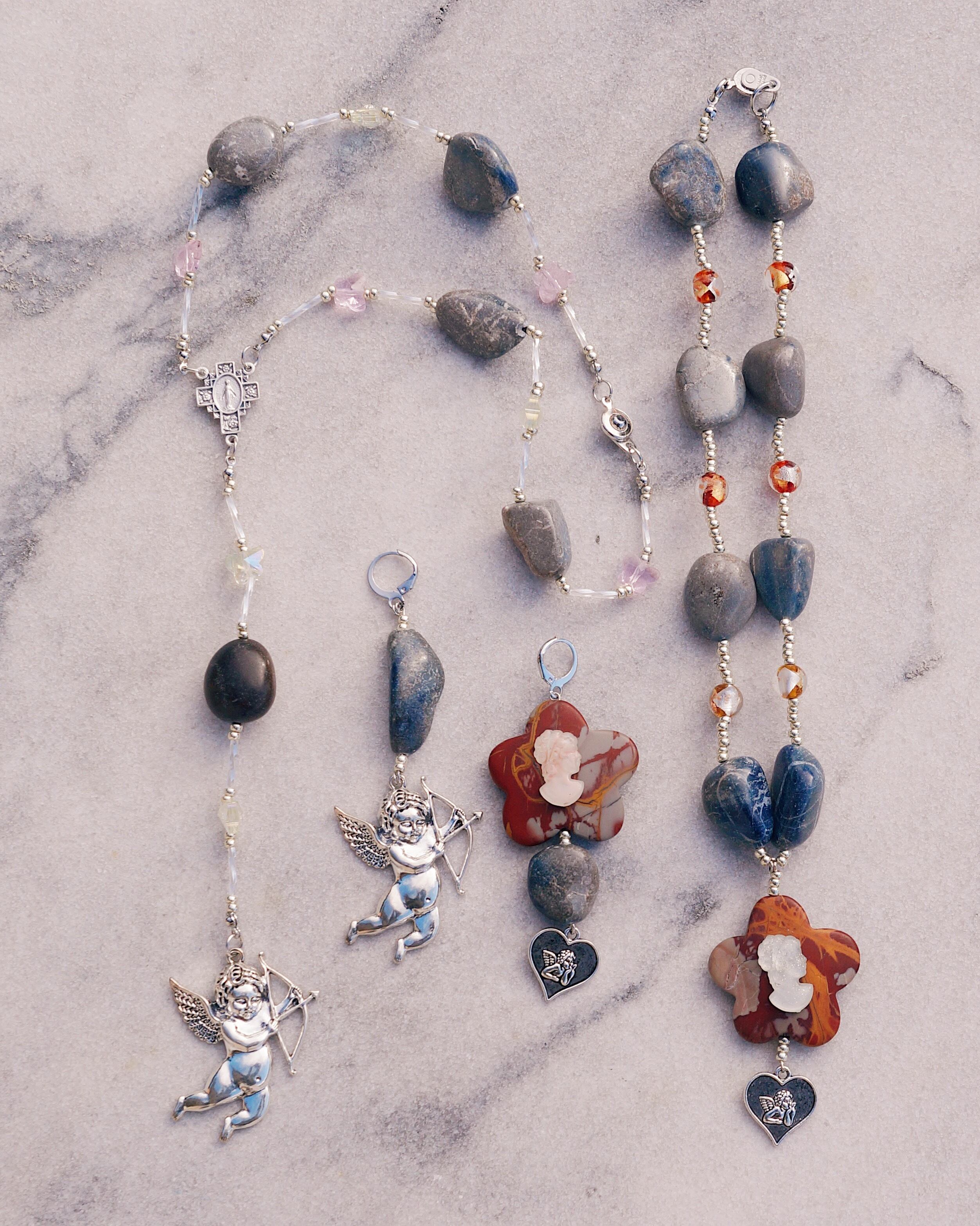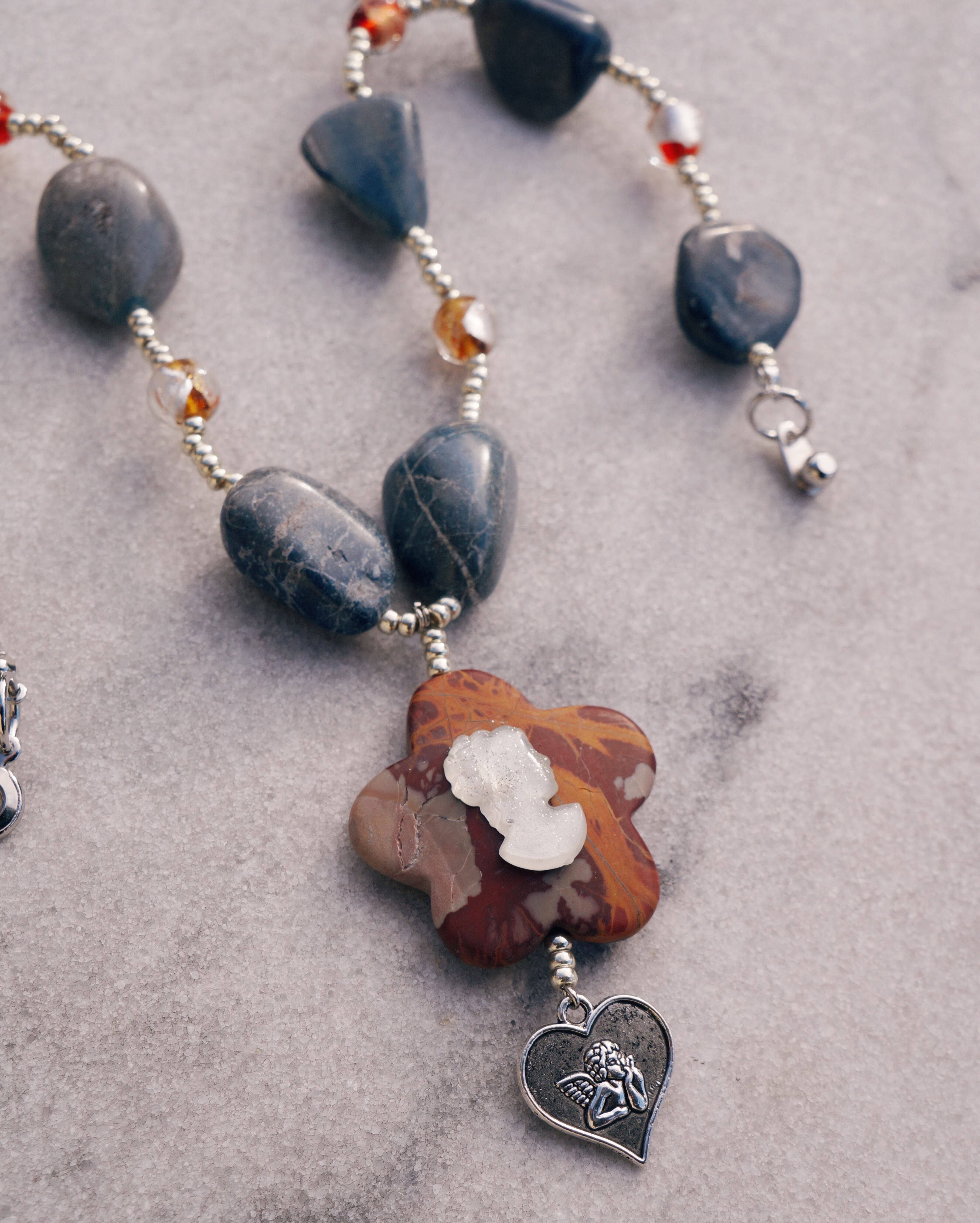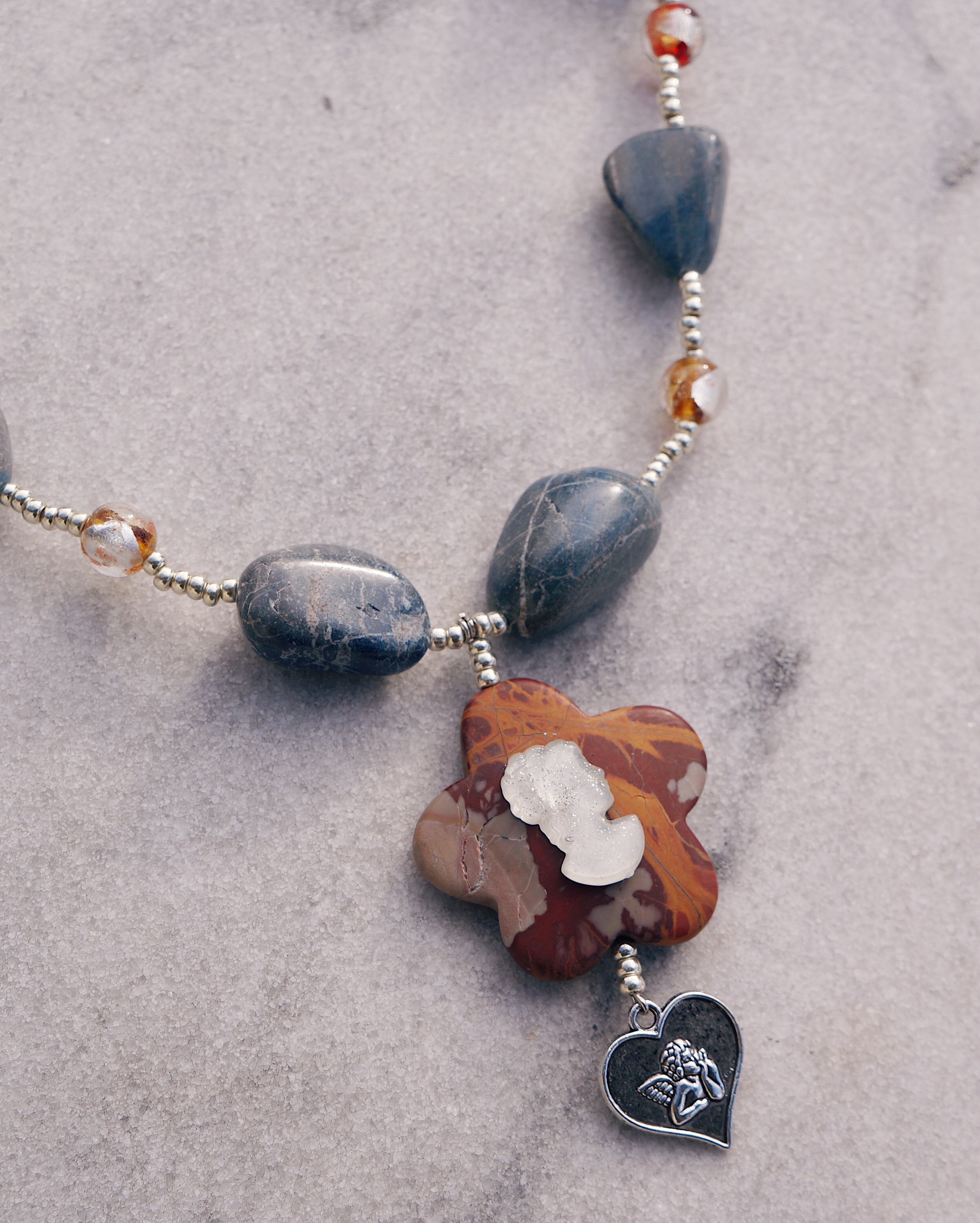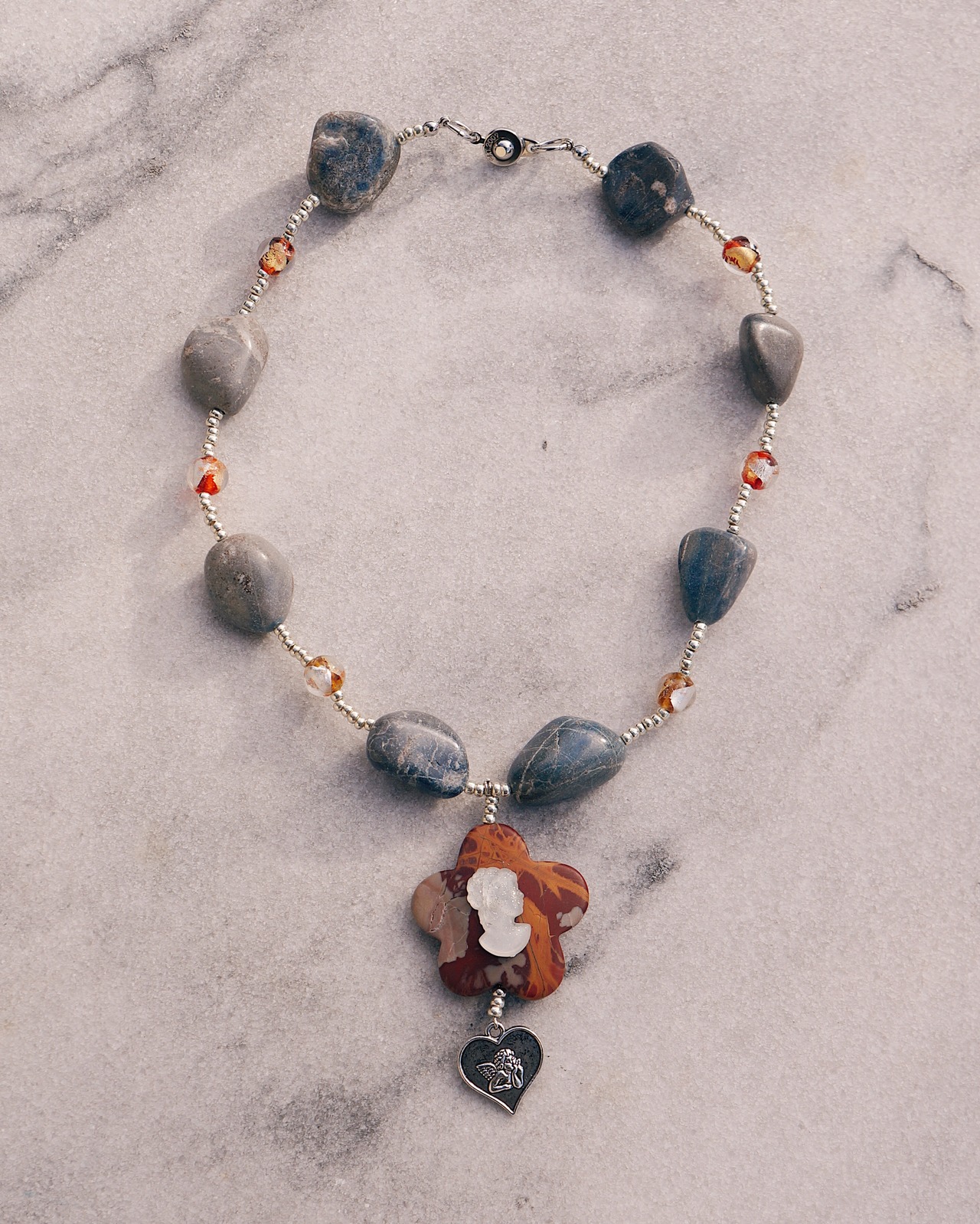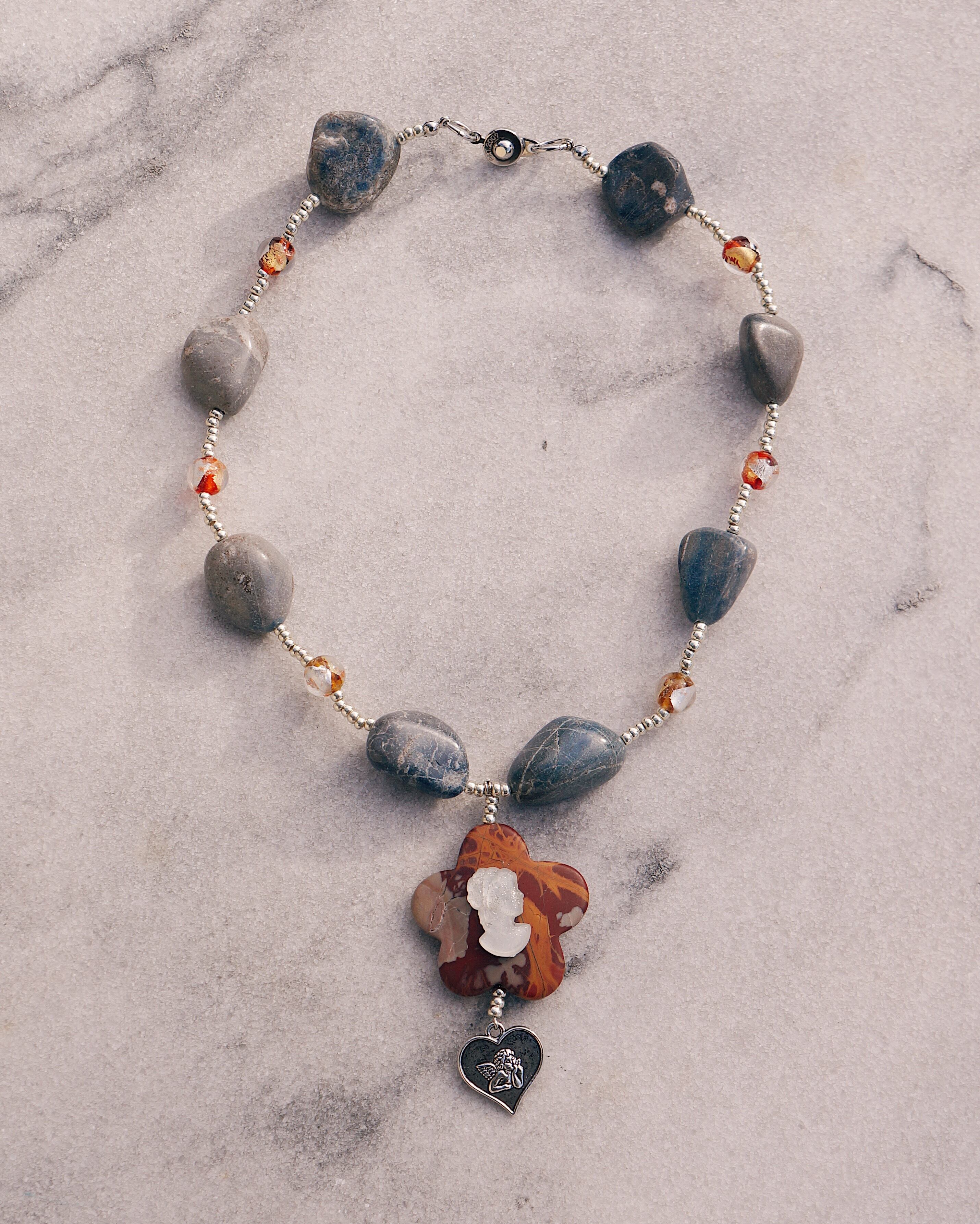 天然石とガラスのビーズを使った華やかなネックレスです。カメオのデザインが美しく、ビンテージぽさもある一点です。写真のピアスとの相性も抜群で一緒にはめるのもおすすめです。