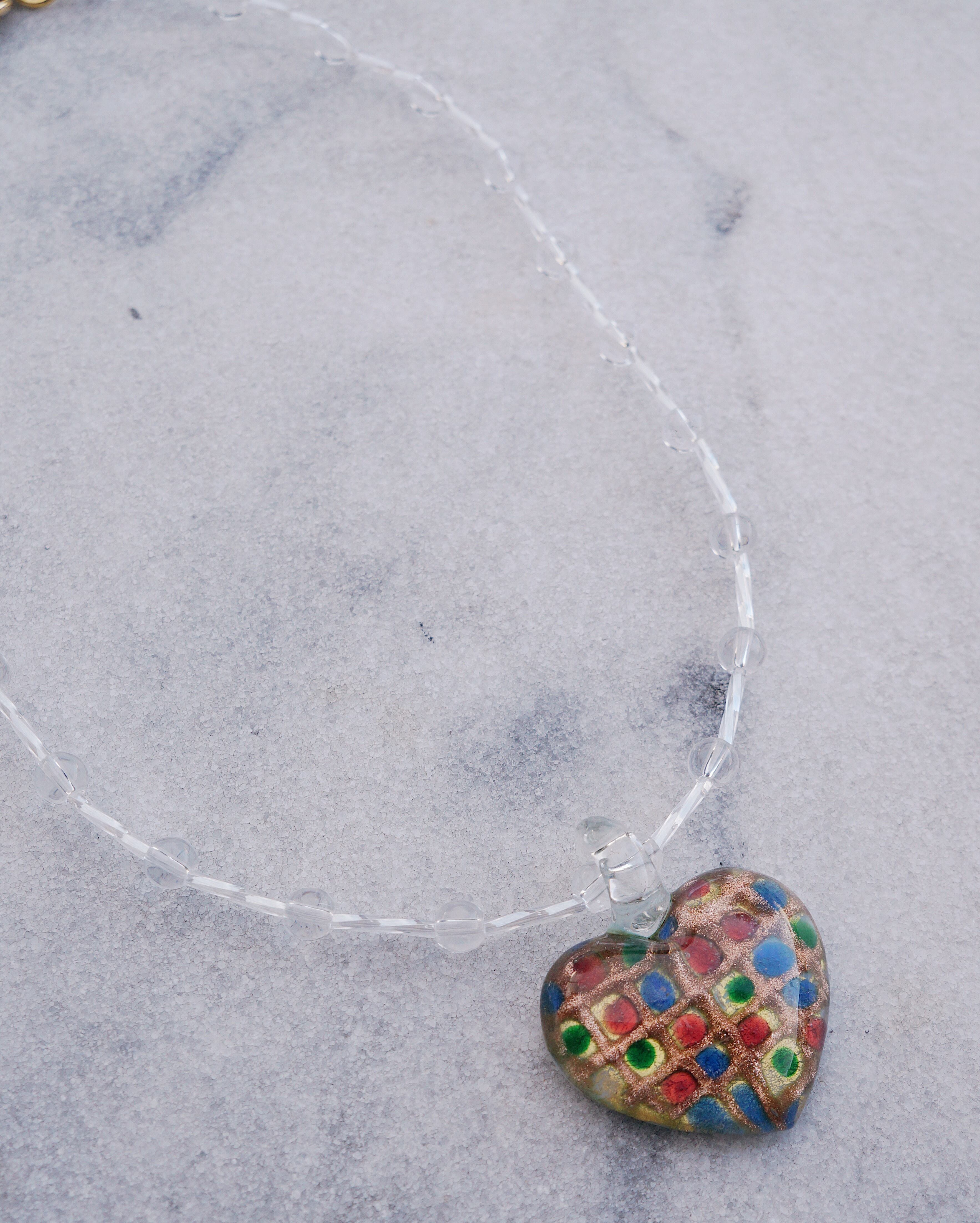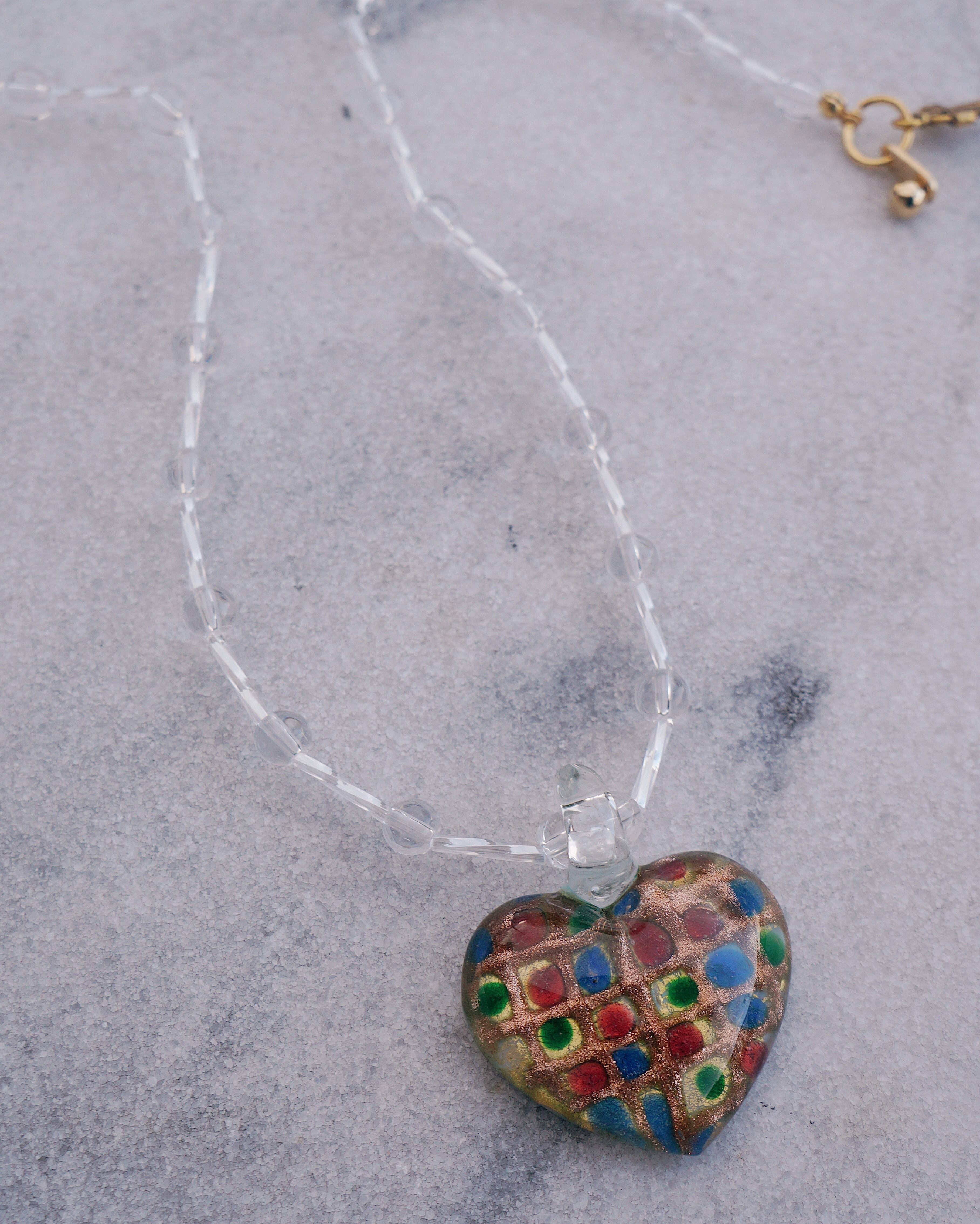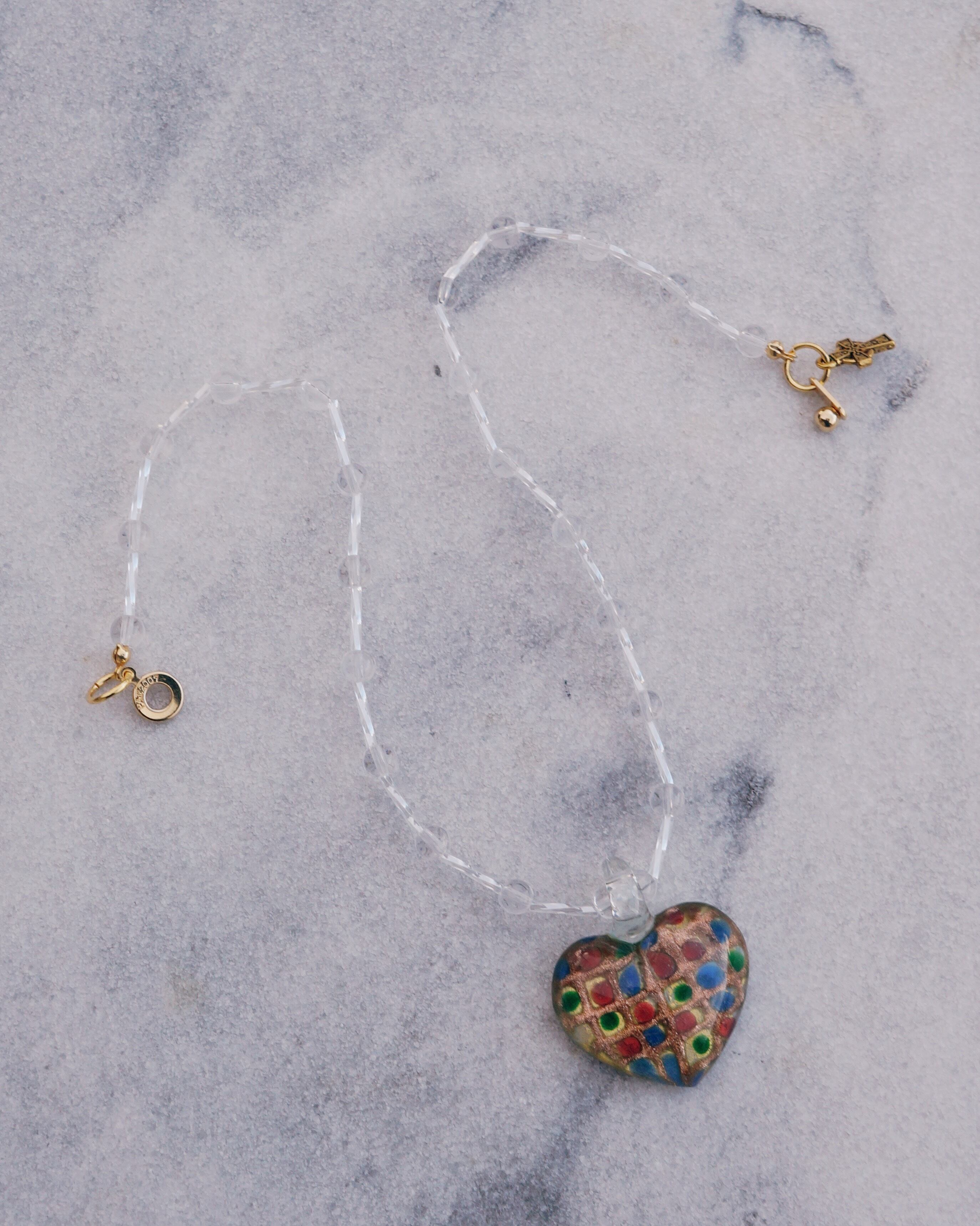 とびっきりキュートなハートのガラスチャームをポイントに、透明の透き通ったガラスビーズをあしらい、美しい一点にデザインしました。どのようなお洋服にも合わせやすいアイテムですが、存在感もあり光に当たるとキラキラと輝きうっとりしてしまうようなネックレスです。