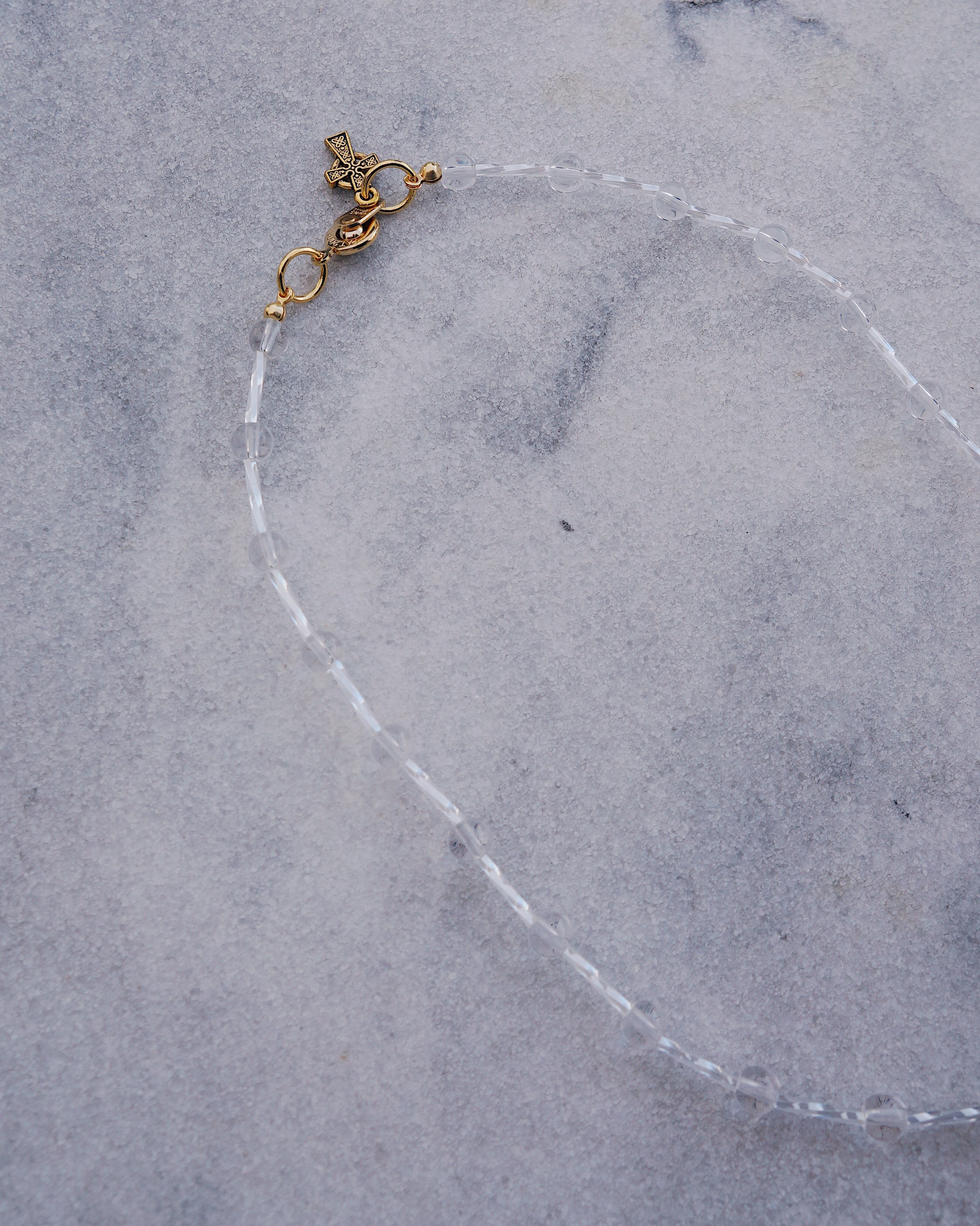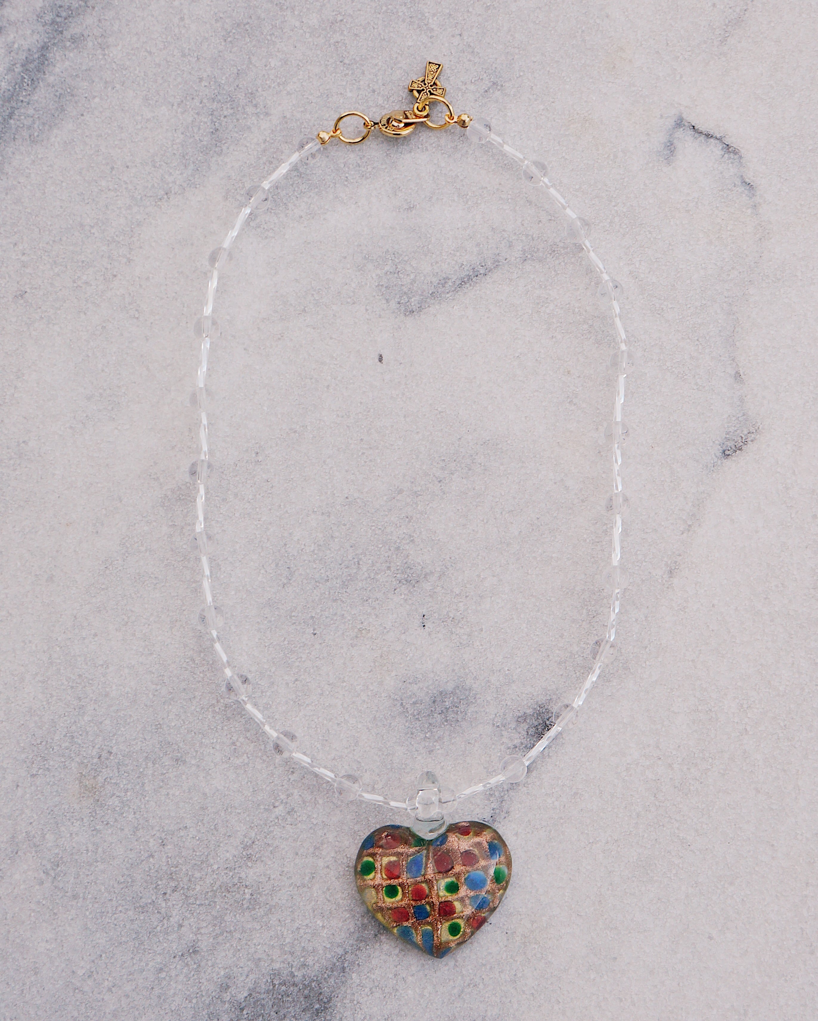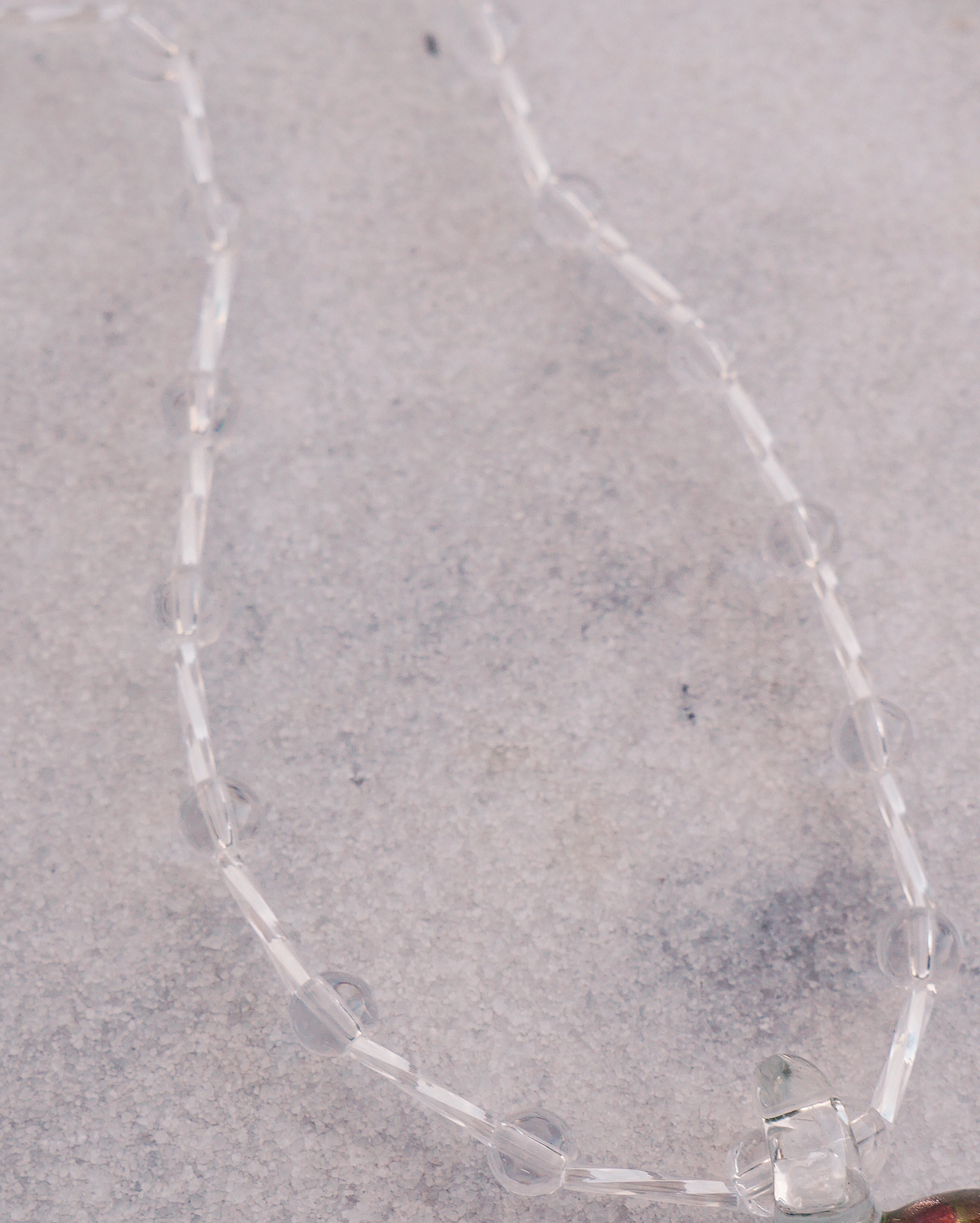 とびっきりキュートなハートのガラスチャームをポイントに、透明の透き通ったガラスビーズをあしらい、美しい一点にデザインしました。どのようなお洋服にも合わせやすいアイテムですが、存在感もあり光に当たるとキラキラと輝きうっとりしてしまうようなネックレスです。