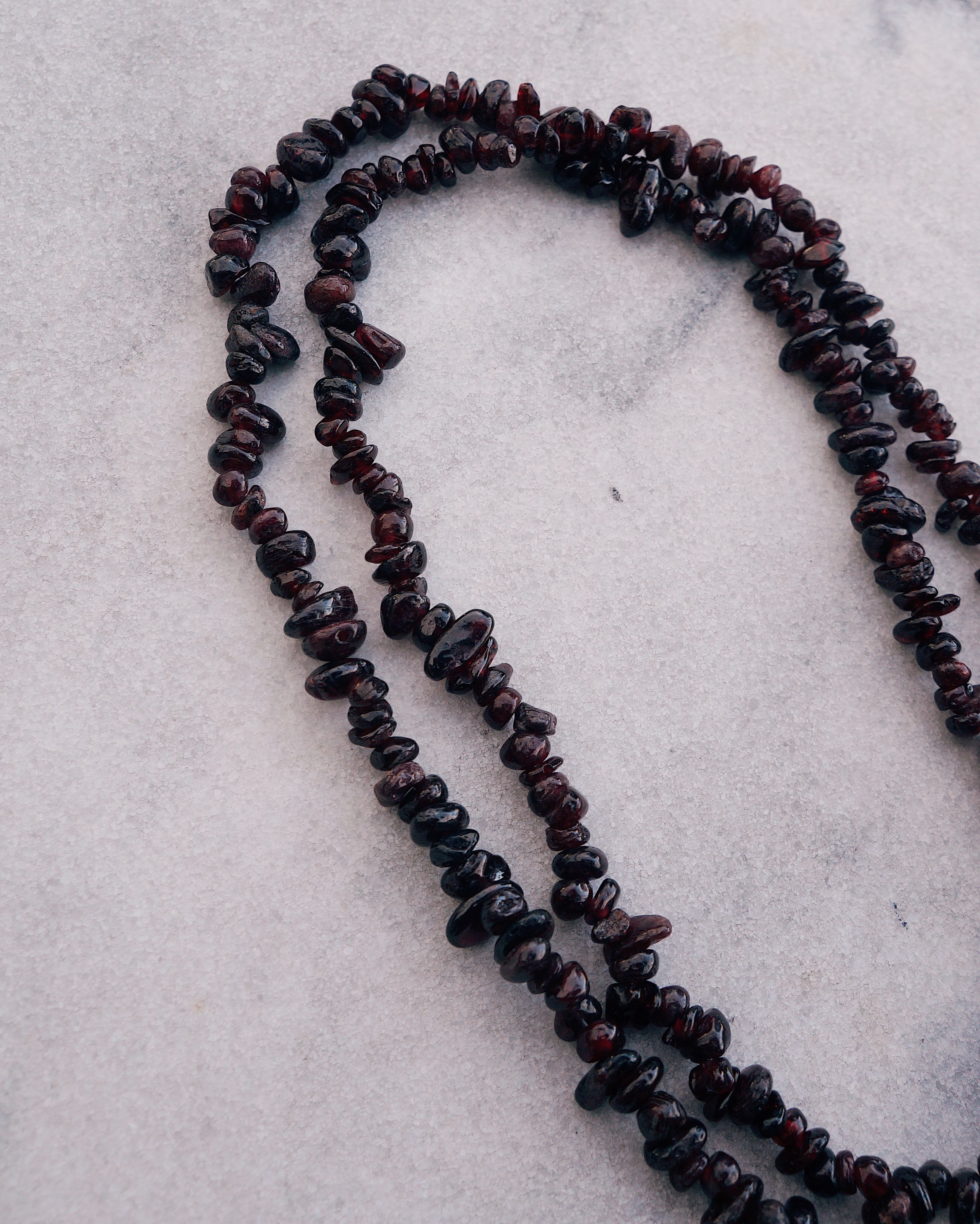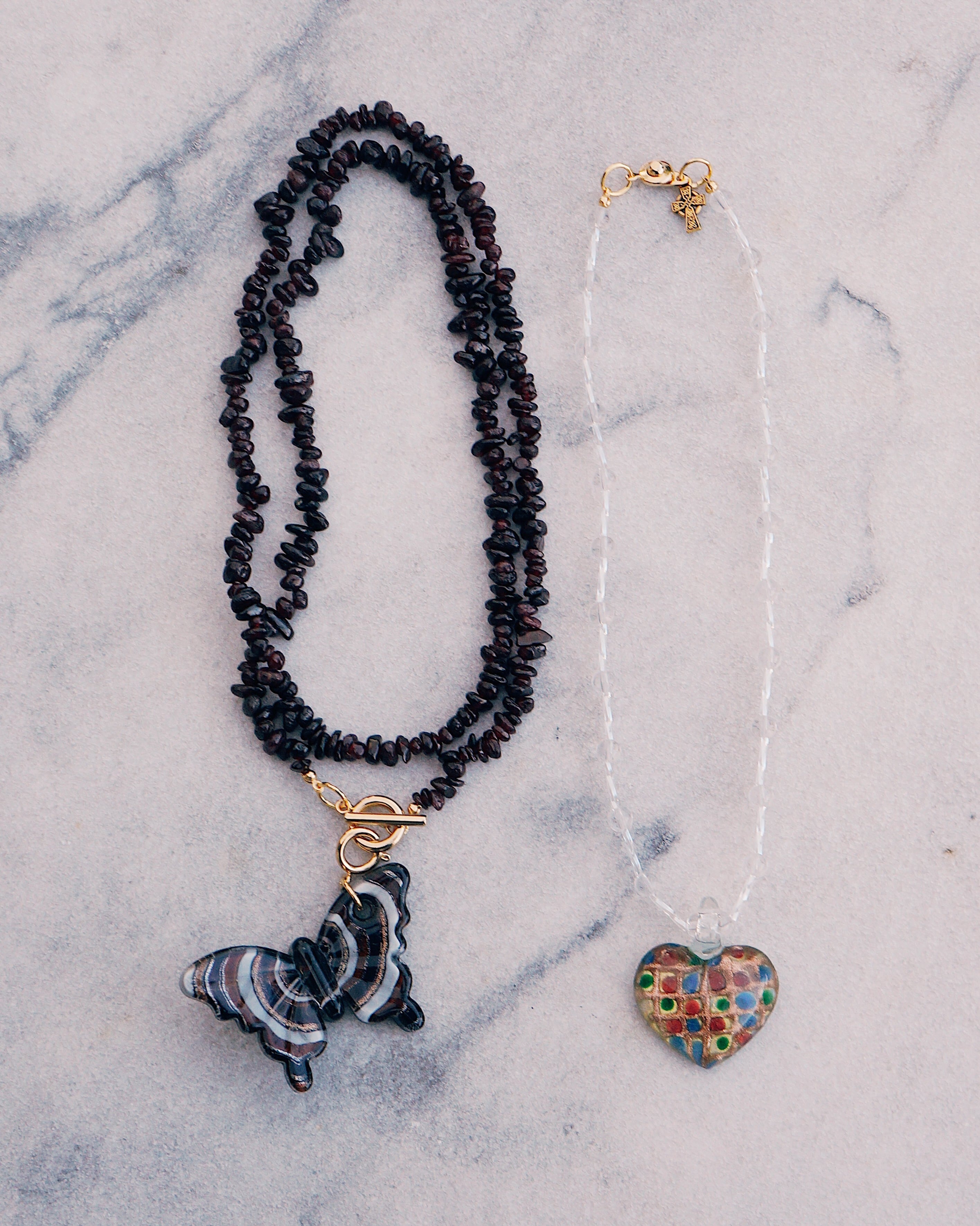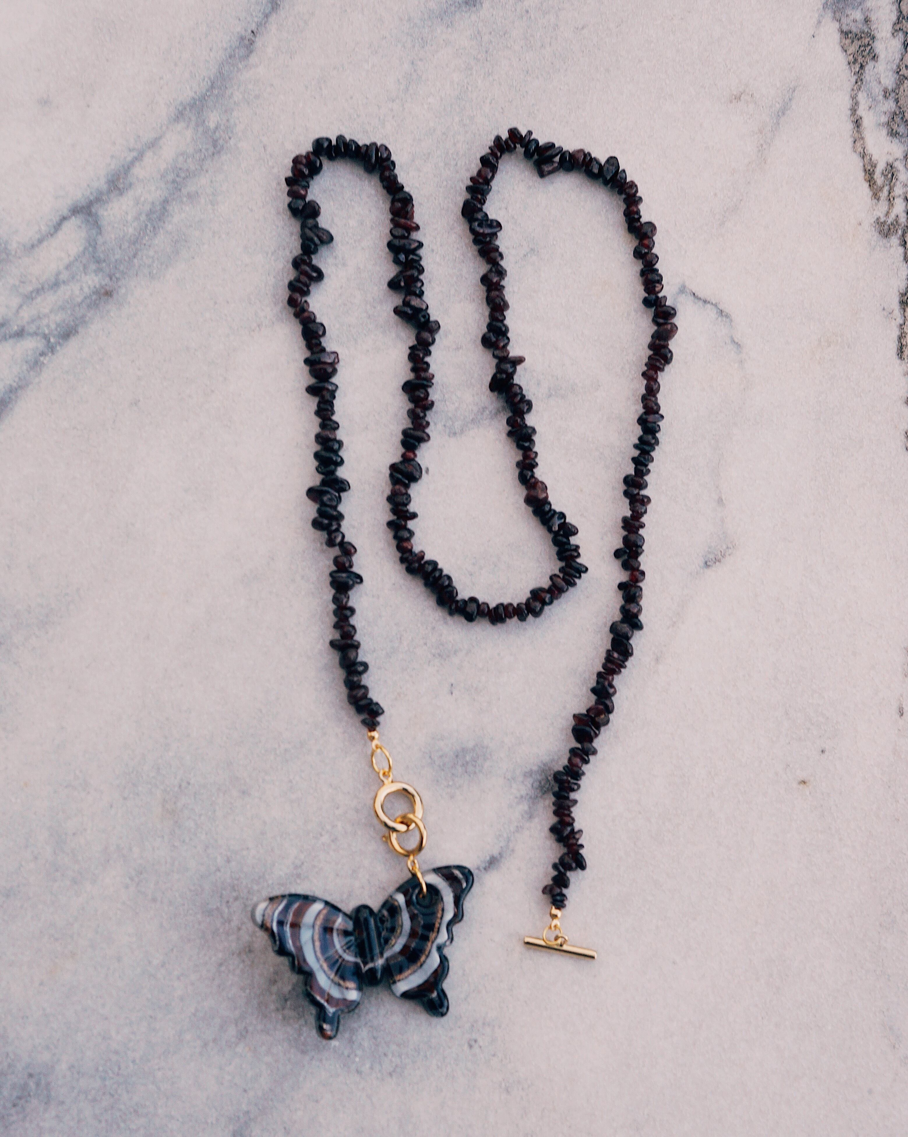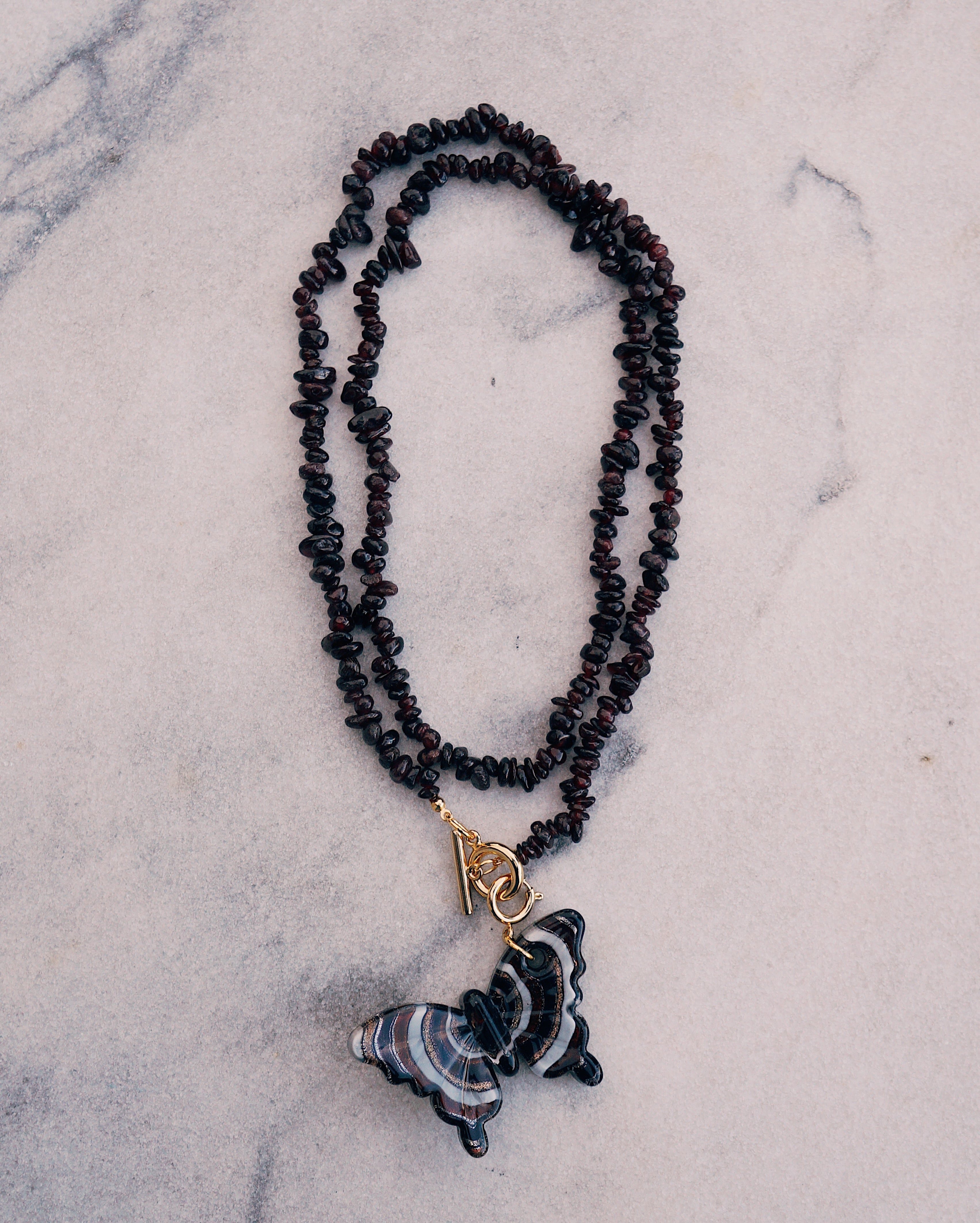 天然石ガーネットを存分に使った長いネックレスです。一連で長めのネックレスとして、2連でもお使い頂けます。マンテルについている大きめの蝶のガラスチャーム(取り外し可能)が美しくシックで華やかさがある素敵な一点です。