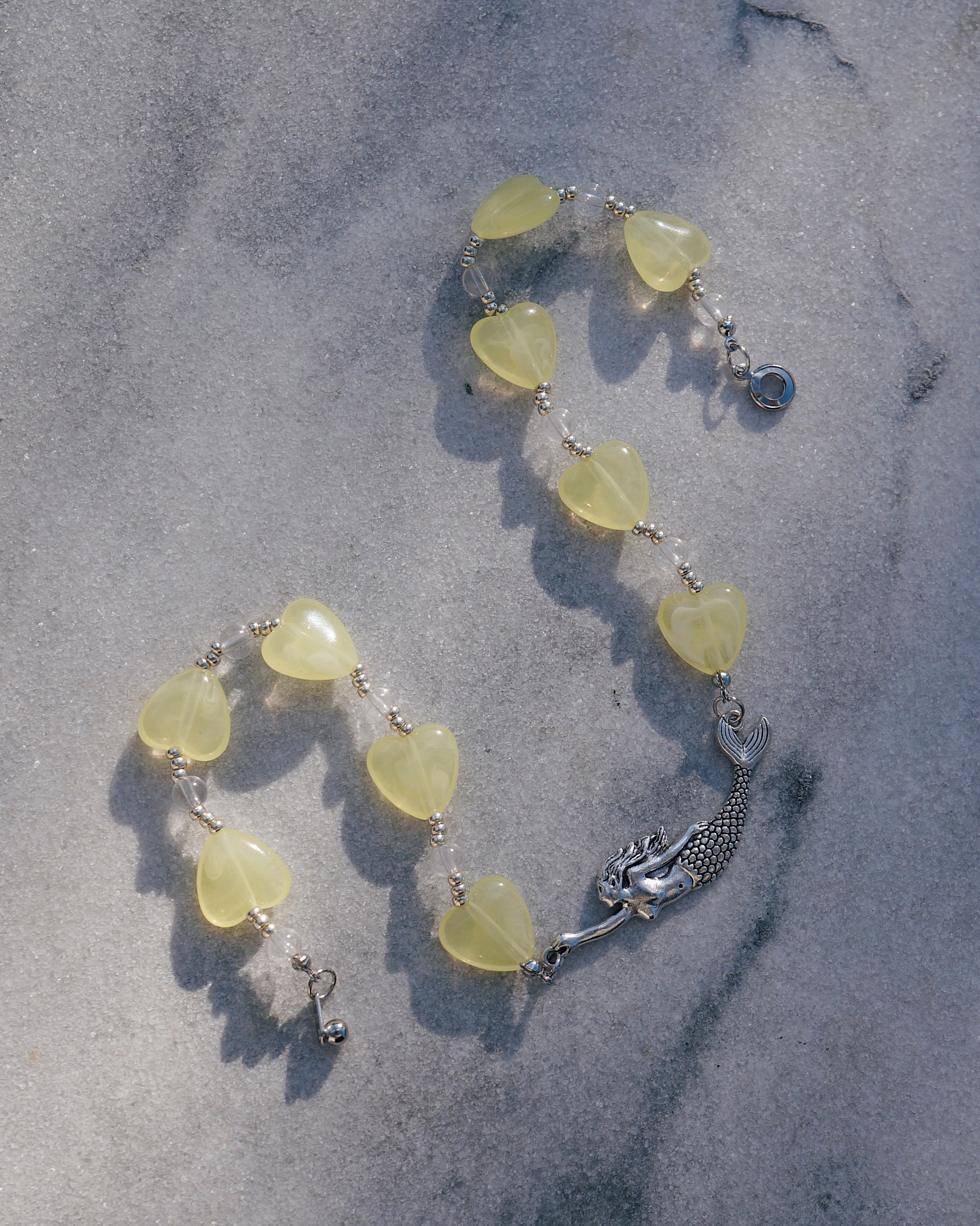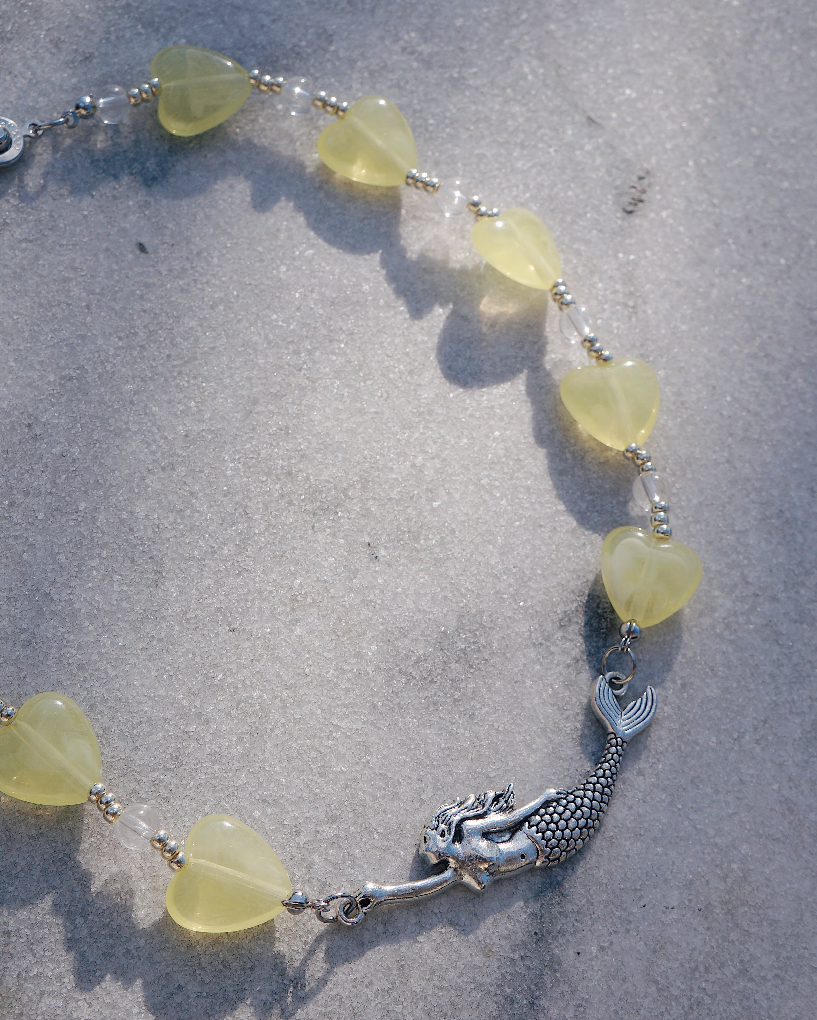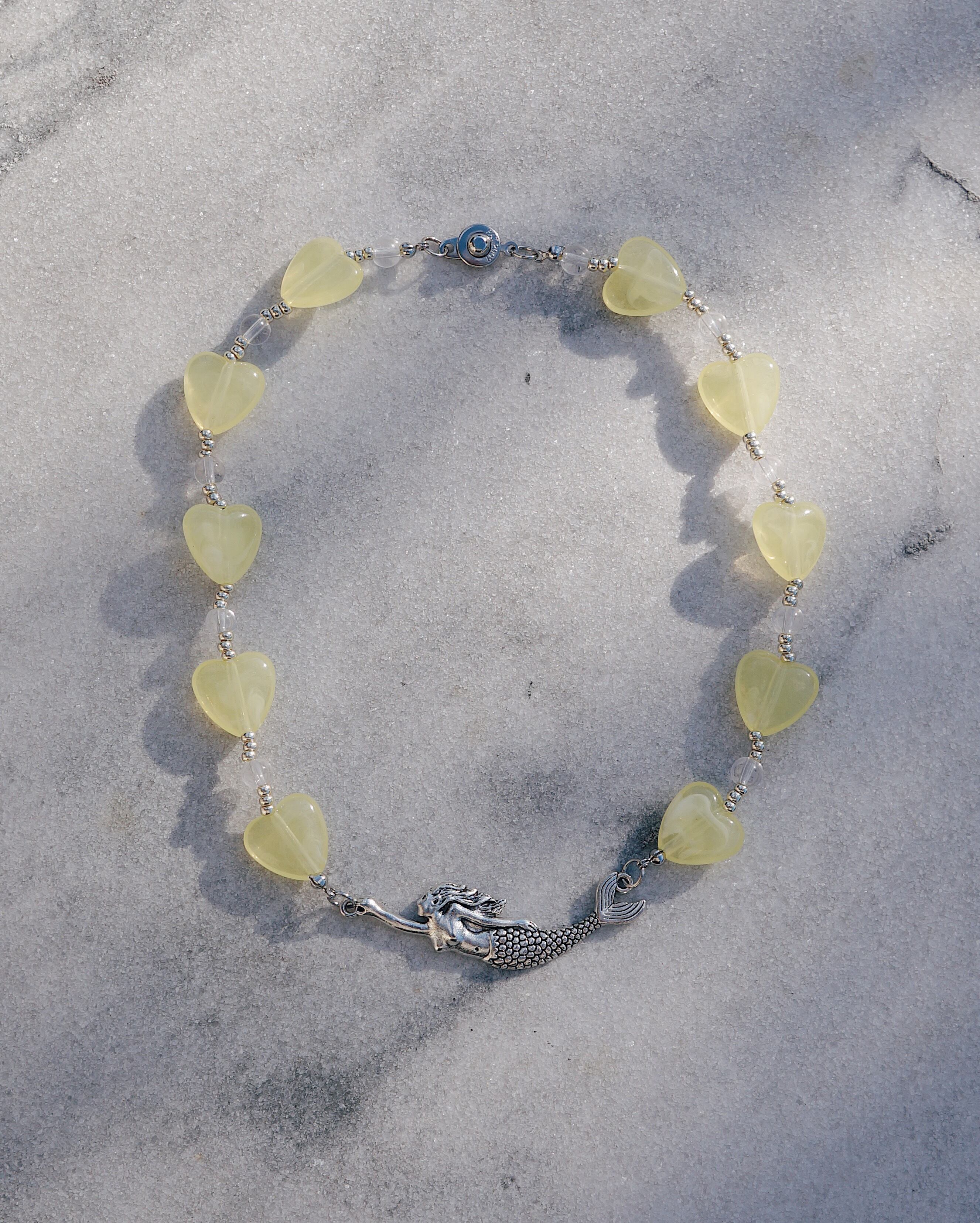 人魚のチャームが美しいネックレスです。イエローのハートとガラスビーズを全体にあしらった存在感のあるネックレスです。