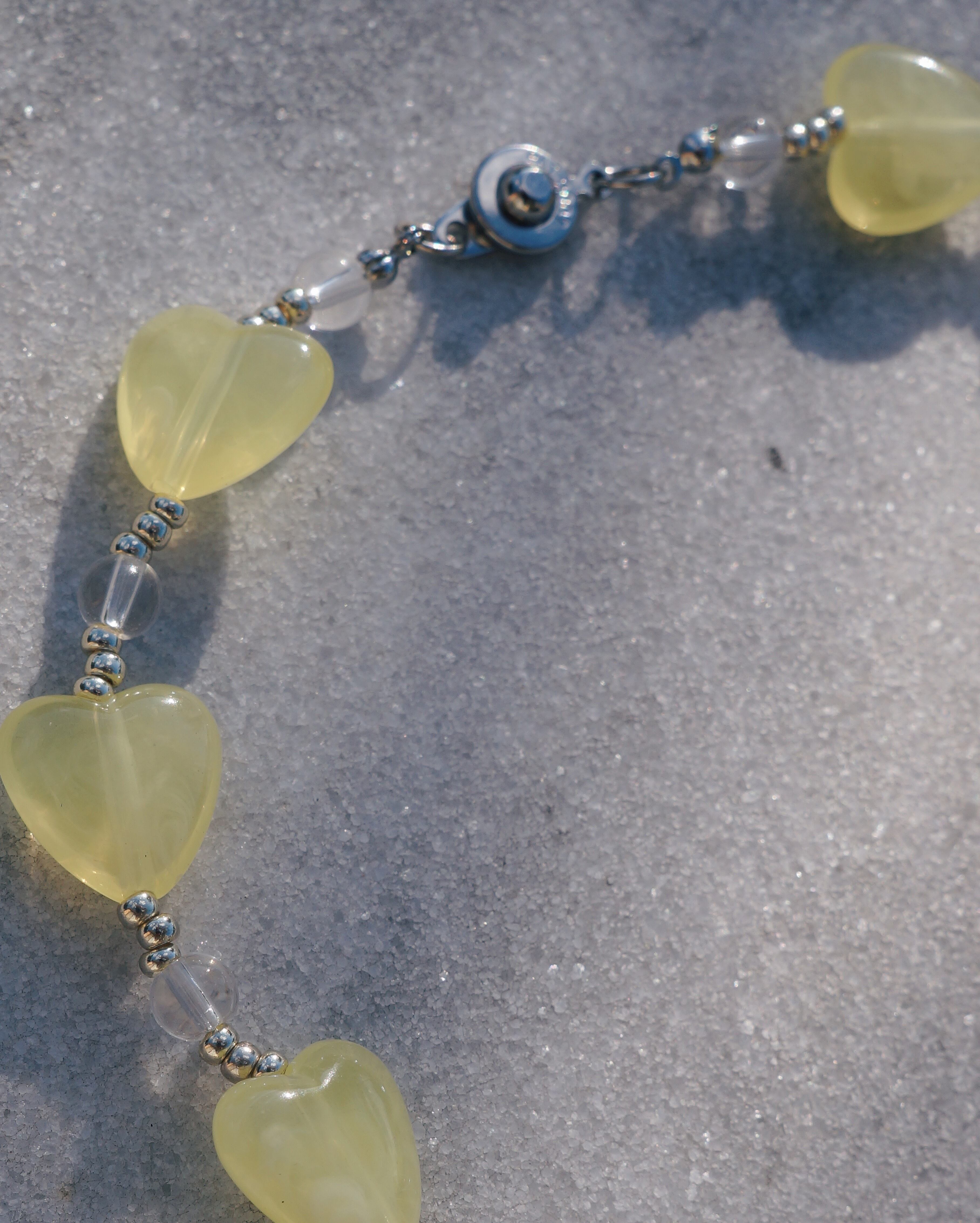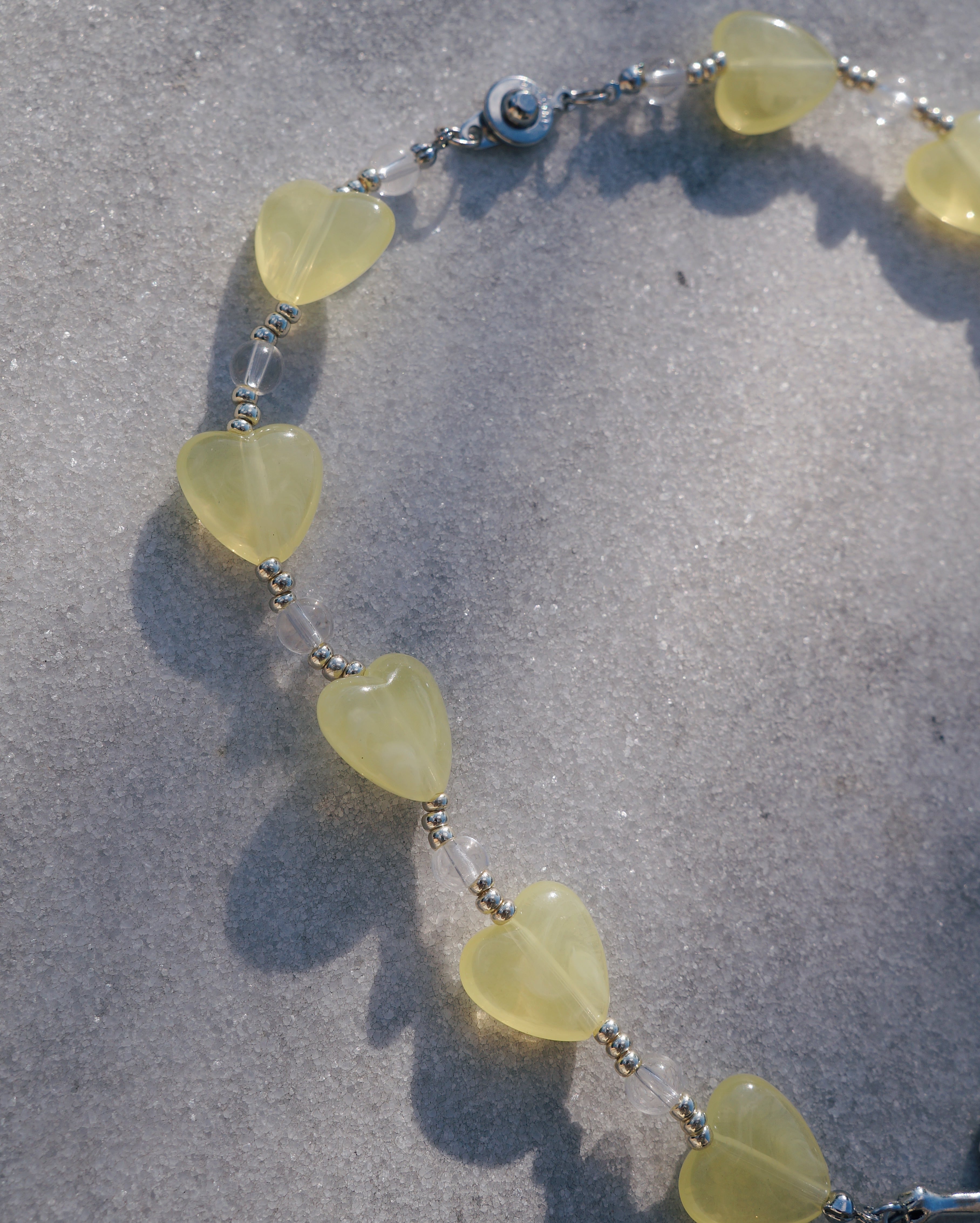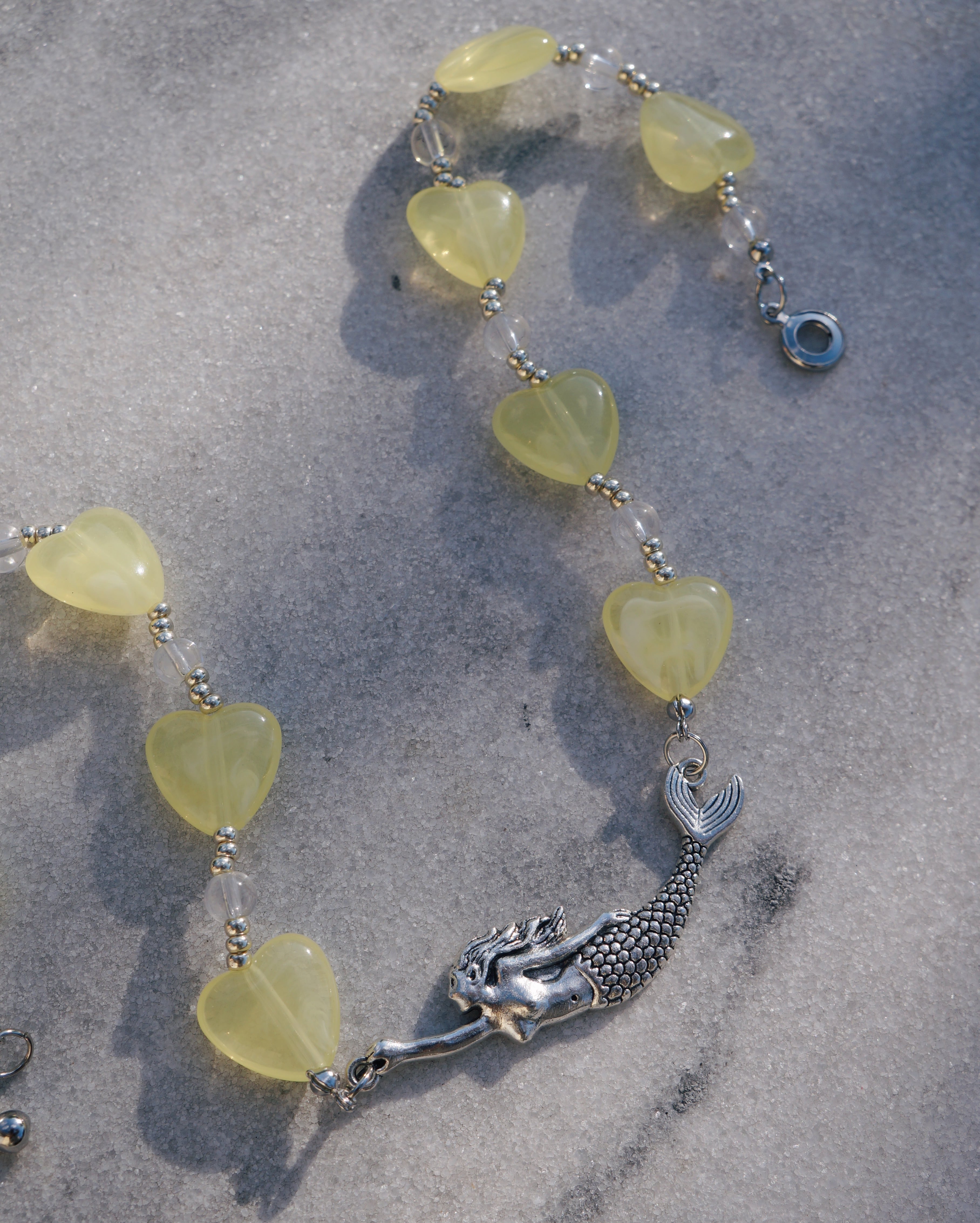 人魚のチャームが美しいネックレスです。イエローのハートとガラスビーズを全体にあしらった存在感のあるネックレスです。
