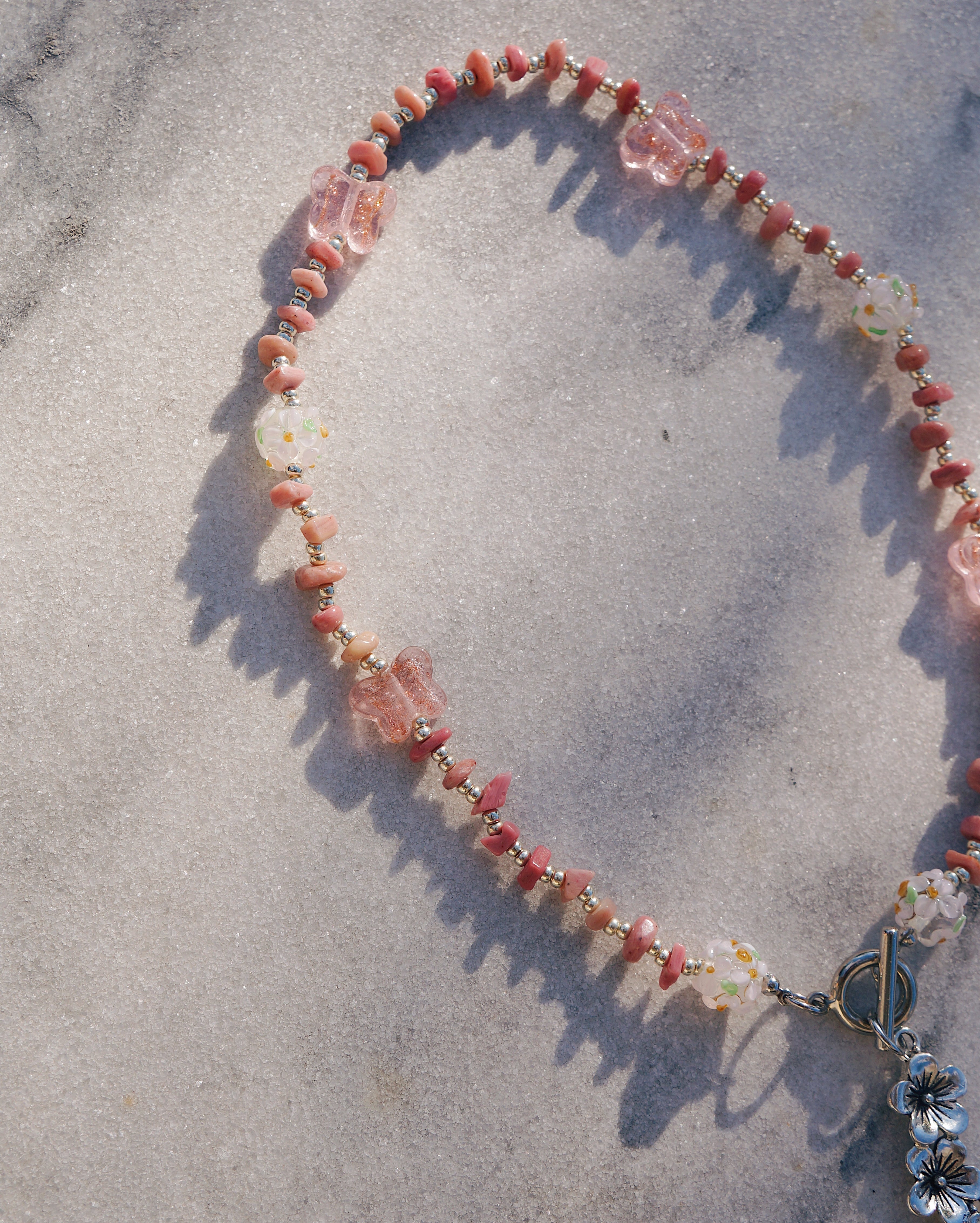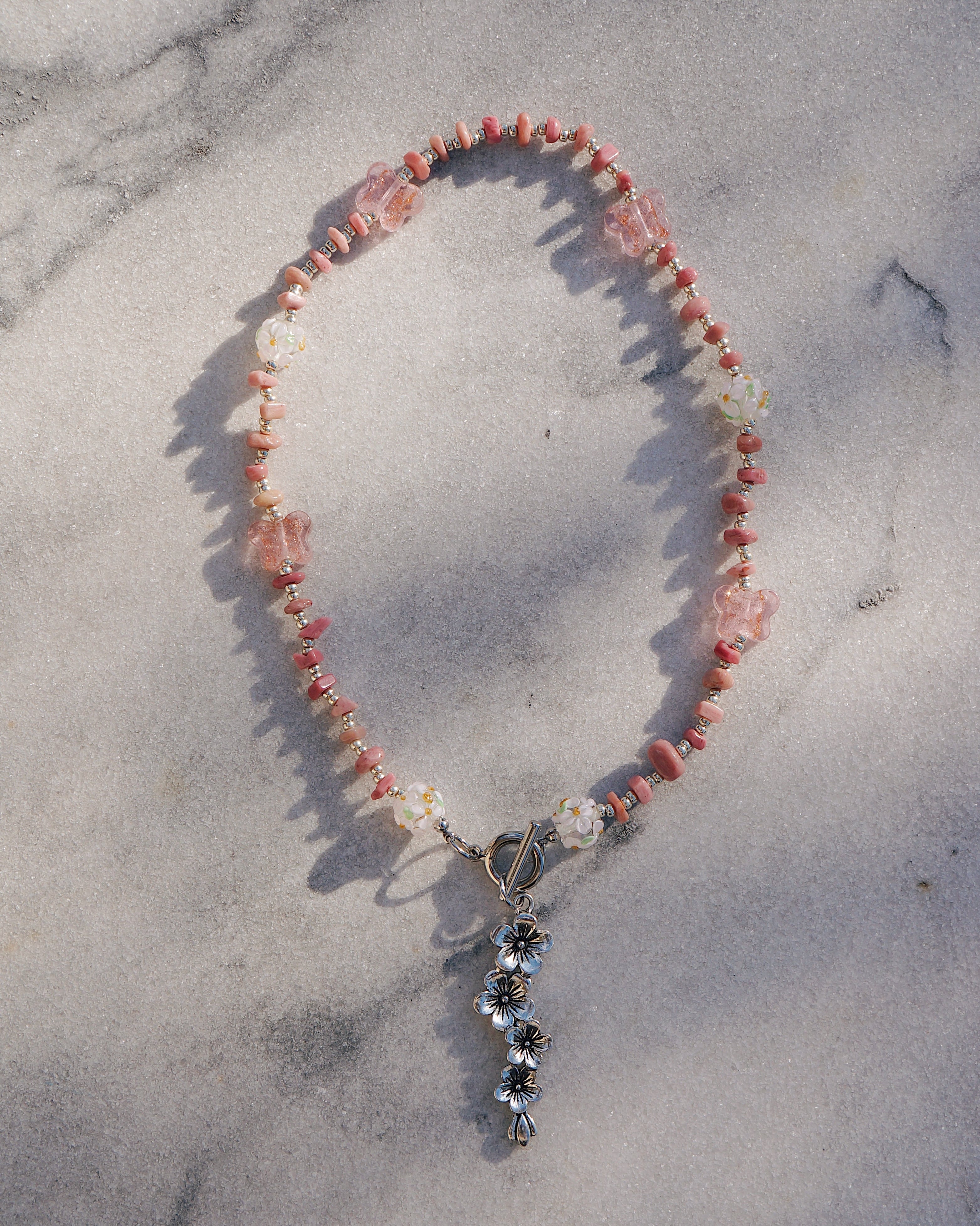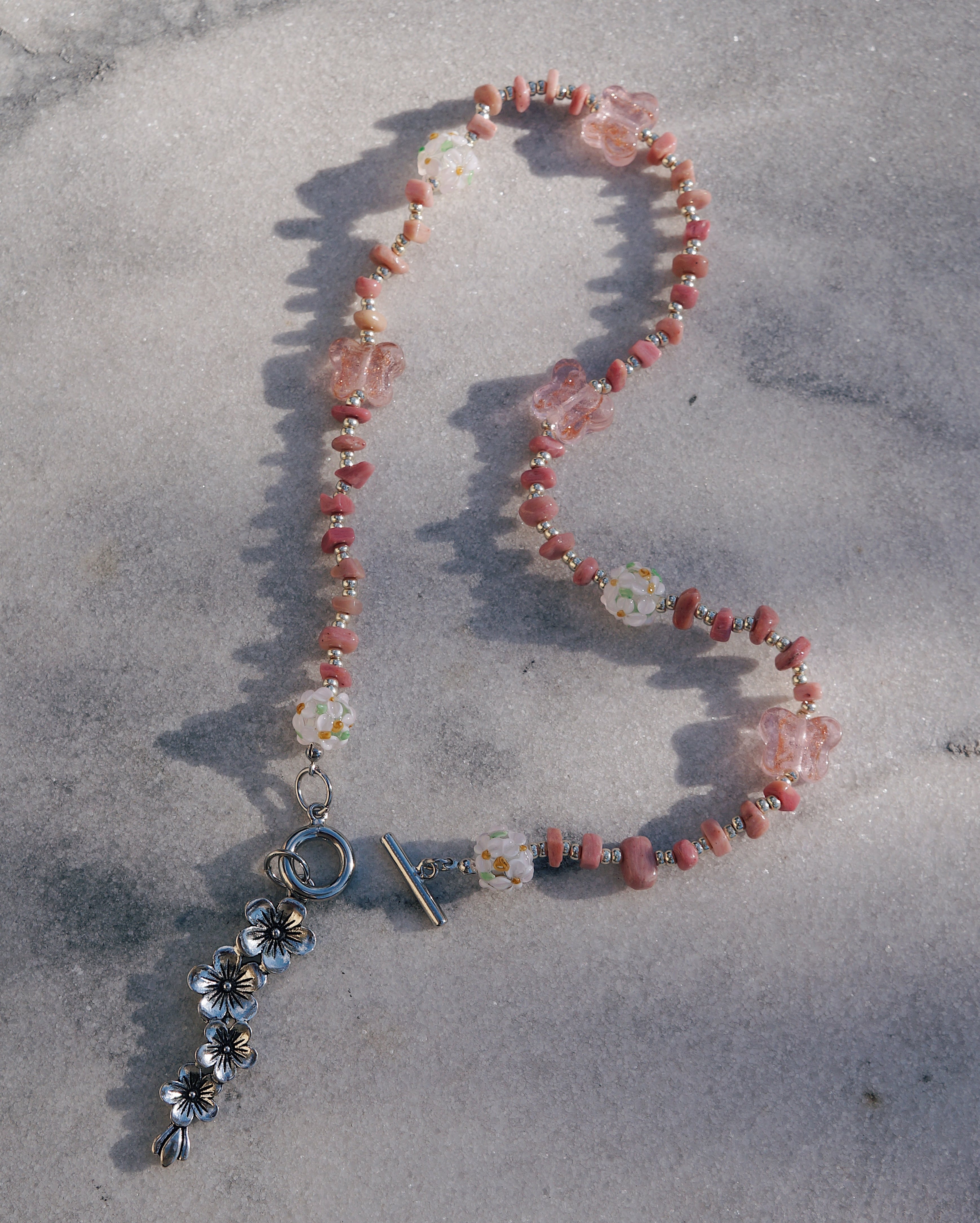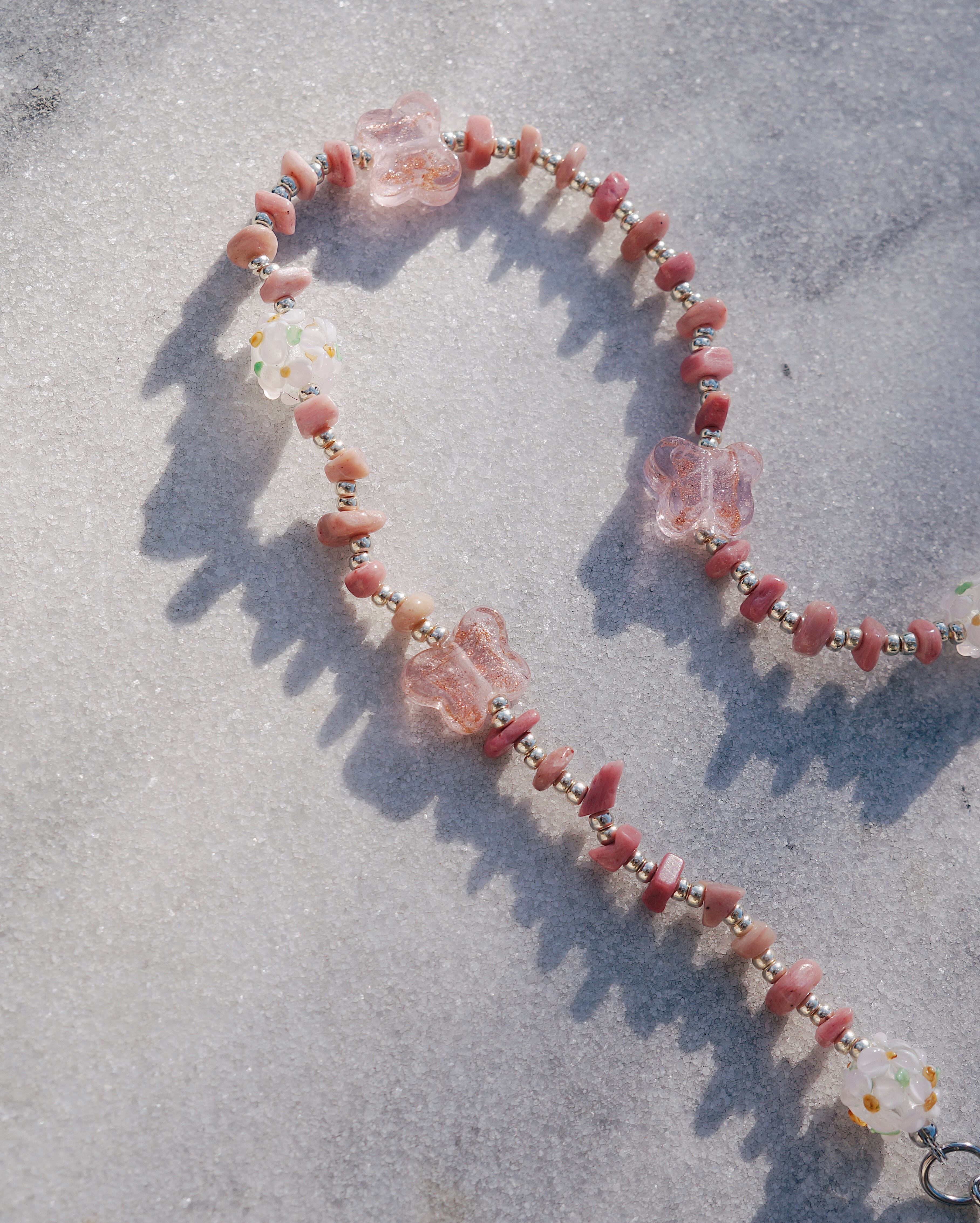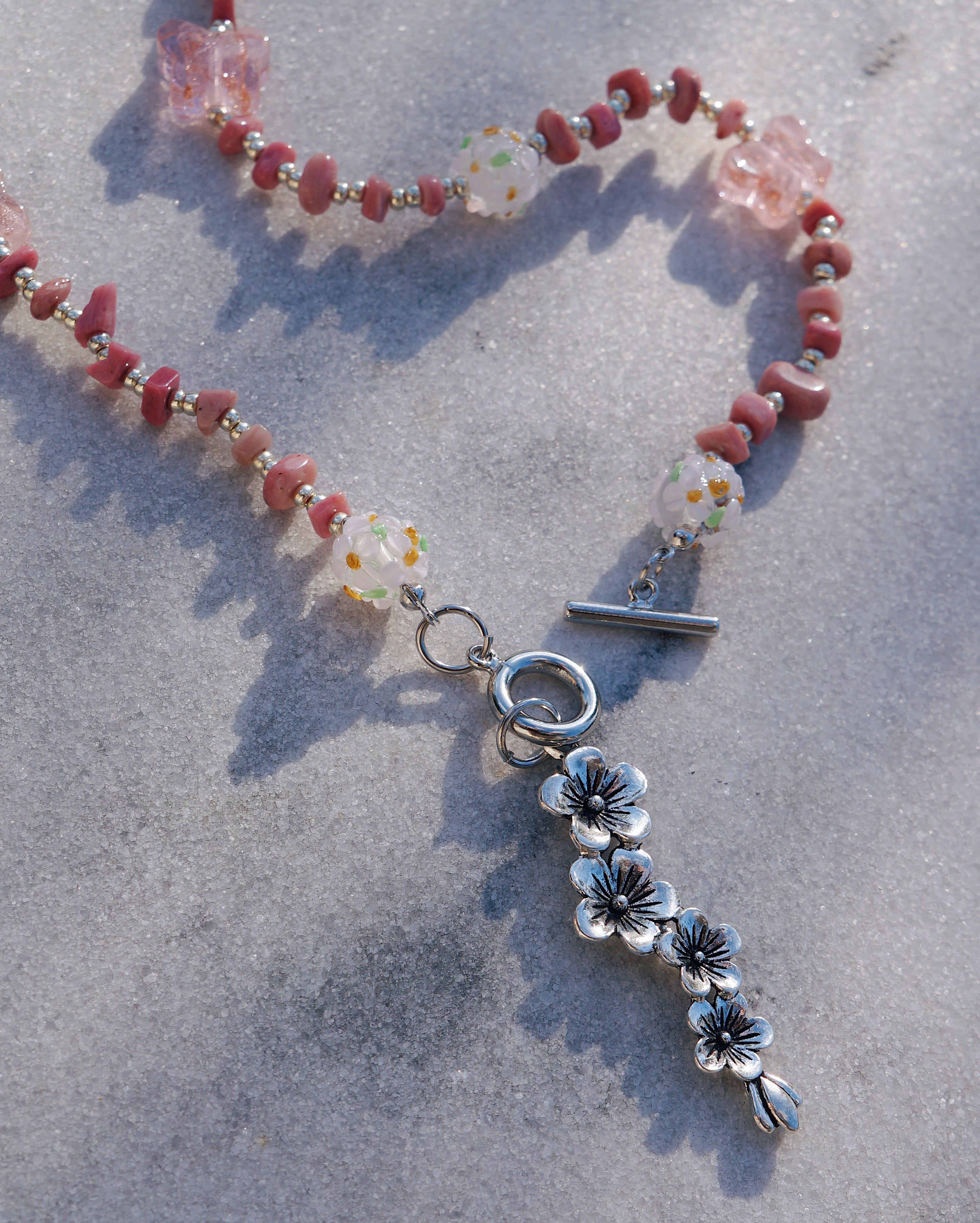 天然石のロードナイトと、お花が描かれた美しいガラスビーズ、蝶のガラスビーズと、大ぶりのお花のチャームがとってもキュートな存在感のあるネックレスです。