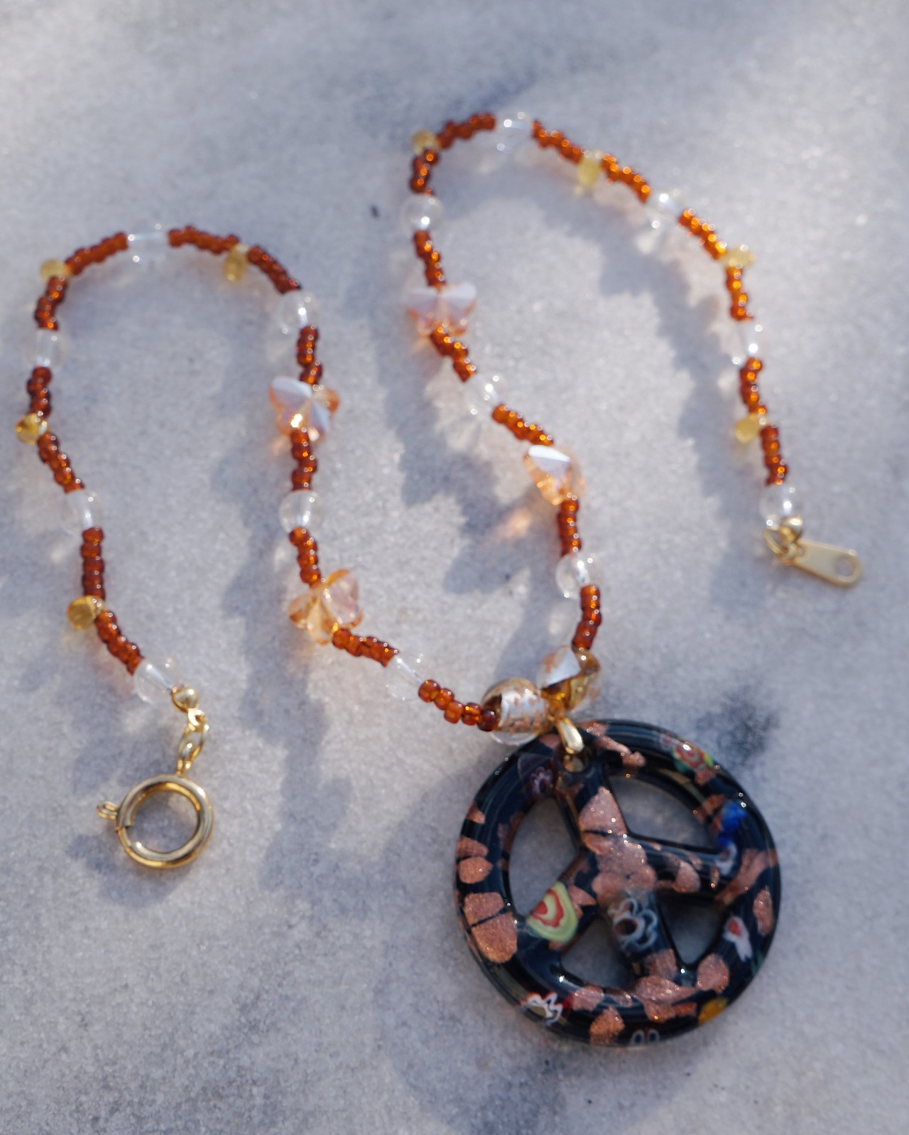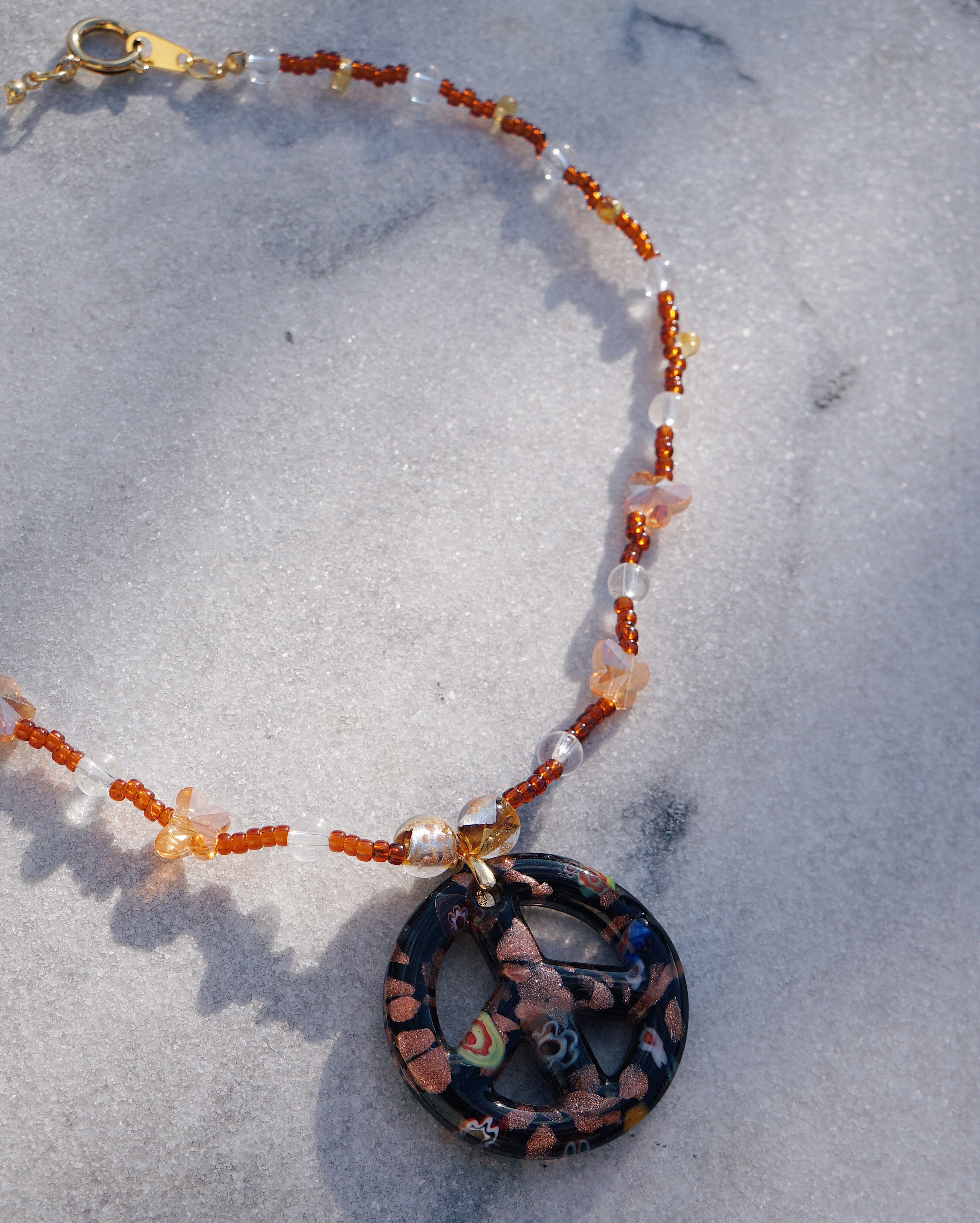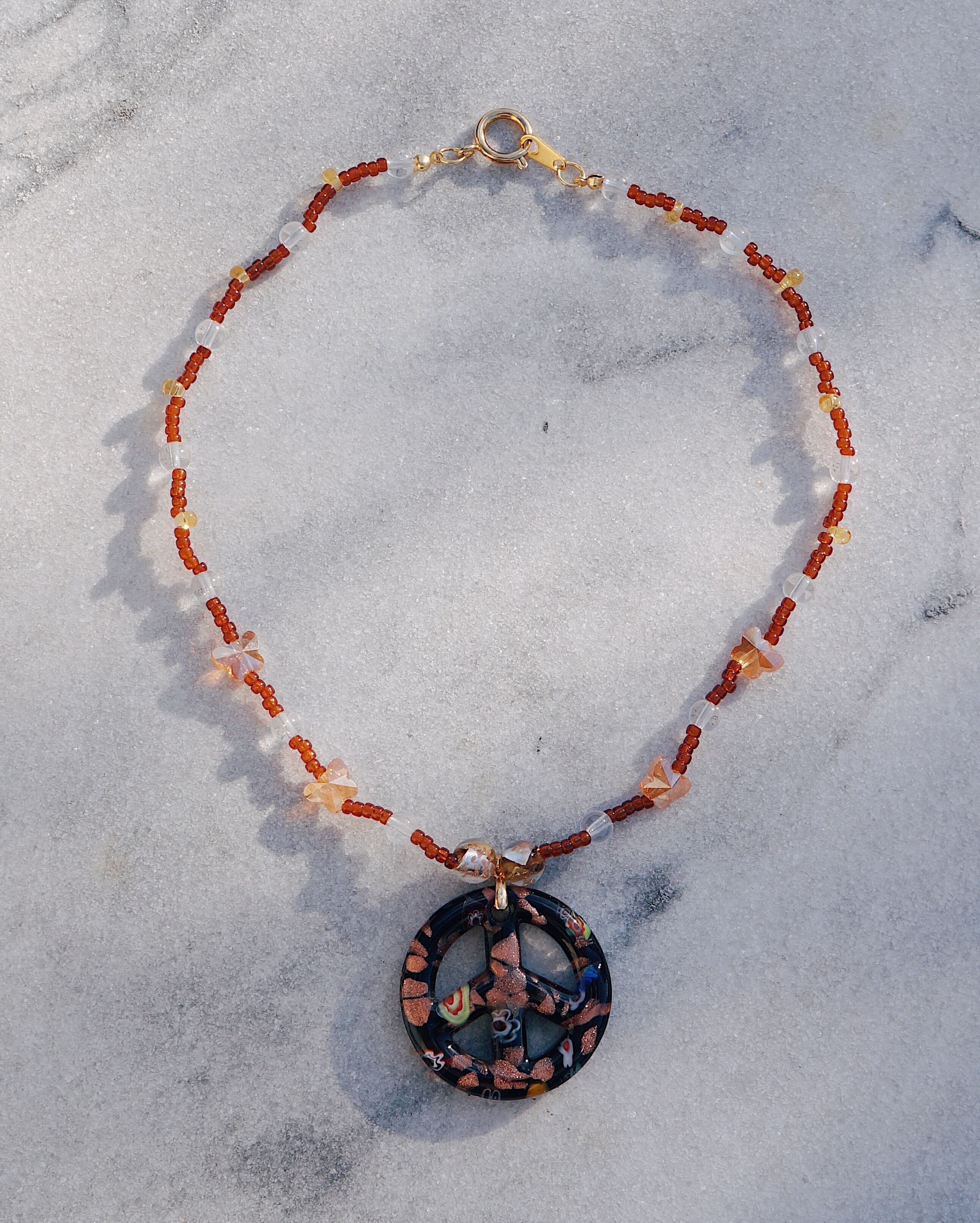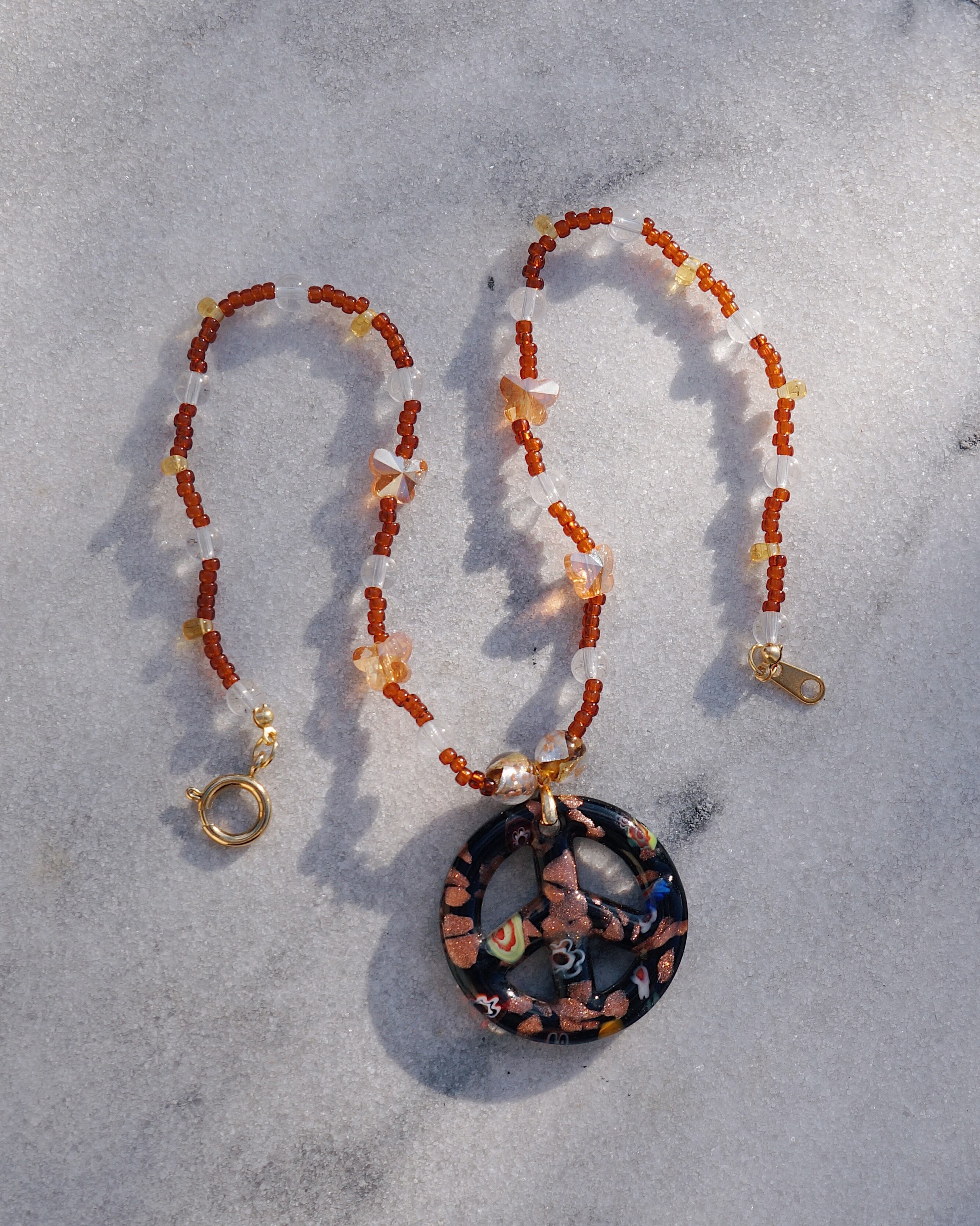 キュートなピースマークのガラスチャームをデザインのメインに色味はシックなカラーでまとめたネックレスです。クリスタルの蝶のビーズがキラキラ輝き見ているだけでキュンとするような一点です。色味が落ち着いているため意外とどのようなスタイリングにも合わせやすくおすすめです。