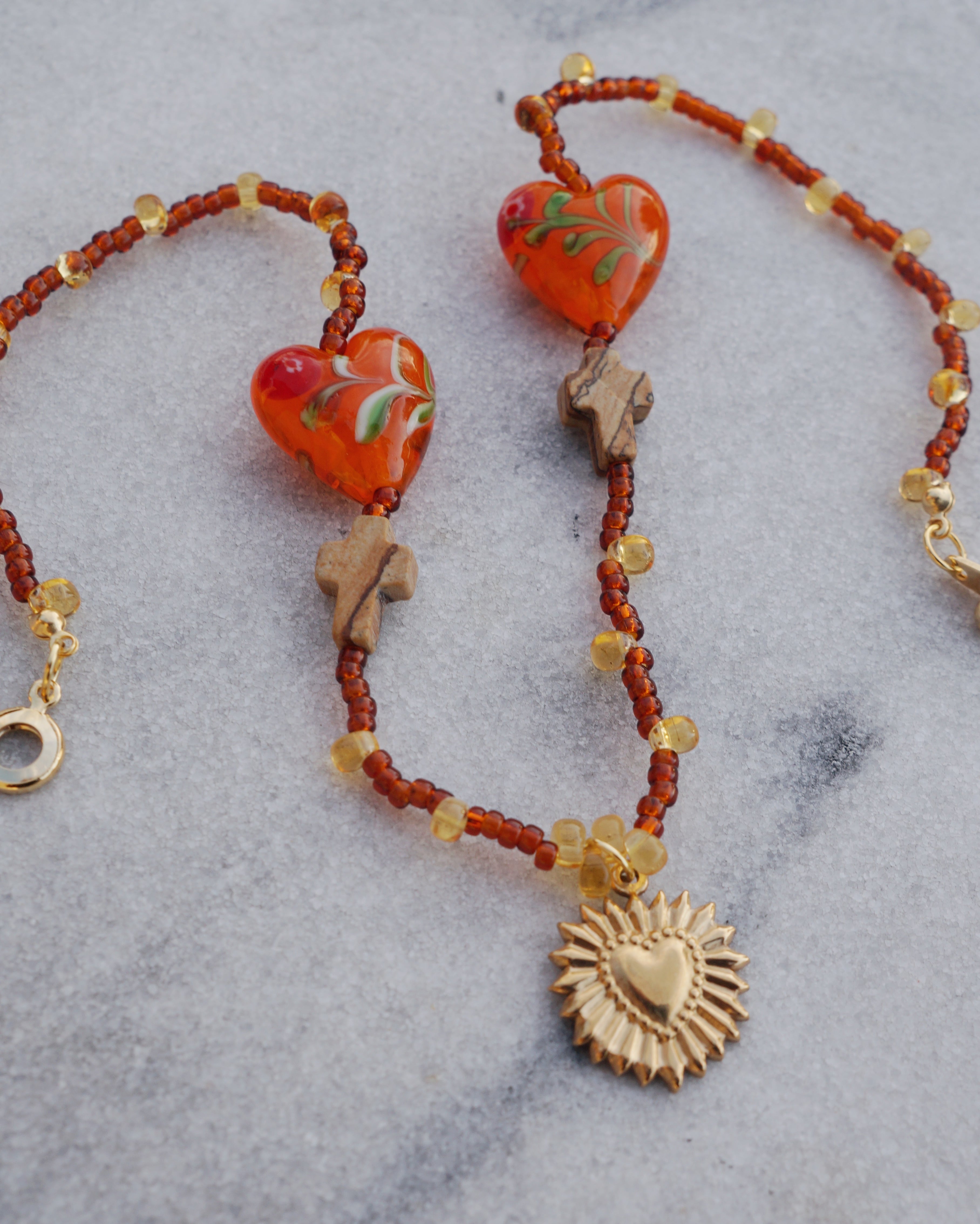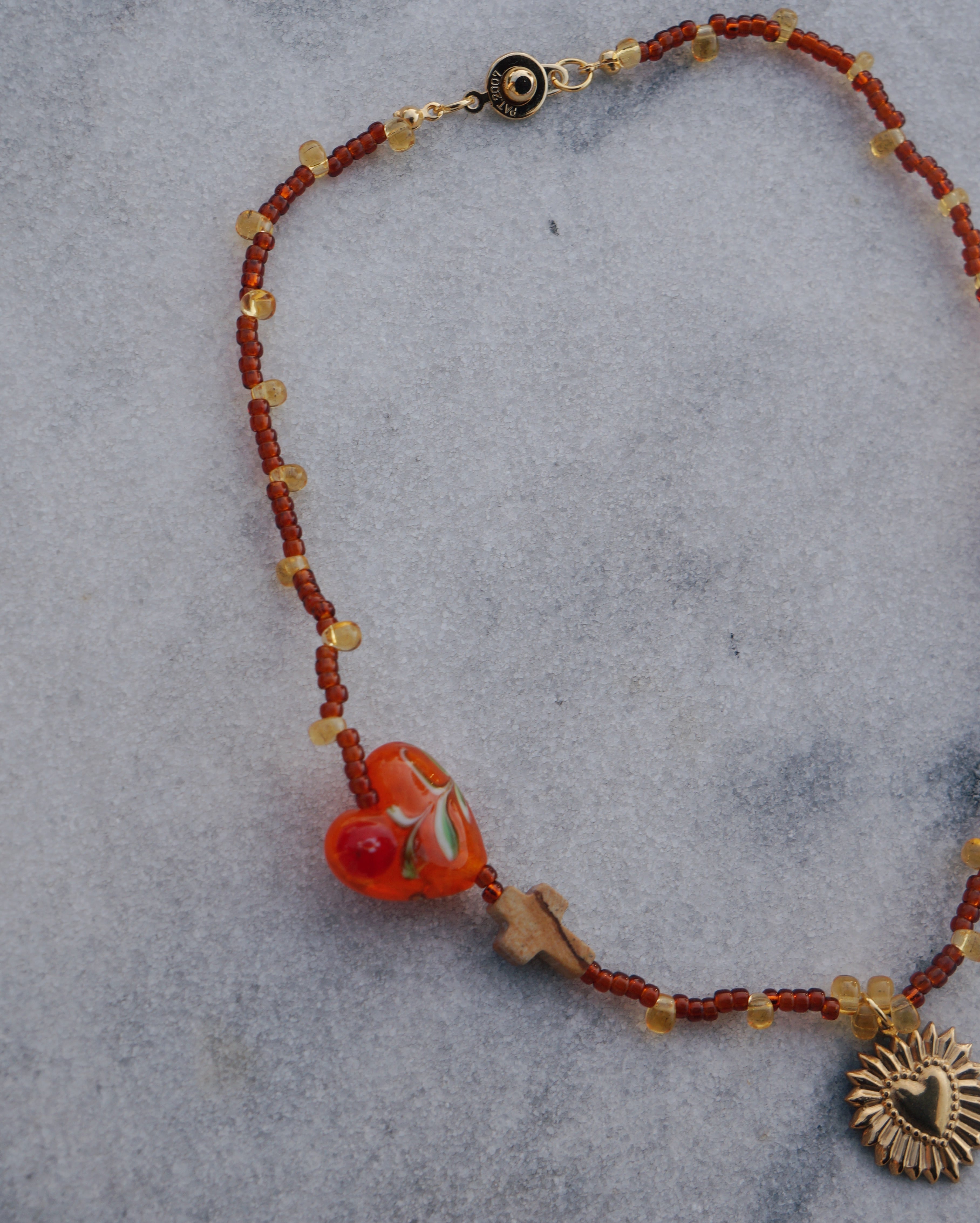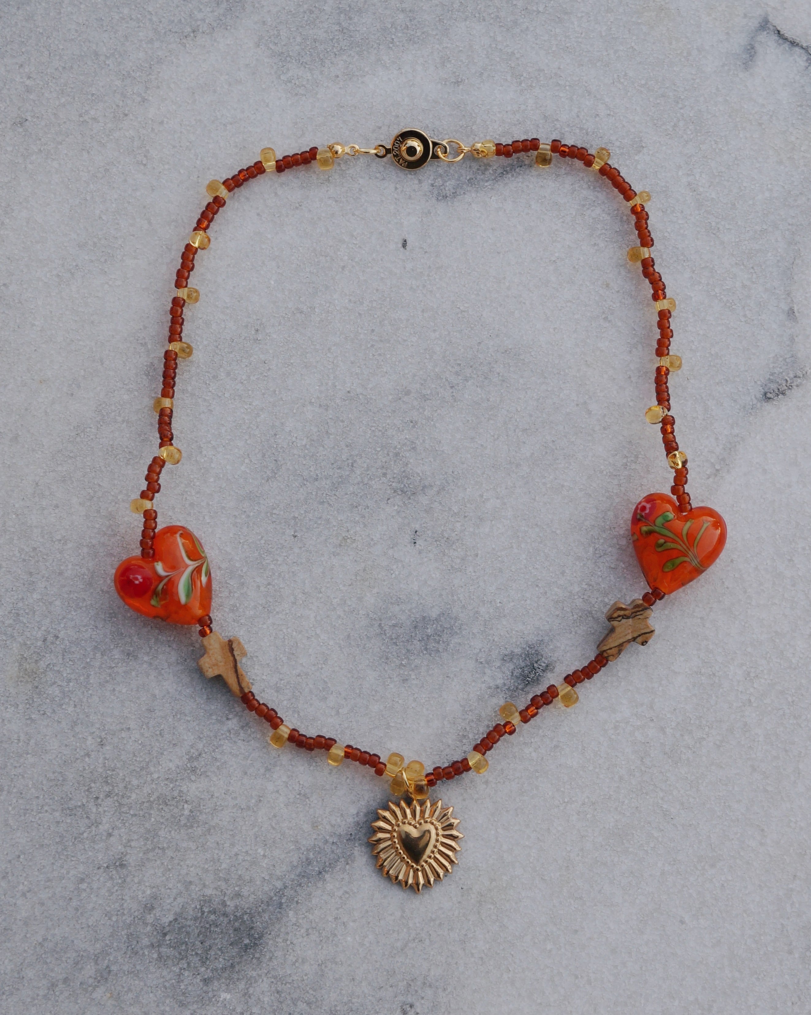 ビンテージ感があるチャームに、シックなカラーのビーズを合わせ、お花が描かれたキュートなハート型のガラスビーズとピクチャージャスパーのクロスビーズをポイントに入れた美しいネックレスです。