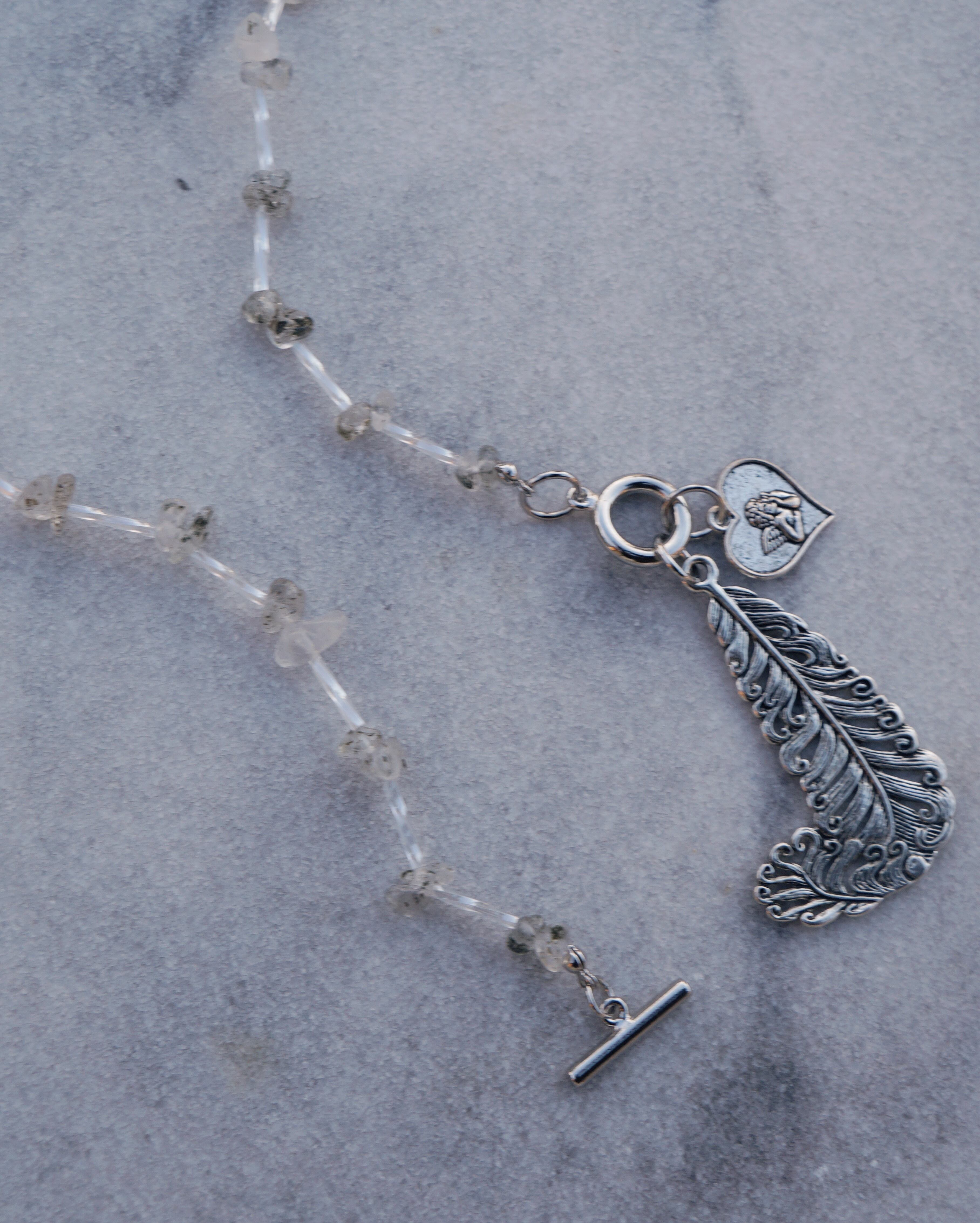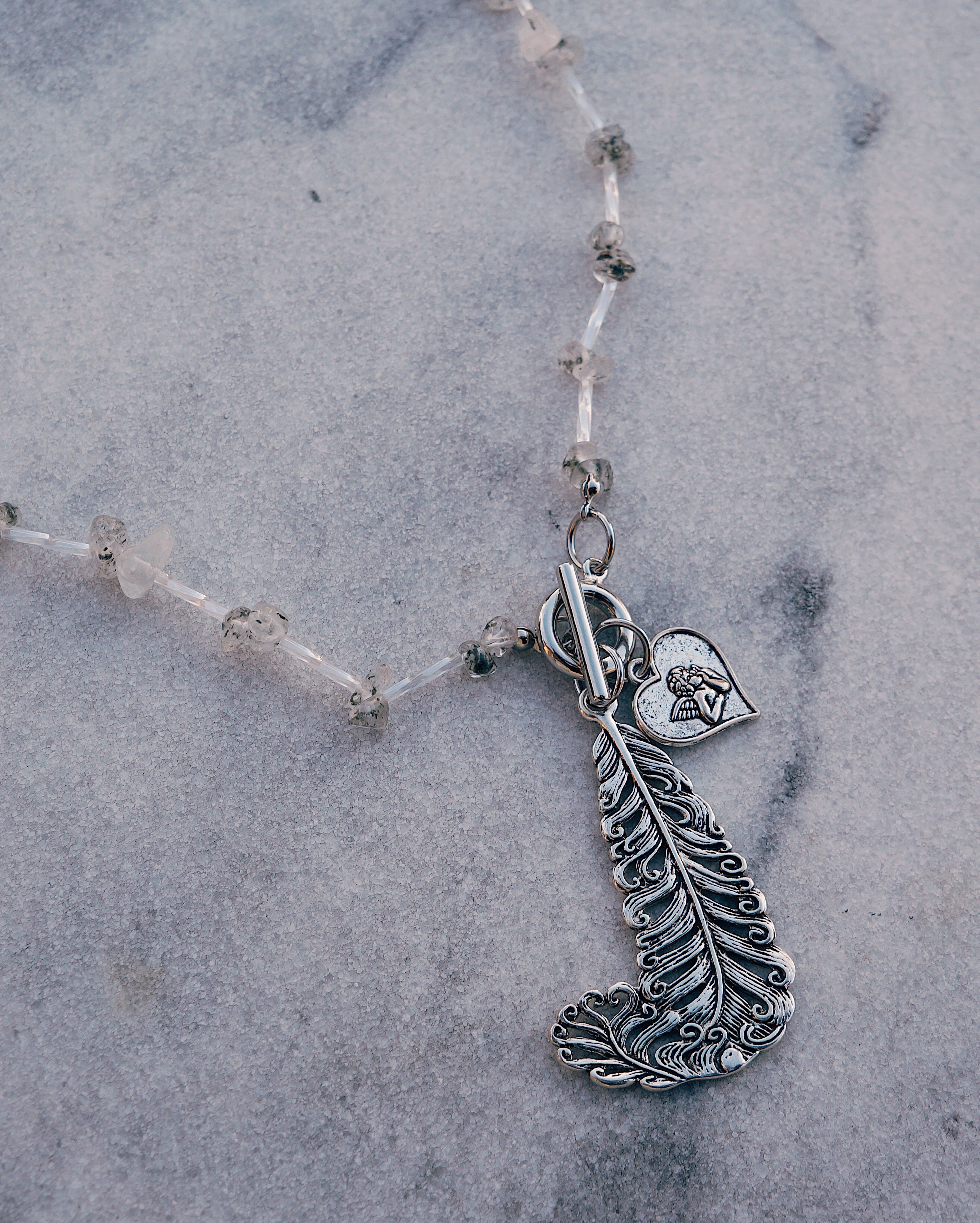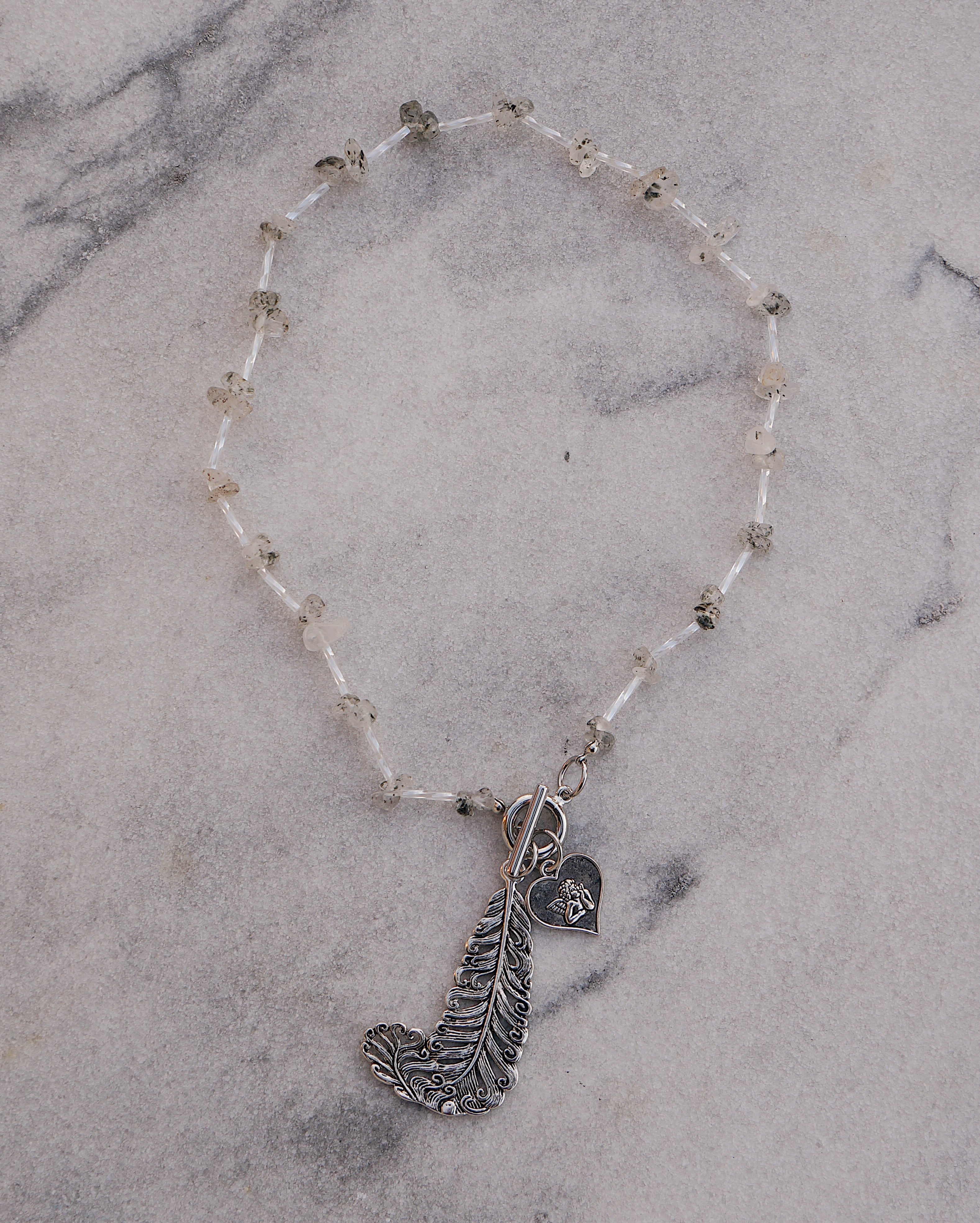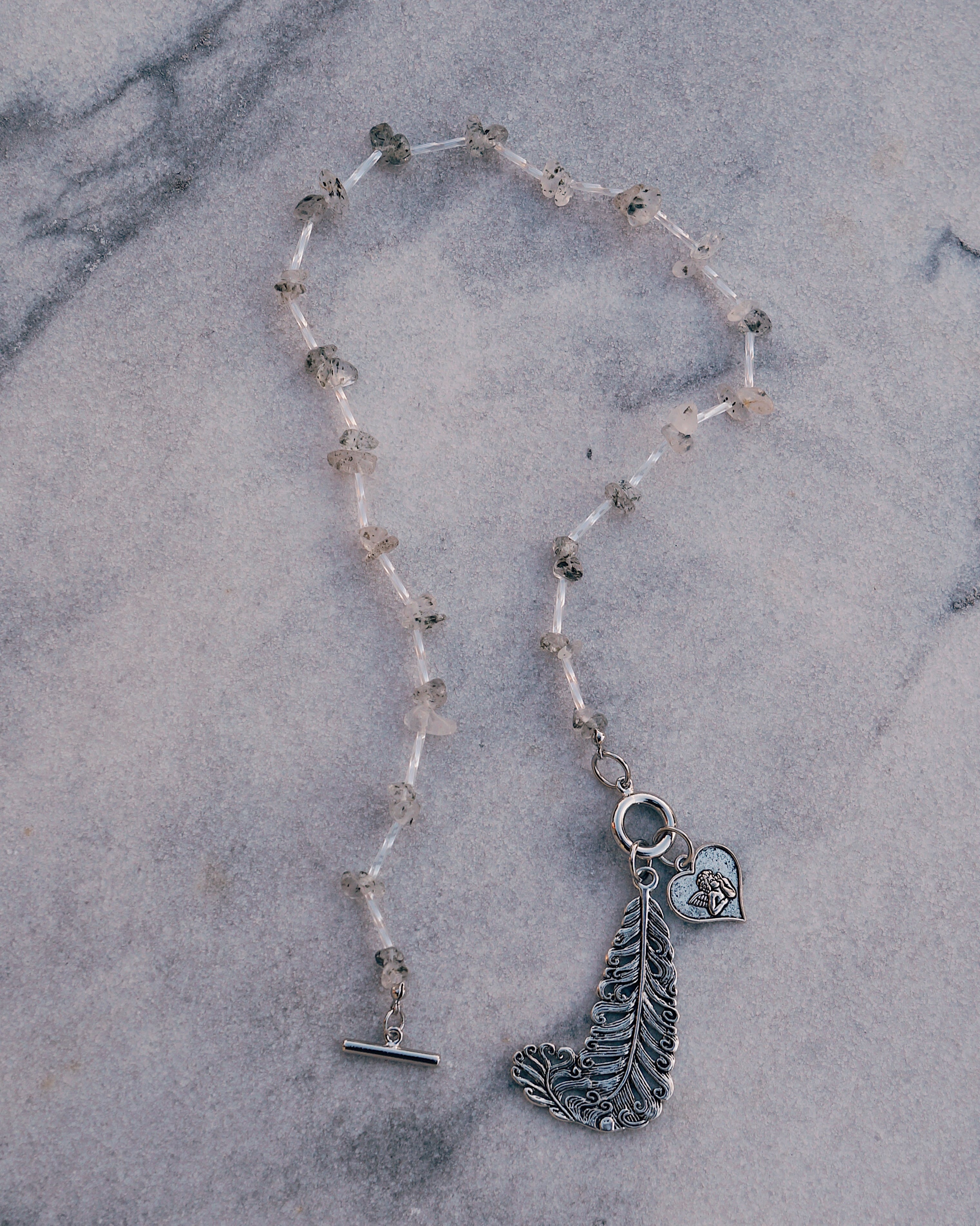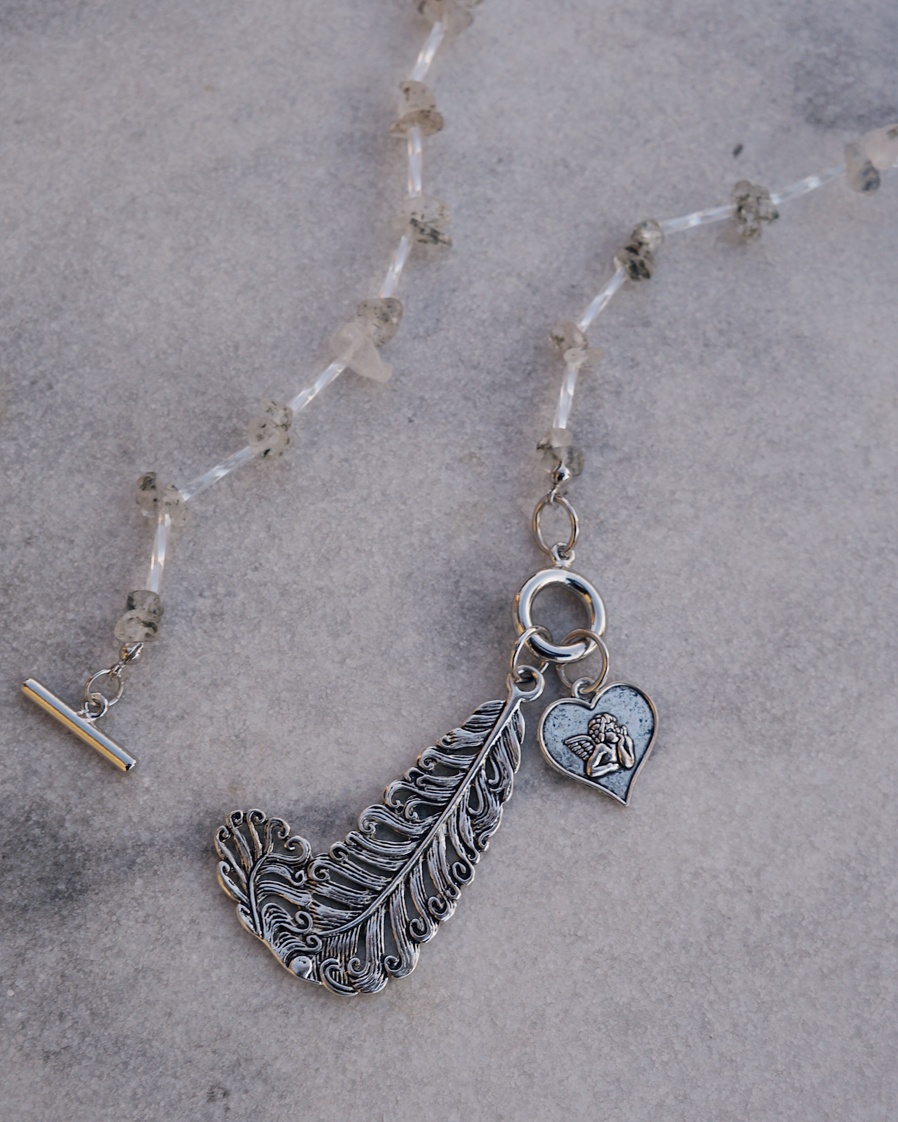 天然石のブラックストロベリークォーツを使いどのようなスタイリングにも合わせやすいデザインでありながら、大ぶりのチャームでユニークさも出しました。羽と天使のチャームがとてもキュートです。