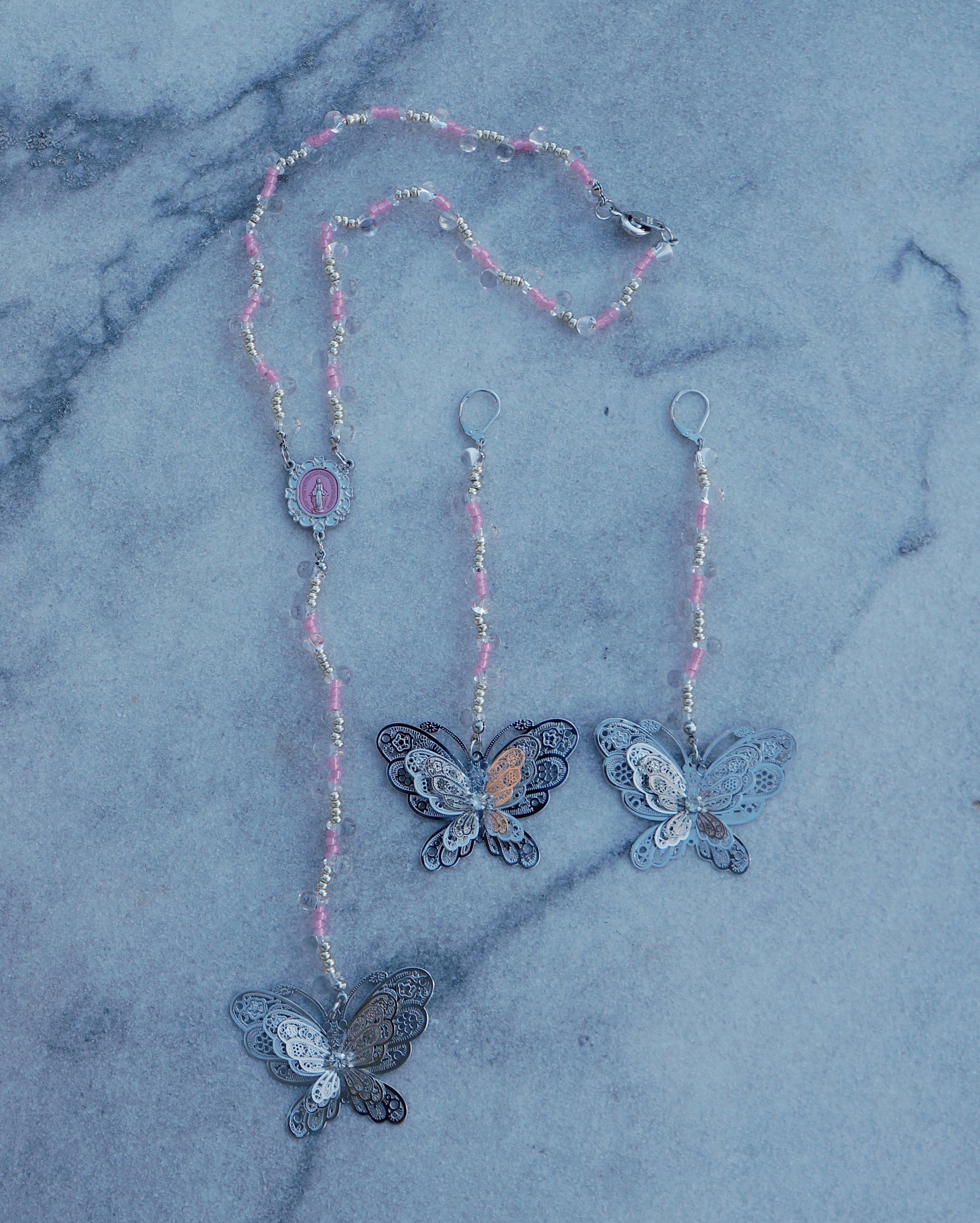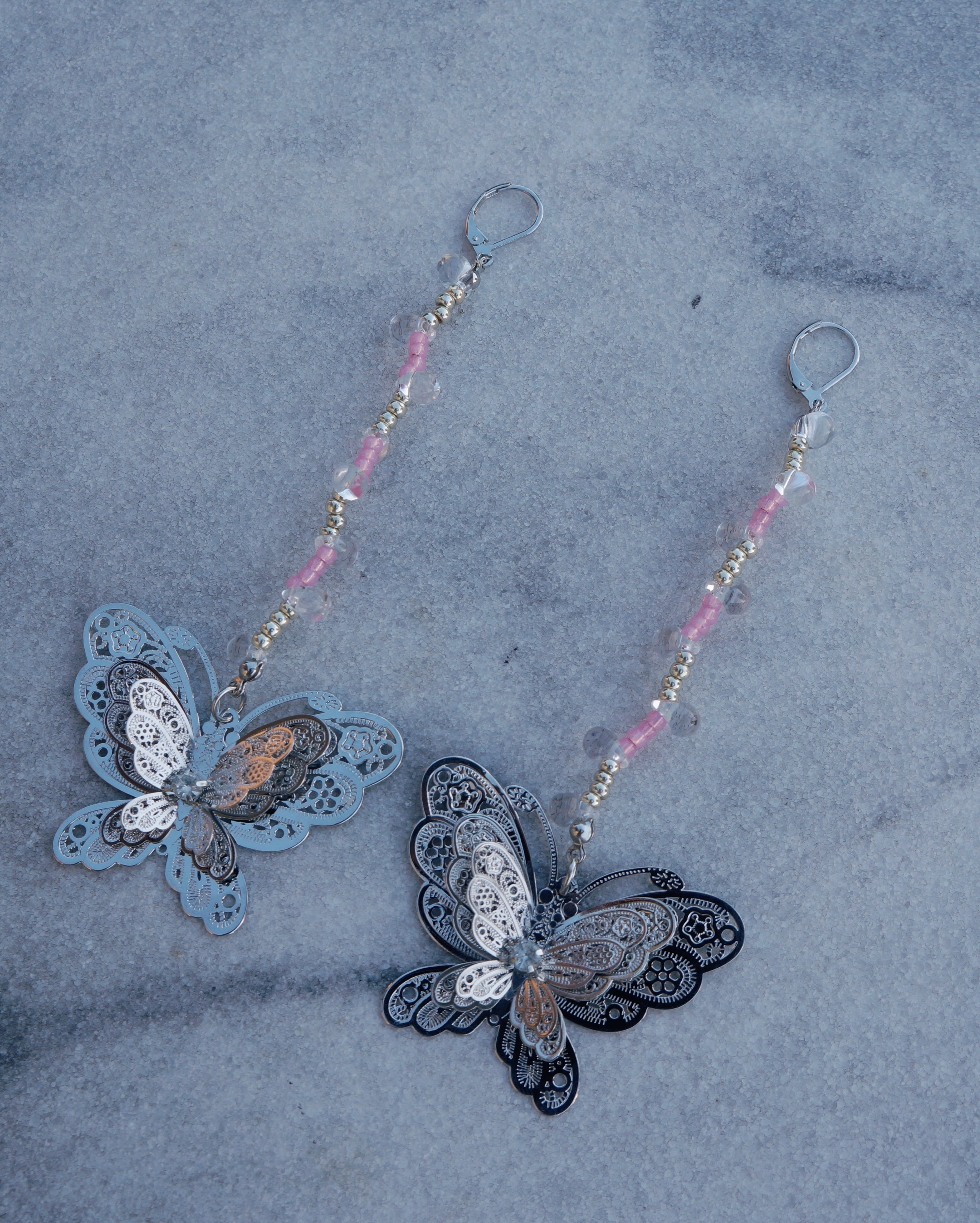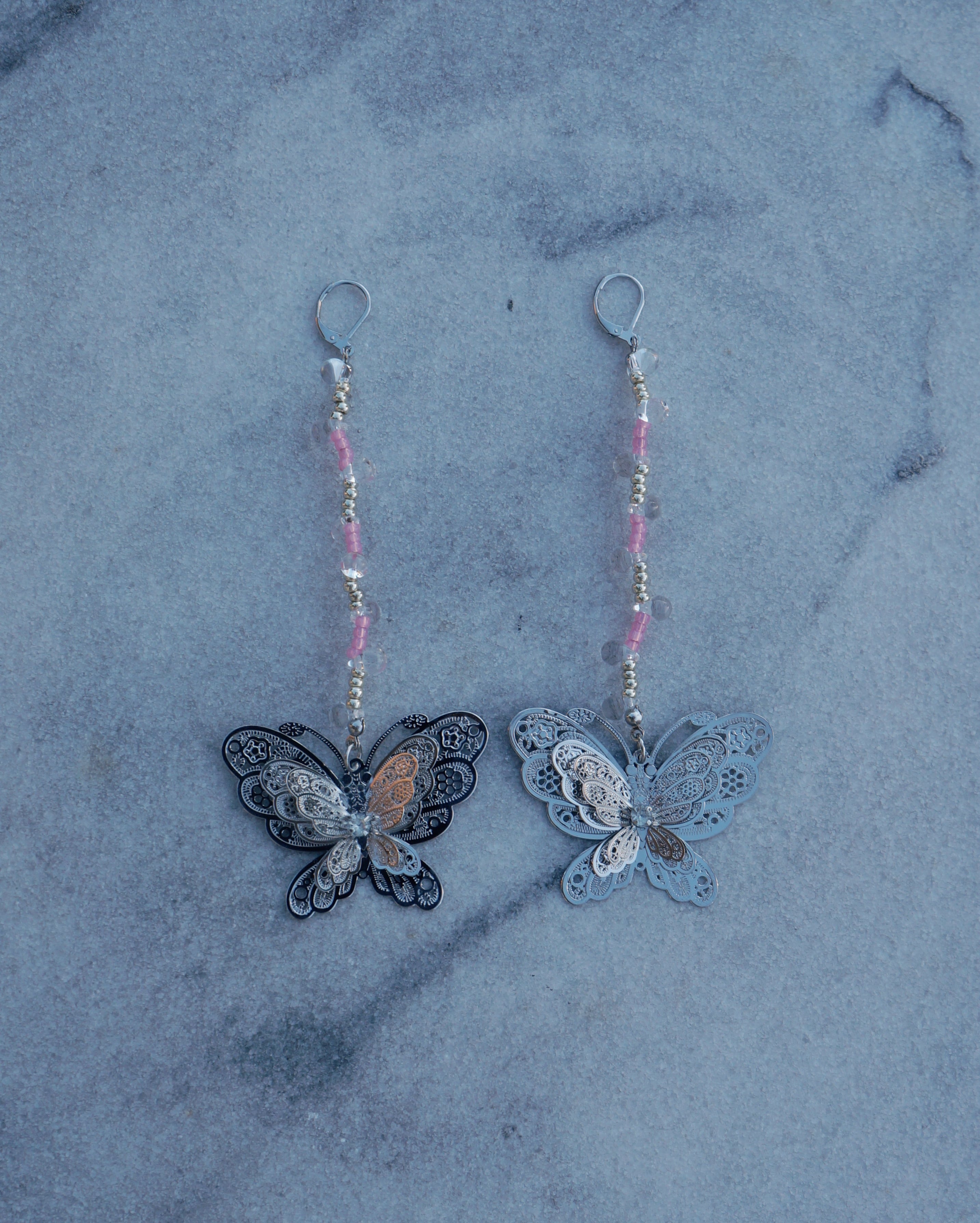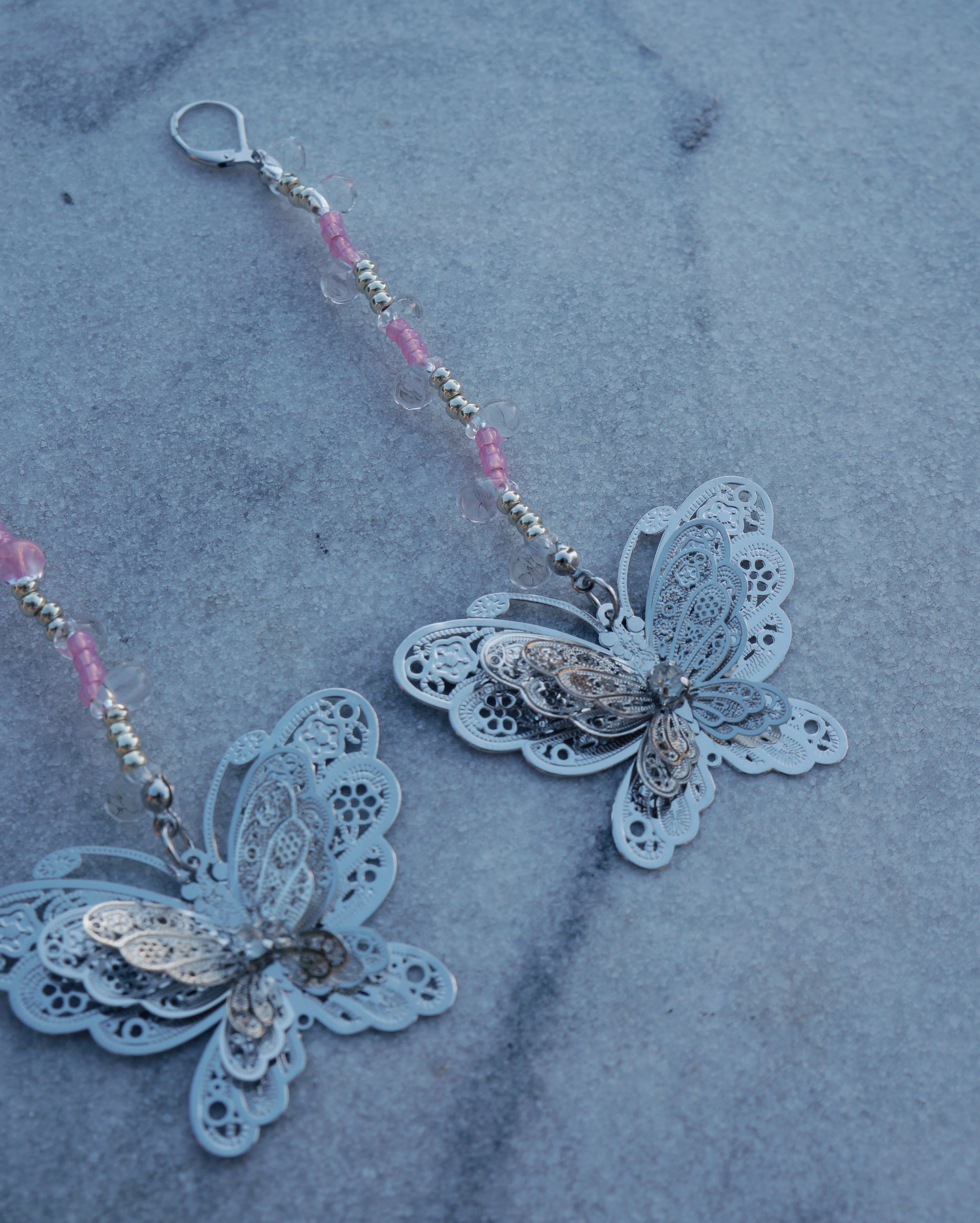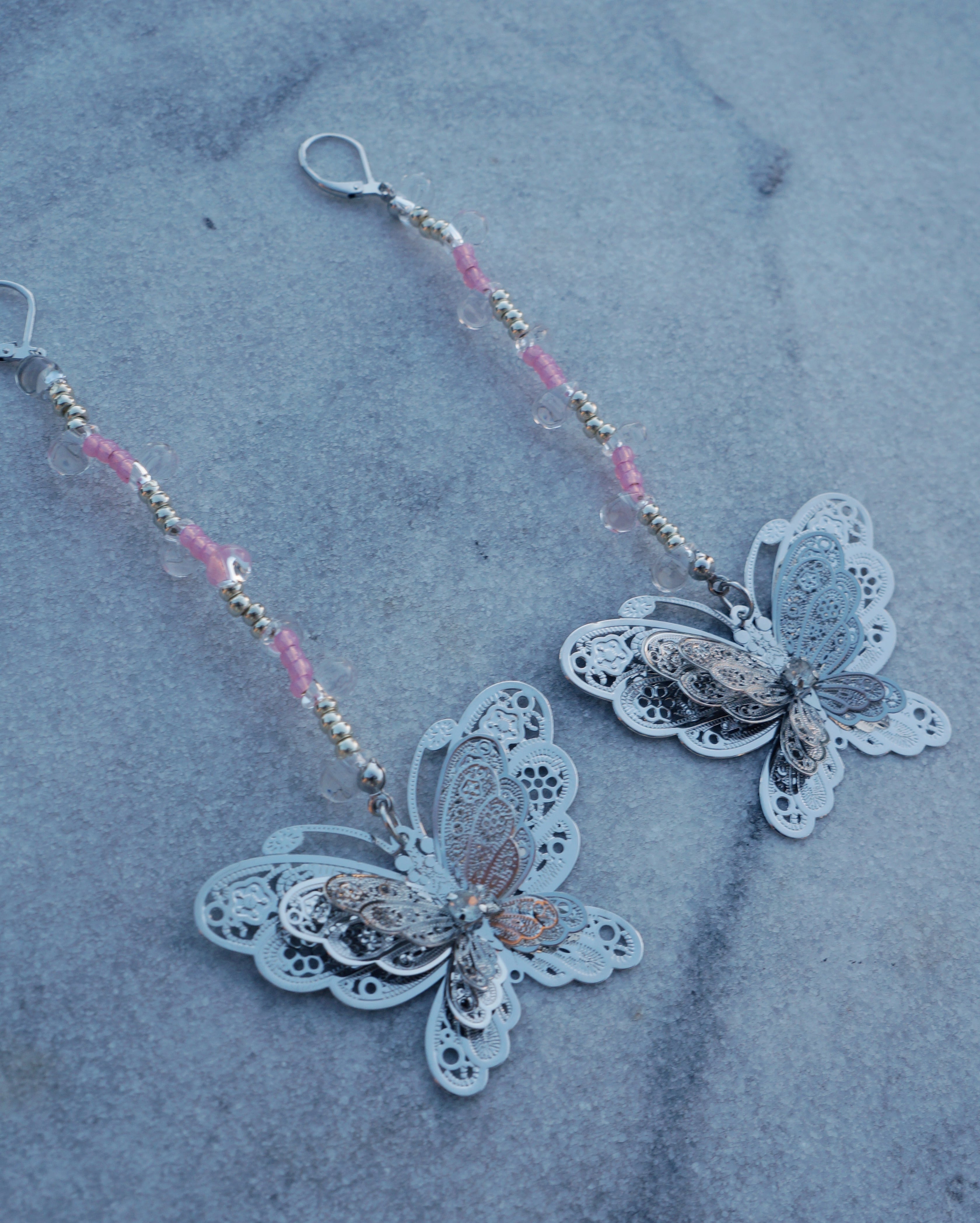 長めのゆらゆら揺れるのが可愛いピアスです。クリアなドロップビーズが光に当たると照らされ美しい、大ぶりな蝶のチャームが存在感を出します。25310のロザリオ風ネックレスとお揃いでつけるのもおすすめです。