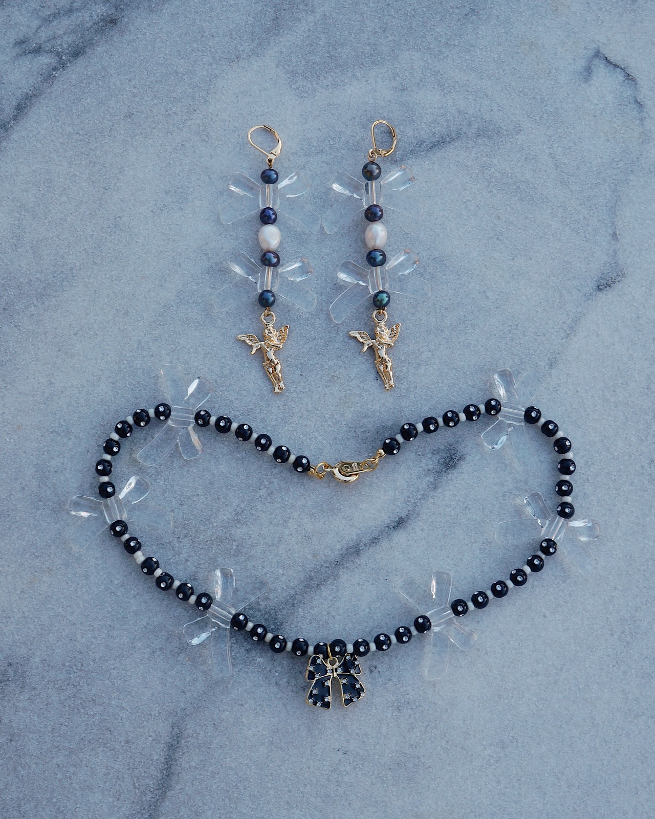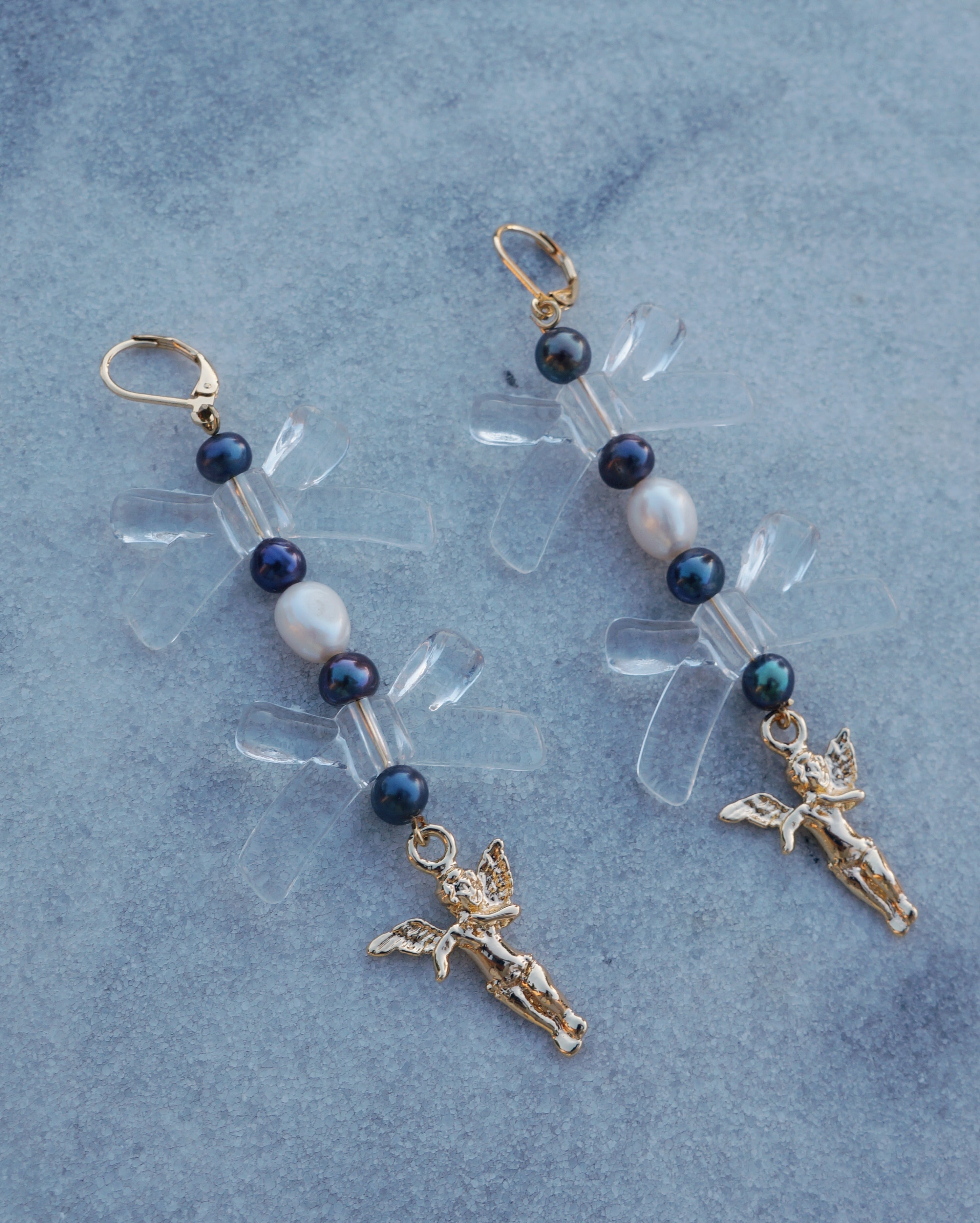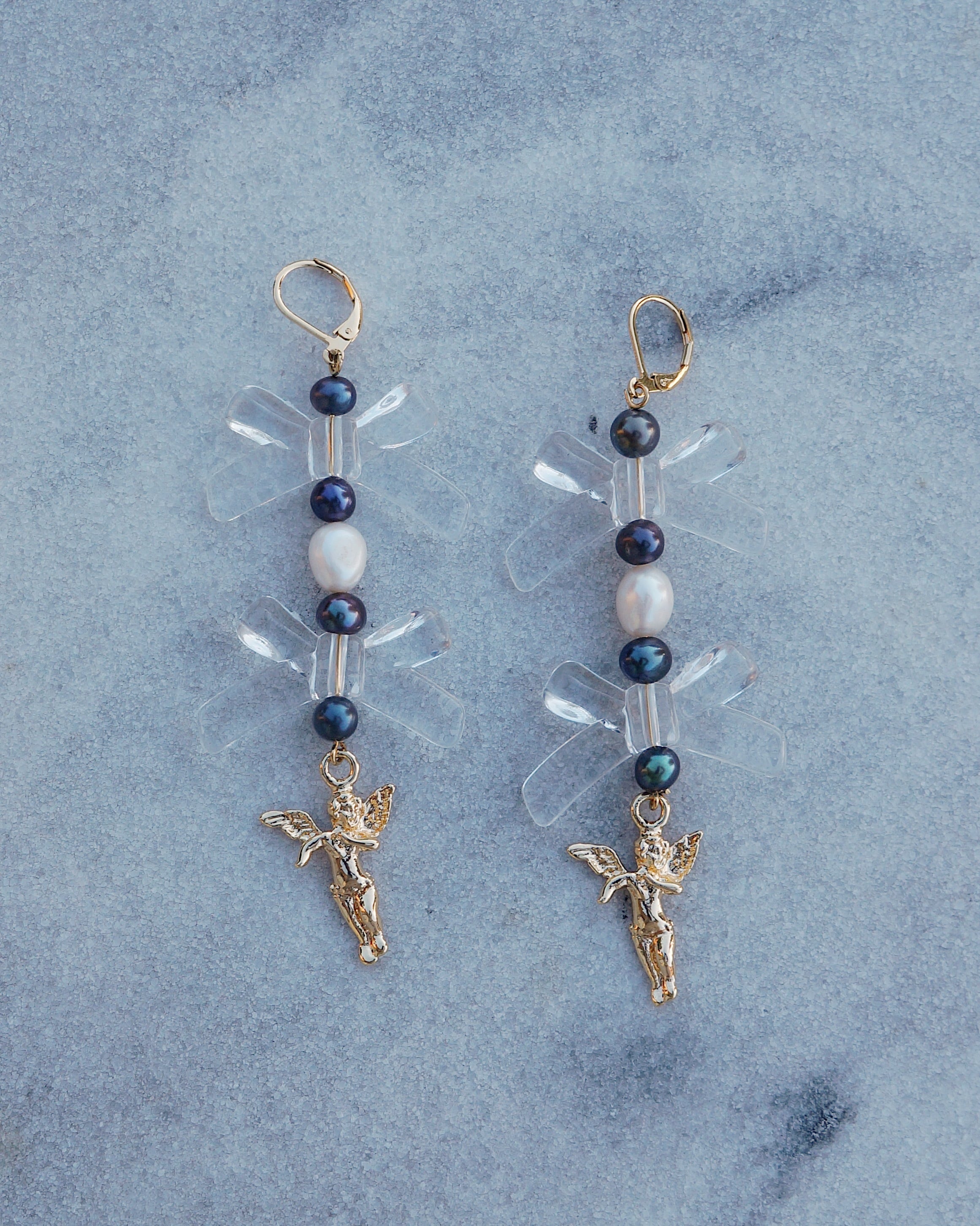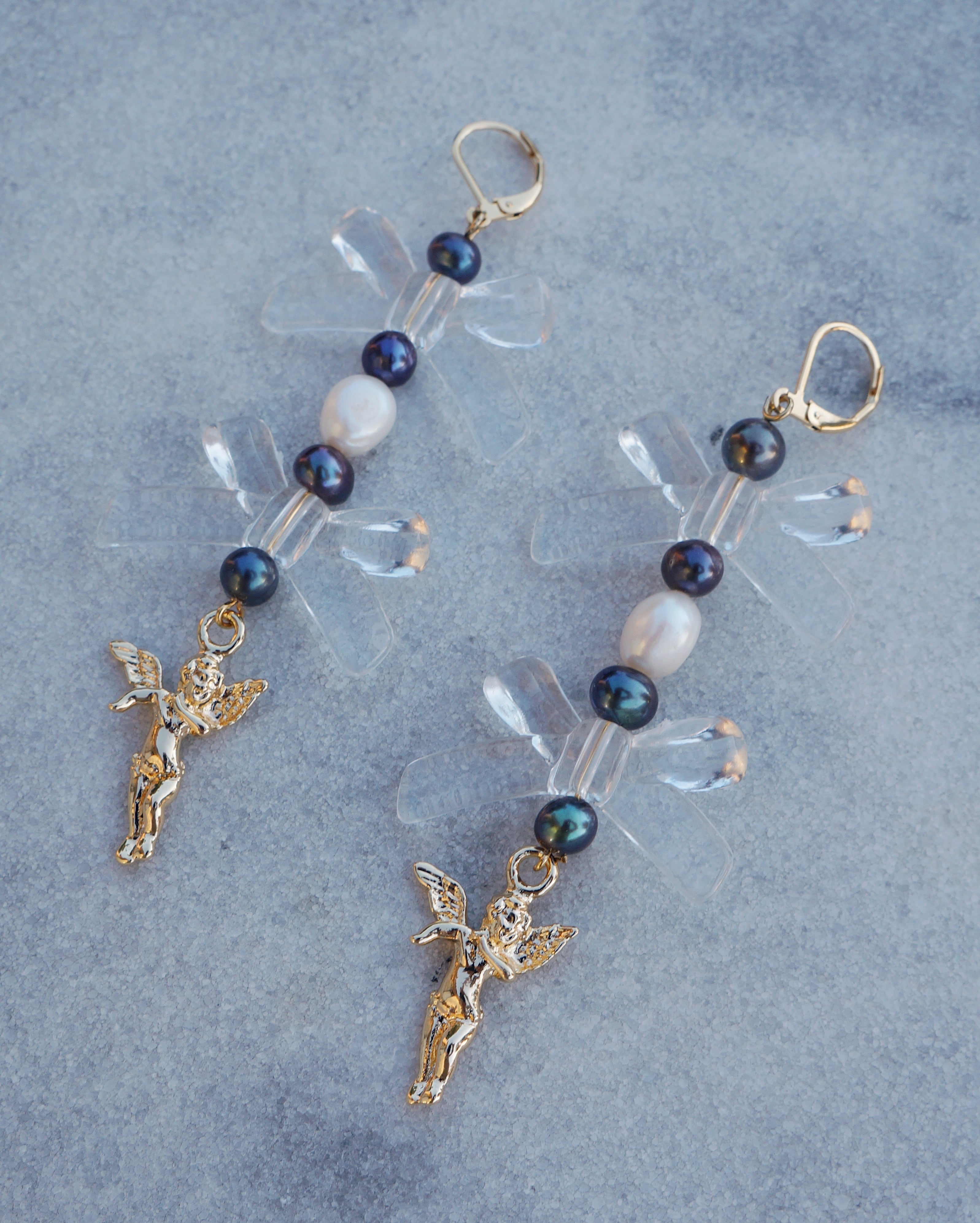 淡水パールとリボンのモチーフのビーズ、そして天使のチャームがキュートなピアスです。大ぶりでコーディネートを華やかにしてくれるような一点です。25312のネックレスと一緒にはめるのもおすすめです。
