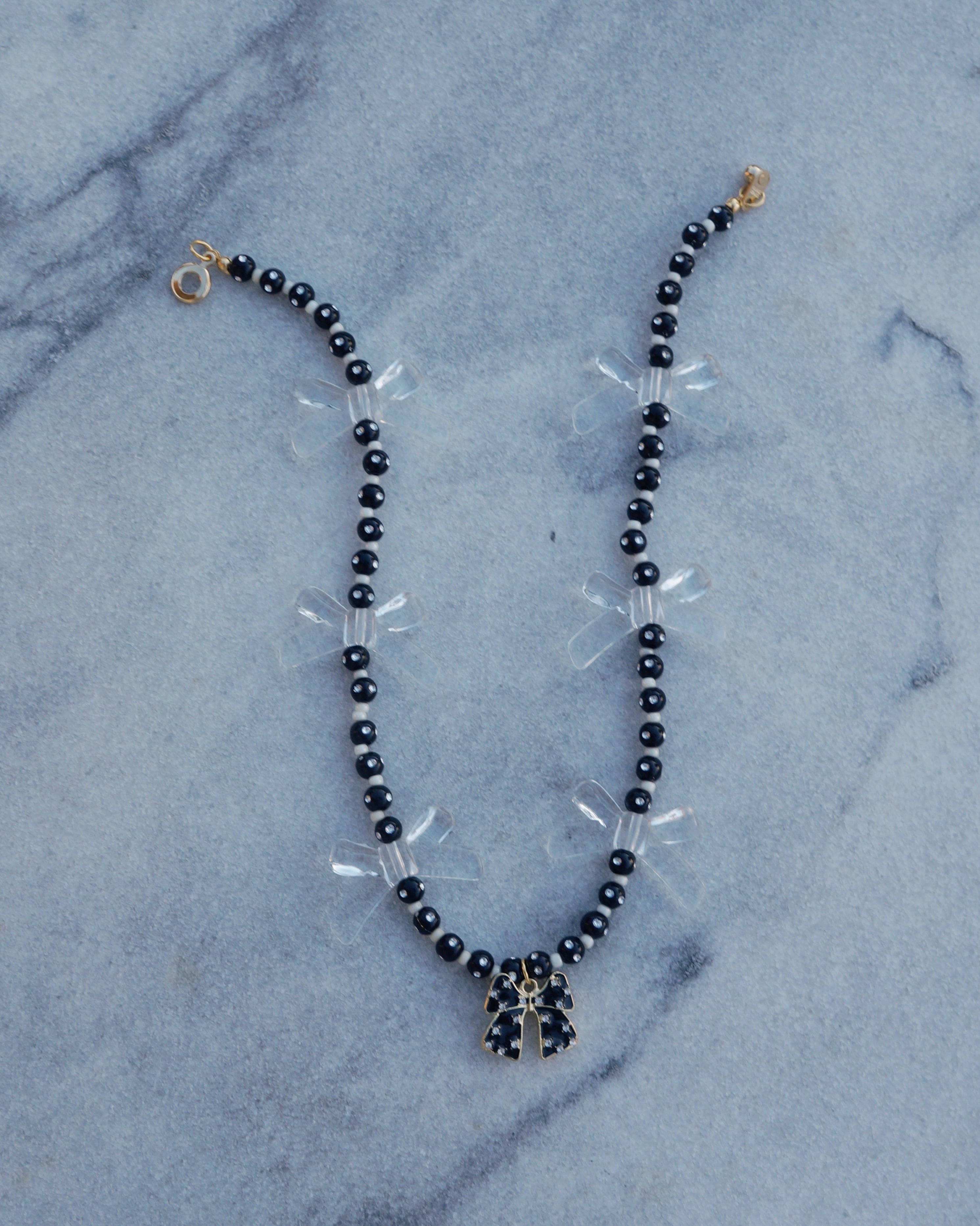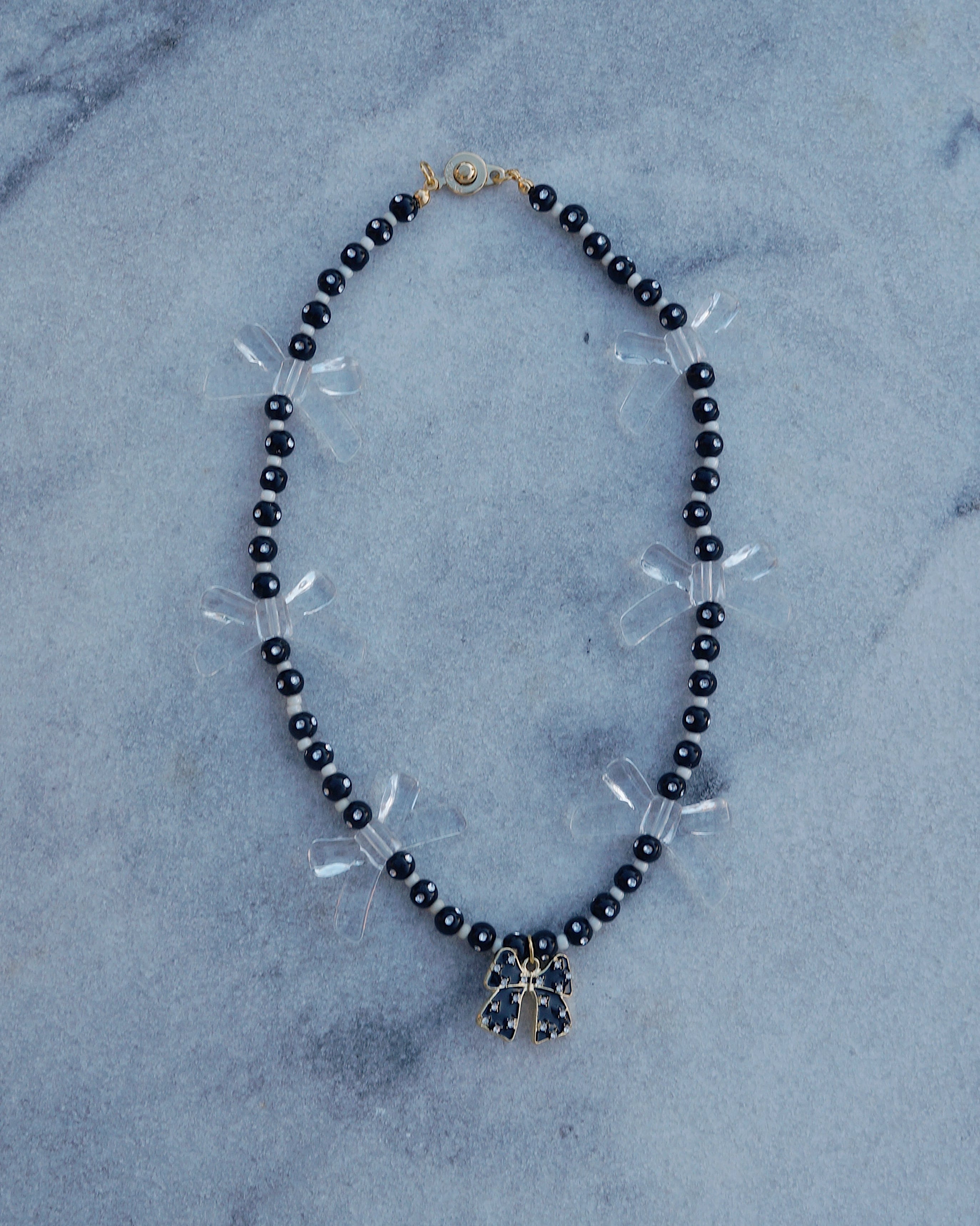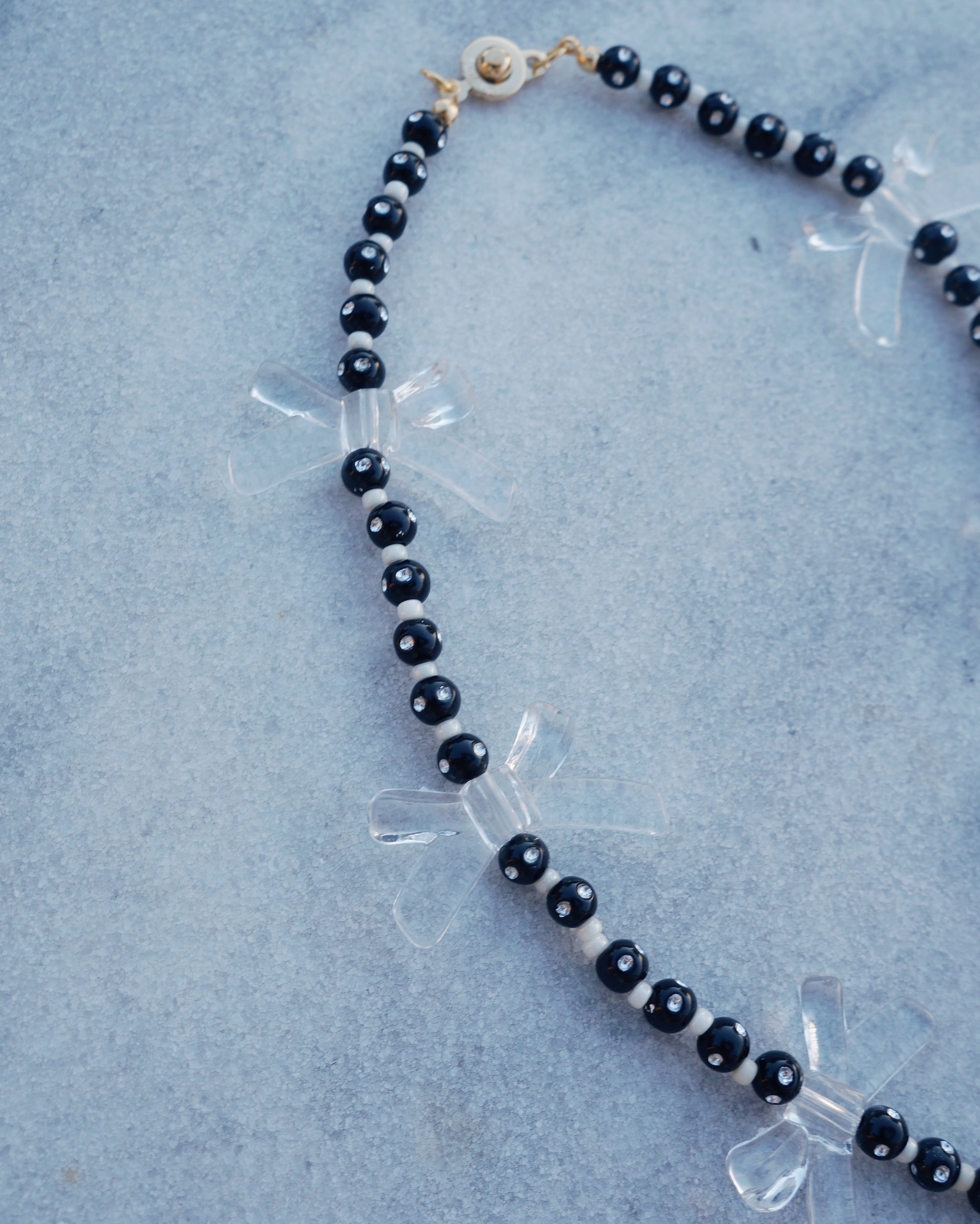 キラキラ光るビーズ、大ぶりのリボンのビーズ、キラキラのストーンが入ったリボンのチャームの全てが見ているだけでキュンとしてしまうような可愛らしいネックレスです。デザインはキュートですが色味が落ち着いているので少し可愛らしいアイテムに挑戦してみたい人にもおすすめな一点です。25311のピアスと一緒にはめるのもおすすめです。