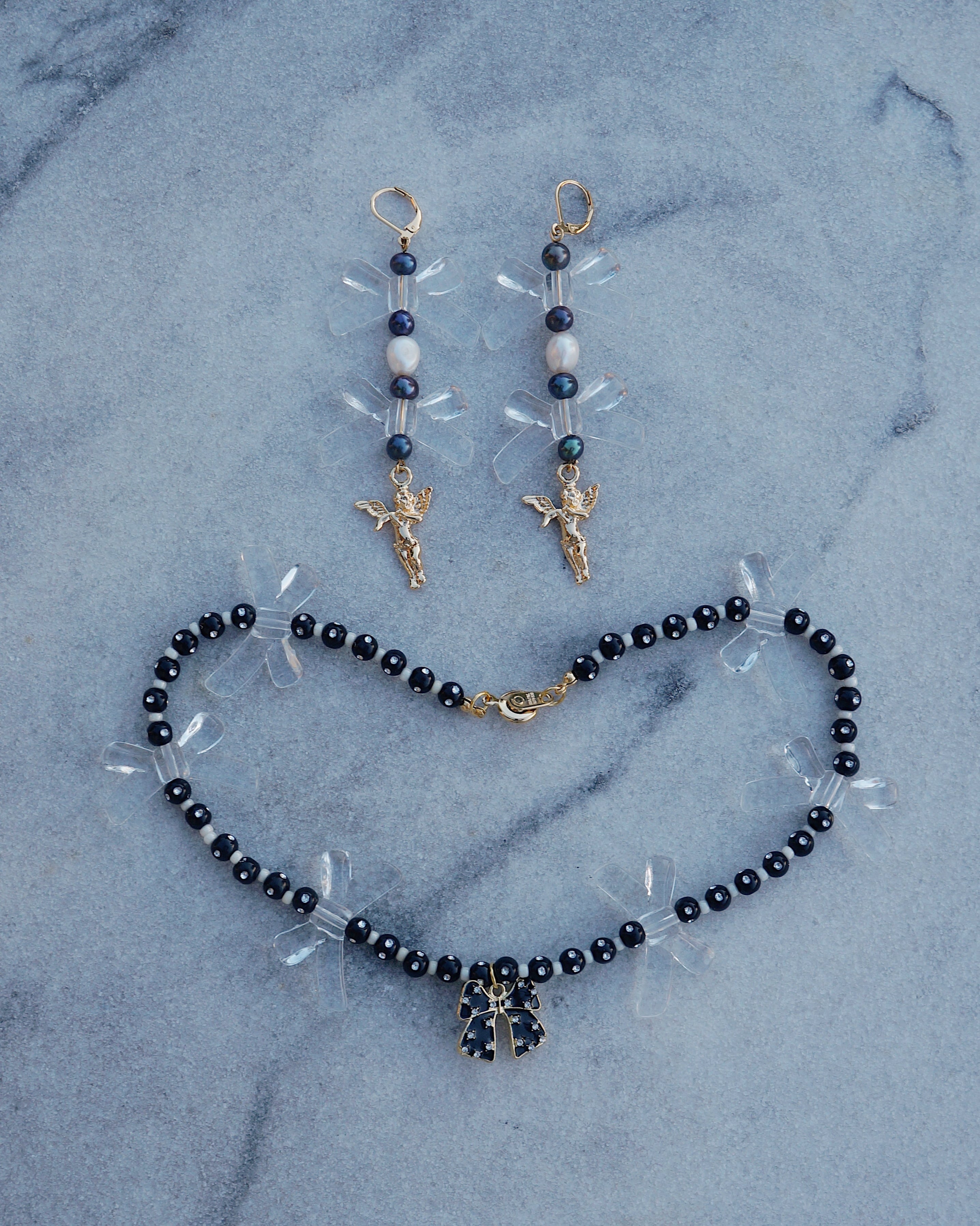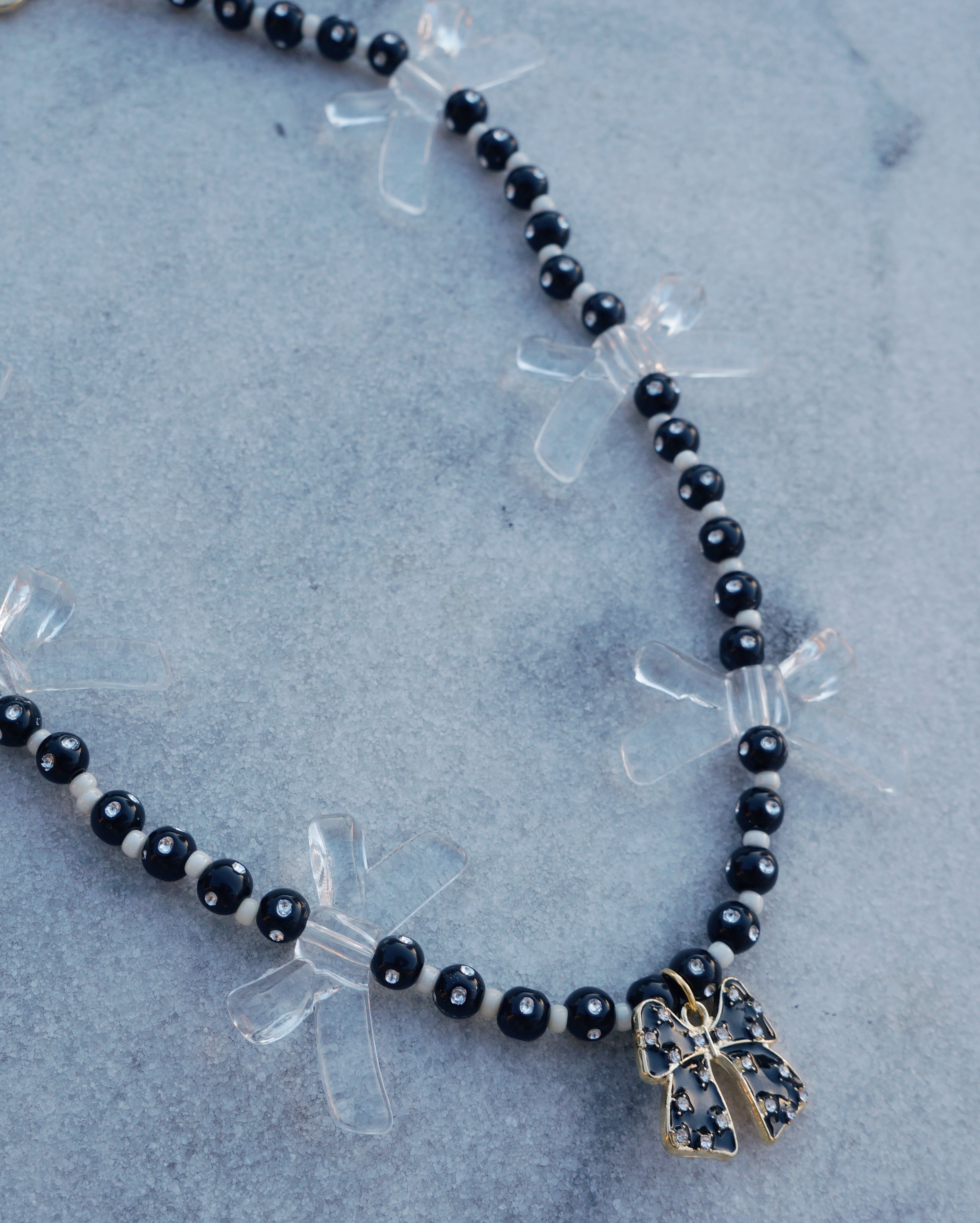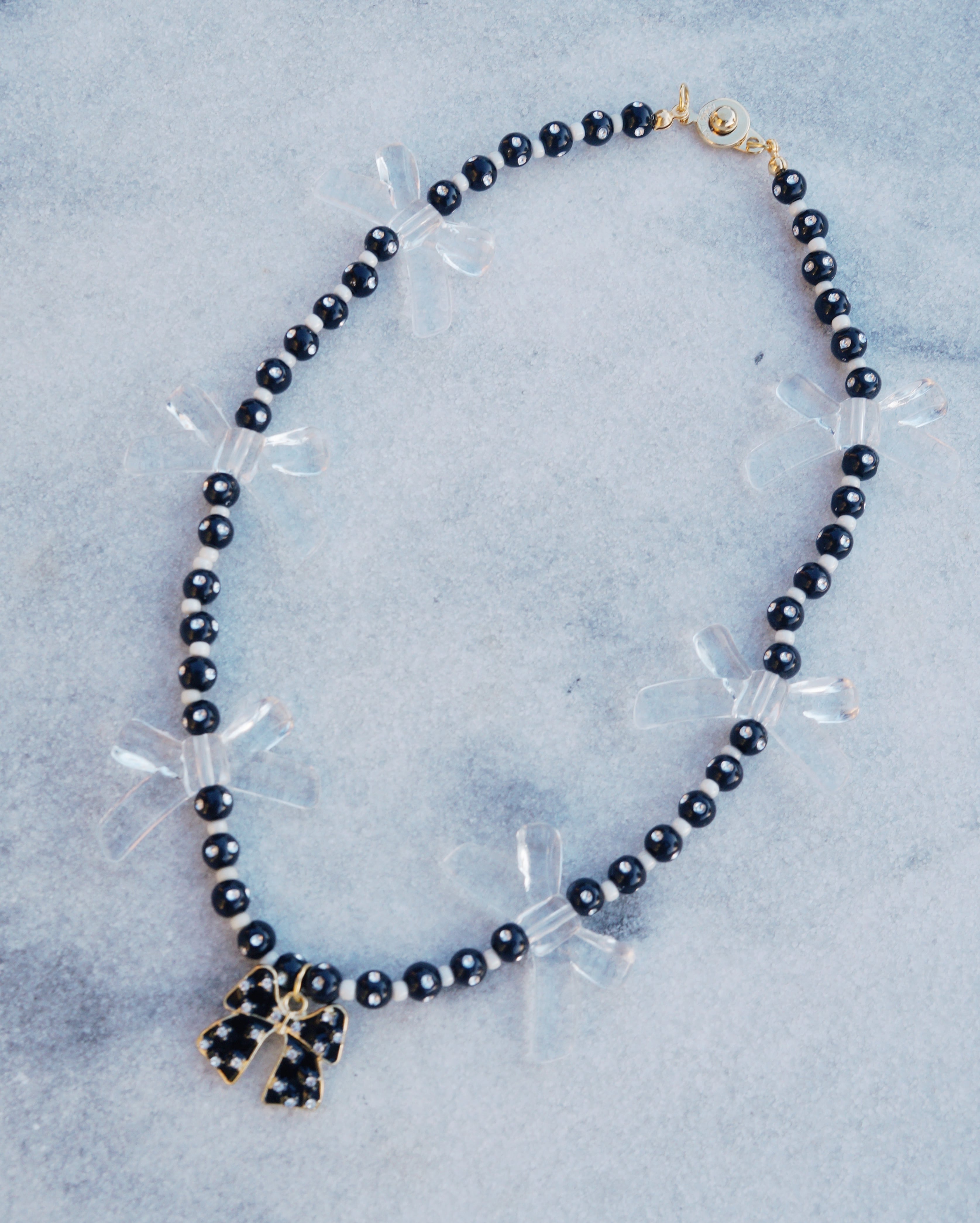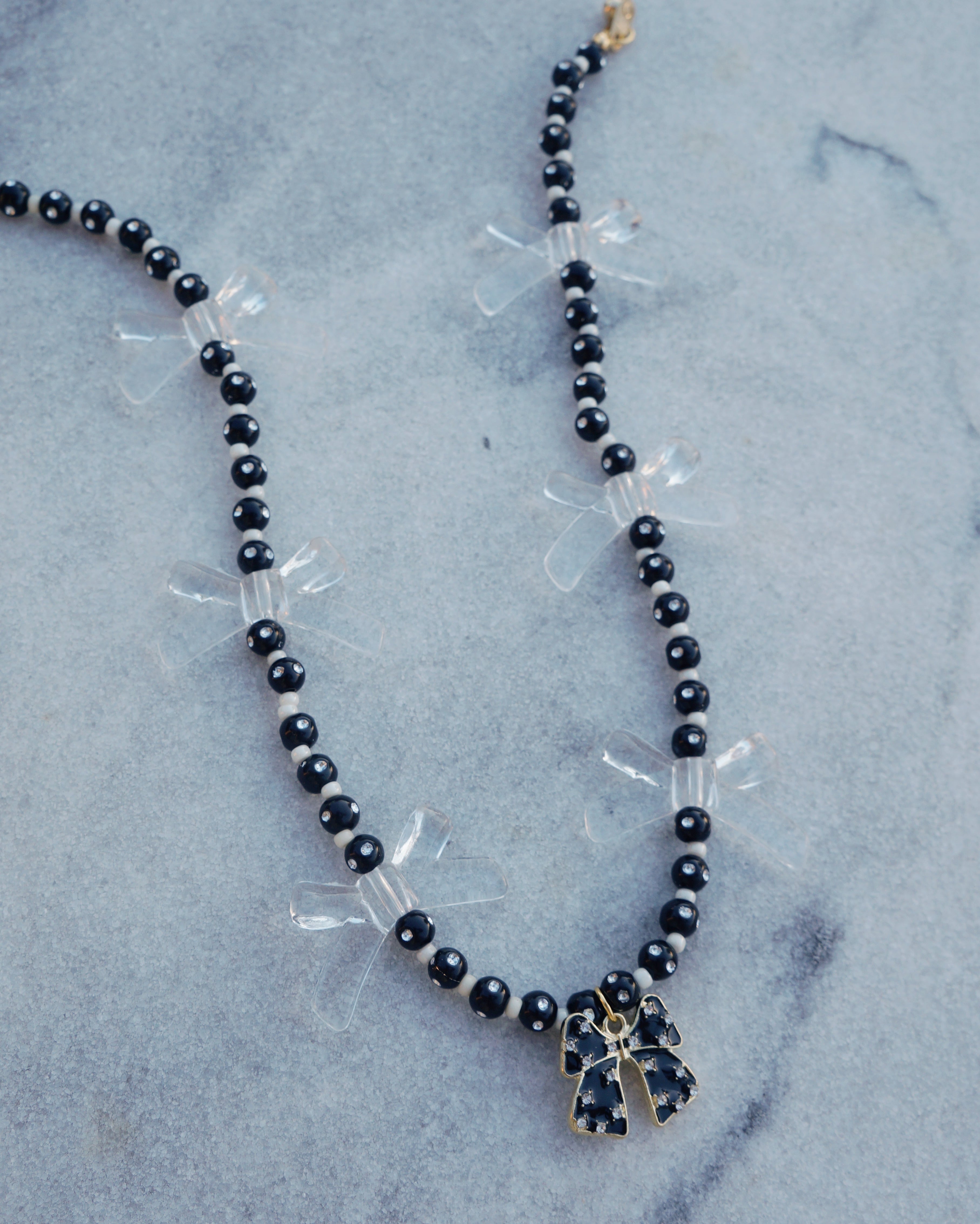 キラキラ光るビーズ、大ぶりのリボンのビーズ、キラキラのストーンが入ったリボンのチャームの全てが見ているだけでキュンとしてしまうような可愛らしいネックレスです。デザインはキュートですが色味が落ち着いているので少し可愛らしいアイテムに挑戦してみたい人にもおすすめな一点です。25311のピアスと一緒にはめるのもおすすめです。
