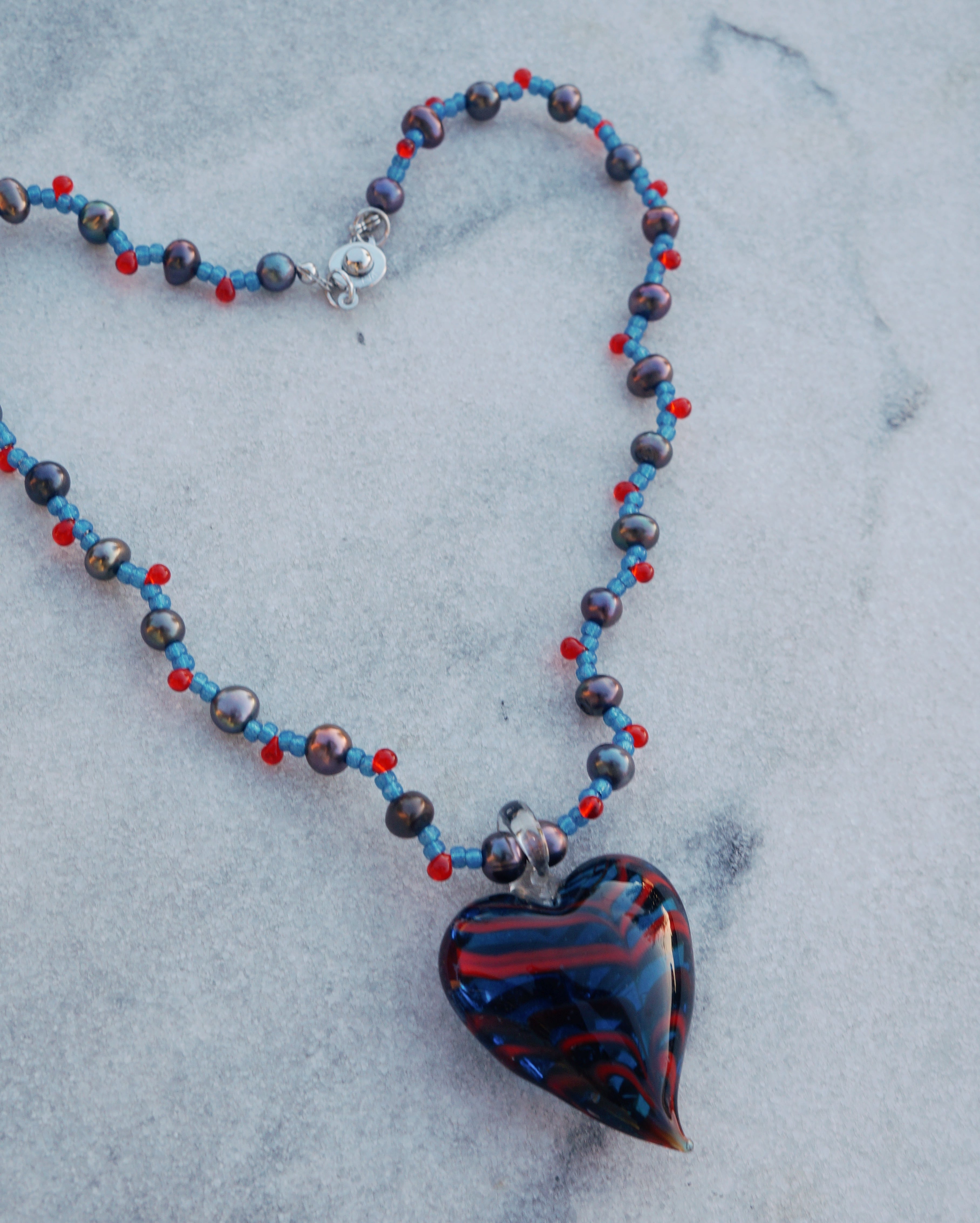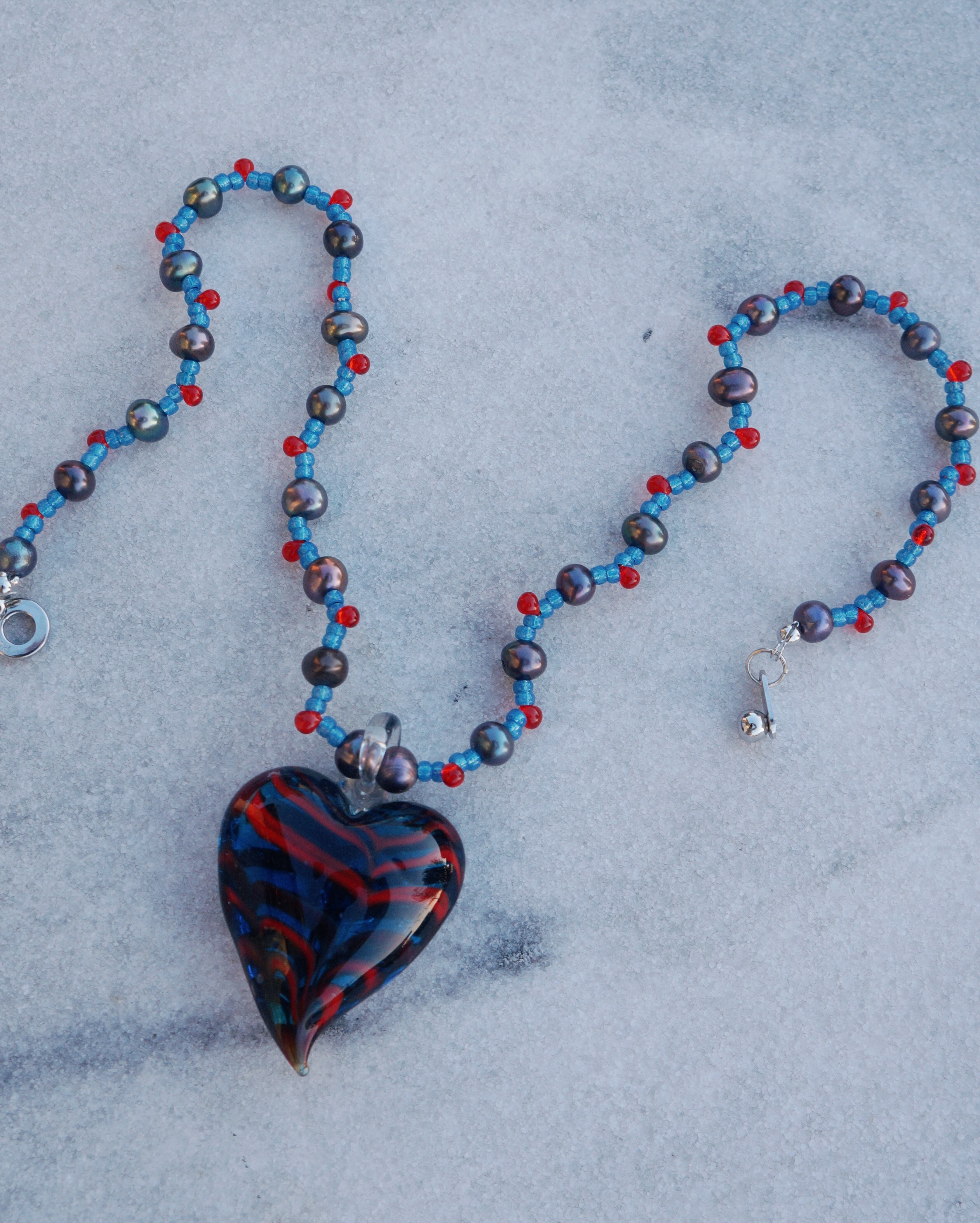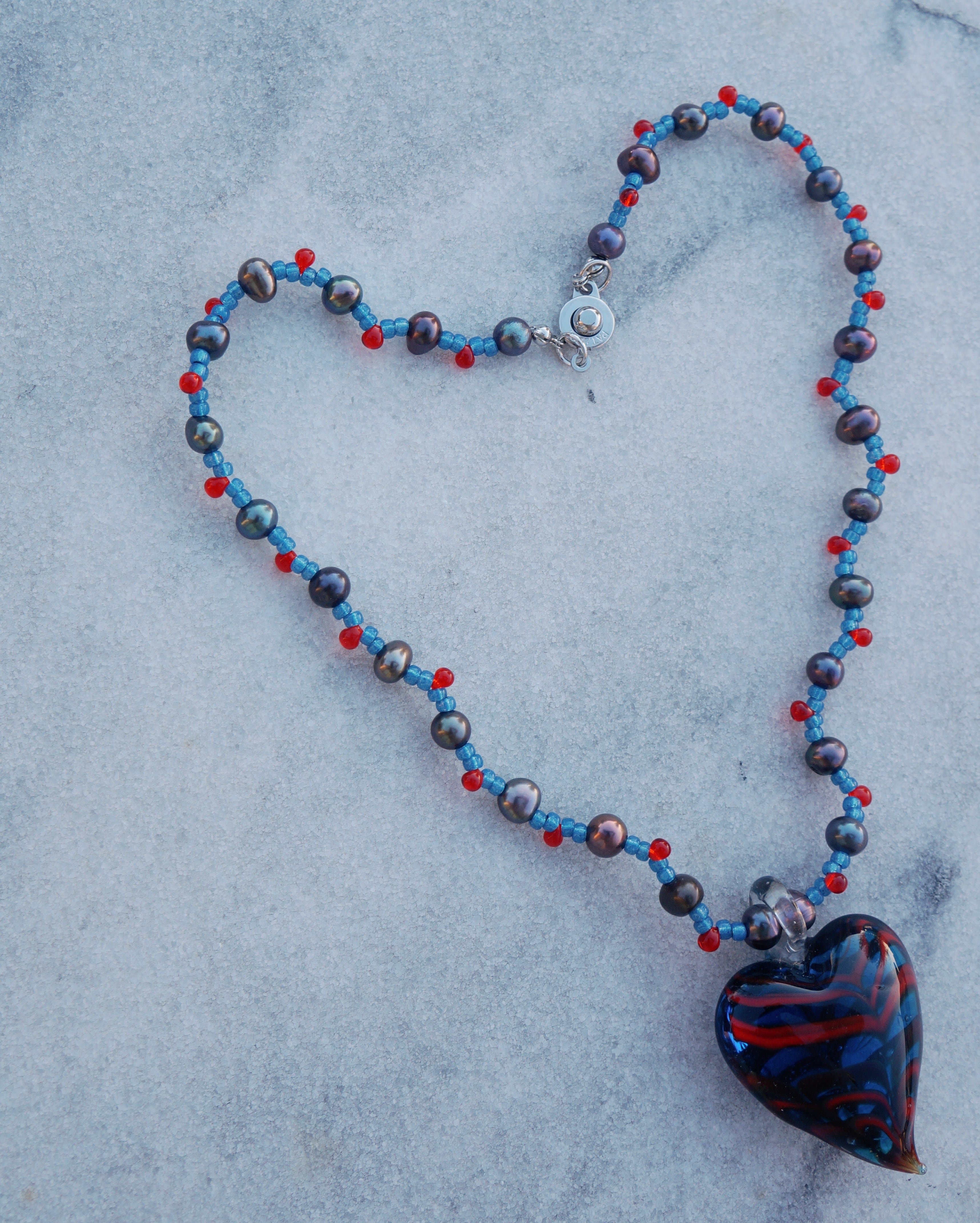 大ぶりなガラスのハートのチャームに合わせ、淡水パールと、赤と青のビーズを使いキュートなカラーコンビネーションのネックレスに仕上げました。存在感もあり美しい一点です。