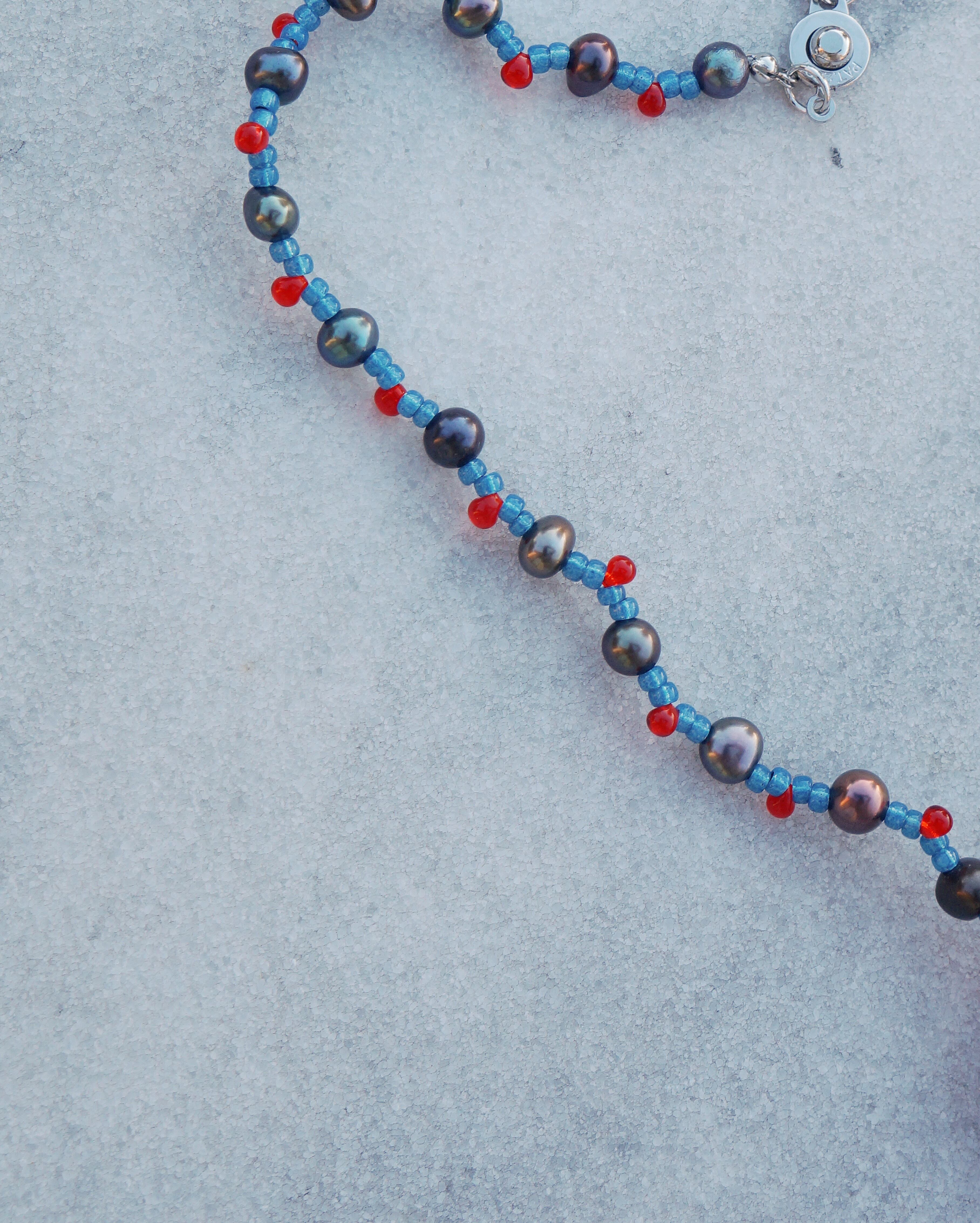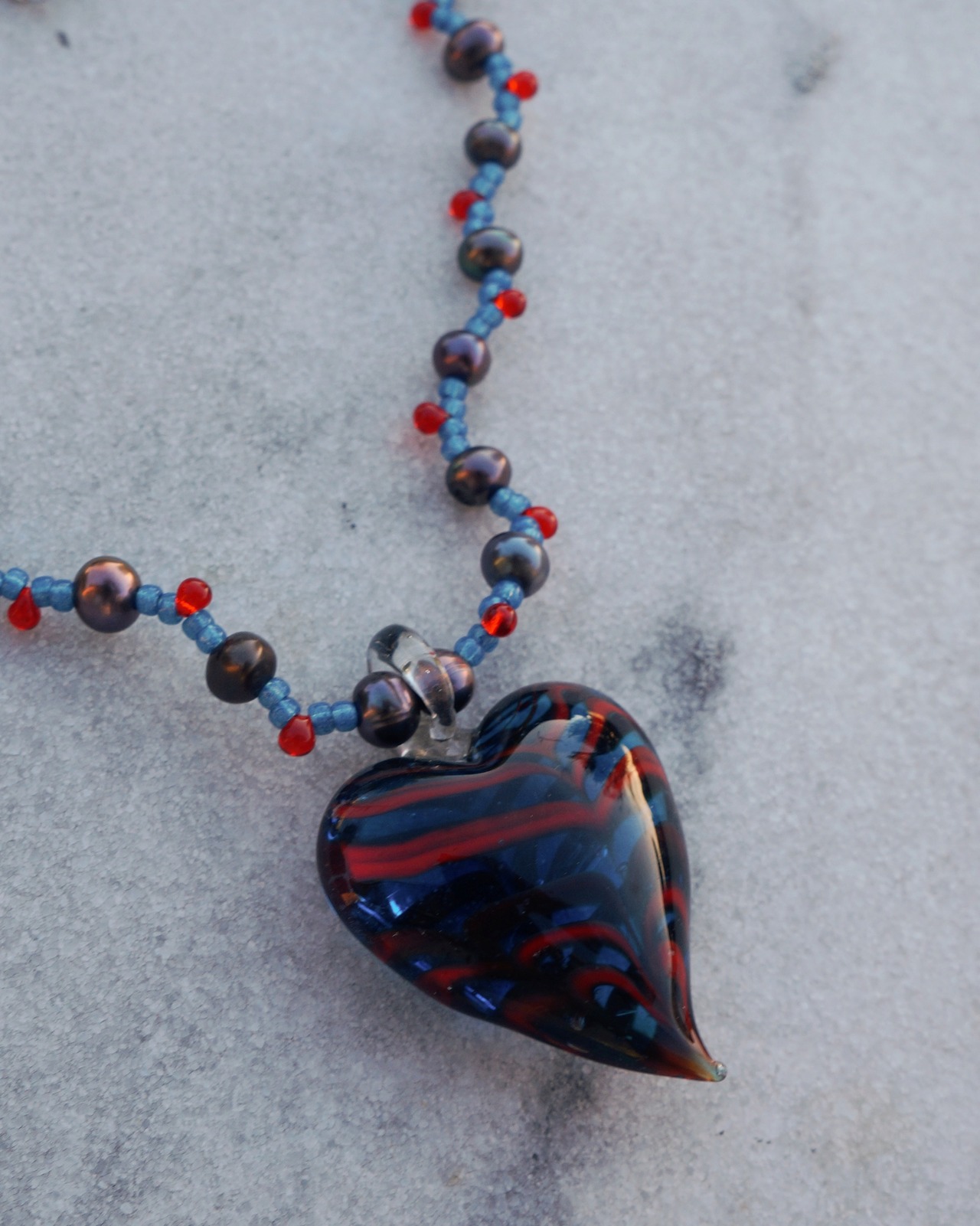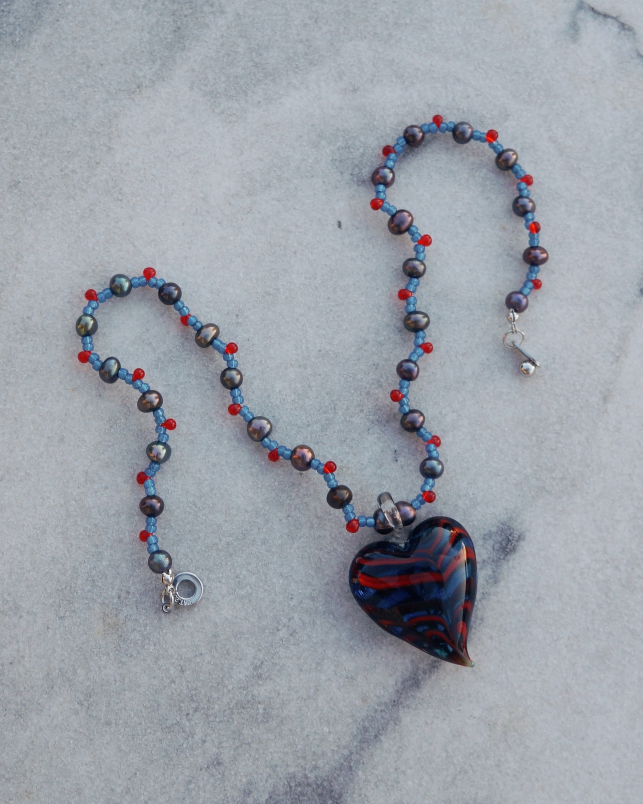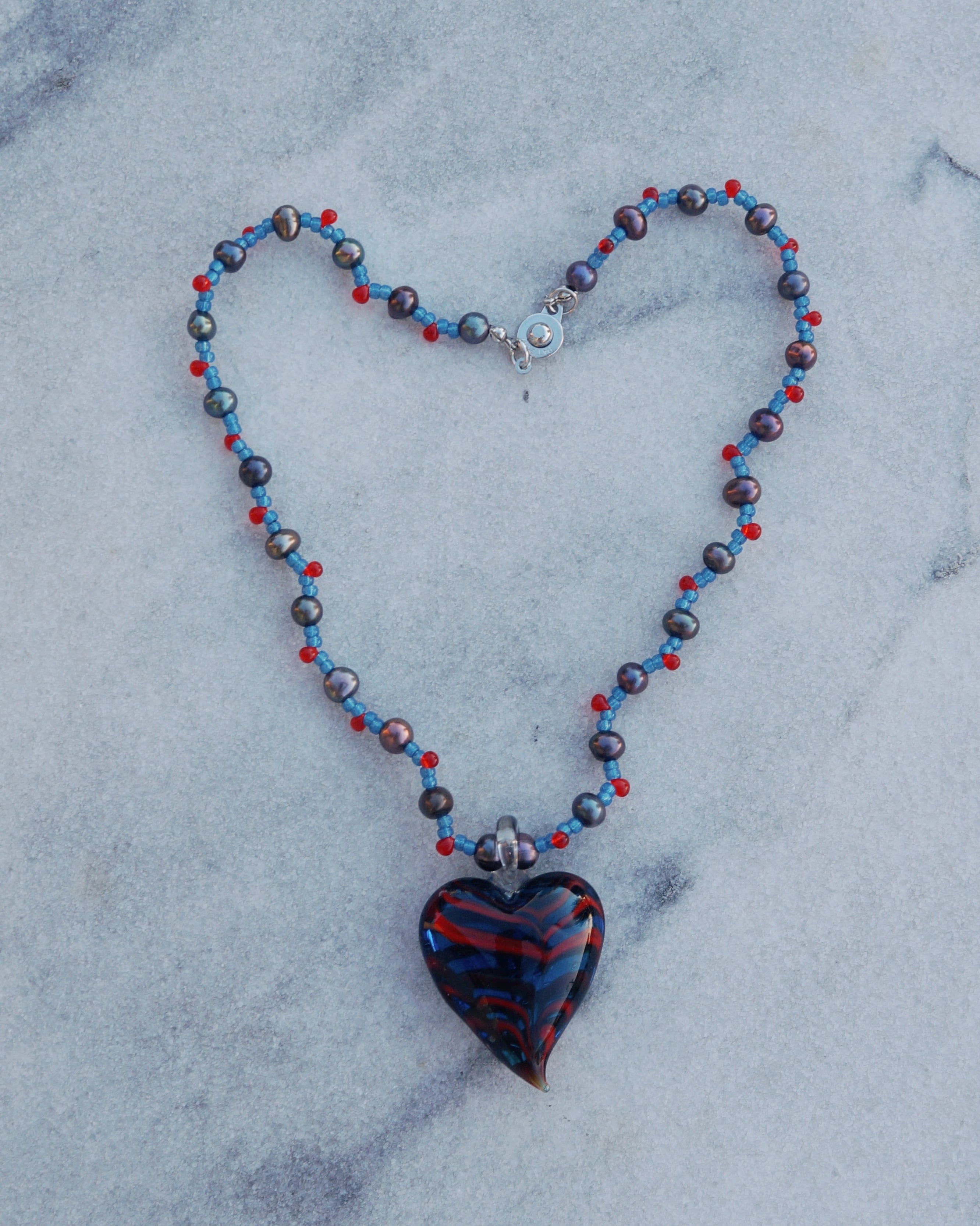大ぶりなガラスのハートのチャームに合わせ、淡水パールと、赤と青のビーズを使いキュートなカラーコンビネーションのネックレスに仕上げました。存在感もあり美しい一点です。