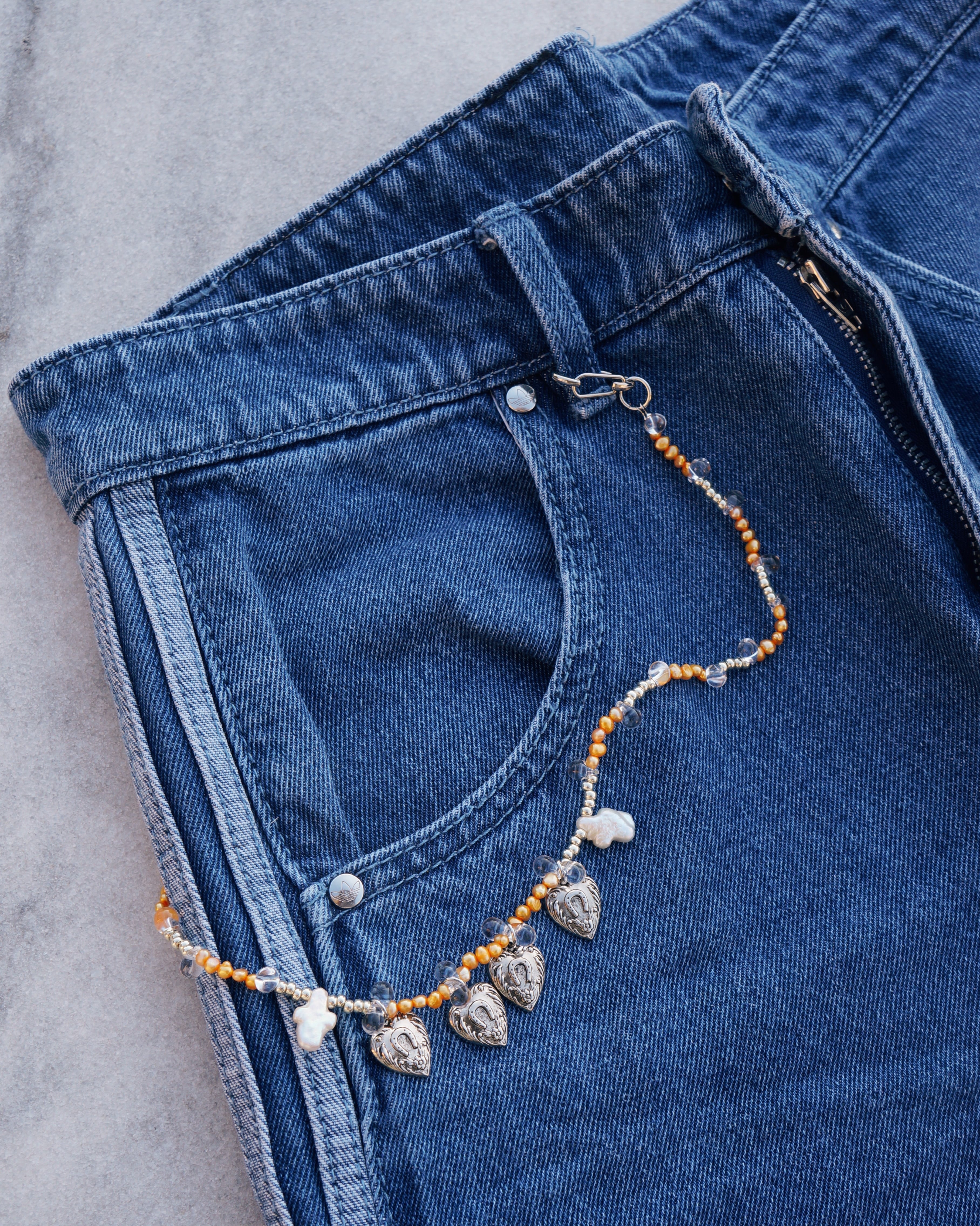 ネックレスとしてはもちろん、パンツチェーンとしてやバックにチャームとしてつけたりしても楽しんでもらえる一点です。デニムとの相性が抜群で、パンツチェーンとしてつけるだけでコーディネートに一気にこなれ感がでます。黄色の淡水パールと珍しい十字架のシェープの淡水パールを使っています。ジャラジャラ感が可愛いハートのチャームには”幸運を受け止める器”と言われているホースシュー(馬蹄)が描かれています。