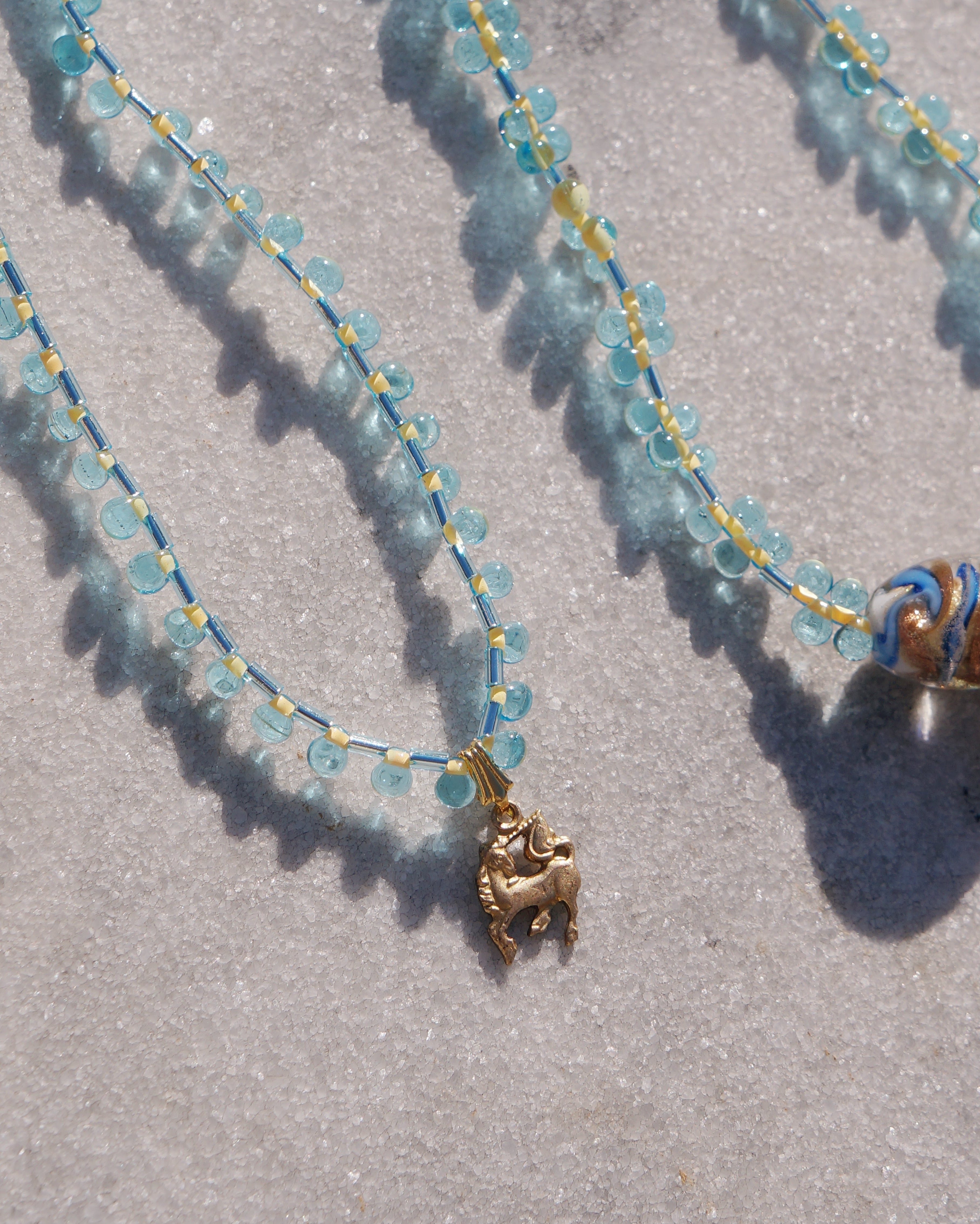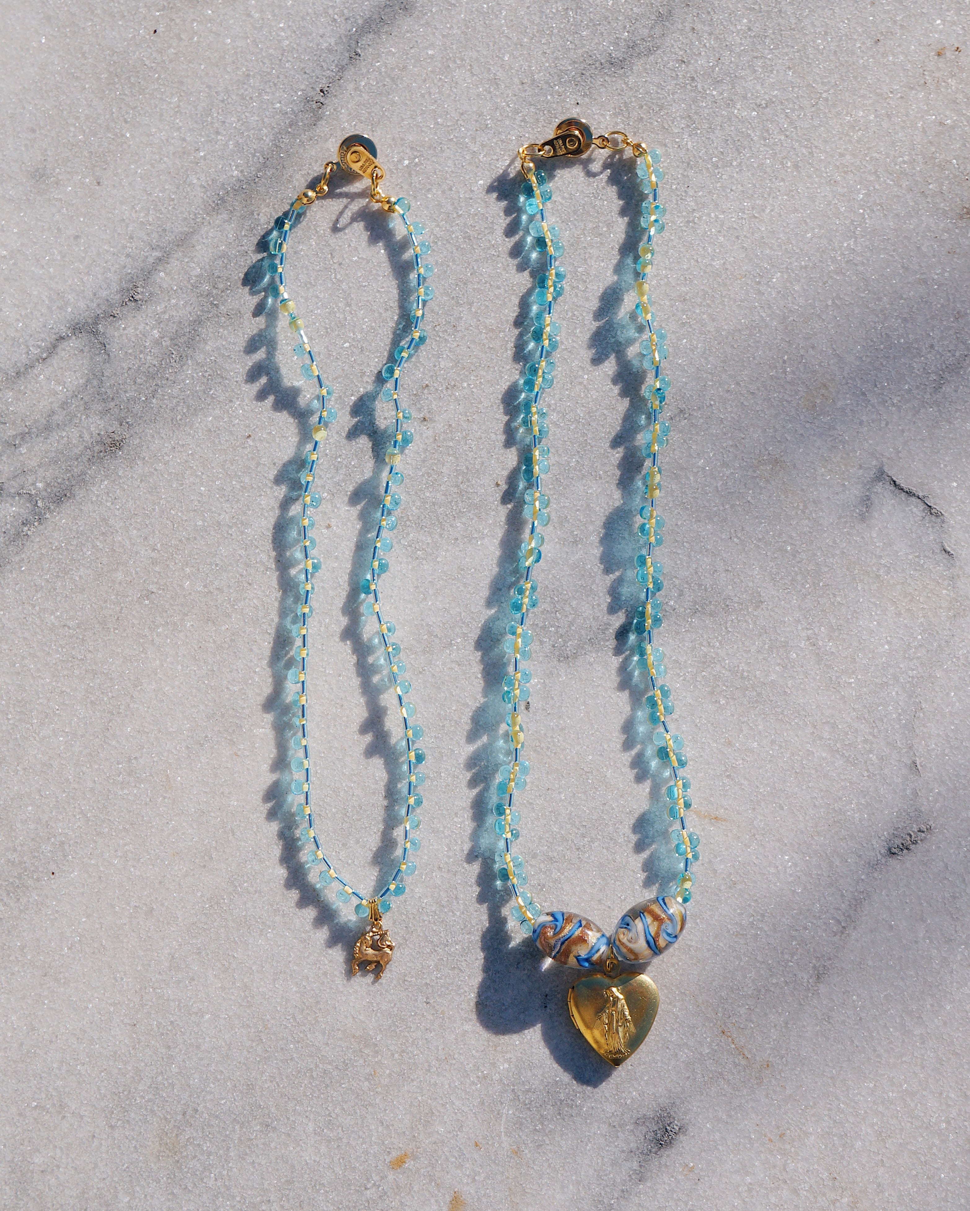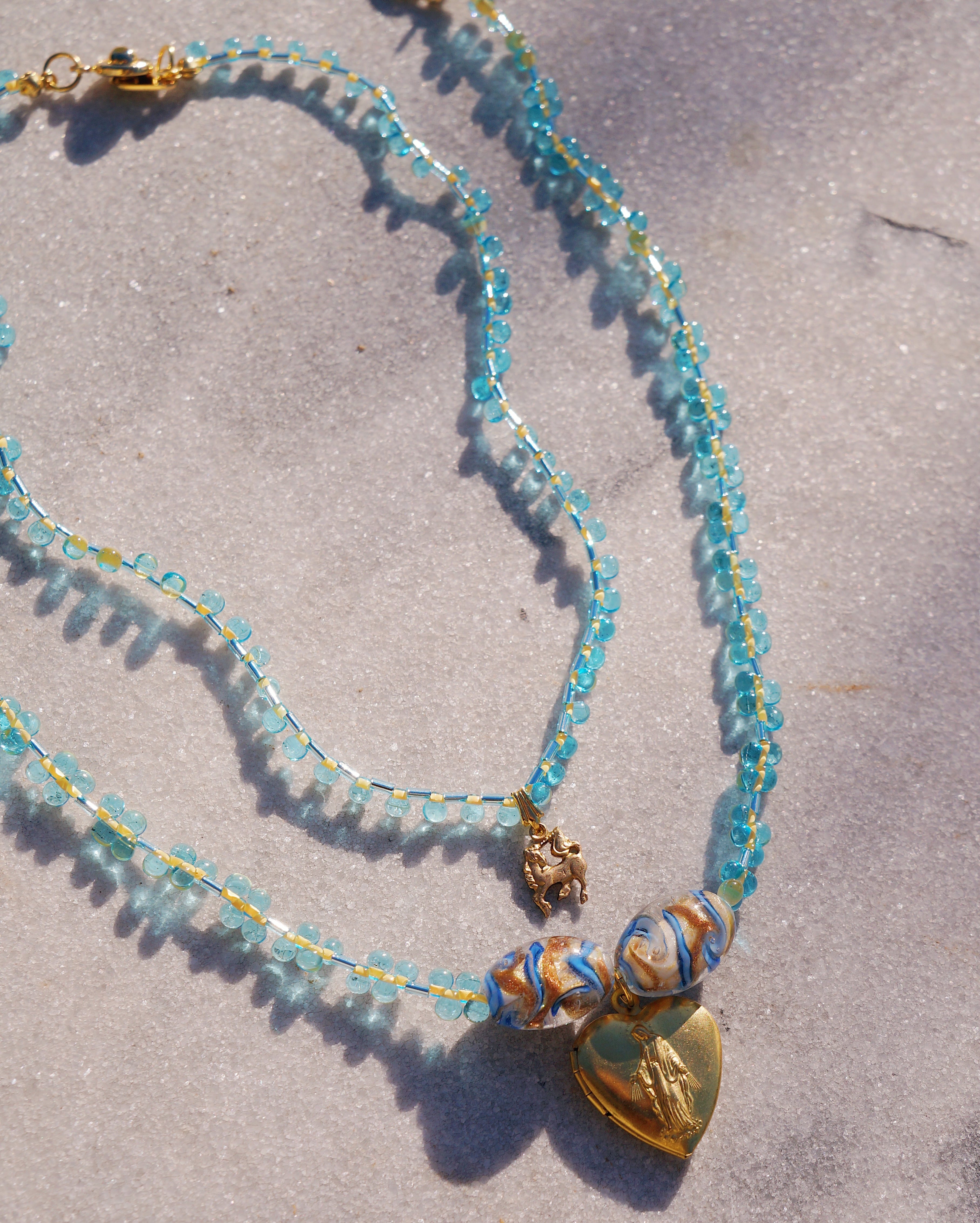 2連セットのネックレスです。つぶつぶした感じが可愛いドロップビーズを使い、色味はどのようなスタイルにも合わせやすい淡い水色をメインにしました。チャームにはビンテージの馬のチャームと、マリア様が描かれたロケットになっているハートチャームを使っています。長めのネックレスの方には真ん中に美しいガラスビーズを持ってきて少し華やかさも出しました。※短い方のネックレスがちょうど鎖骨あたりにくる長さにデザインしてあります。