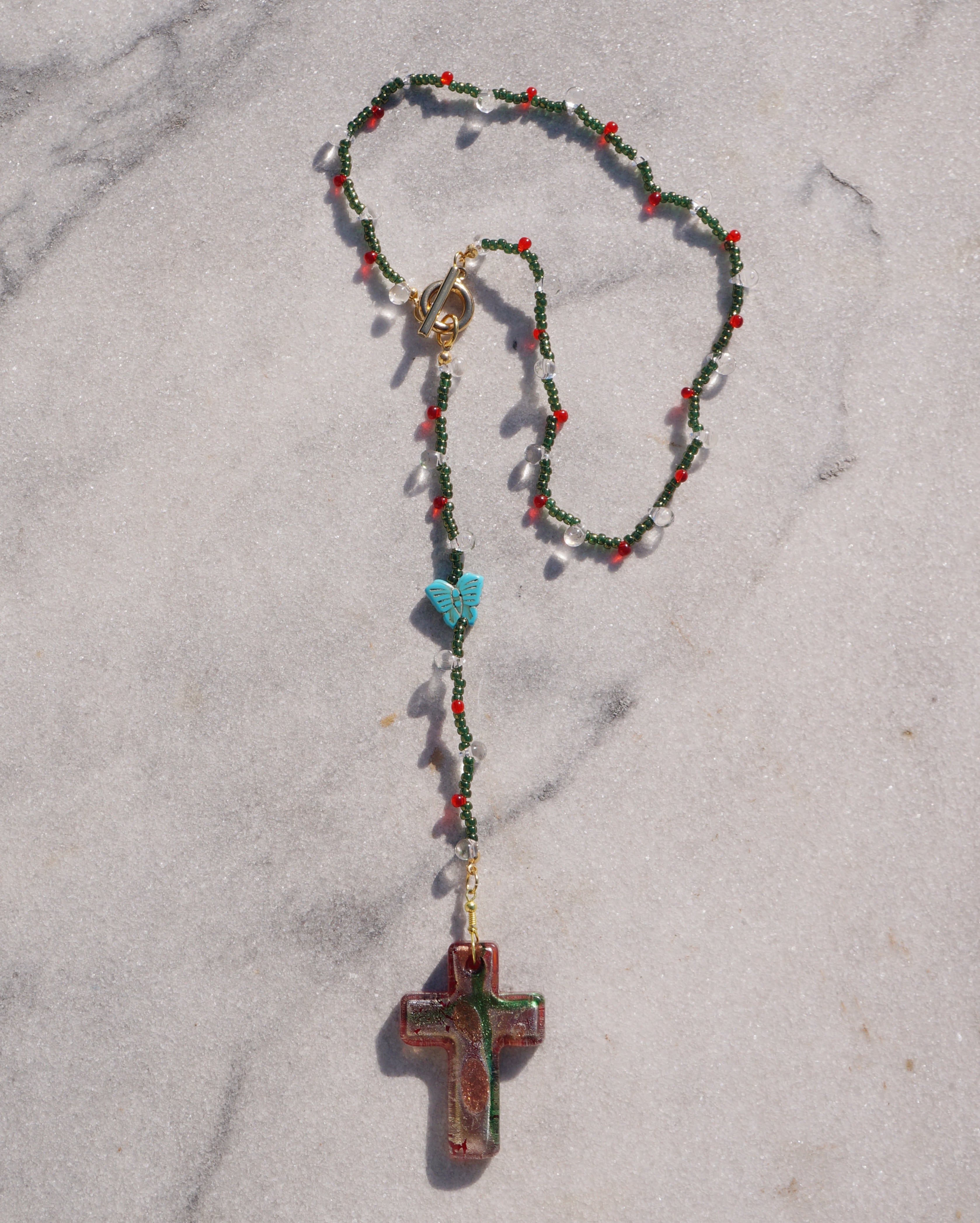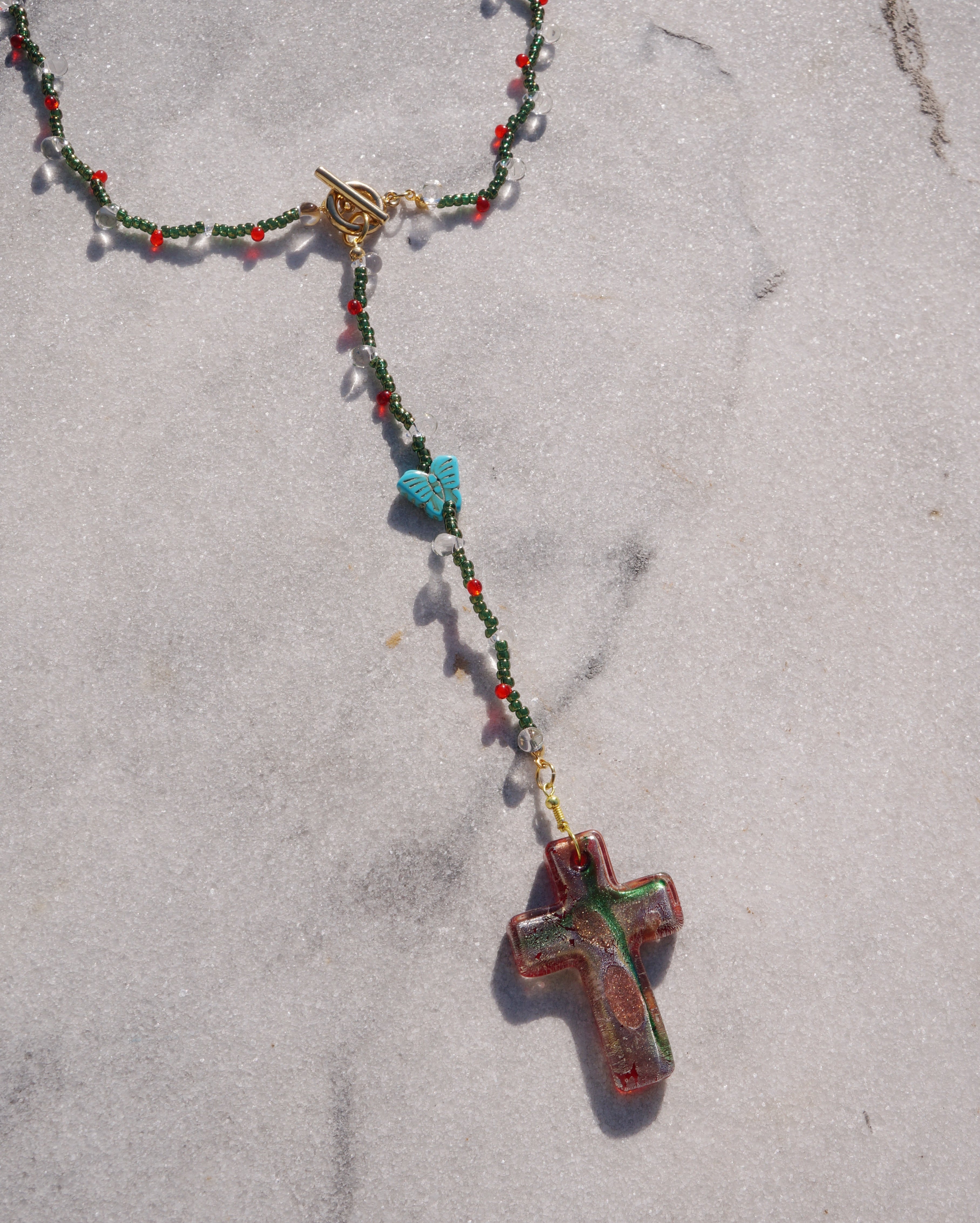 ロザリオ風のデザインのネックレスです。グリーンとレッドのカラーコンビネーション、クリアカラーのドロップビーズ、さりげない蝶のビーズ、そして大ぶりなガラスの十字架のチャームがとっても美しいネックレスです。前に垂らさず、背中に垂れ下げてつけるのもおすすめです。