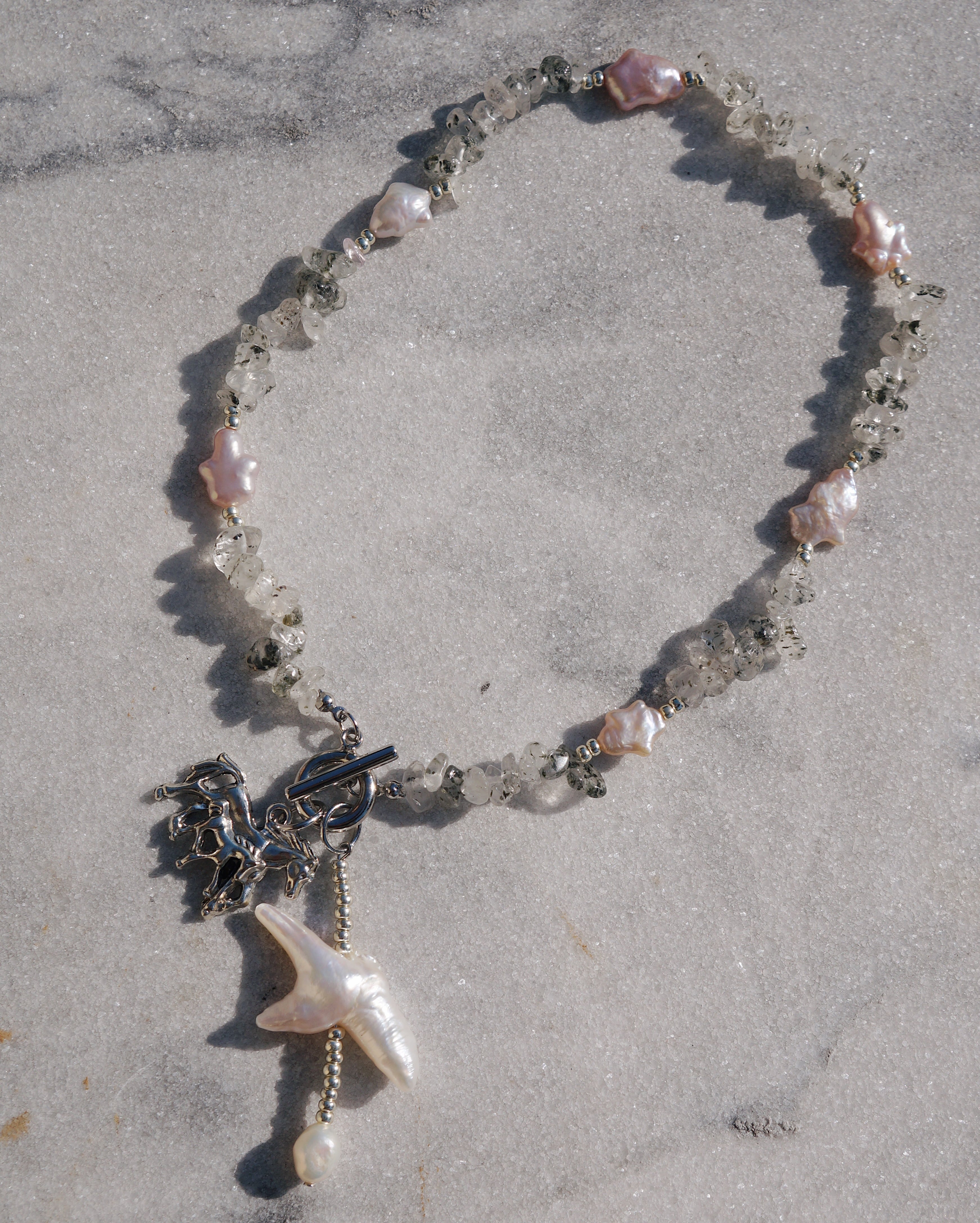 マンテルについているチャームを前に垂らしても,背中に垂らしても使える2WAYのネックレスになっています。天然石のブラックベリークウォーツと希少な星のシェープの淡水パールのビーズ、淡水パールの十字架を垂れ下がっているデザインにしたチャーム、親子の馬のチャームをつけた美しくスタイリッシュな一点です。