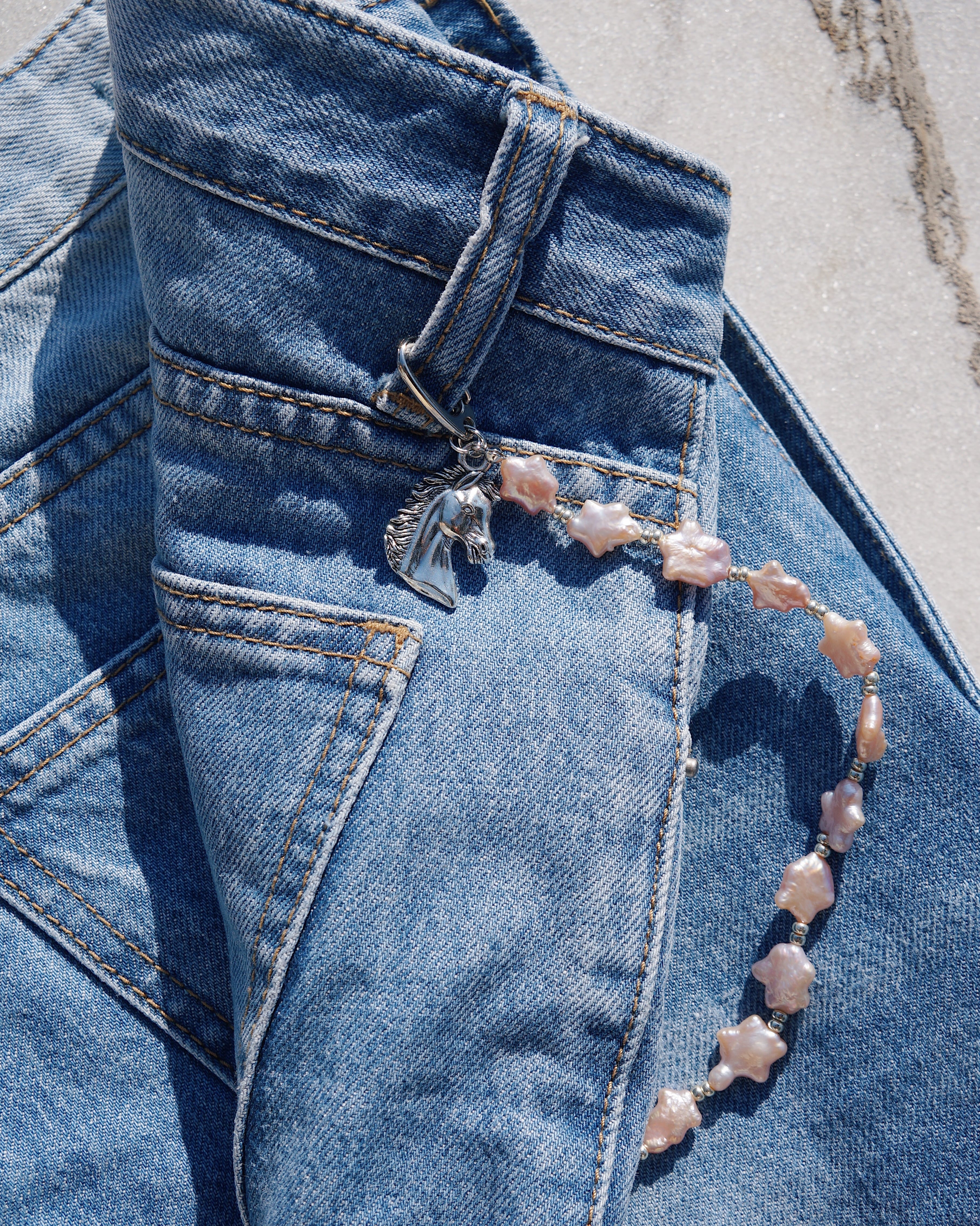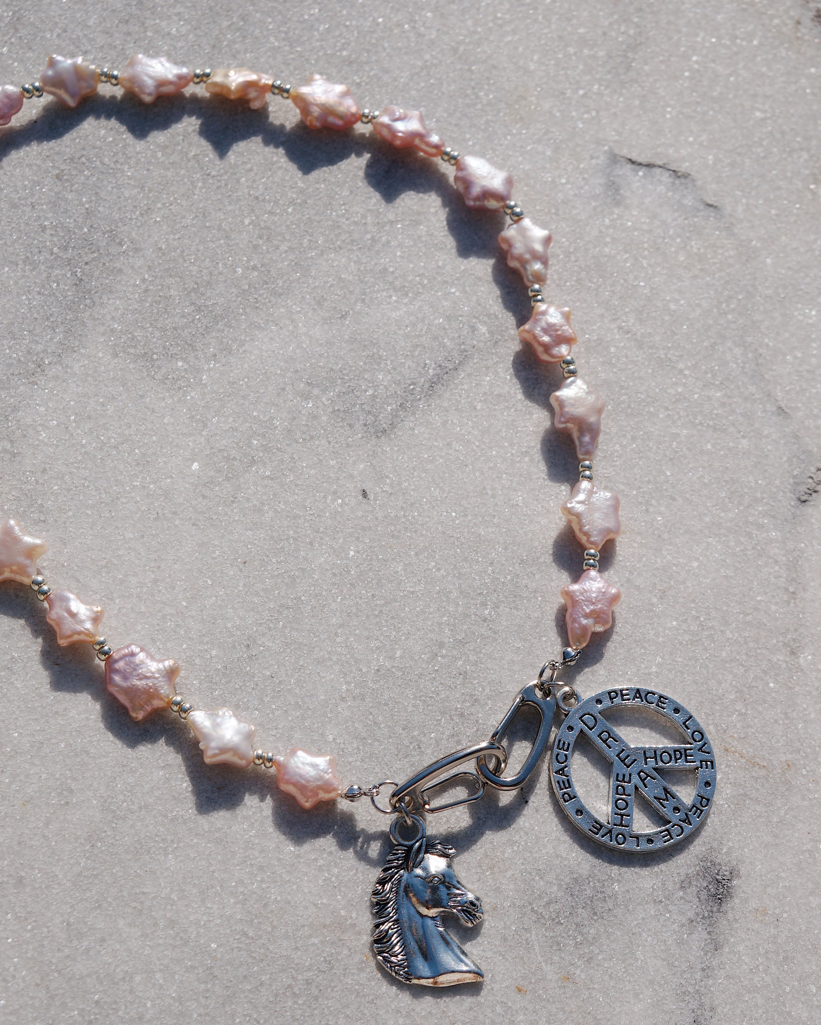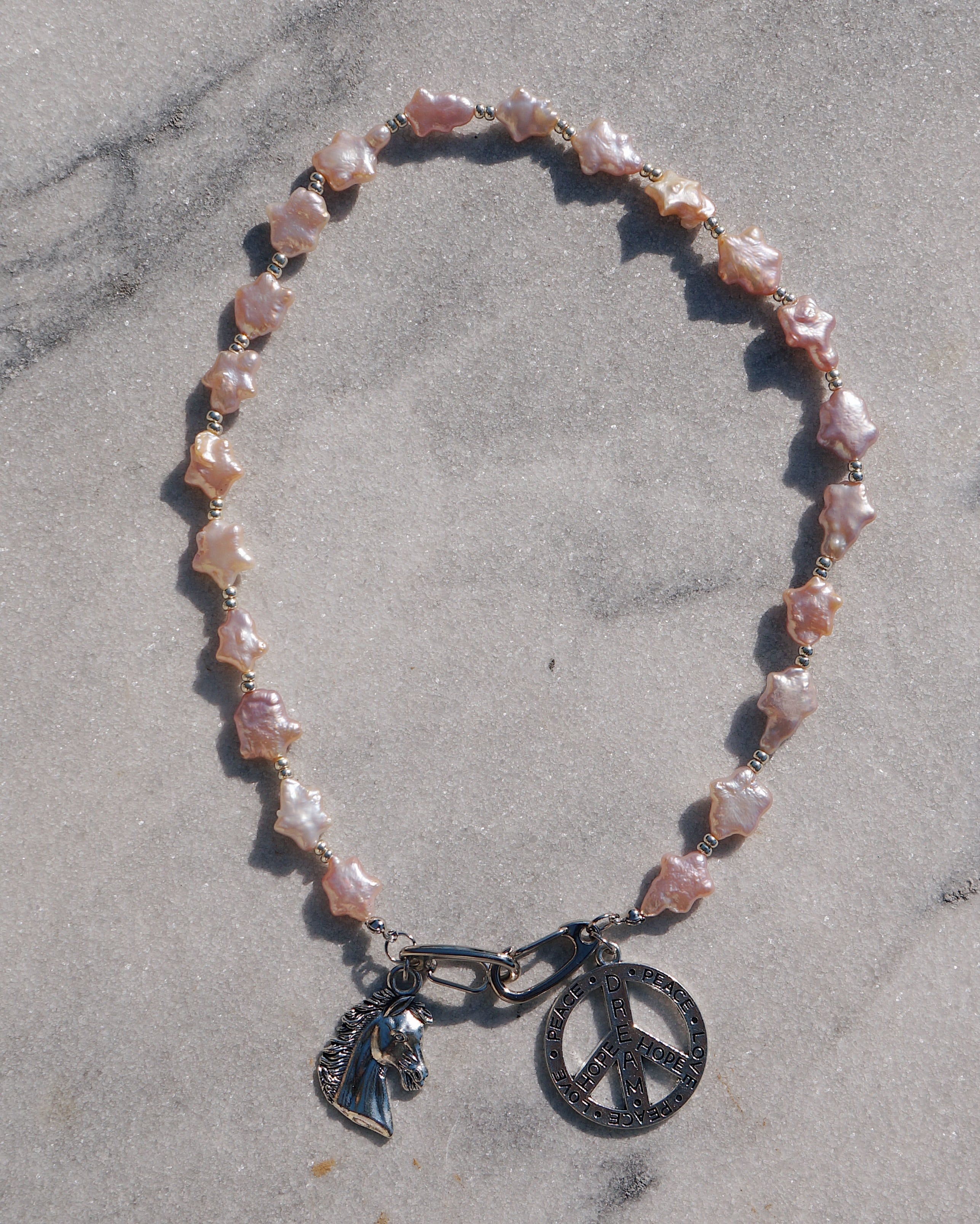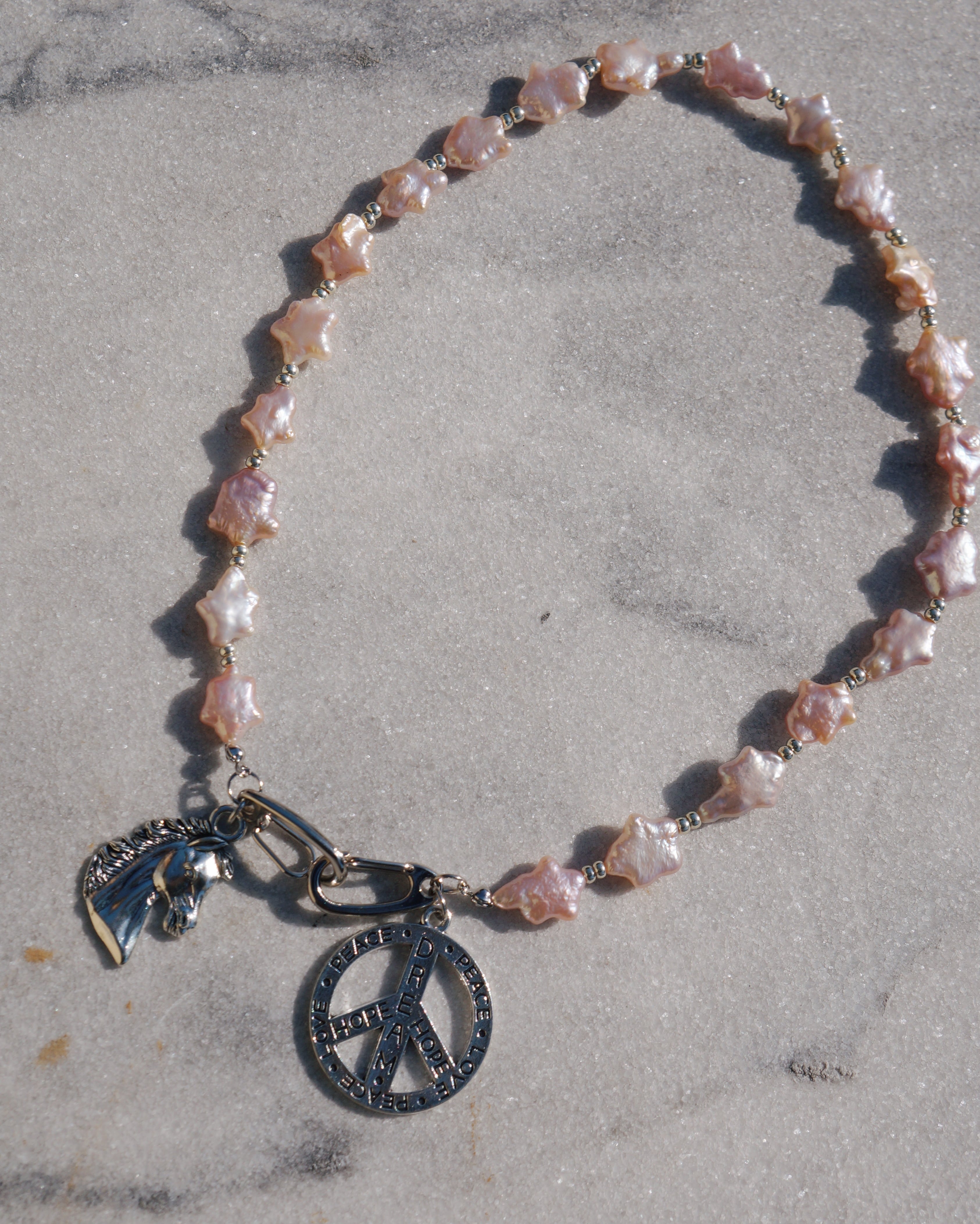 ネックレスとしてはもちろん、パンツチェーンとしてやバックにチャームとしてつけたりしても楽しんでもらえる一点です。デニムとの相性が抜群で、パンツチェーンとしてつけるだけでコーディネートに一気にこなれ感がでます。希少な星のシェープの淡水パールでまとめた見ているだけでキュンとするような美しい一点です。そしてPEACE,LOVE,DREAM,HOPEなどのワードが刻まれた大ぶりのピースマークのチャームと、馬の顔のチャームがさらに存在感を出します。ネックレスもチャームを前に垂らしても、背中に垂らしても使えるのでその日の気分でいろんな使い方を楽しんでもらえたら嬉しいです。2026年のあなたのラッキチャームになること間違いなしの一点です。※天然の淡水パールを使用しております。オレンジやパープルのカラーがうっすらあるとってもレアな淡水パールを使っています。