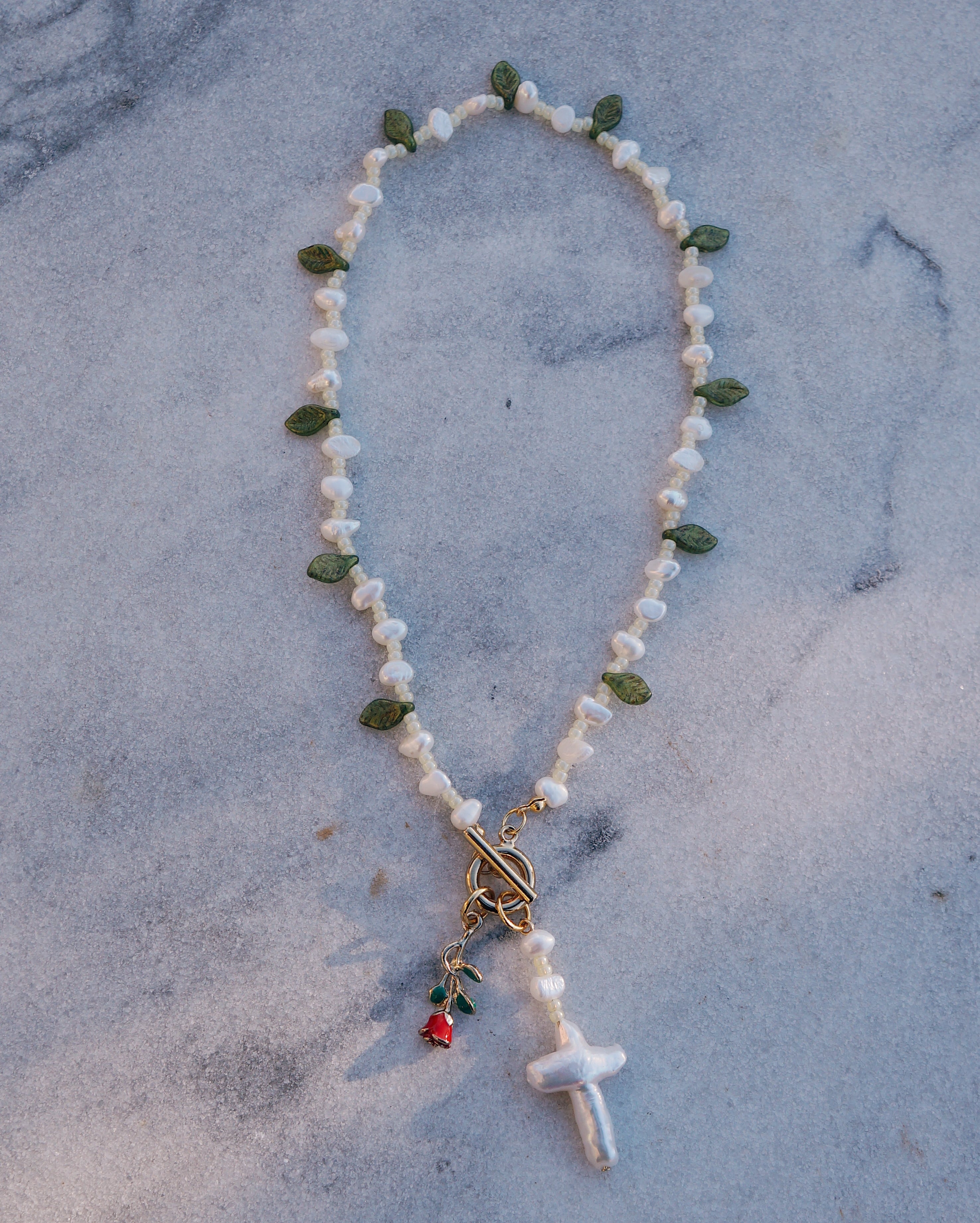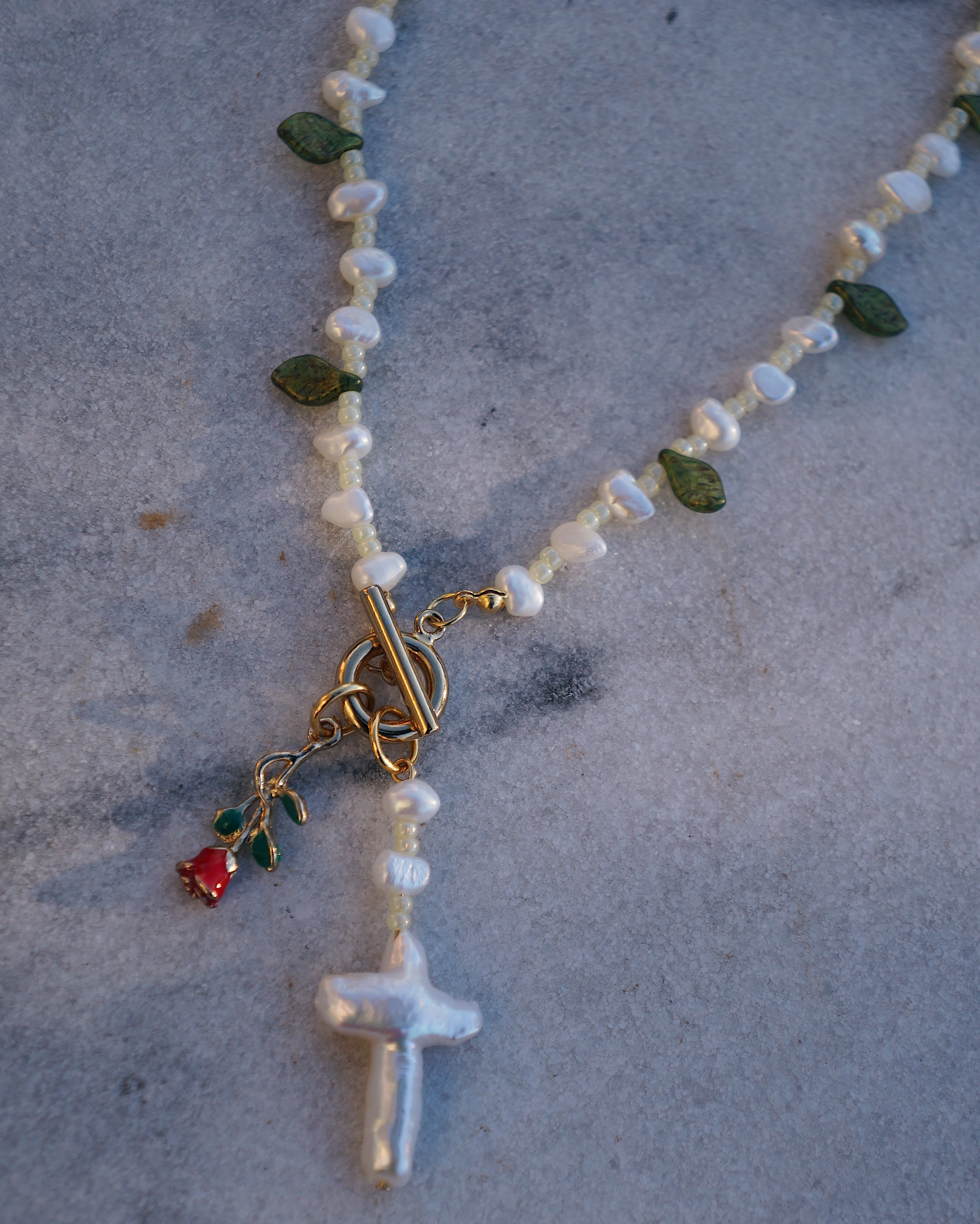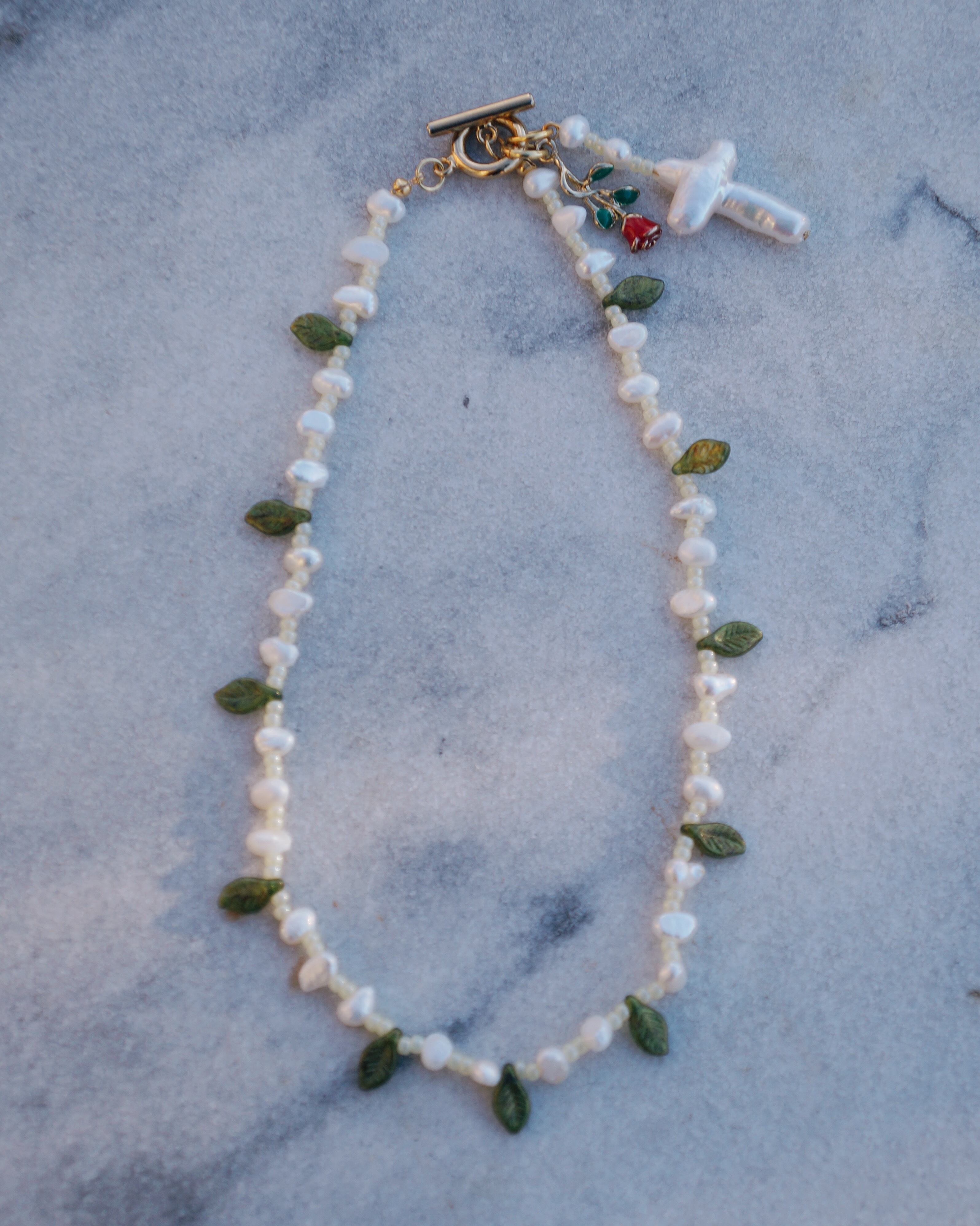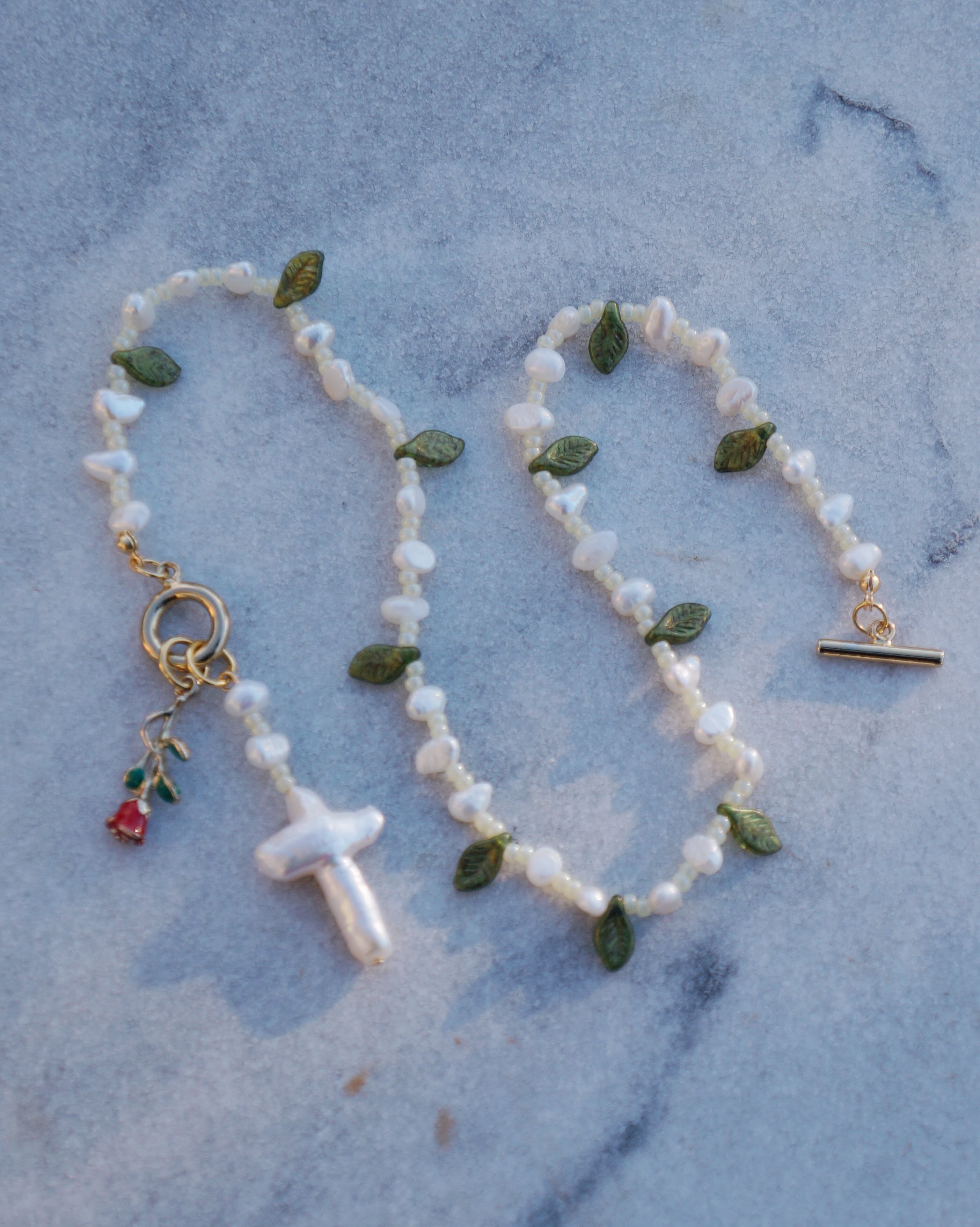 葉っぱのシェープのチェコビーズと淡水パールが美しいネックレスです。マンテルについているチャームを前に垂らしても,背中に垂らしても使える2WAYのネックレスになっています。マンテルには希少な十字架の淡水パールの薔薇のチャームがついています。26028のチャームとお揃いで使うのもおすすめです。