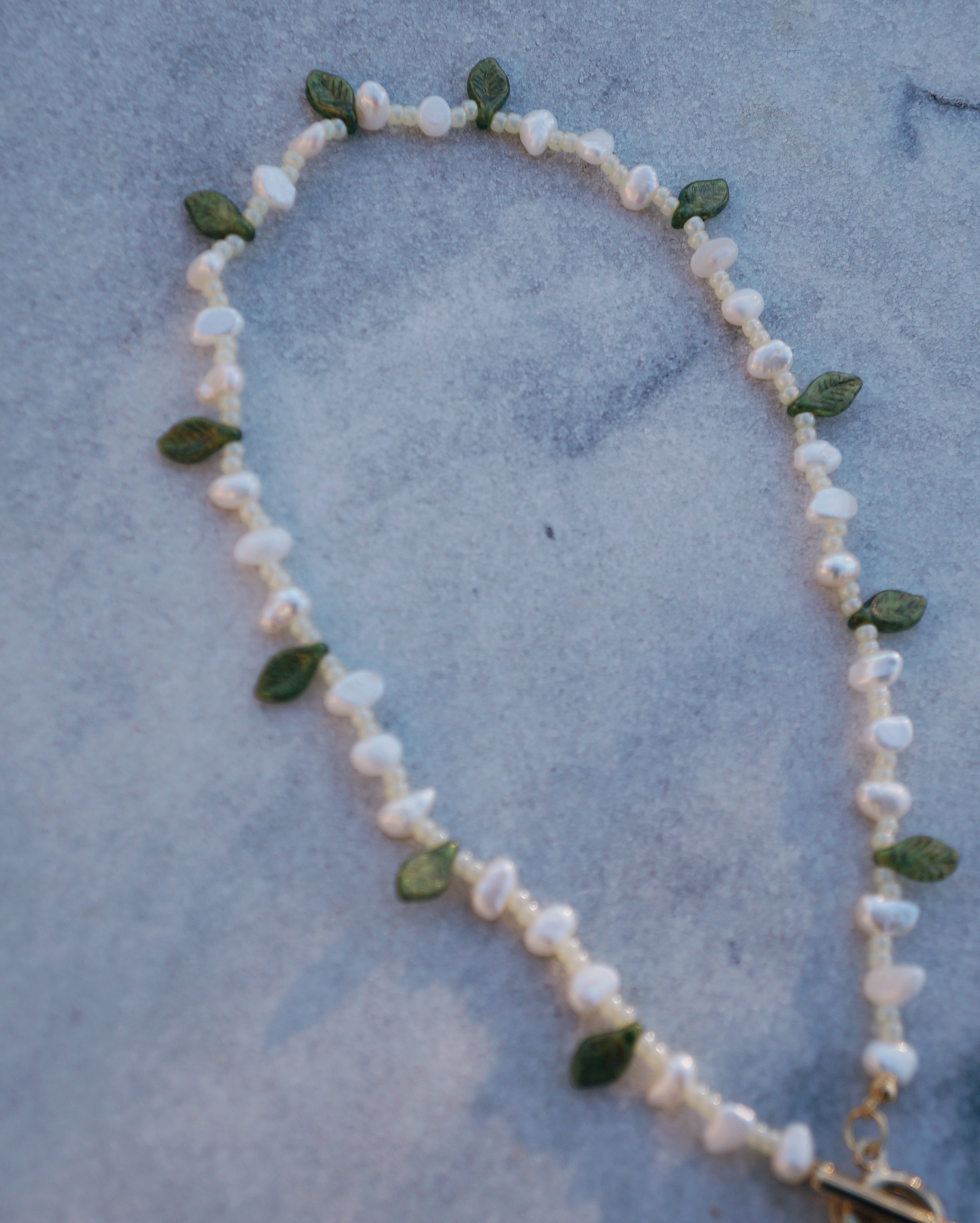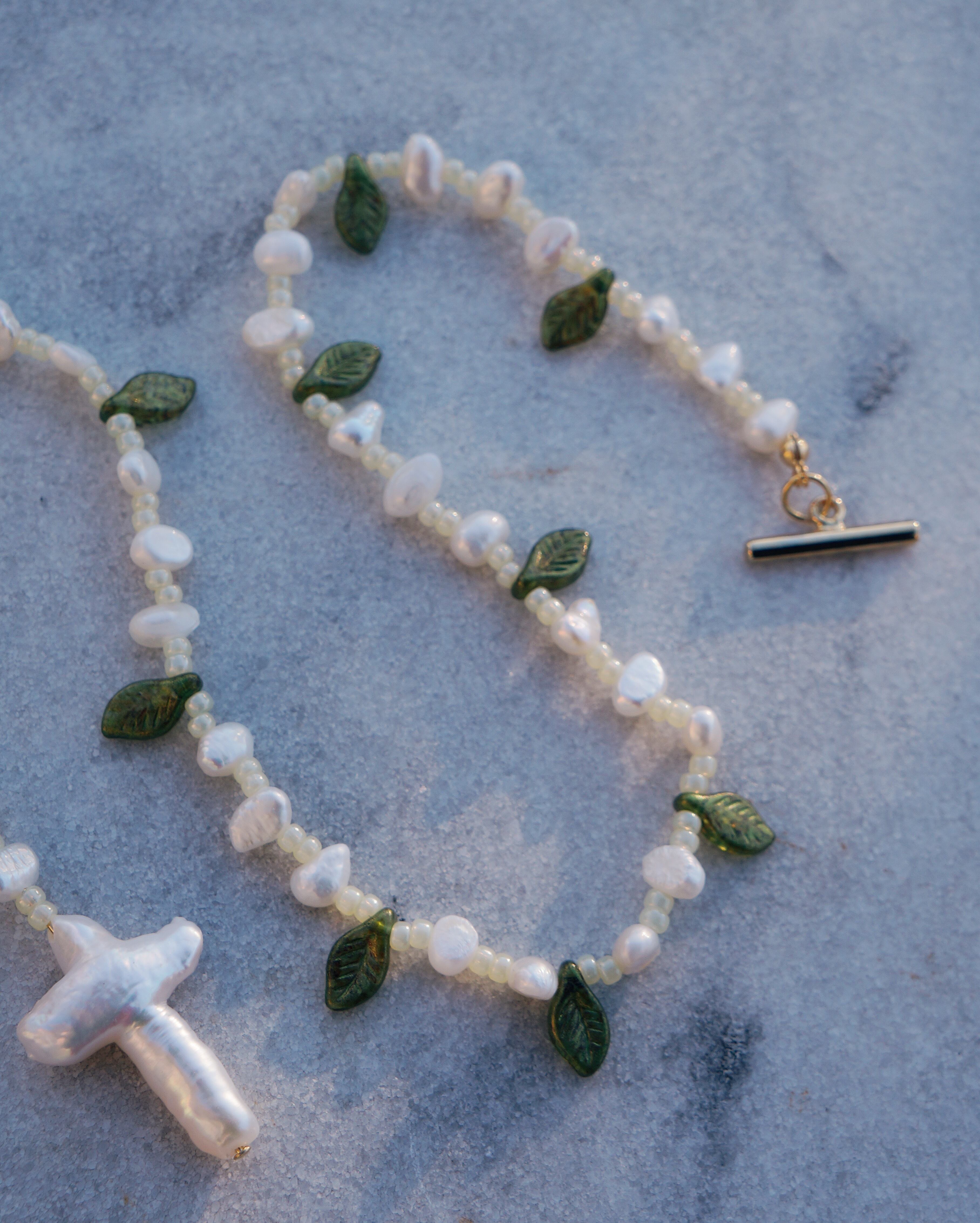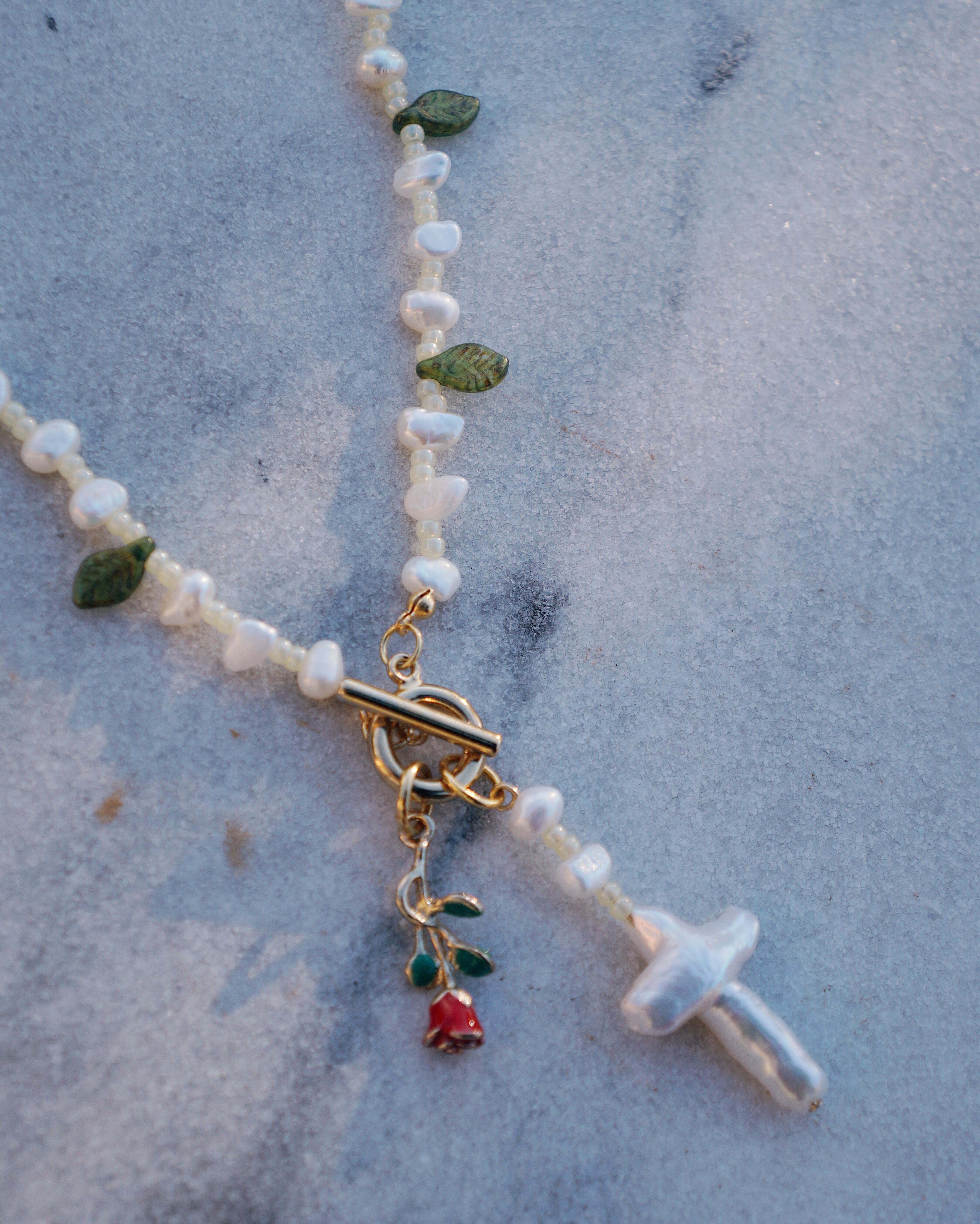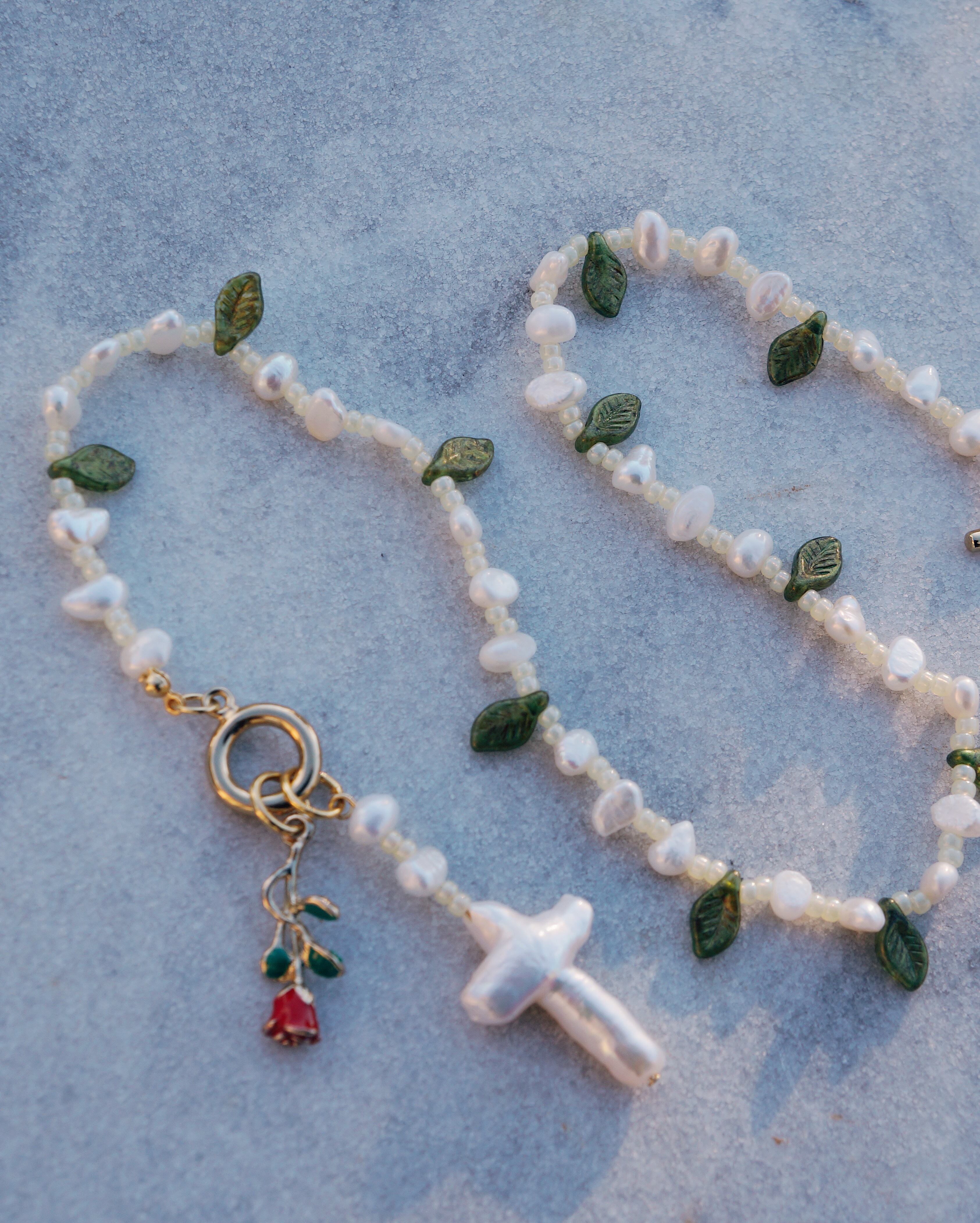 葉っぱのシェープのチェコビーズと淡水パールが美しいネックレスです。マンテルについているチャームを前に垂らしても,背中に垂らしても使える2WAYのネックレスになっています。マンテルには希少な十字架の淡水パールの薔薇のチャームがついています。26028のチャームとお揃いで使うのもおすすめです。