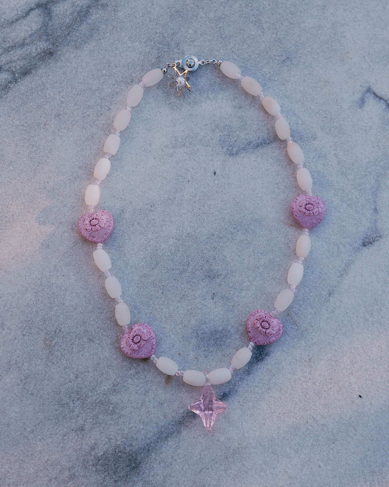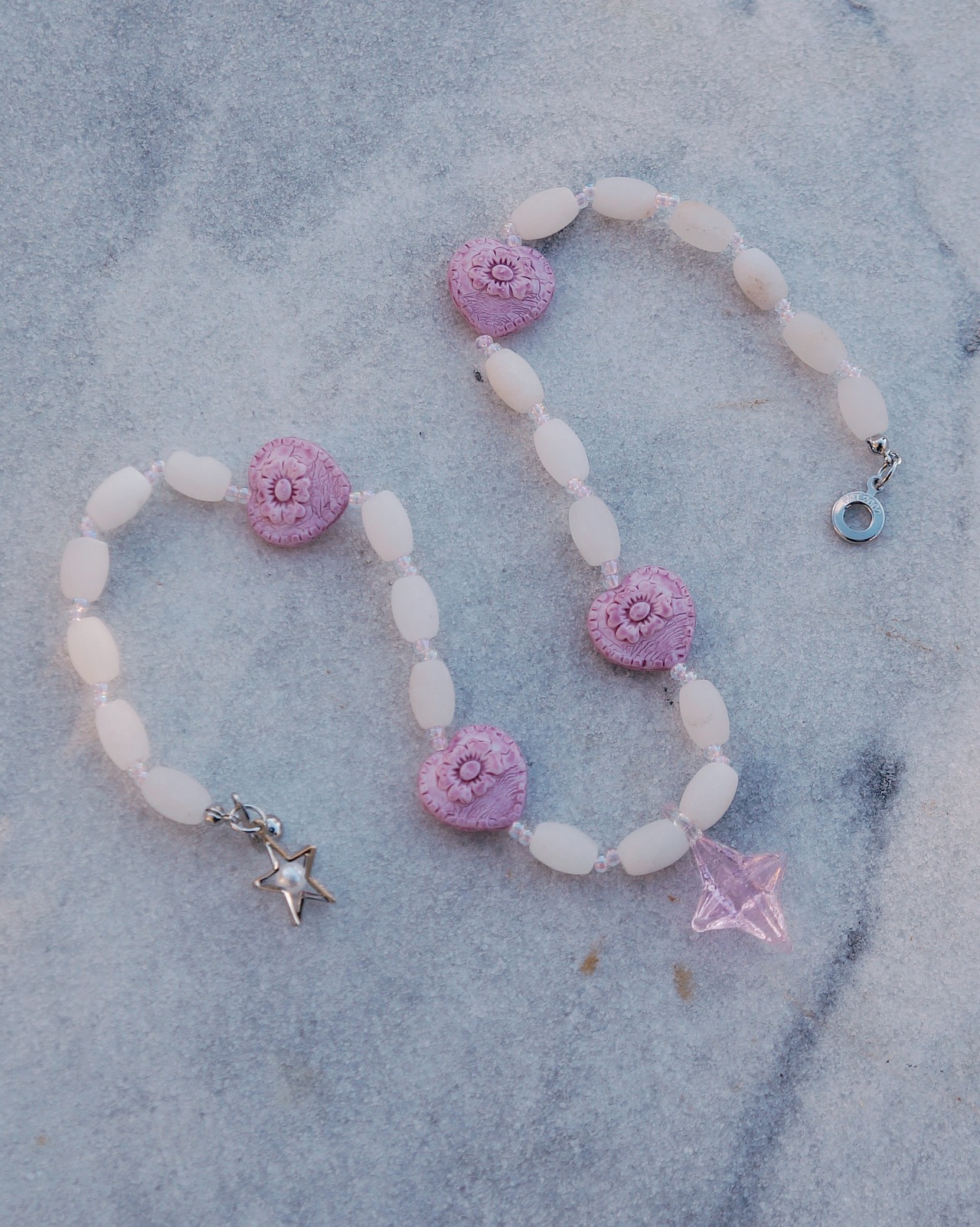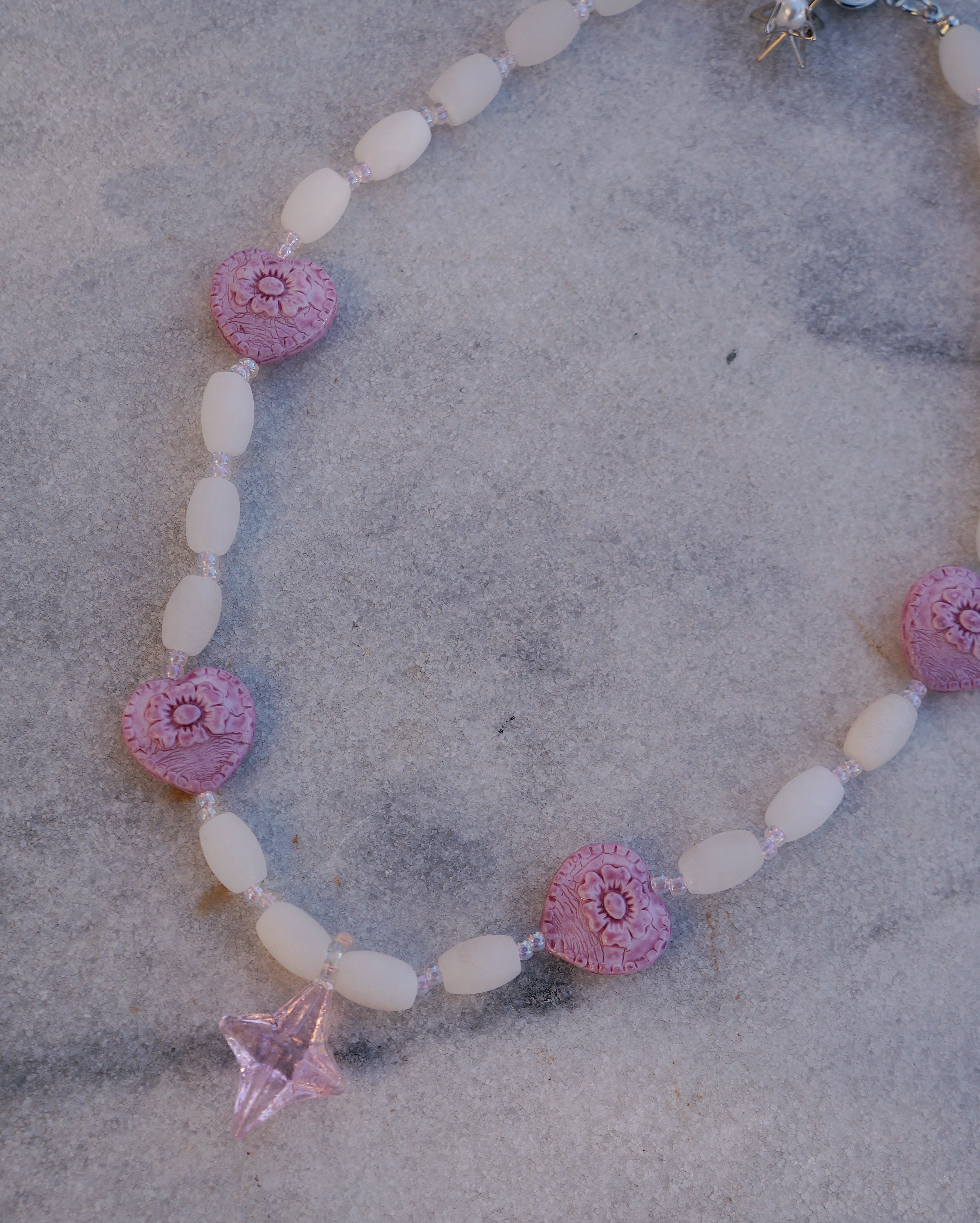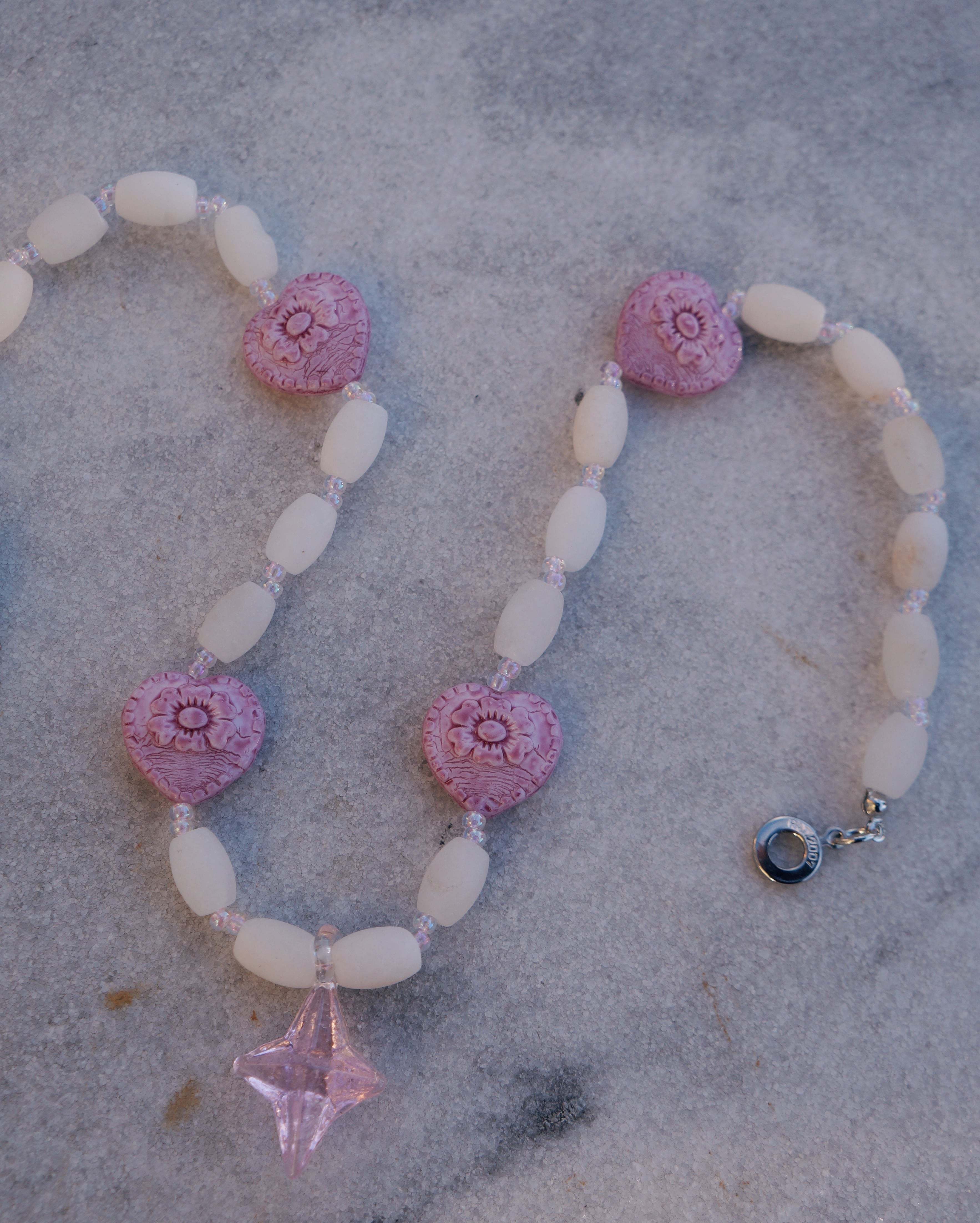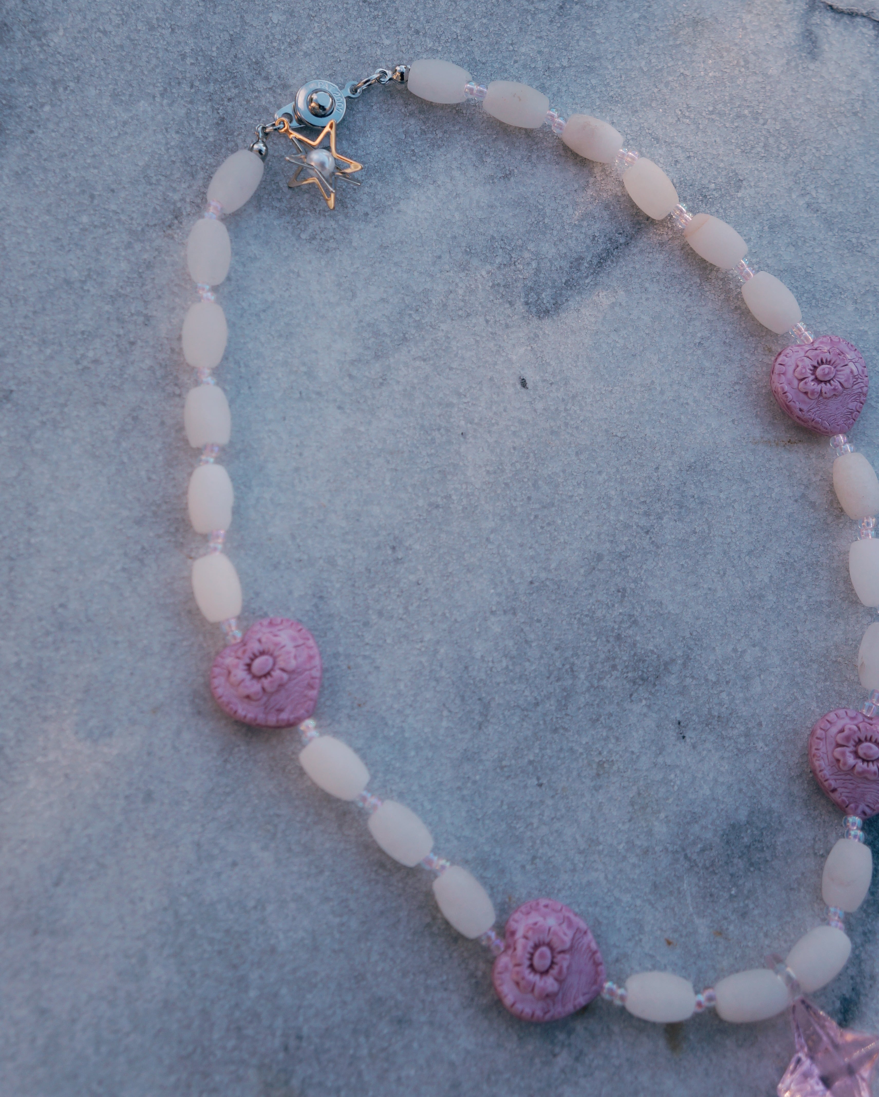 希少な淡いピンクのキラキラのガラスチャーム、ハートのチェコビーズ、天然石のホワイトジェイドのビーズ全てがとってもキュートなネックレスです。