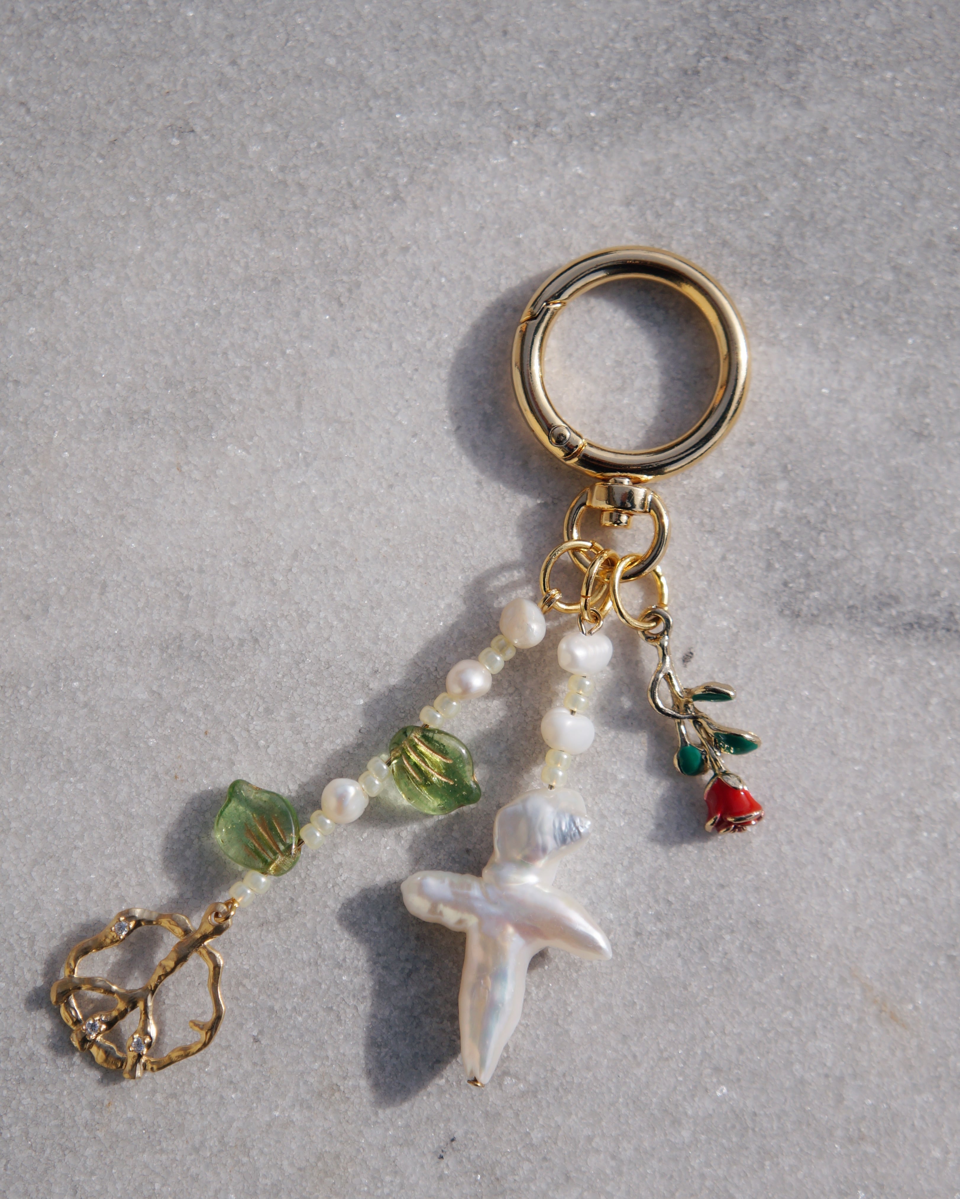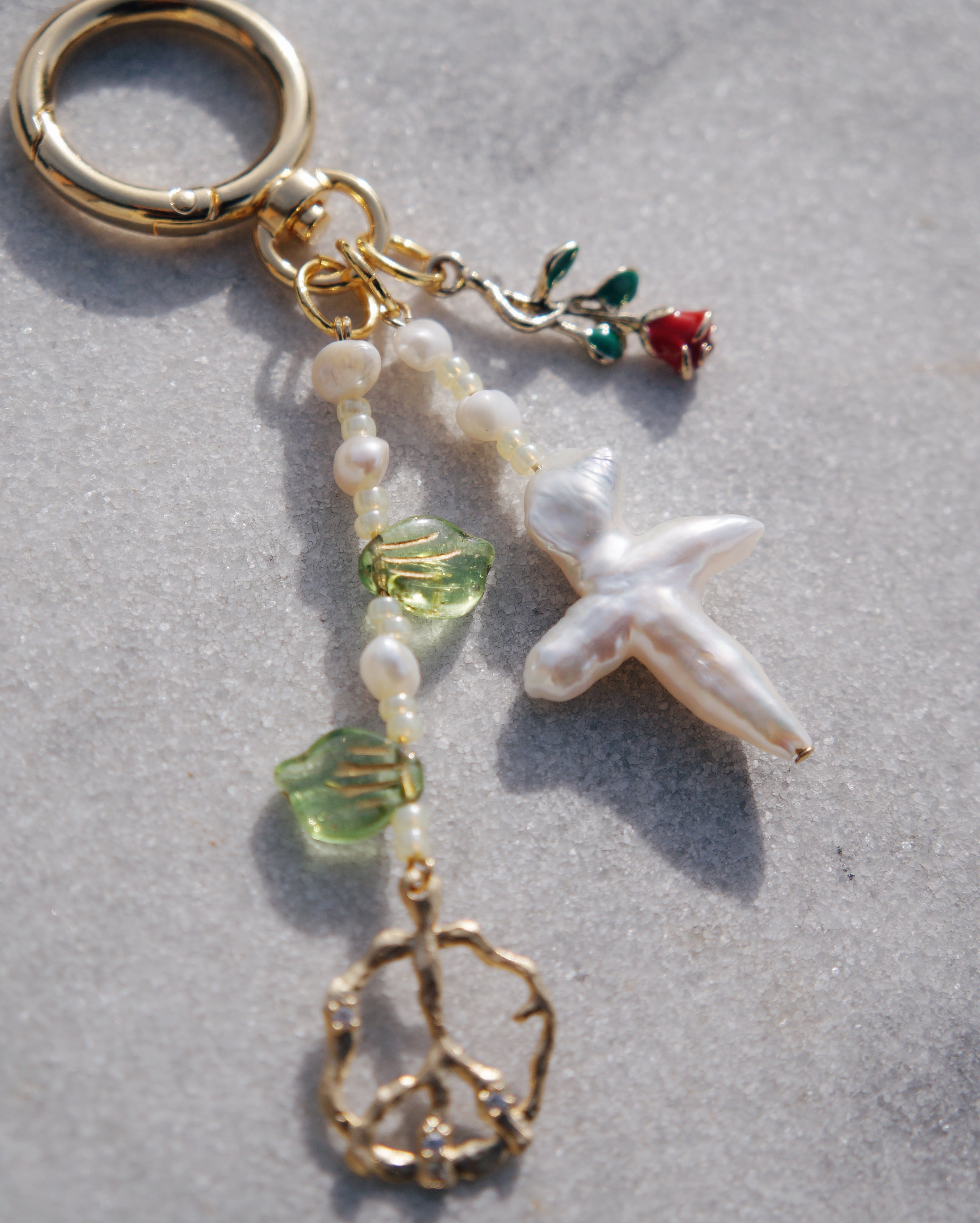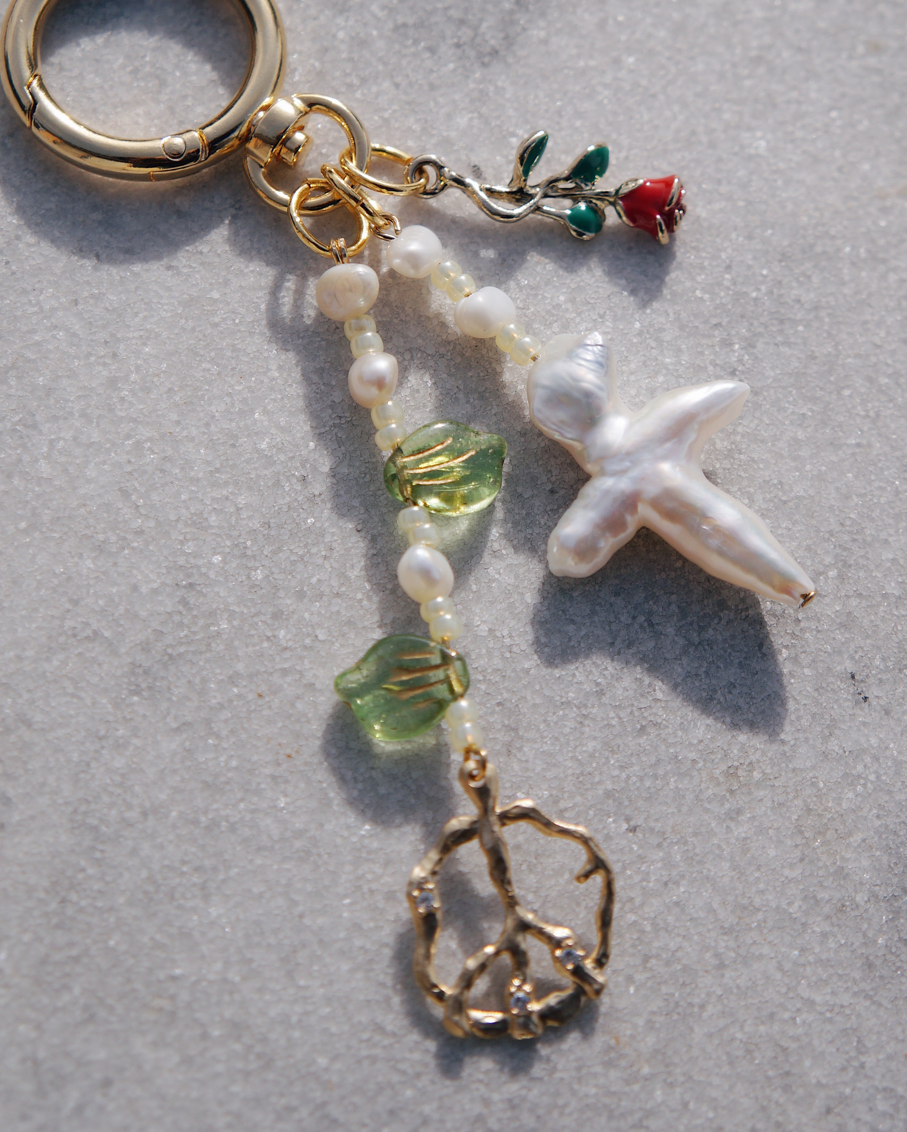 キーチャームや、バッグにつけたり、ベルトループにもつけてもキュートなアイテムです。薔薇のチャーム、希少な十字架モチーフの淡水パール、葉っぱのチェコビーズとピースマークのチャーム、の3つがぶら下がっており存在感のある一点です。26025や26018のネックレスとお揃いで使うのもおすすめです。
