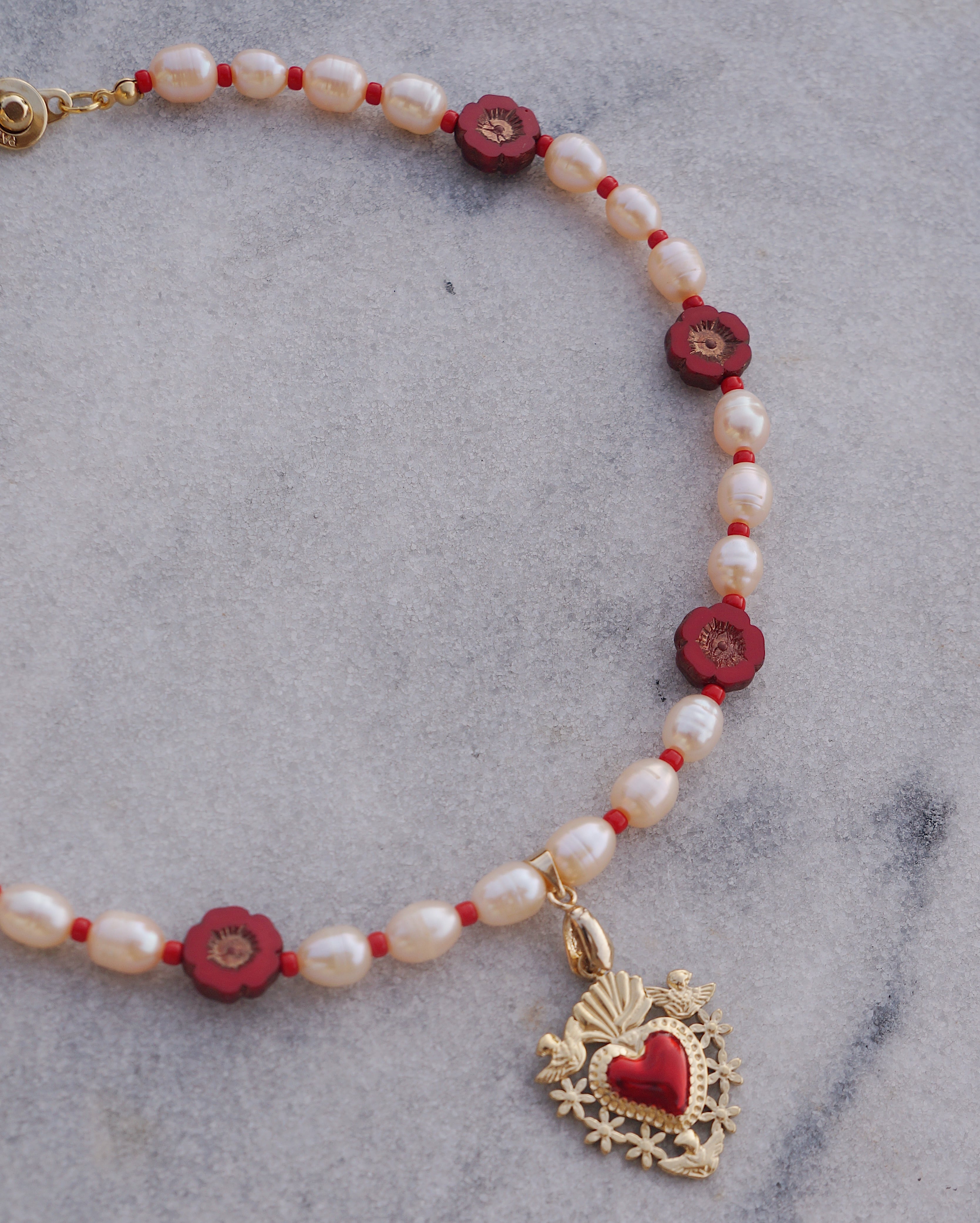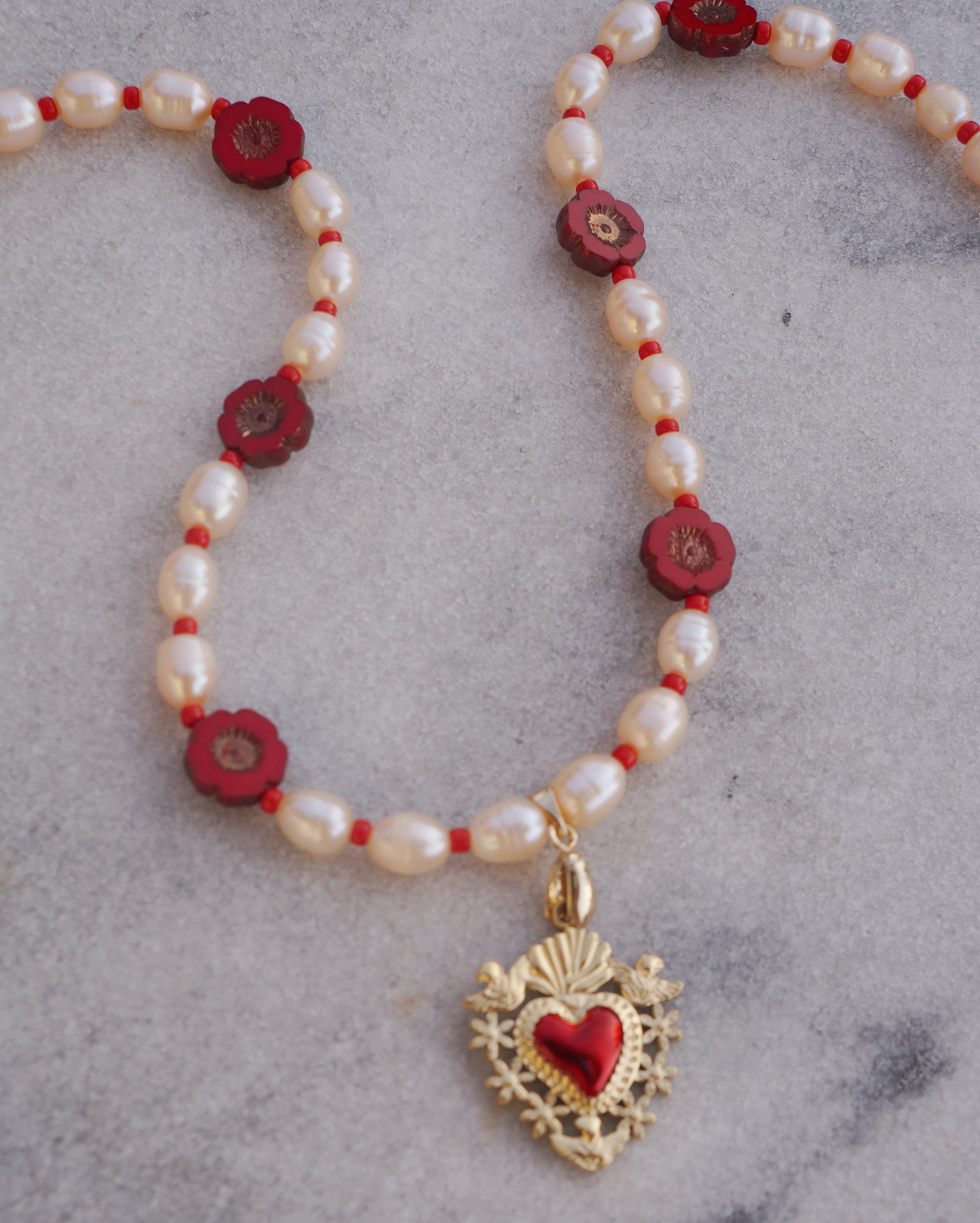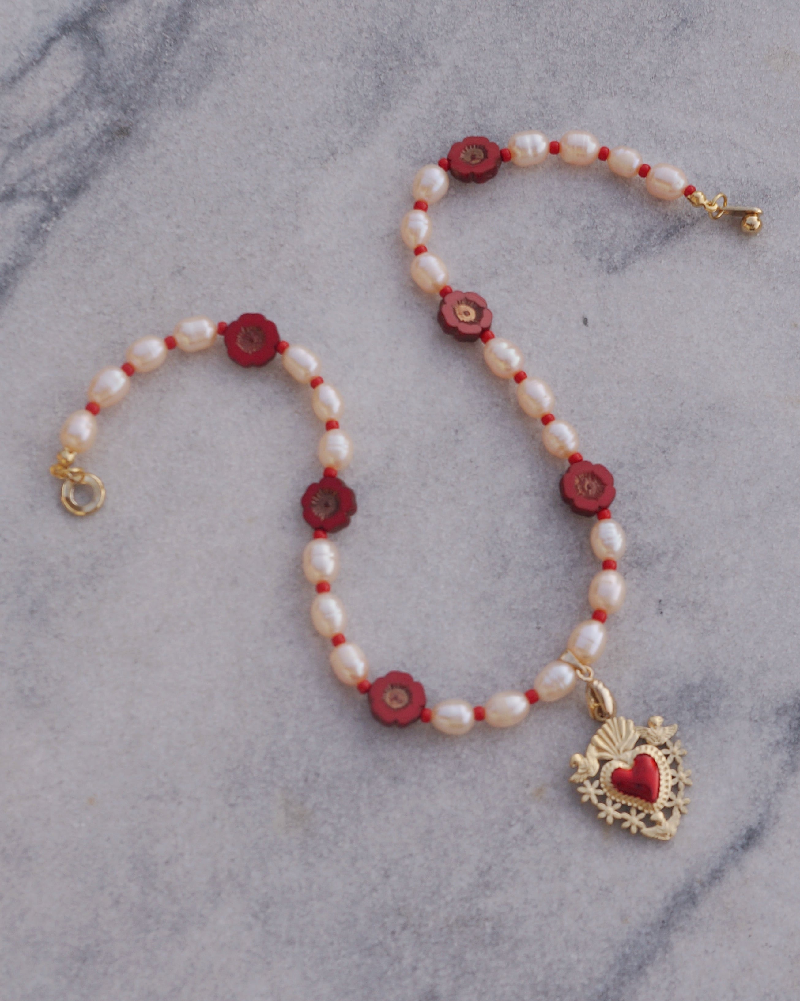 大ぶりのハートのチャームが存在感あるネックレスです。チェコビーズのお花とうっすら淡いピンク色の淡水パール、そしてそのカラーコンビネーションが絶妙でとてもキュートな一点です。