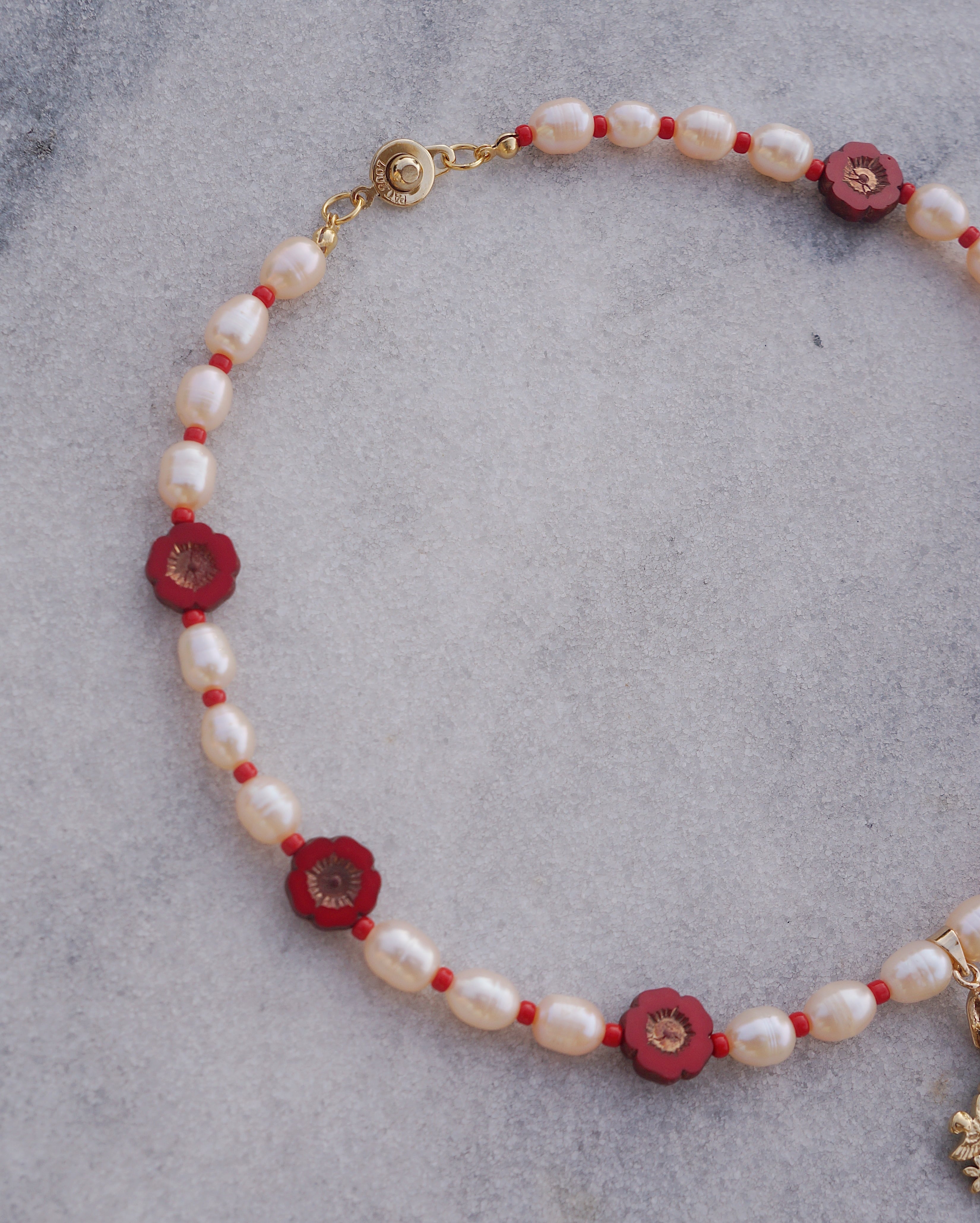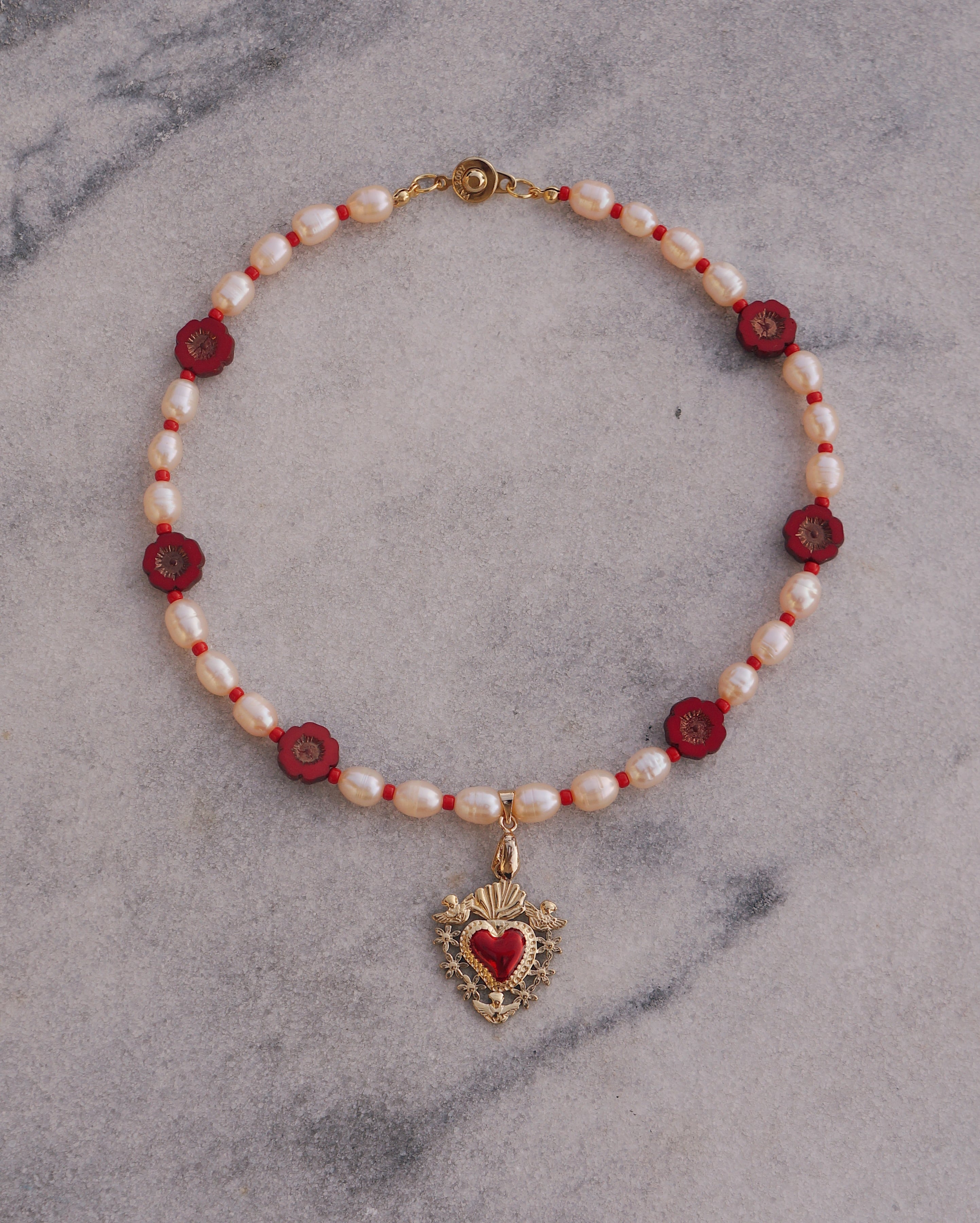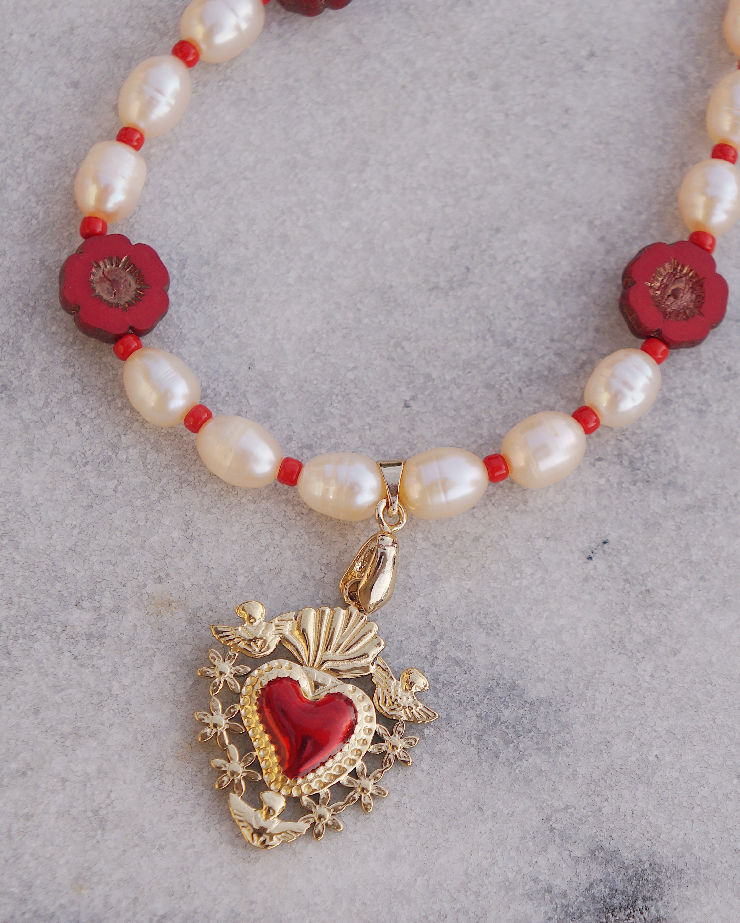 大ぶりのハートのチャームが存在感あるネックレスです。チェコビーズのお花とうっすら淡いピンク色の淡水パール、そしてそのカラーコンビネーションが絶妙でとてもキュートな一点です。