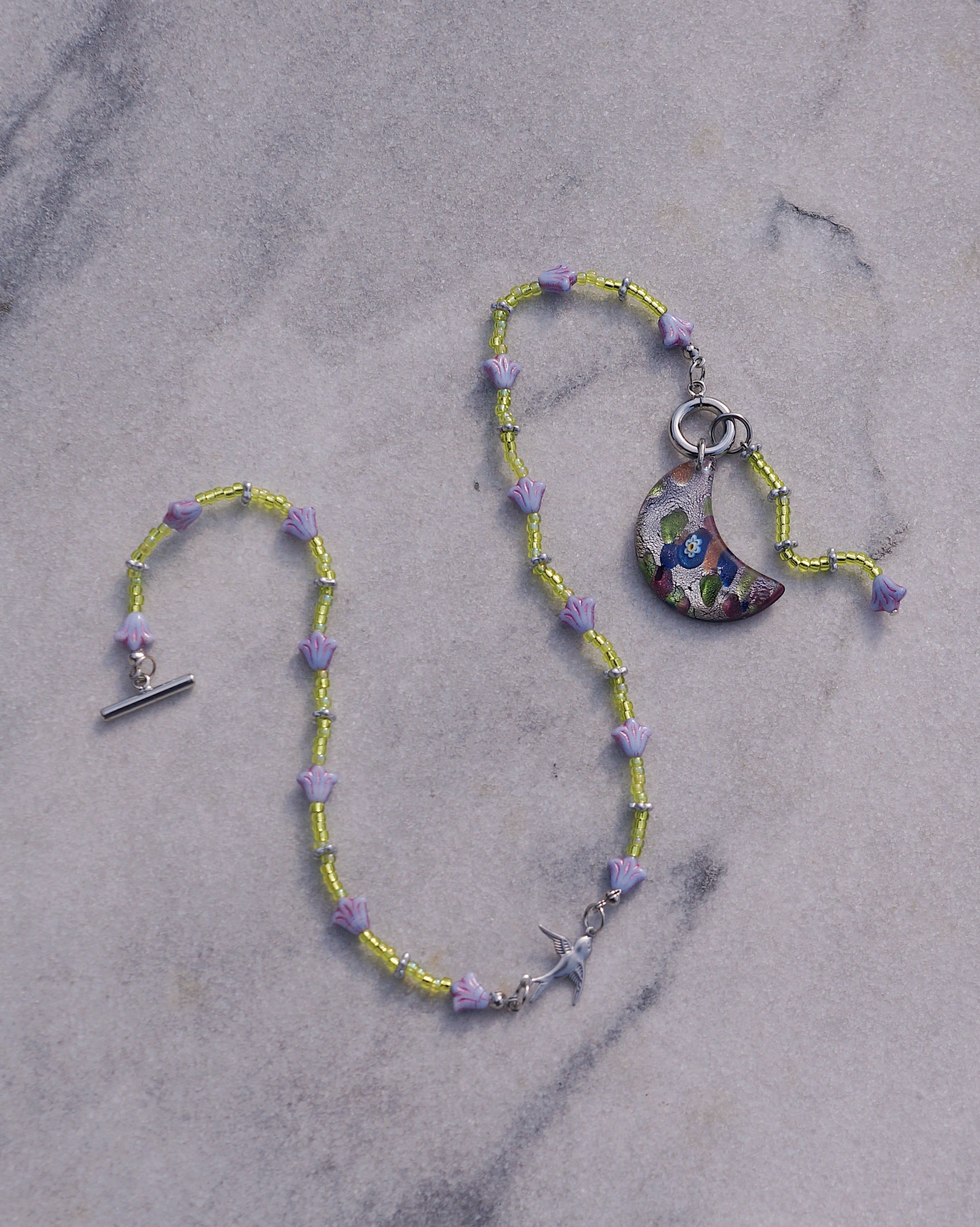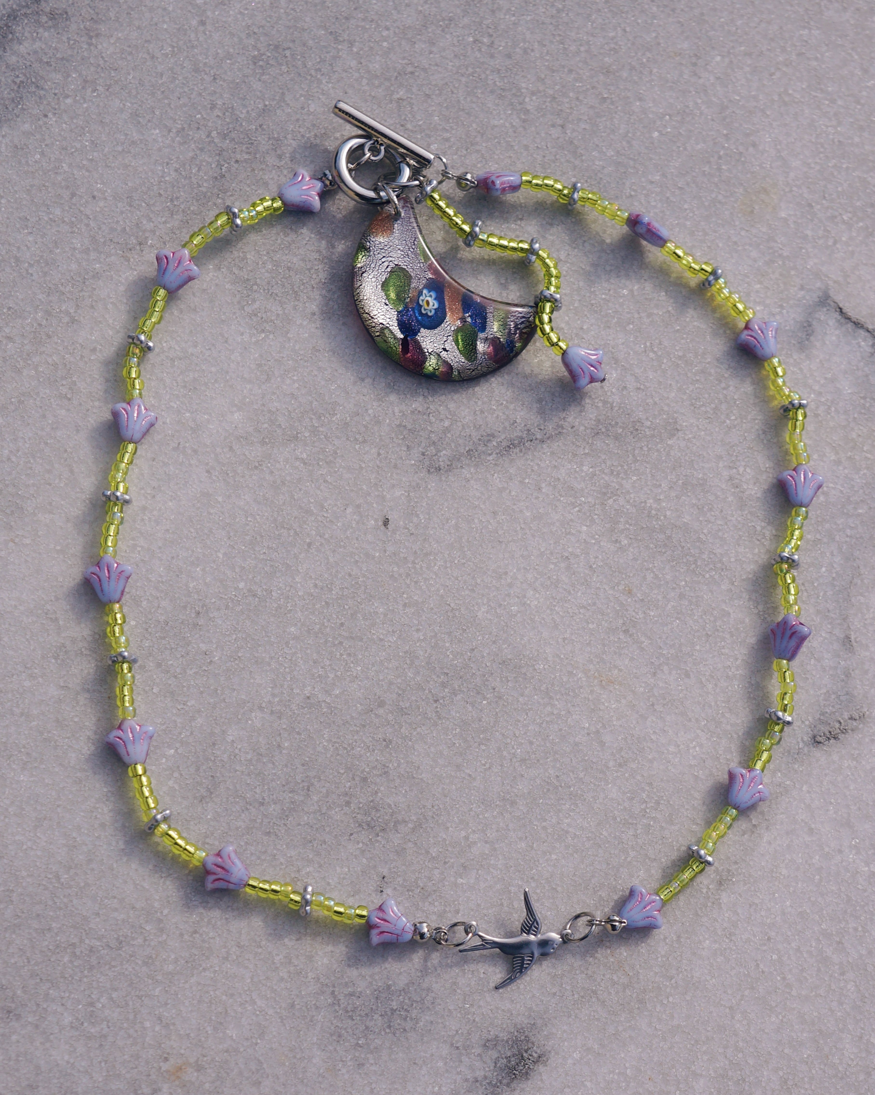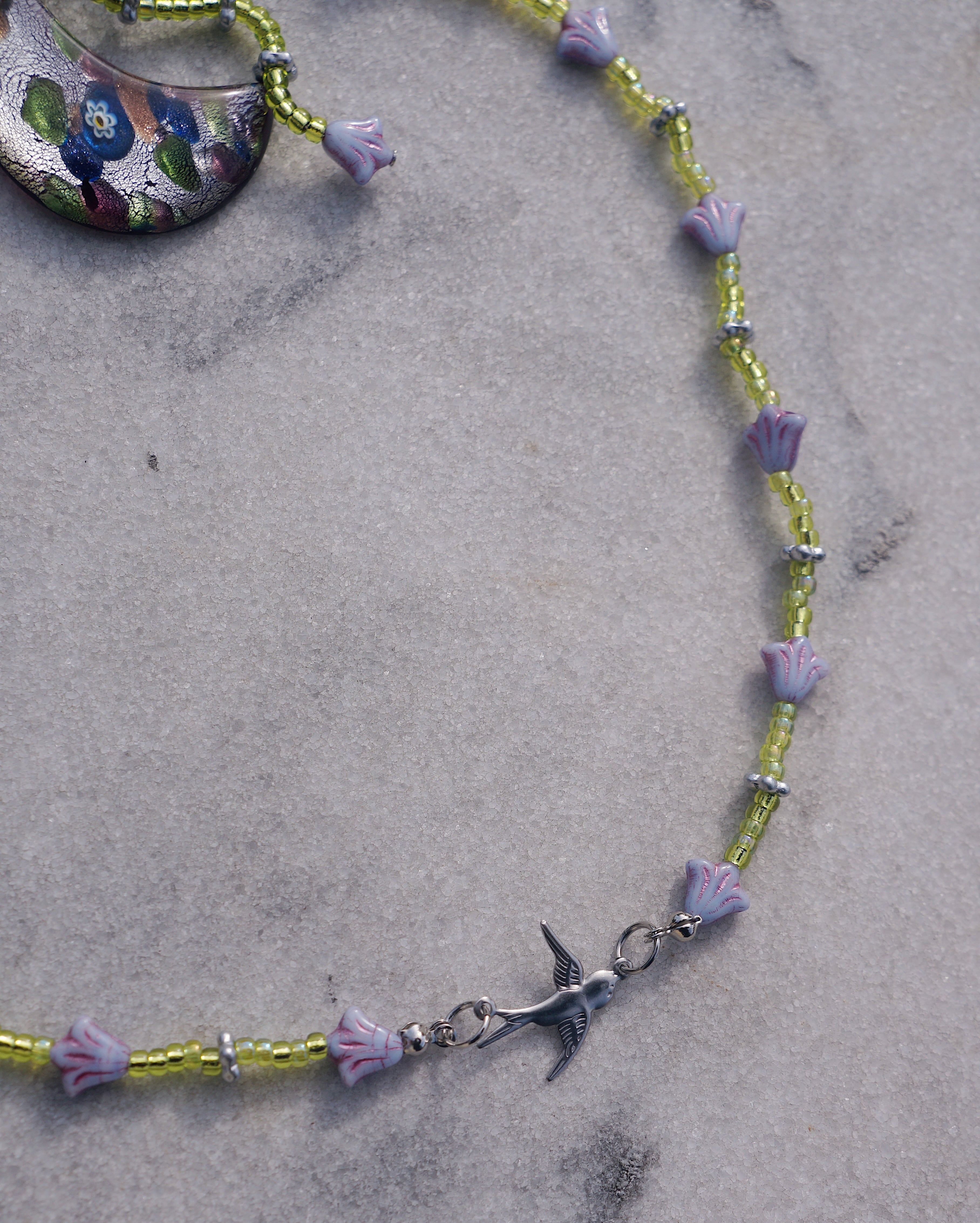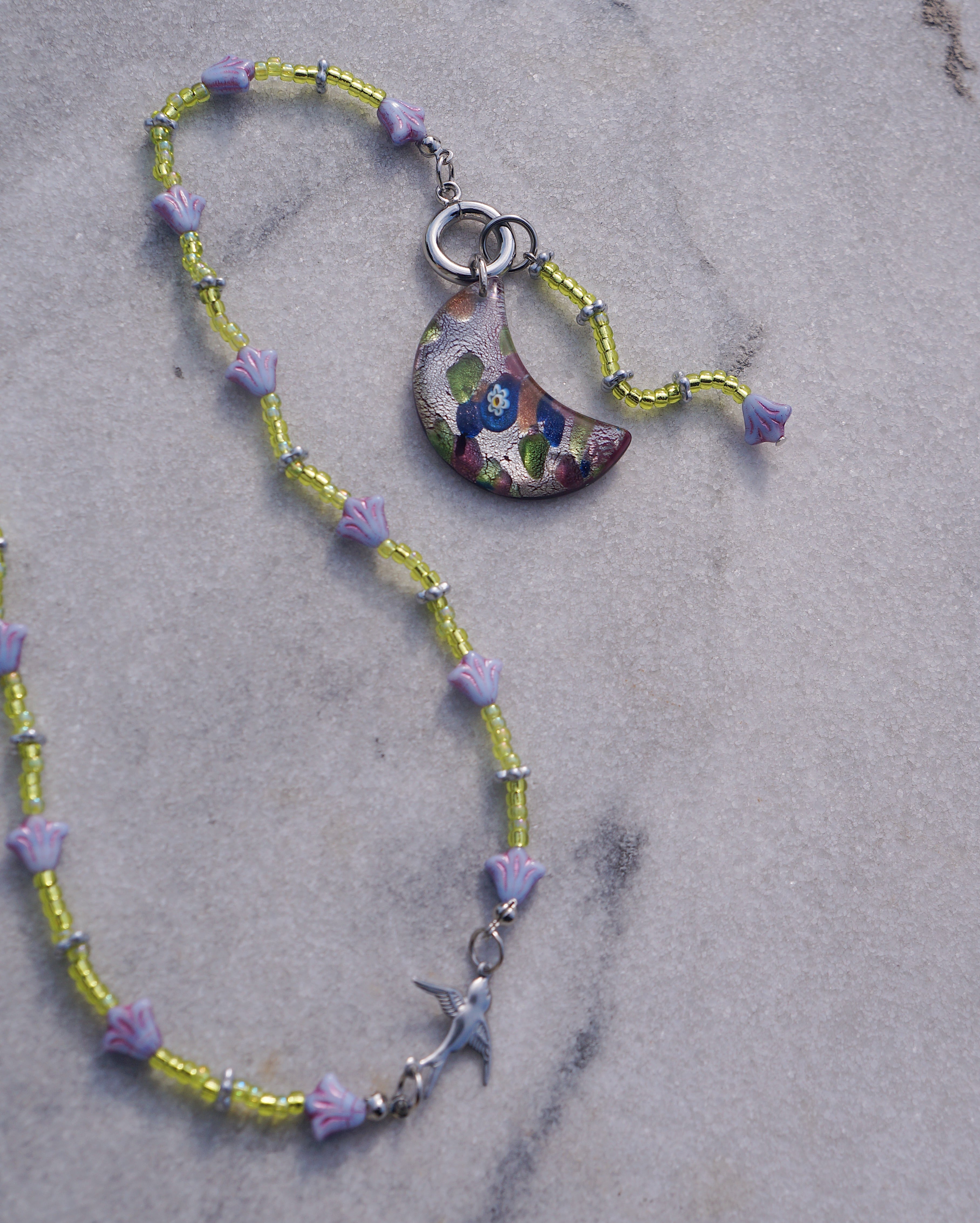 マンテルについているチャームを前に垂らしても、背中に垂らしてもいい2WAYで楽しんでもらえるネックレスです。マンテルには大きめの月のモチーフのガラスチャーム、首周りにはチェコビーズのお花、中央にはつばめのチャームがついています。紫とグリーンのカラーコンビネーションが美しく、ユニークなデザインでありながらどんなスタイリングにも合わせやすい一点です。